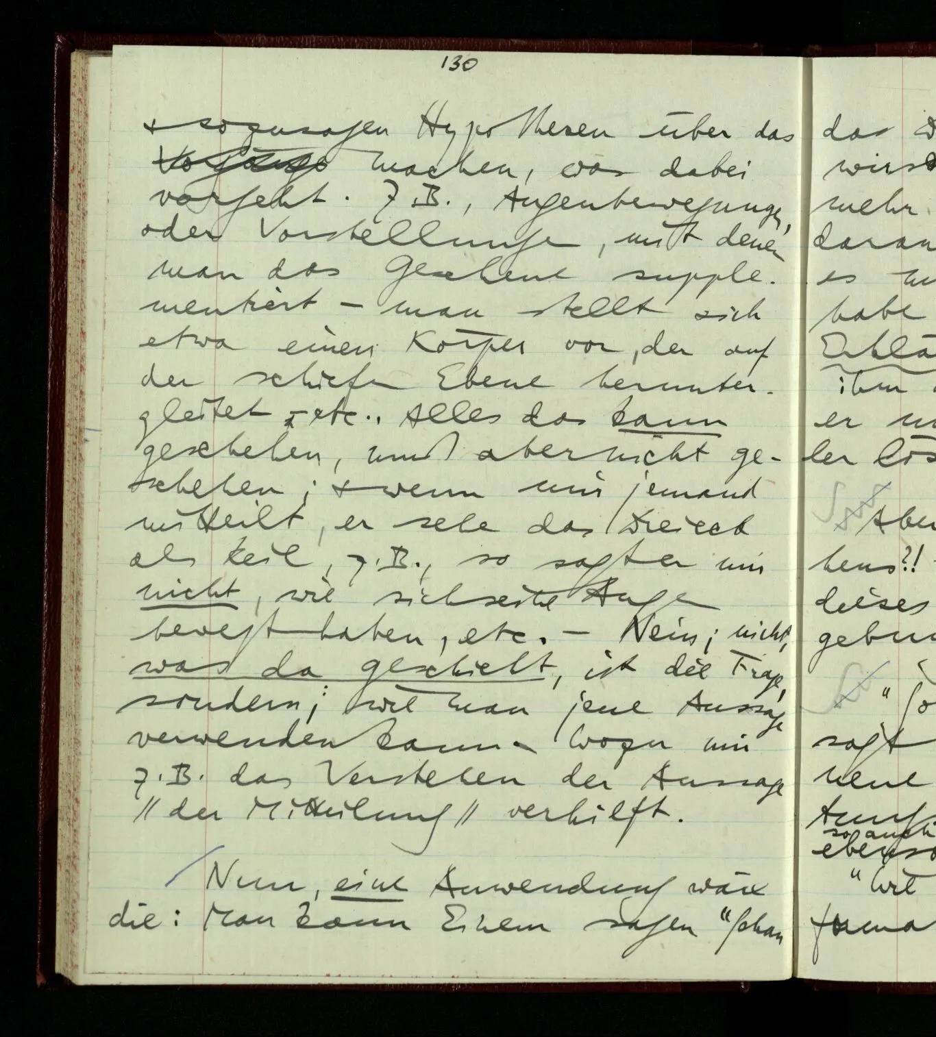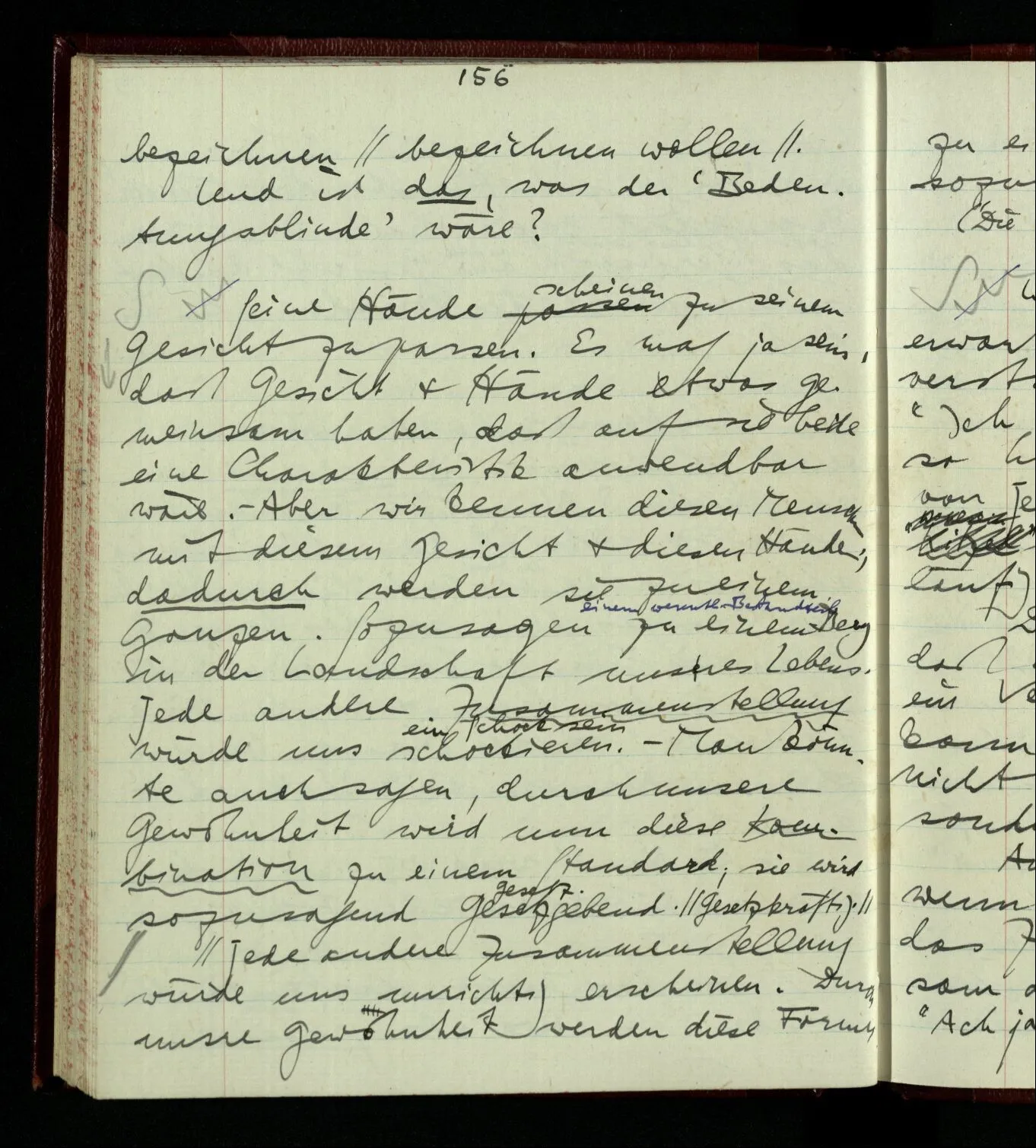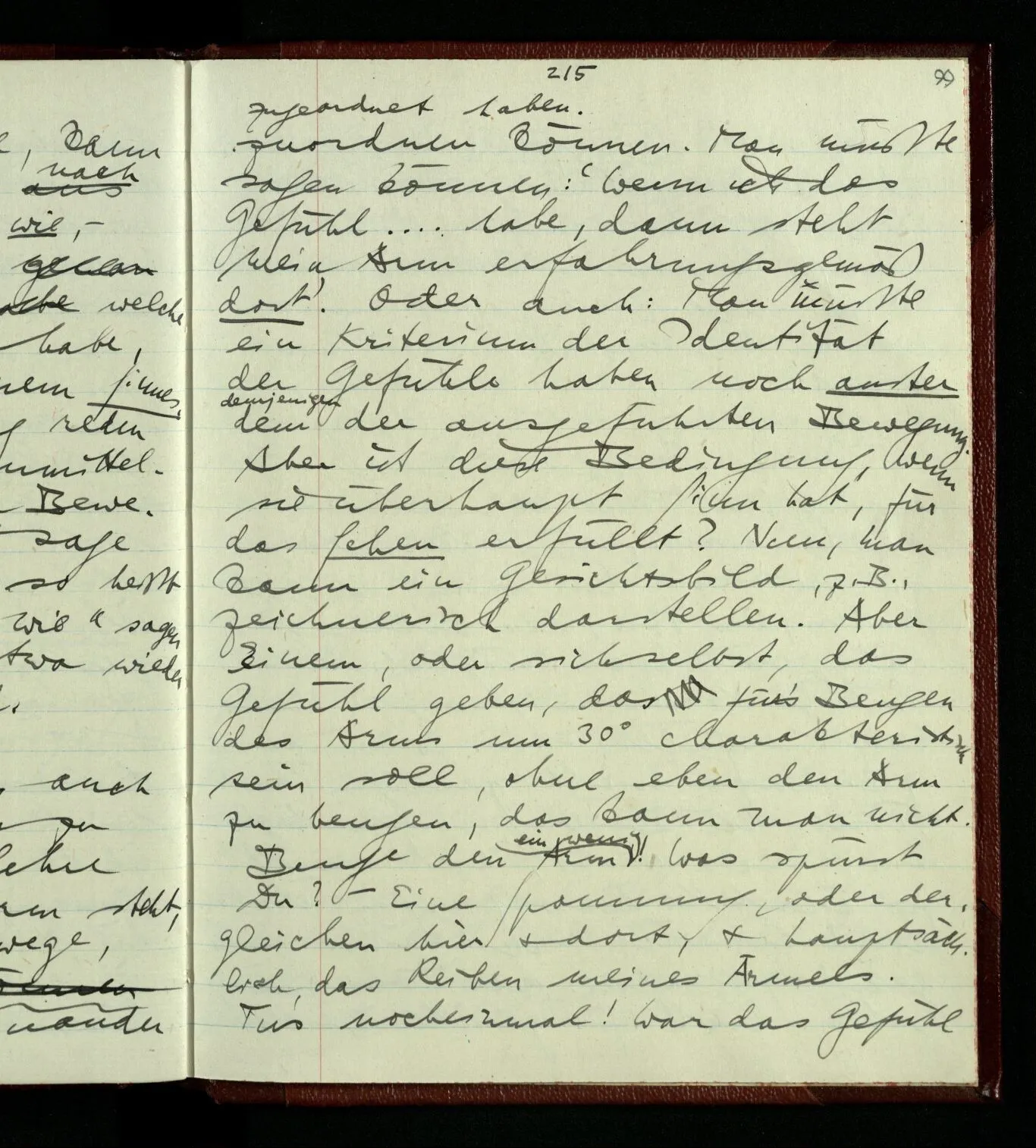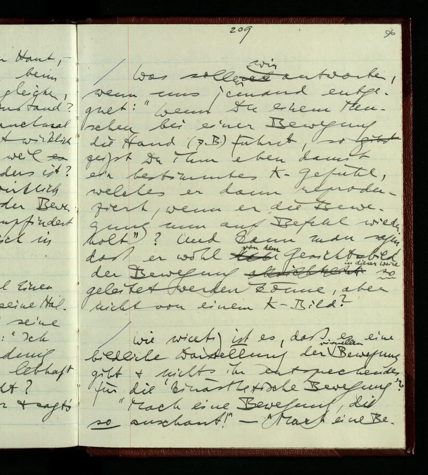Könnte man das auch so sagen: Um sagen zu können, das Gefühl lehre mich, wo jetzt mein Arm steht, oder wie weit ich ihn bewege, müßte man Gefühle & Bewegungen einander zuordnen können. Man müßte sagen können: ‘Wenn ich das Gefühl ‥‥ habe, dann steht mein Arm erfahrungsgemäß dort’. Oder auch: Man müßte ein Kriterium der Identität der Gefühle haben noch außer dem der ausgeführten Bewegung. Aber ist diese Bedingung, wenn sie überhaupt Sinn hat, für das Sehen erfüllt? Nun, man kann ein Gesichtsbild, z.B., zeichnerisch darstellen. Aber Einem, oder sich selbst, das Gefühl geben, das für’s Beugen des Arms um 30˚ charakteristisch sein soll, ohne eben den Arm zu beugen, das kann man nicht. Beuge den Arm ein wenig! Was spürst Du? – Eine Spannung, oder dergleichen hier & dort, & hauptsächlich das Reiben meines Ärmels. Tu’s nocheinmal! War das Gefühl das gleiche? Ungefähr. Ungefähr an den gleichen Stellen. Begleitet dieses Gefühl immer diese Beugung, kannst Du’s sagen? Nein. Und doch paßt mir an diesem Argument etwas noch nicht.