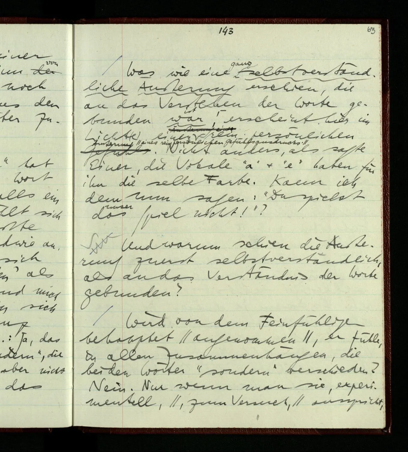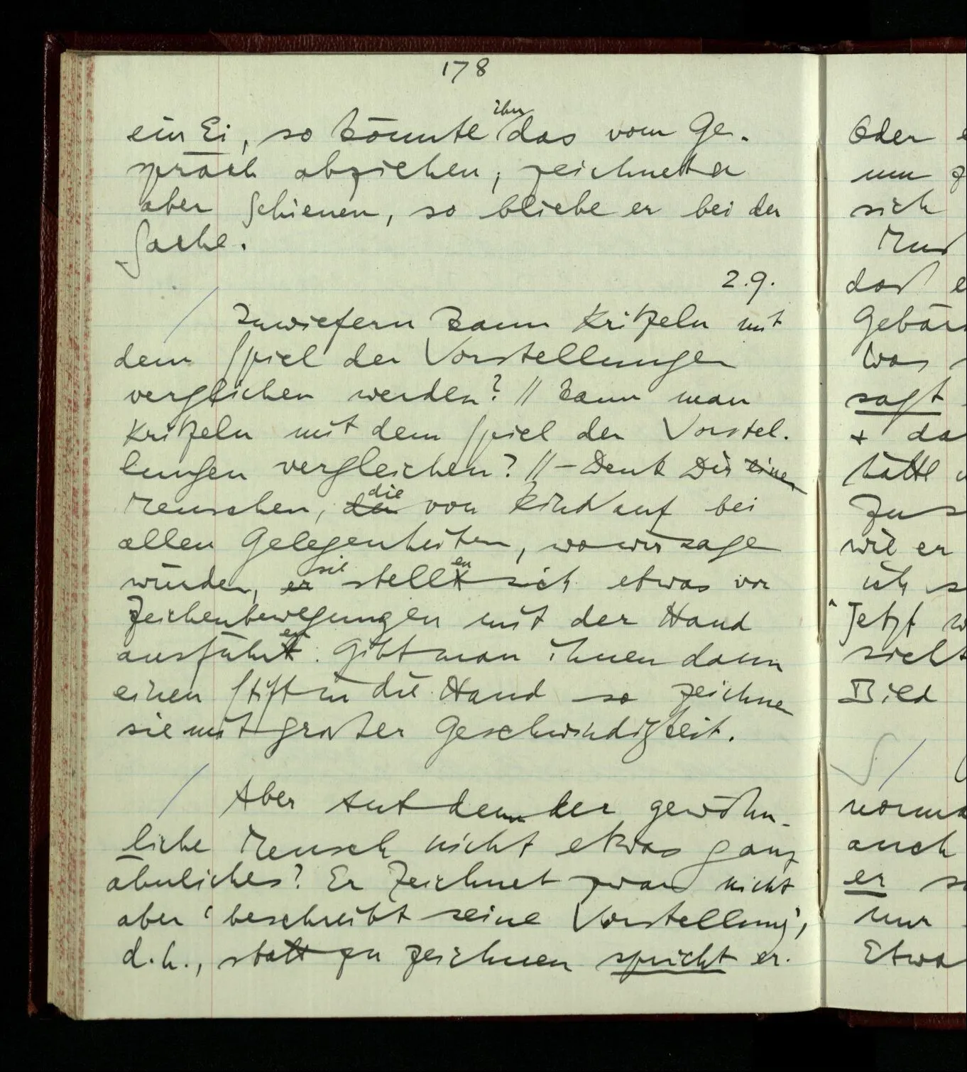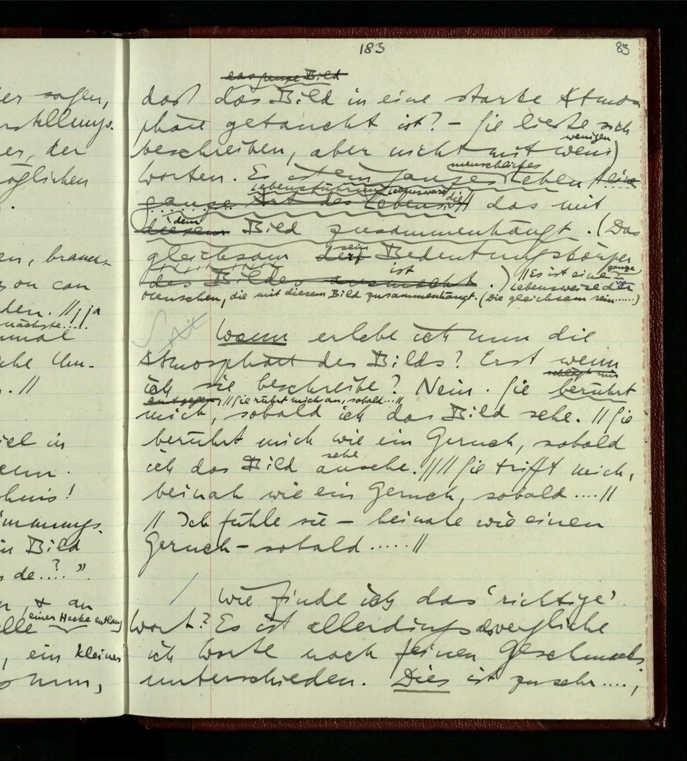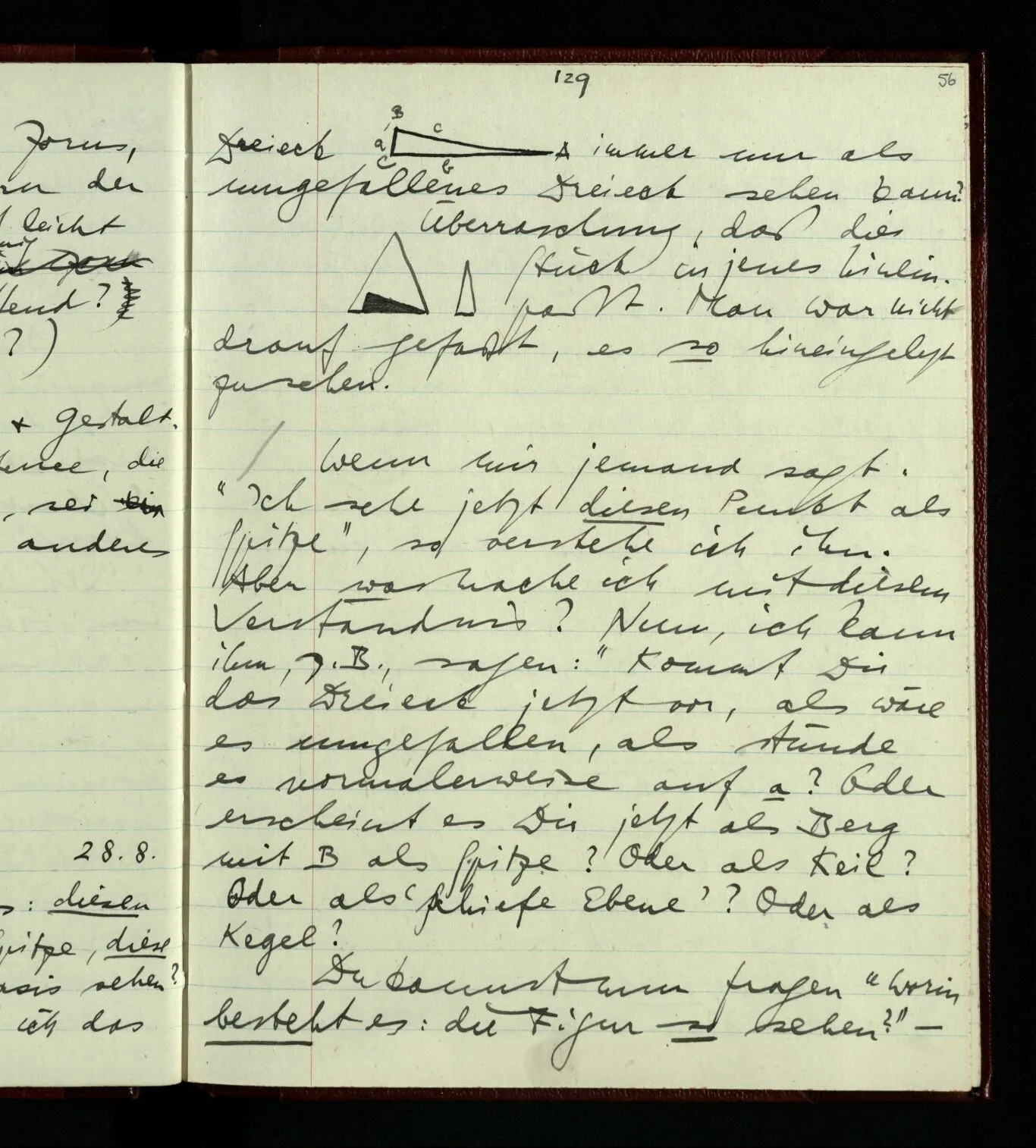 Könnte man das auch so sagen: Um sagen zu können, das Gefühl lehre mich, wo jetzt mein Arm steht, oder wie weit ich ihn bewege, müßte man Gefühle & Bewegungen einander zuordnen können. Man müßte sagen können: ‘Wenn ich das Gefühl ‥‥ habe, dann steht mein Arm erfahrungsgemäß dort’. Oder auch: Man müßte ein Kriterium der Identität der Gefühle haben noch außer dem der ausgeführten Bewegung. Aber ist diese Bedingung, wenn sie überhaupt Sinn hat, für das Sehen erfüllt? Nun, man kann ein Gesichtsbild, z.B., zeichnerisch darstellen. Aber Einem, oder sich selbst, das Gefühl geben, das für’s Beugen des Arms um 30˚ charakteristisch sein soll, ohne eben den Arm zu beugen, das kann man nicht. Beuge den Arm ein wenig! Was spürst Du? – Eine Spannung, oder dergleichen hier & dort, & hauptsächlich das Reiben meines Ärmels. Tu’s nocheinmal! War das Gefühl das gleiche? Ungefähr. Ungefähr an den gleichen Stellen. Begleitet dieses Gefühl immer diese Beugung, kannst Du’s sagen? Nein. Und doch paßt mir an diesem Argument etwas noch nicht.
