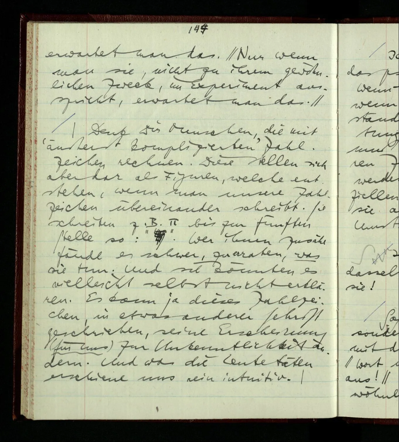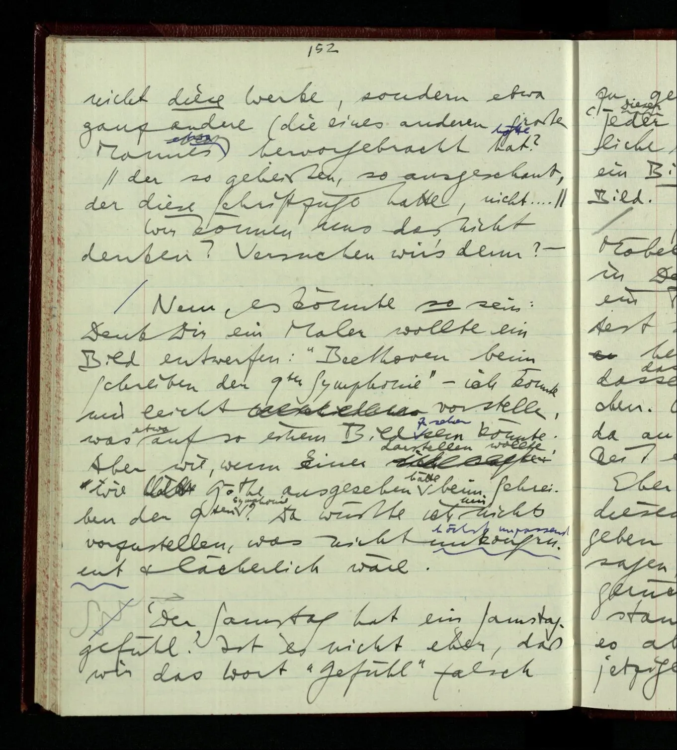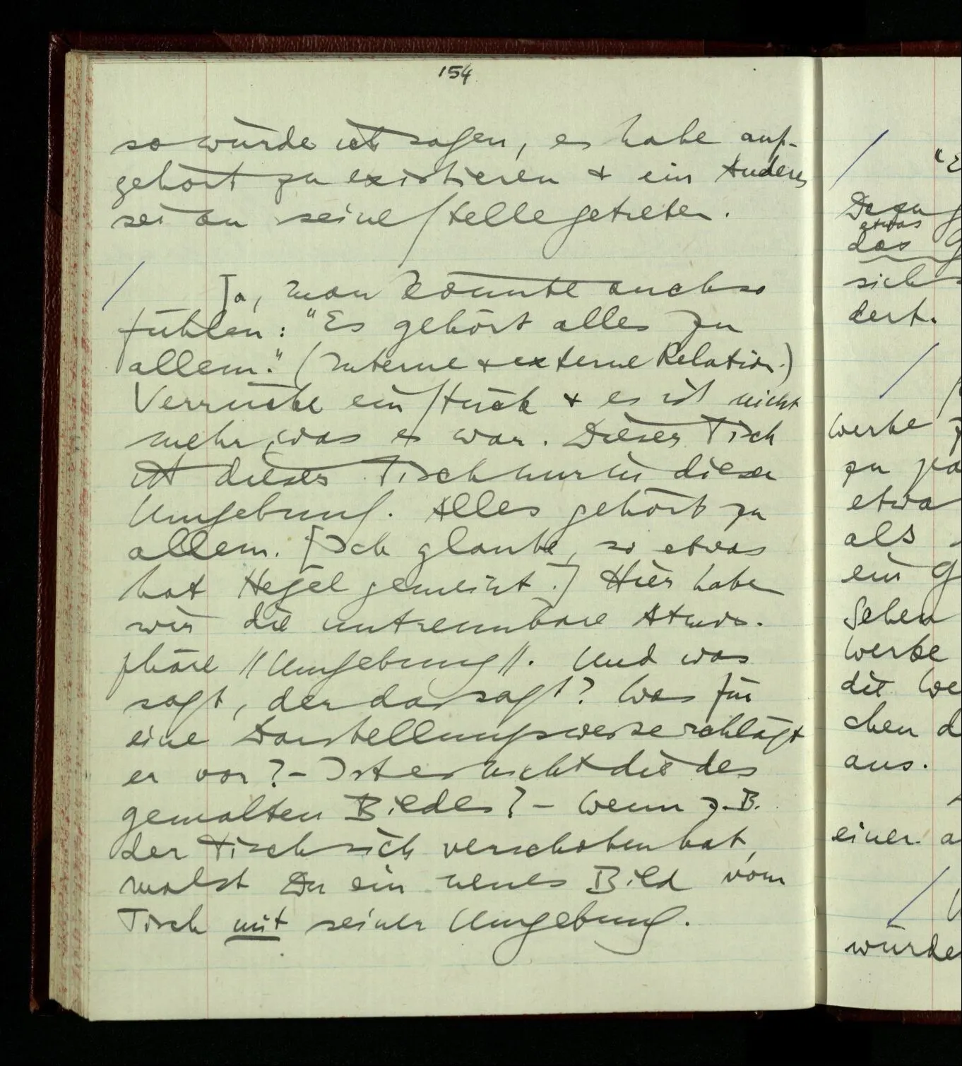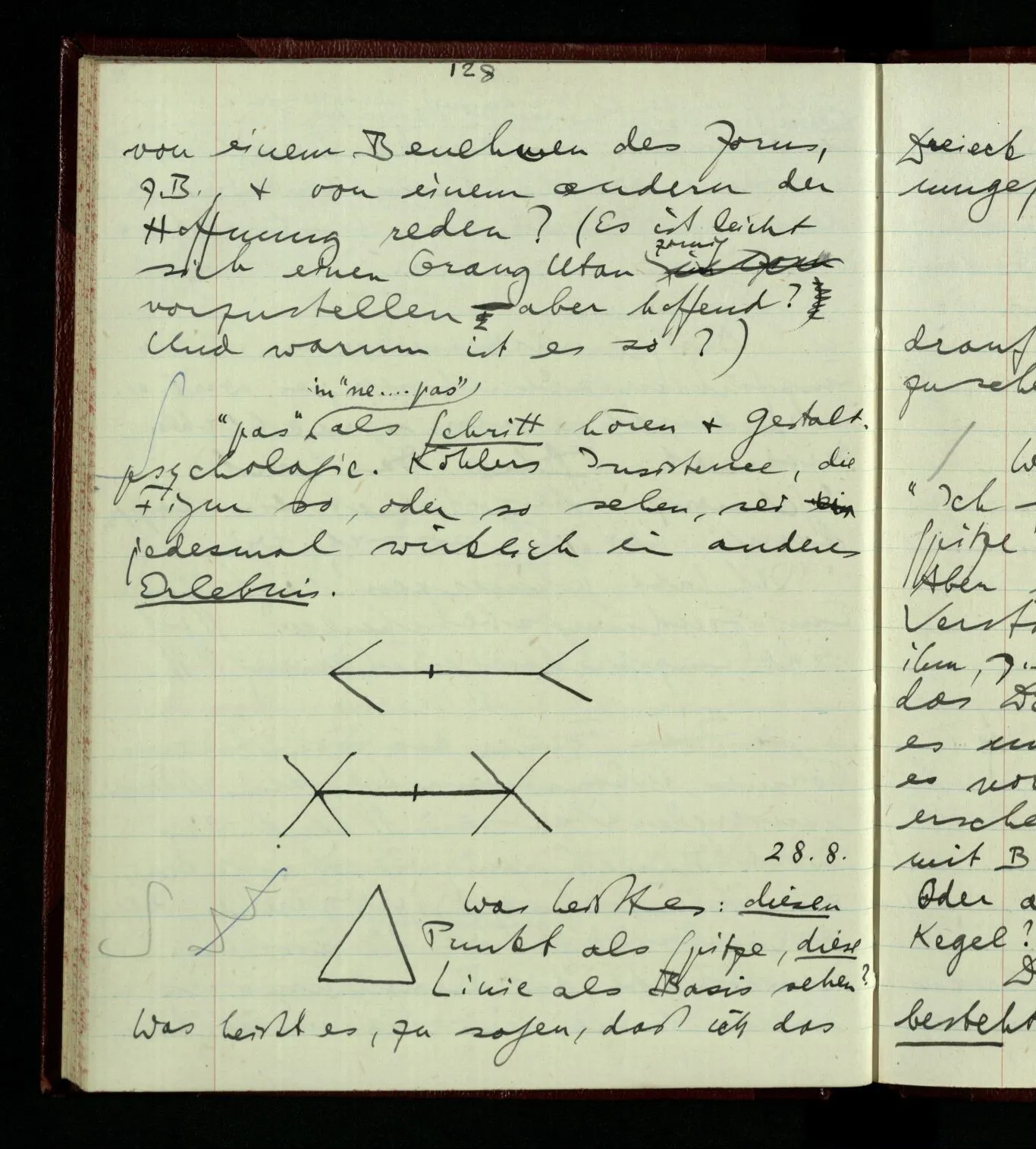Könnte man das auch so sagen: Um sagen zu können, das Gefühl lehre mich, wo jetzt mein Arm steht, oder wie weit ich ihn bewege, müßte man Gefühle & Bewegungen einander zuordnen können. Man müßte sagen können: ‘Wenn ich das Gefühl ‥‥ habe, dann steht mein Arm erfahrungsgemäß dort’. Oder auch: Man müßte ein Kriterium der Identität der Gefühle haben noch außer dem der ausgeführten Bewegung. Aber ist diese Bedingung, wenn sie überhaupt Sinn hat, für das Sehen erfüllt? Nun, man kann ein Gesichtsbild, z.B., zeichnerisch darstellen. Aber Einem, oder sich selbst, das Gefühl geben, das für’s Beugen des Arms um 30˚ charakteristisch sein soll, ohne eben den Arm zu beugen, das kann man nicht. Beuge den Arm ein wenig! Was spürst Du? – Eine Spannung, oder dergleichen hier & dort, & hauptsächlich das Reiben meines Ärmels. Tu’s nocheinmal! War das Gefühl das gleiche? Ungefähr. Ungefähr an den gleichen Stellen. Begleitet dieses Gefühl immer diese Beugung, kannst Du’s sagen? Nein. Und doch paßt mir an diesem Argument etwas noch nicht.