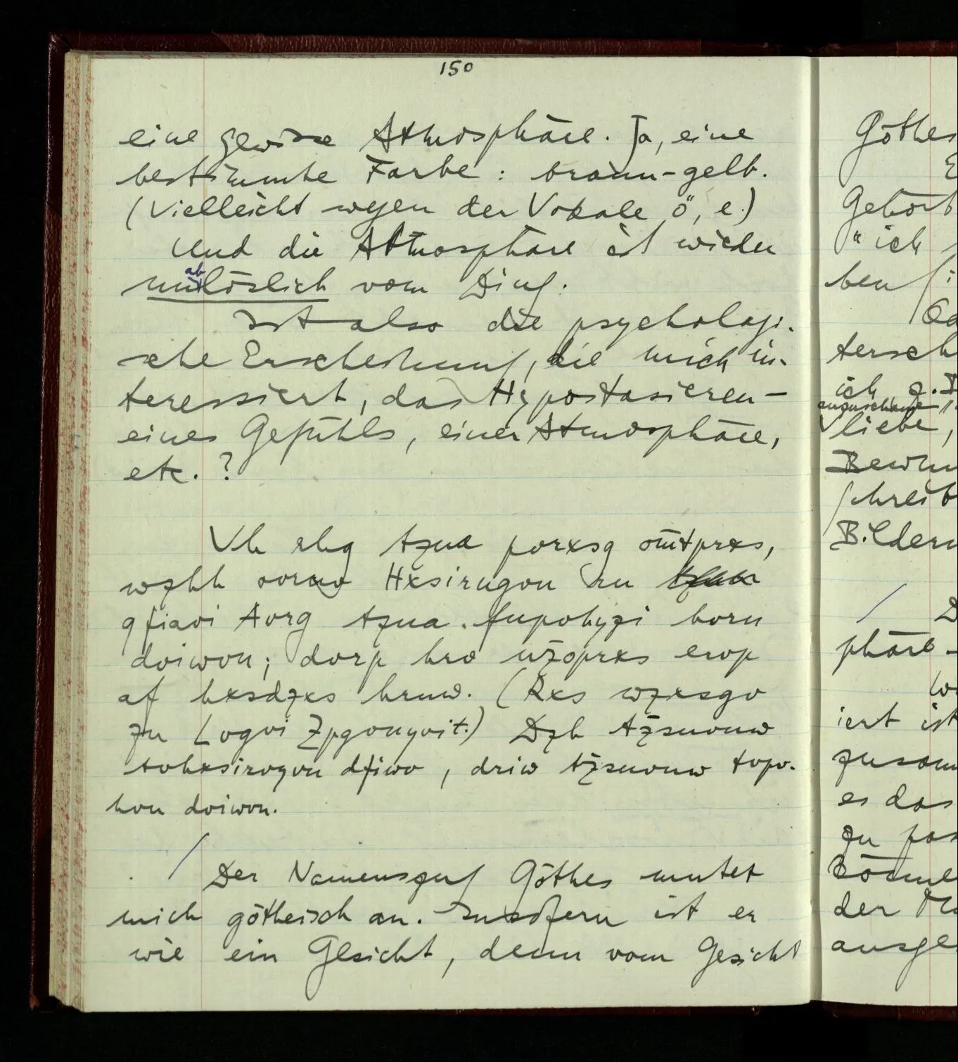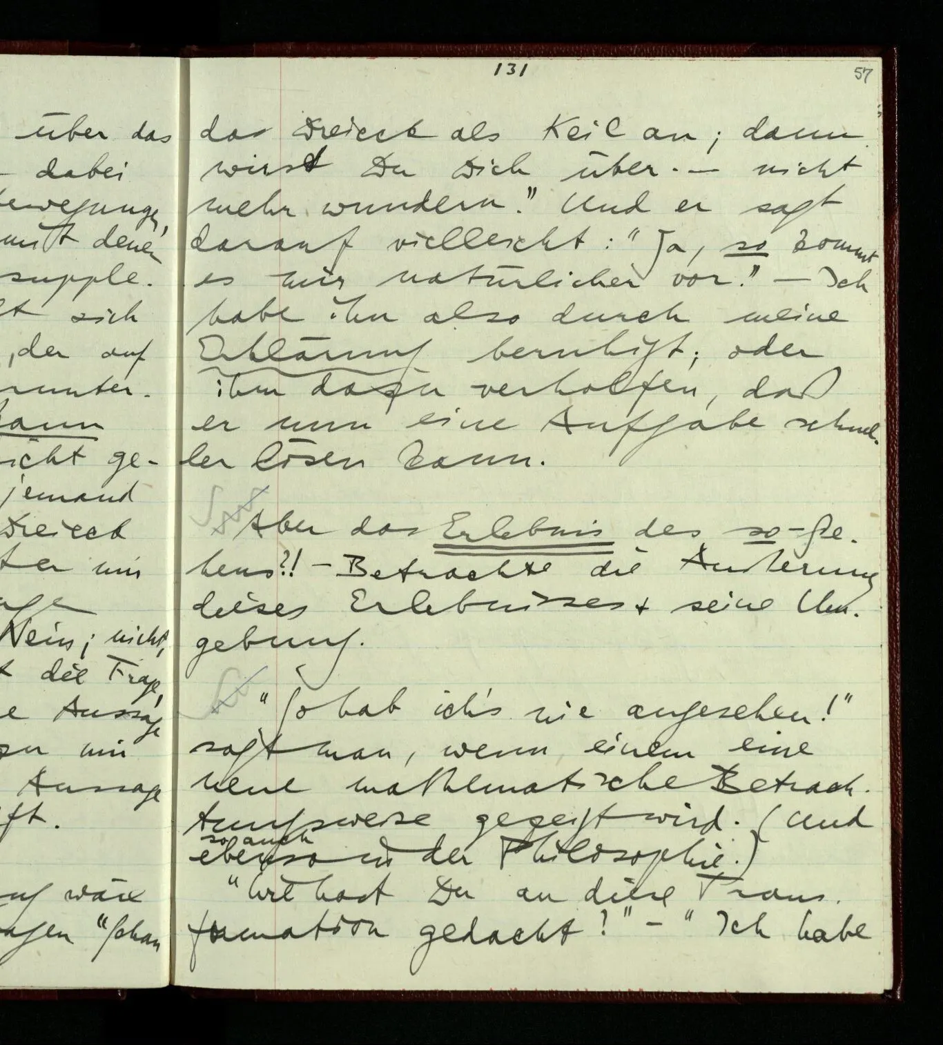 “Wenn Du vom Traum, vom Denken, von der Empfindung redest, – scheinen nicht alle diese Dinge das Geheimnisvolle zu verlieren, was ihr wesentliches Merkmal zu sein scheint?” Warum soll der Traum geheimnisvoller sein, als der Tisch? Warum sollen sie nicht beide gleich geheimnisvoll sein?