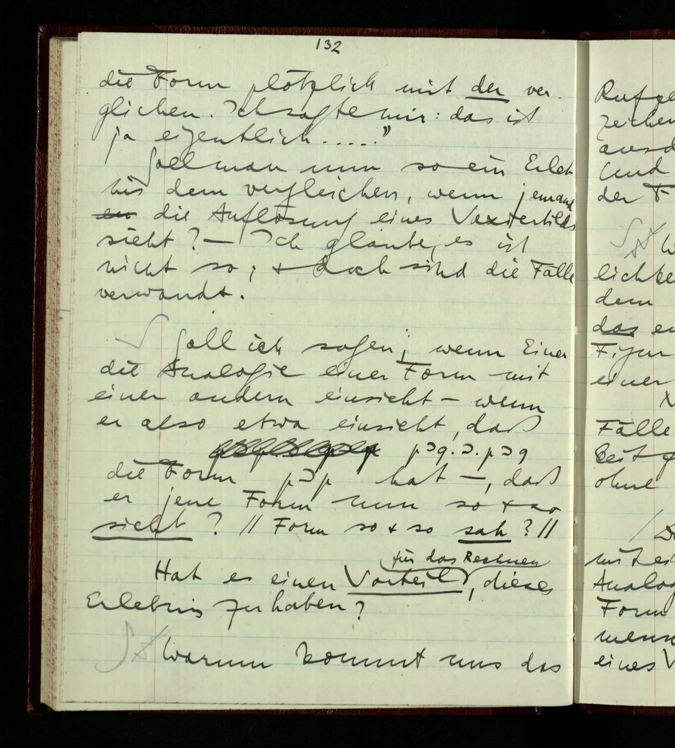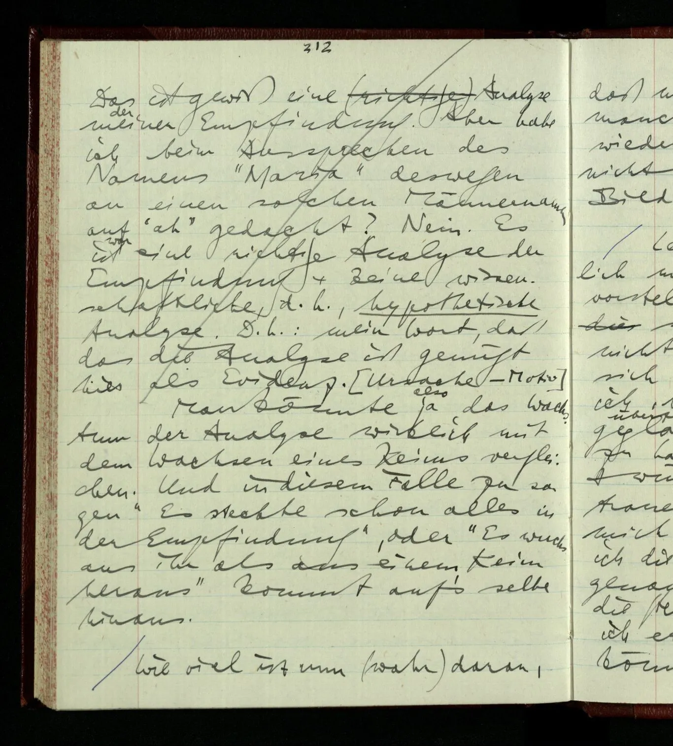 “Wenn ich das Wort “Maria” als Männername verstehe, fasse ich’s so auf wie Eliah oder ‥‥” Das ist gewiß eine Analyse meiner Empfindung. Aber habe ich beim Aussprechen des Namens “Maria” deswegen an einen solchen Männernamen auf “ah” gedacht? Nein. Es ist eine richtige Analyse der Empfindung & keine wissenschaftliche, d.h., hypothetische Analyse. D.h.: mein Wort, daß das die Analyse ist genügt hier als Evidenz. [Ursache – Motiv] Man könnte ja das Wachstum der Analyse wirklich mit dem Wachsen eines Keims vergleichen. Und in diesem Falle zu sagen “Es steckte schon alles in der Empfindung”, oder “Es wuchs aus ihr als aus einem Keim heraus” kommt auf’s selbe hinaus.