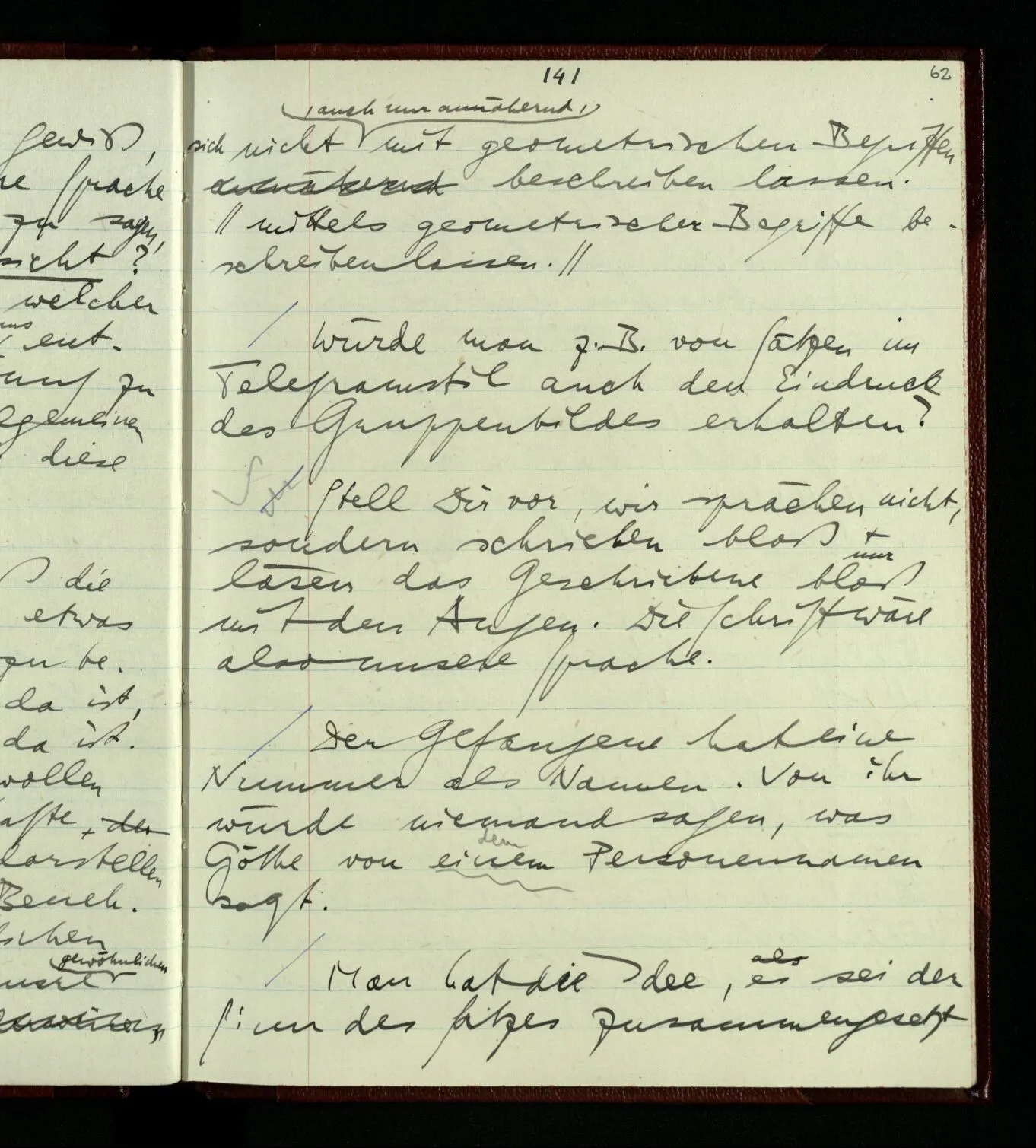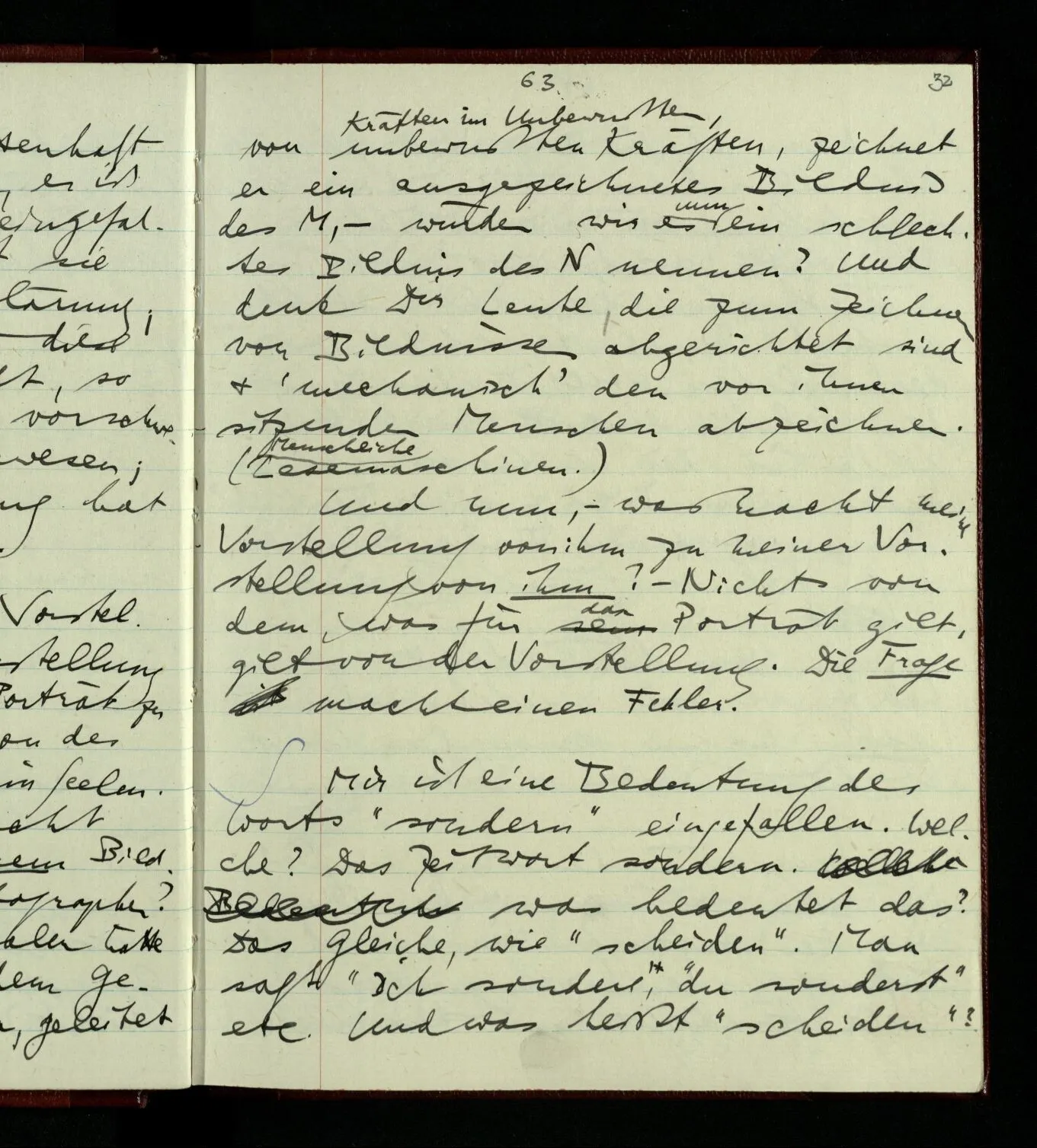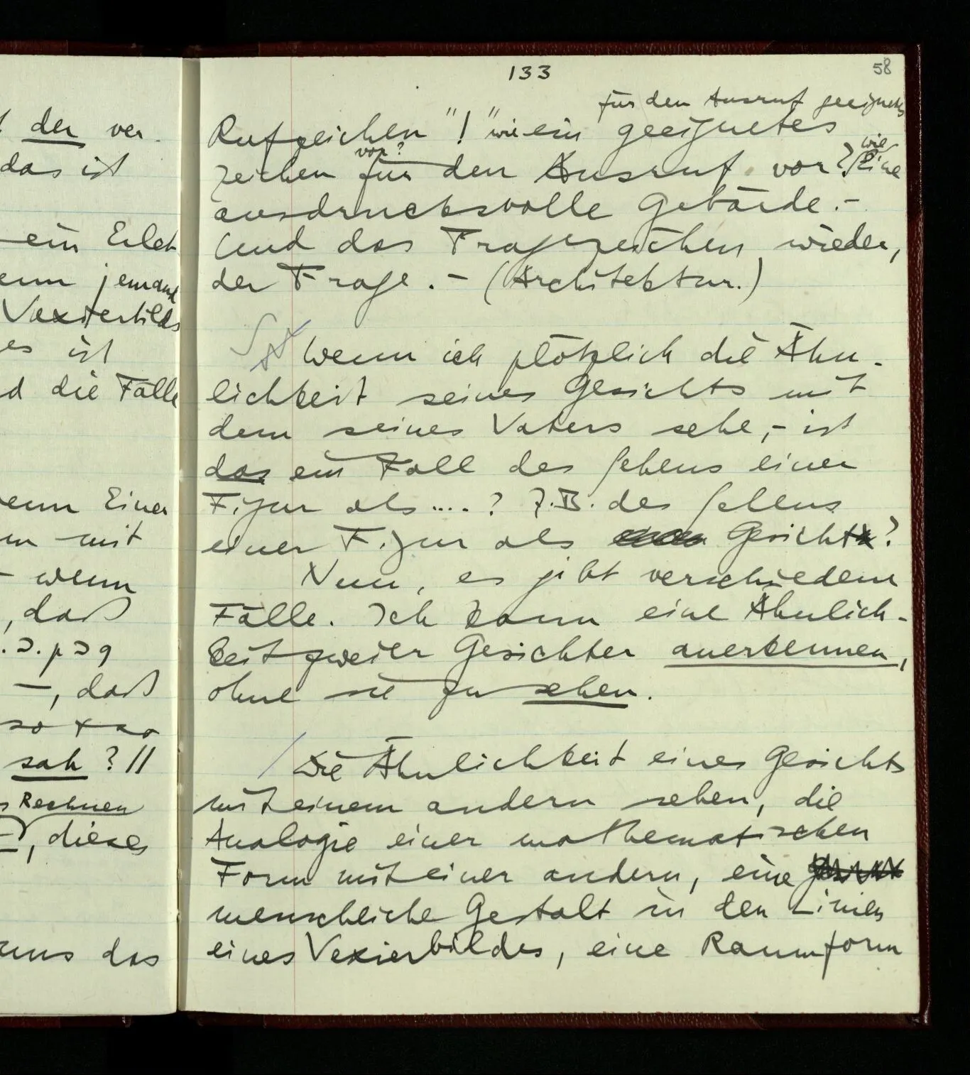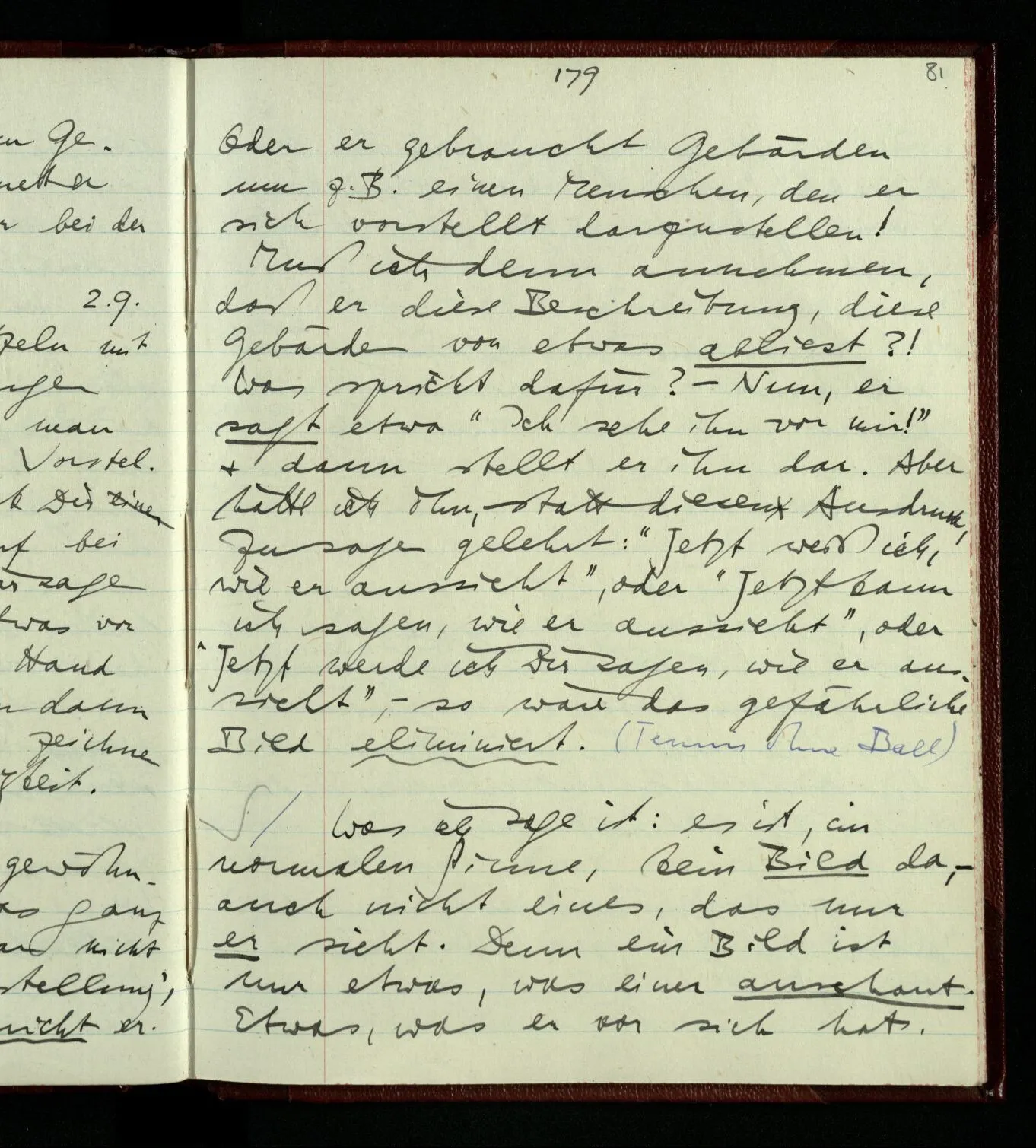 Ich redete zu meinen Nachbarn über ihren Doktor, dabei schwebt mir ein Bild dieses Menschen vor – ich habe ihn aber nie gesehen, kenne nur seinen Namen, & mache mir vielleicht nach diesem ein Bild von ihm. Wie kann nun dieses Bild charakteristisch dafür sein, daß ich von ihm rede? – Und doch kam es mir so vor, bis ich mich daran erinnerte, daß ich gar nicht weiß, wie dieser Mann ausschaut. Sein Bild repräsentiert ihn für mich also um kein Haar besser als sein Name.