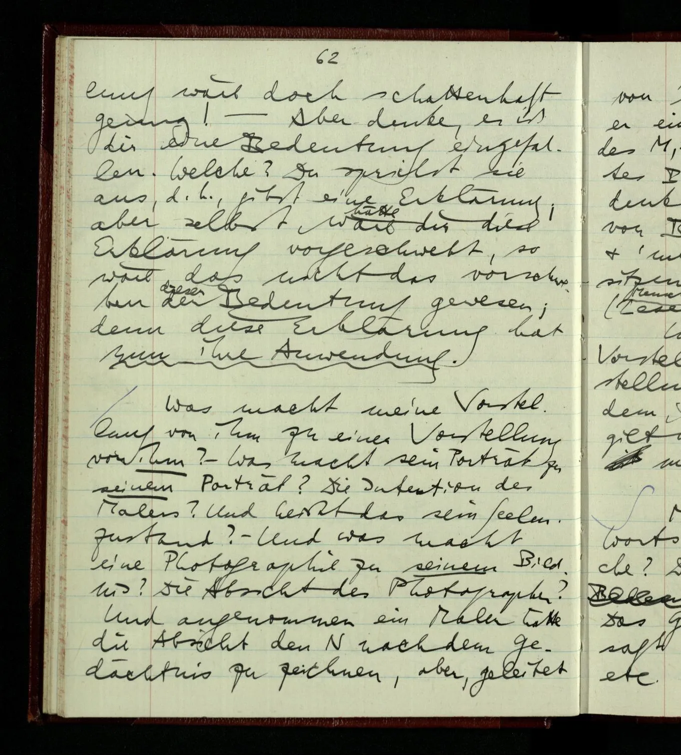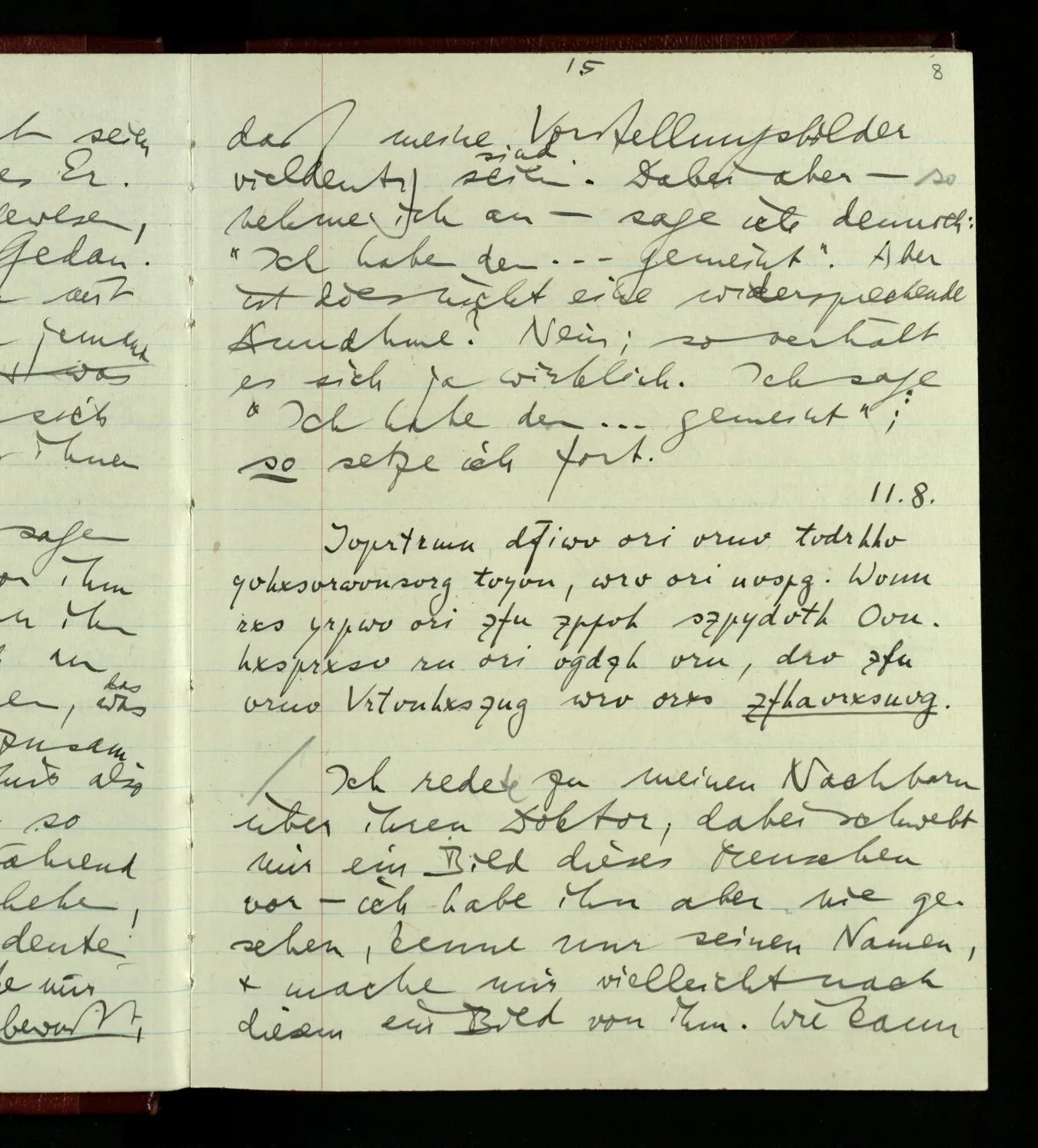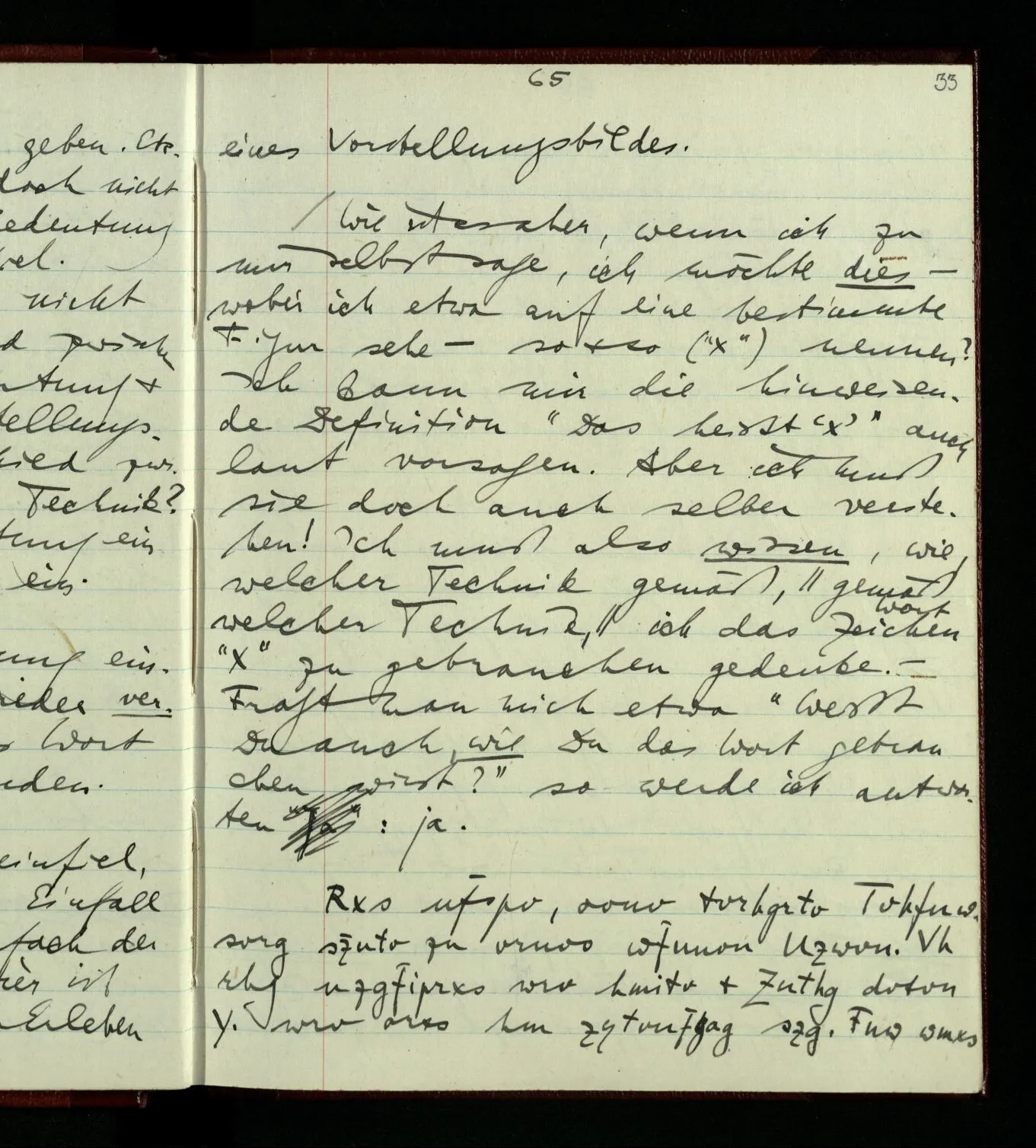 Ich redete zu meinen Nachbarn über ihren Doktor, dabei schwebt mir ein Bild dieses Menschen vor – ich habe ihn aber nie gesehen, kenne nur seinen Namen, & mache mir vielleicht nach diesem ein Bild von ihm. Wie kann nun dieses Bild charakteristisch dafür sein, daß ich von ihm rede? – Und doch kam es mir so vor, bis ich mich daran erinnerte, daß ich gar nicht weiß, wie dieser Mann ausschaut. Sein Bild repräsentiert ihn für mich also um kein Haar besser als sein Name.