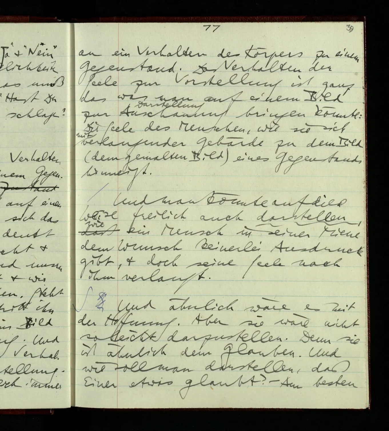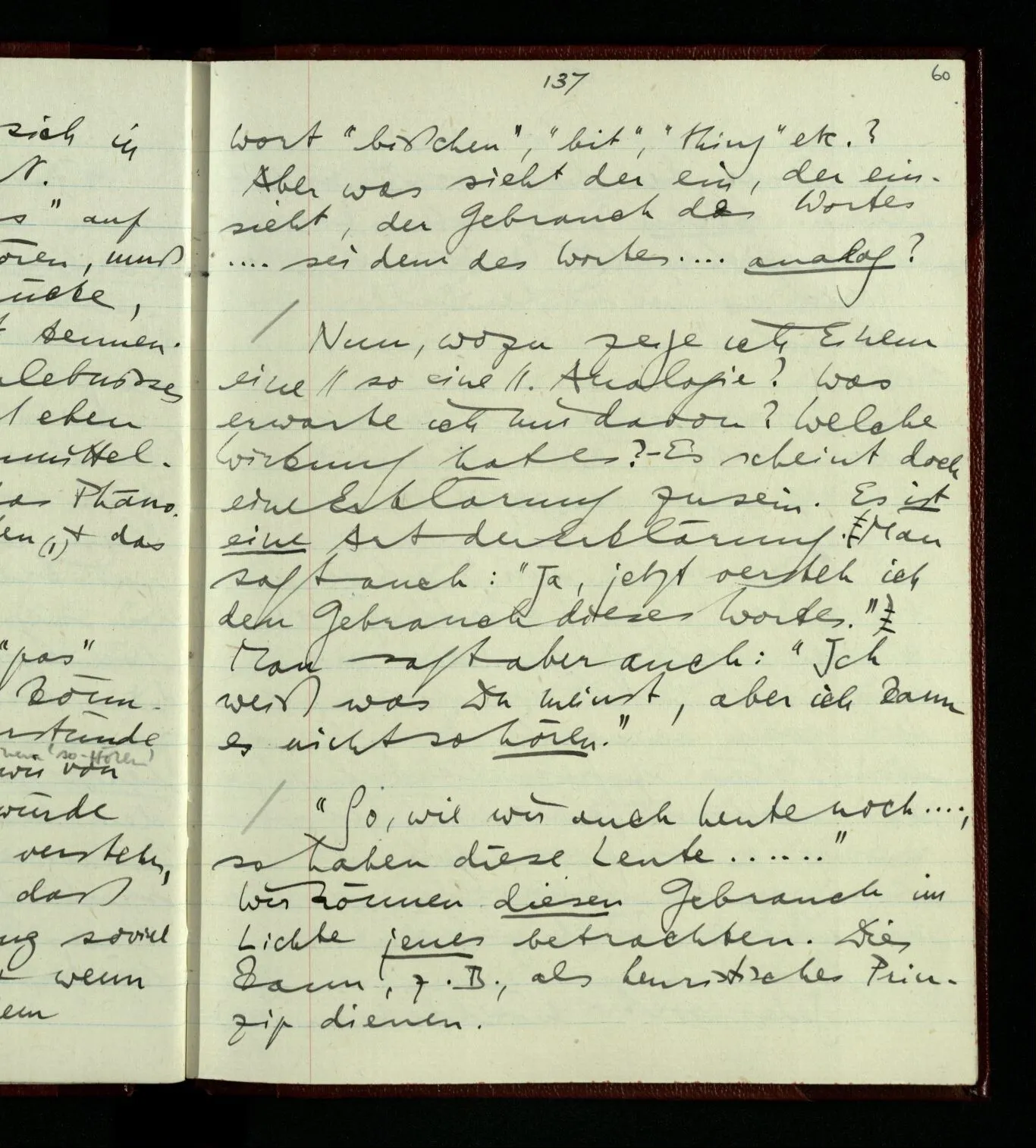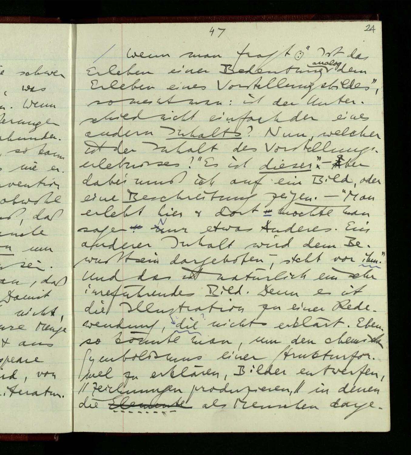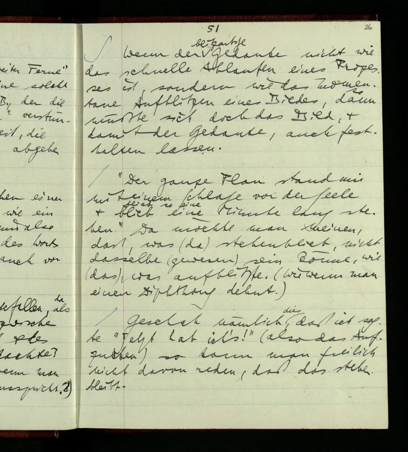 Ich redete zu meinen Nachbarn über ihren Doktor, dabei schwebt mir ein Bild dieses Menschen vor – ich habe ihn aber nie gesehen, kenne nur seinen Namen, & mache mir vielleicht nach diesem ein Bild von ihm. Wie kann nun dieses Bild charakteristisch dafür sein, daß ich von ihm rede? – Und doch kam es mir so vor, bis ich mich daran erinnerte, daß ich gar nicht weiß, wie dieser Mann ausschaut. Sein Bild repräsentiert ihn für mich also um kein Haar besser als sein Name.