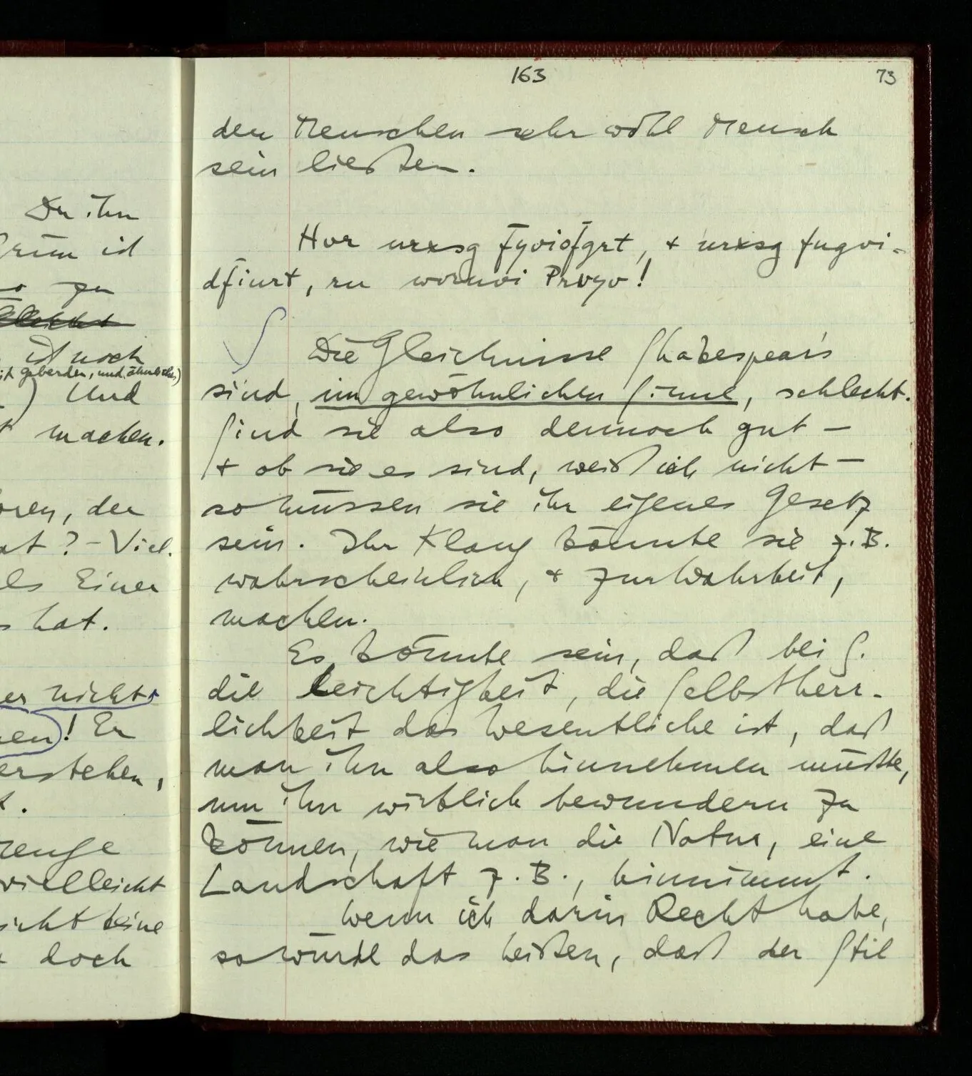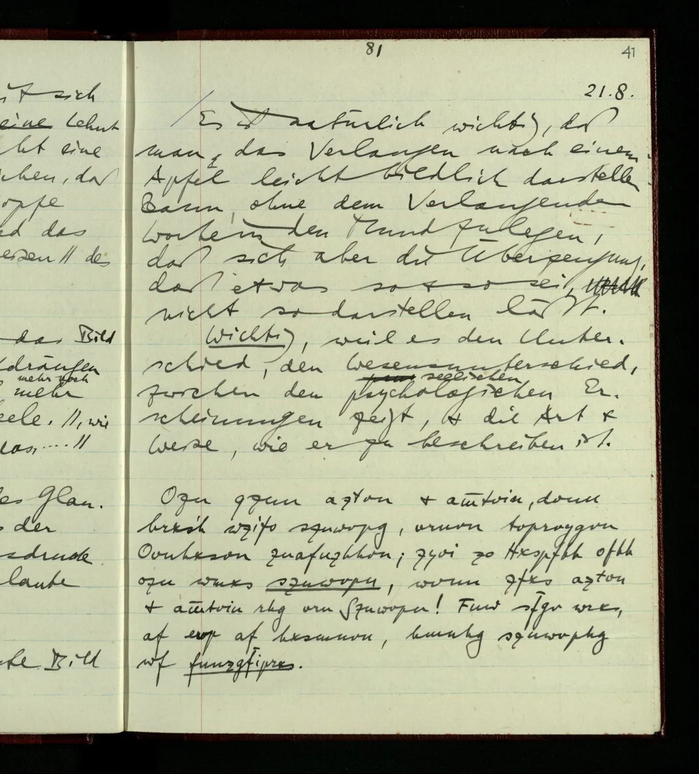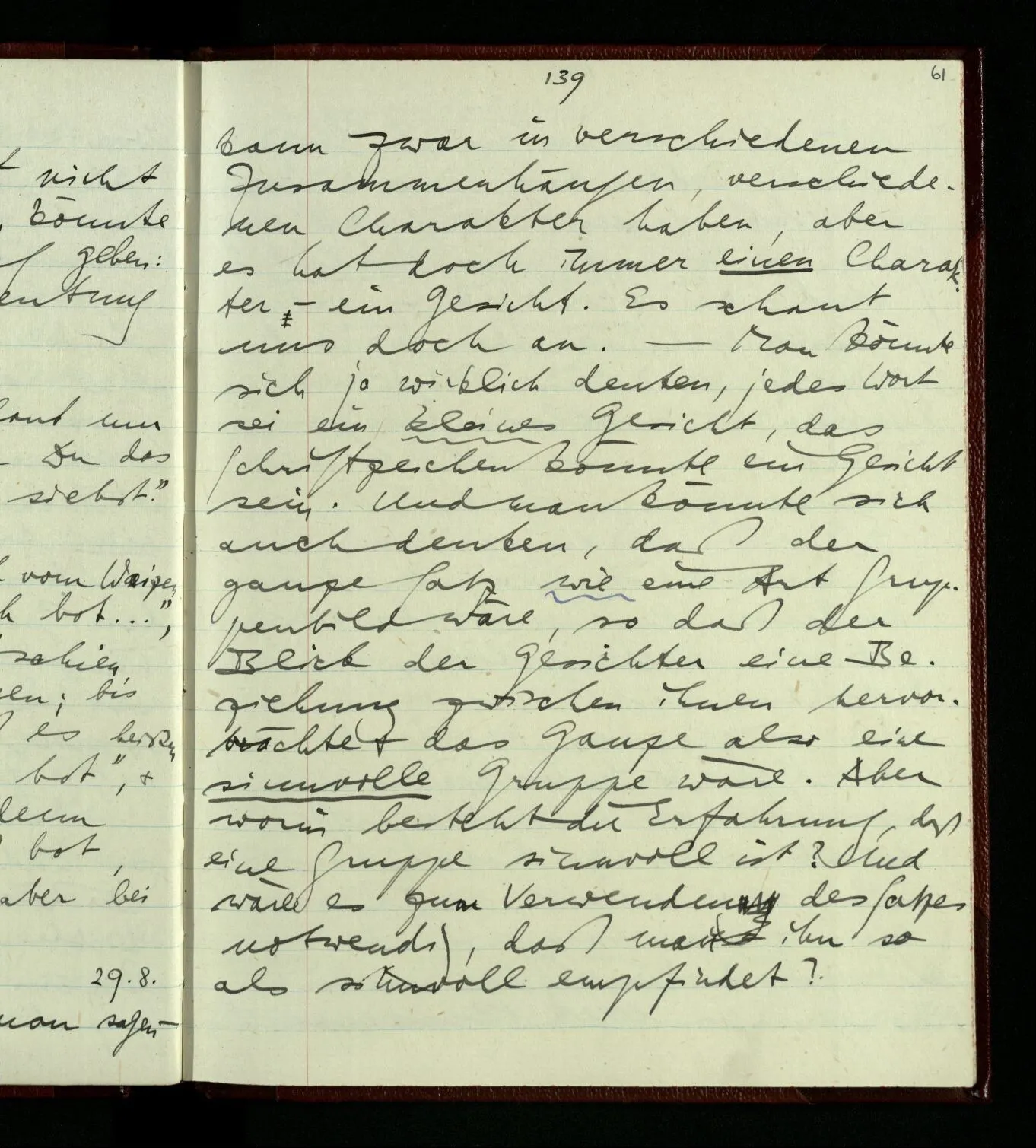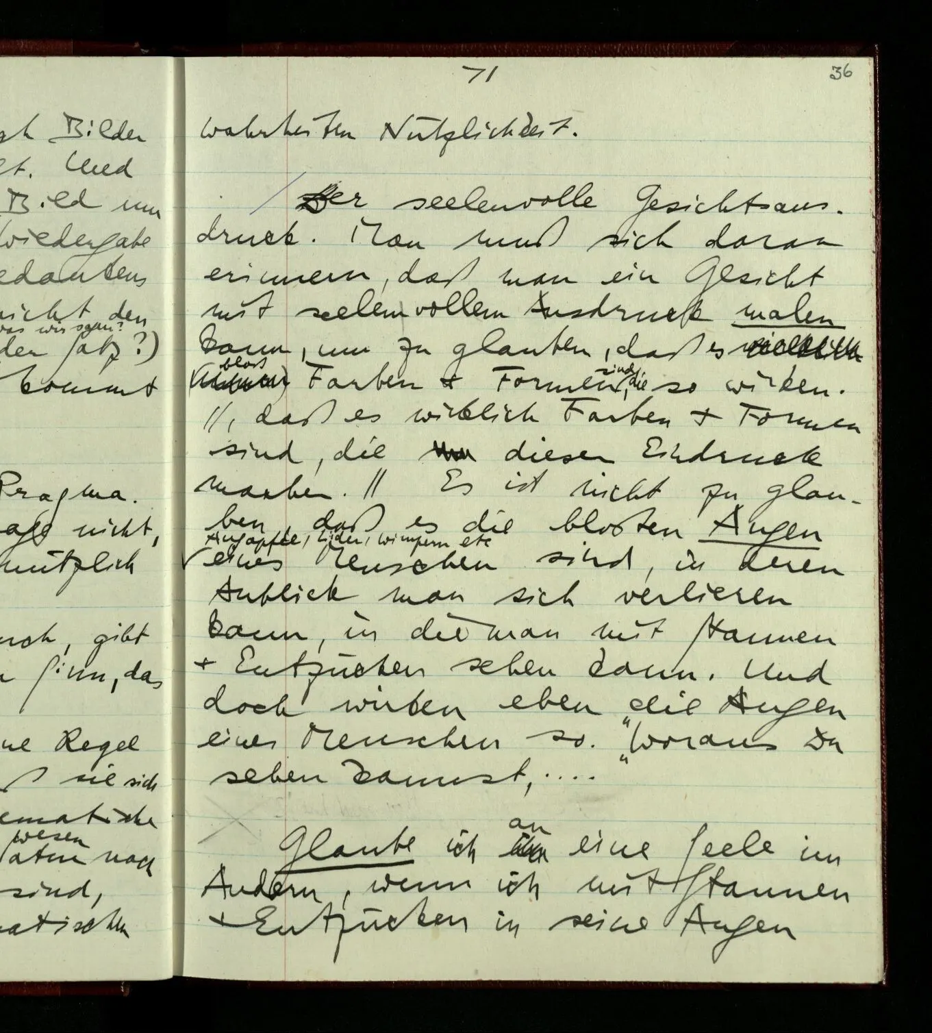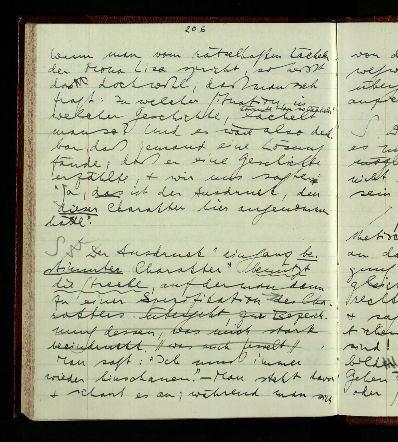 07.09.1946 “Dieser Kaffee hat gar keinen Geschmack”. “Dies Gesicht hat gar keinen Ausdruck”. Der Gegensatz davon ist “Es hat einen ganz bestimmten Ausdruck” (obwohl ich nicht sagen könnte, welchen). An einen starken Ausdruck könnte sich z.B. gleich eine Geschichte knüpfen. Oder das Suchen nach einer Geschichte. Wenn man vom rätselhaften Lächeln der Mona Lisa spricht, so heißt das doch wohl, daß man sich fragt: In welcher Situation, welcher Geschichte, lächelt man so? Und es wäre also denkbar, daß jemand eine Lösung fände; daß er eine Geschichte erzählte, & wir uns sagten: “Ja, das ist der Ausdruck, den dieser Charakter hier angenommen hätte”.