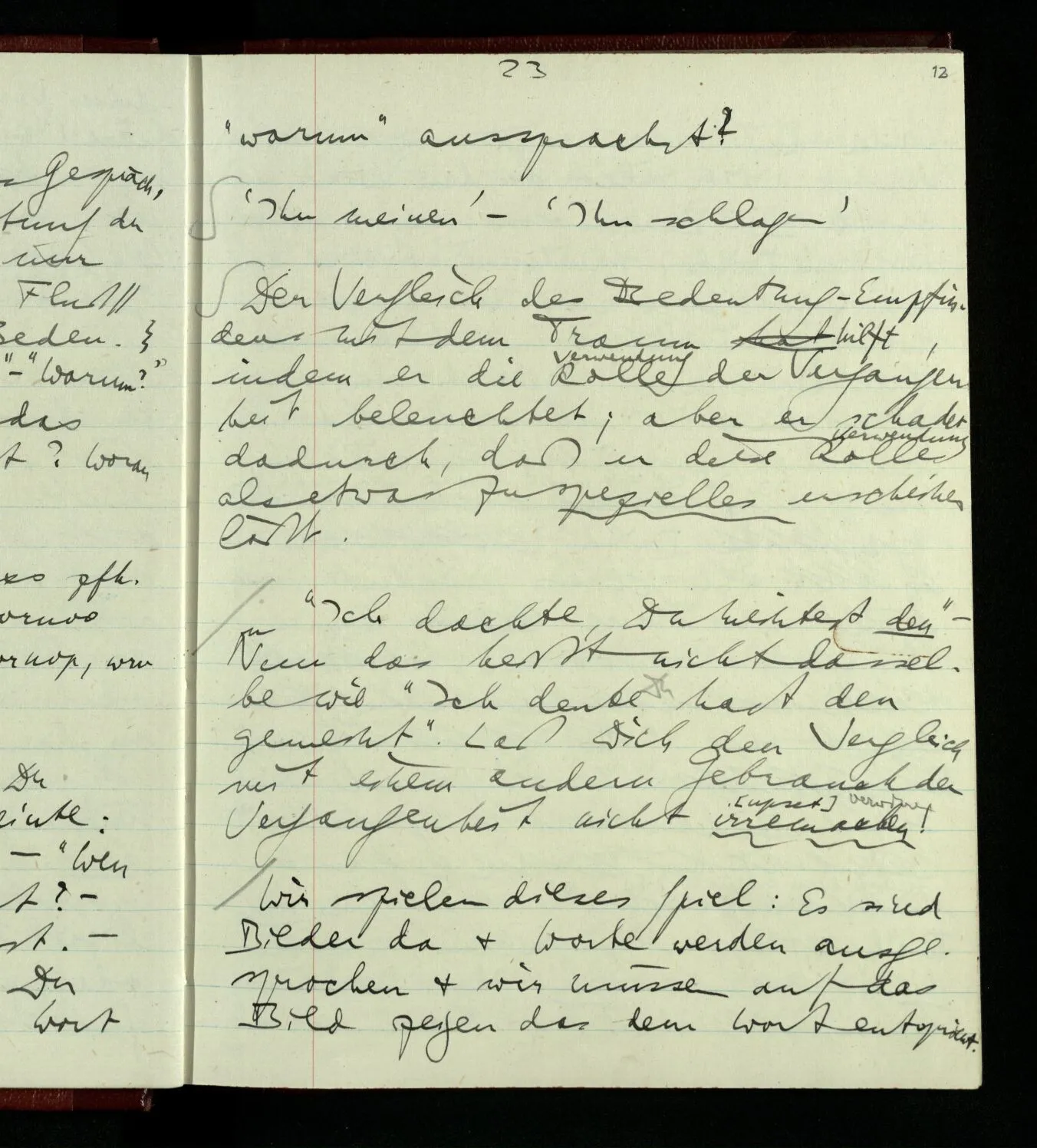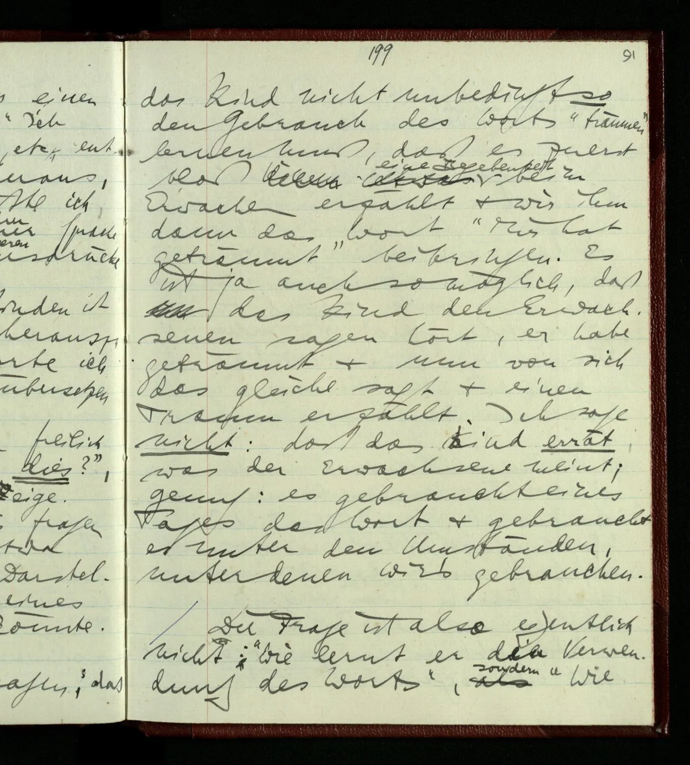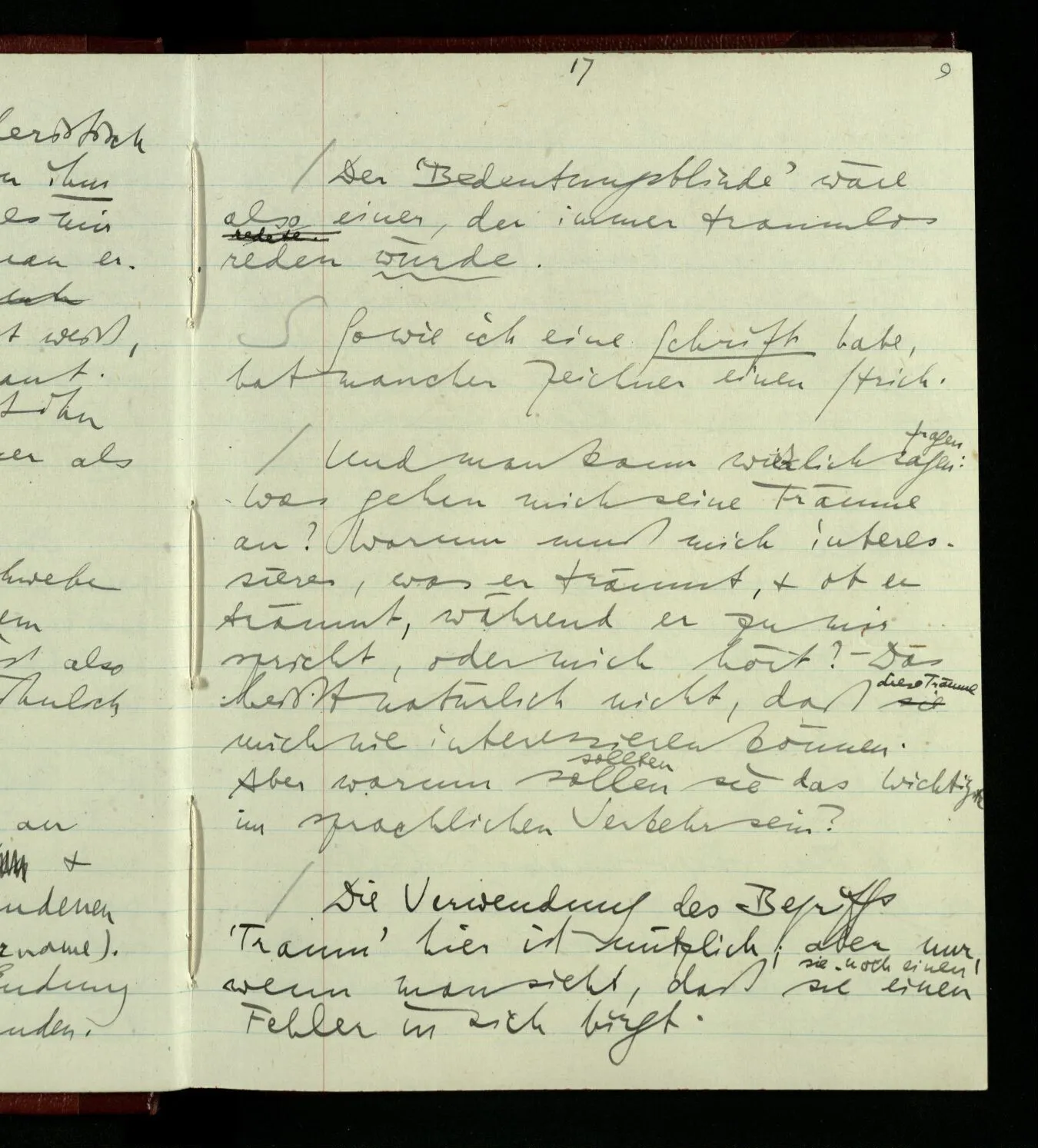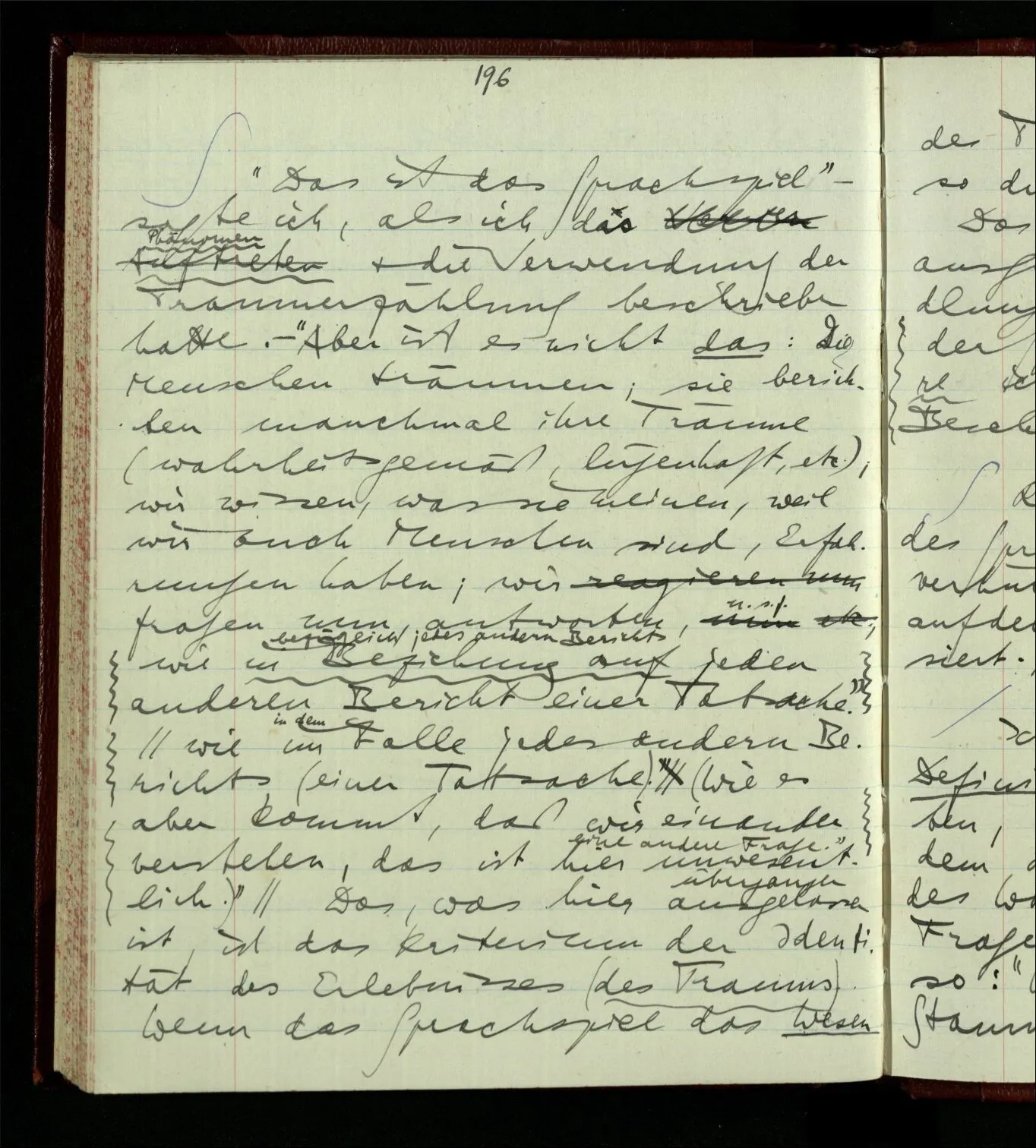 Und man kann wirklich sagen: Was gehen mich seine Träume an? Warum muß mich interessieren, was er träumt, & ob er träumt, während er zu mir spricht, oder mich hört? – Das heißt natürlich nicht, daß diese Träume mich nie interessieren können. Aber warum sollen sie das Wichtigste im sprachlichen Verkehr sein?