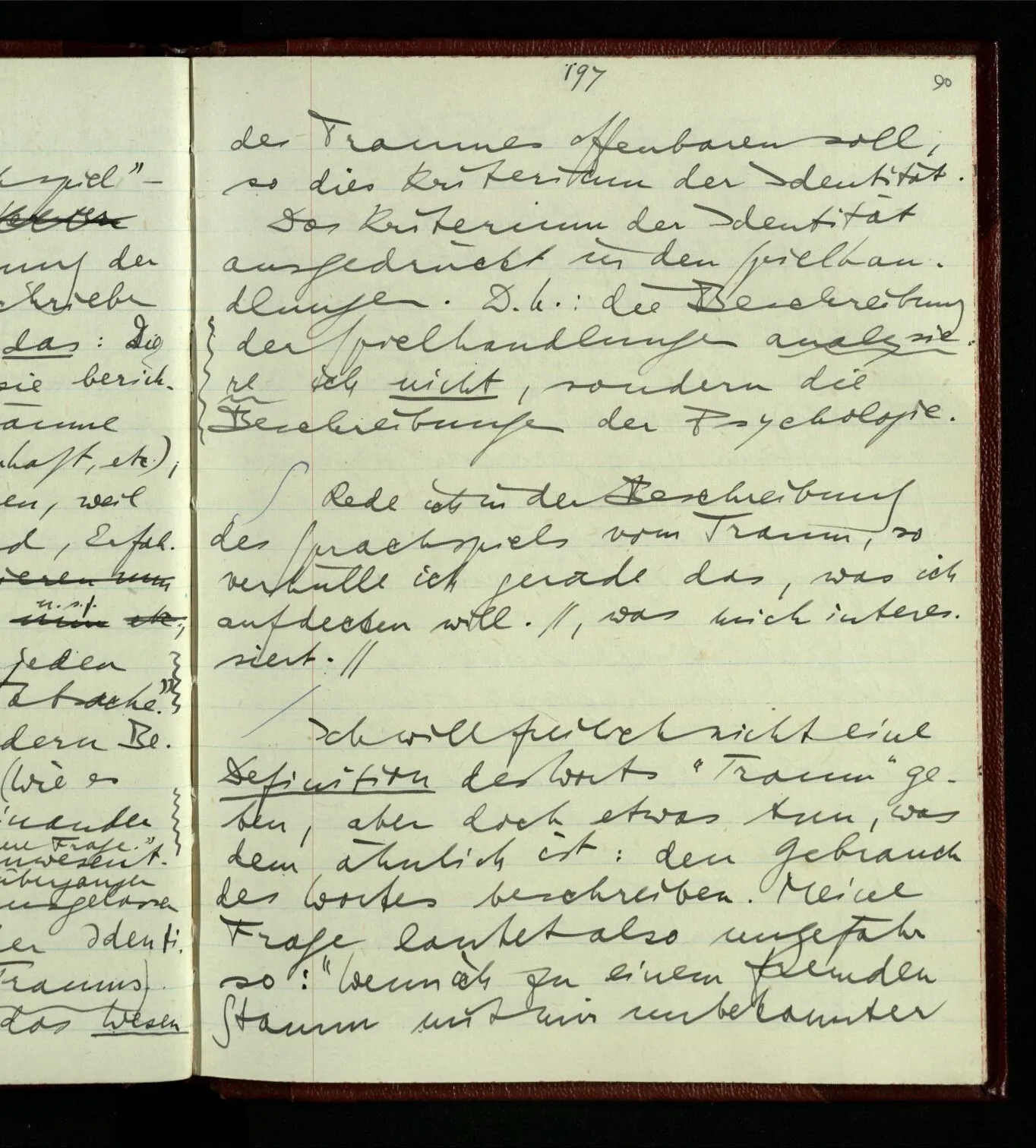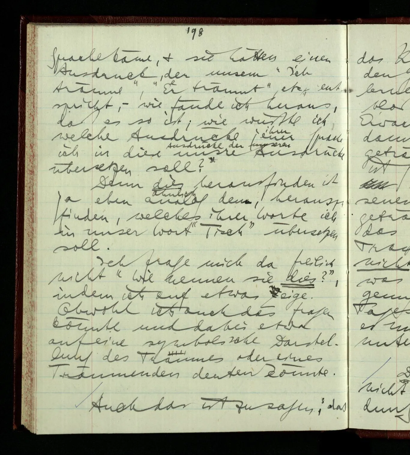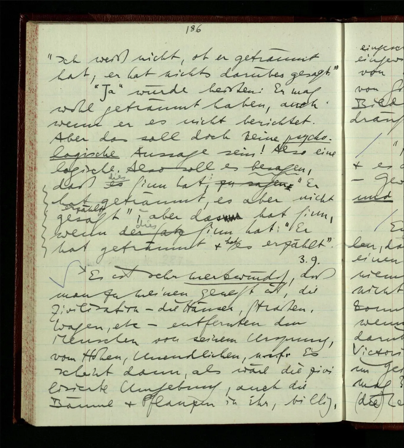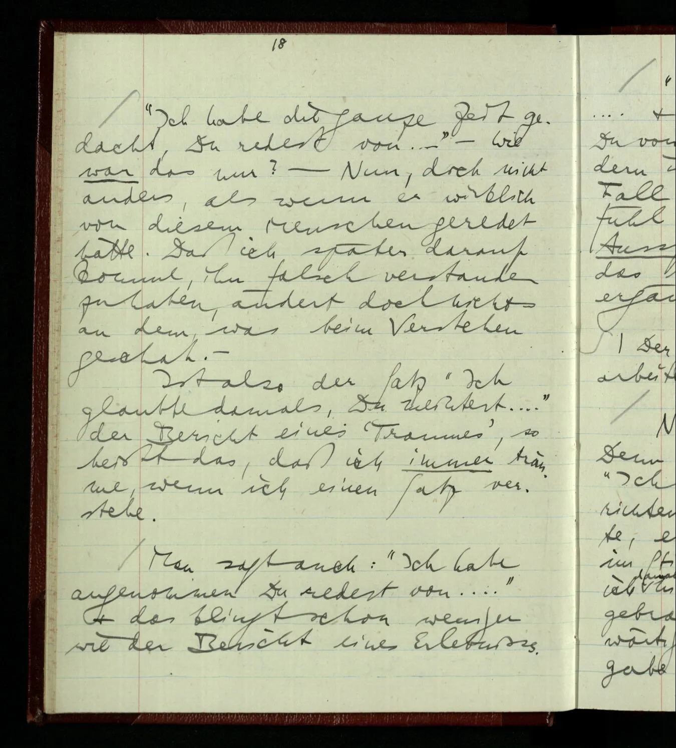 Und man kann wirklich sagen: Was gehen mich seine Träume an? Warum muß mich interessieren, was er träumt, & ob er träumt, während er zu mir spricht, oder mich hört? – Das heißt natürlich nicht, daß diese Träume mich nie interessieren können. Aber warum sollen sie das Wichtigste im sprachlichen Verkehr sein?