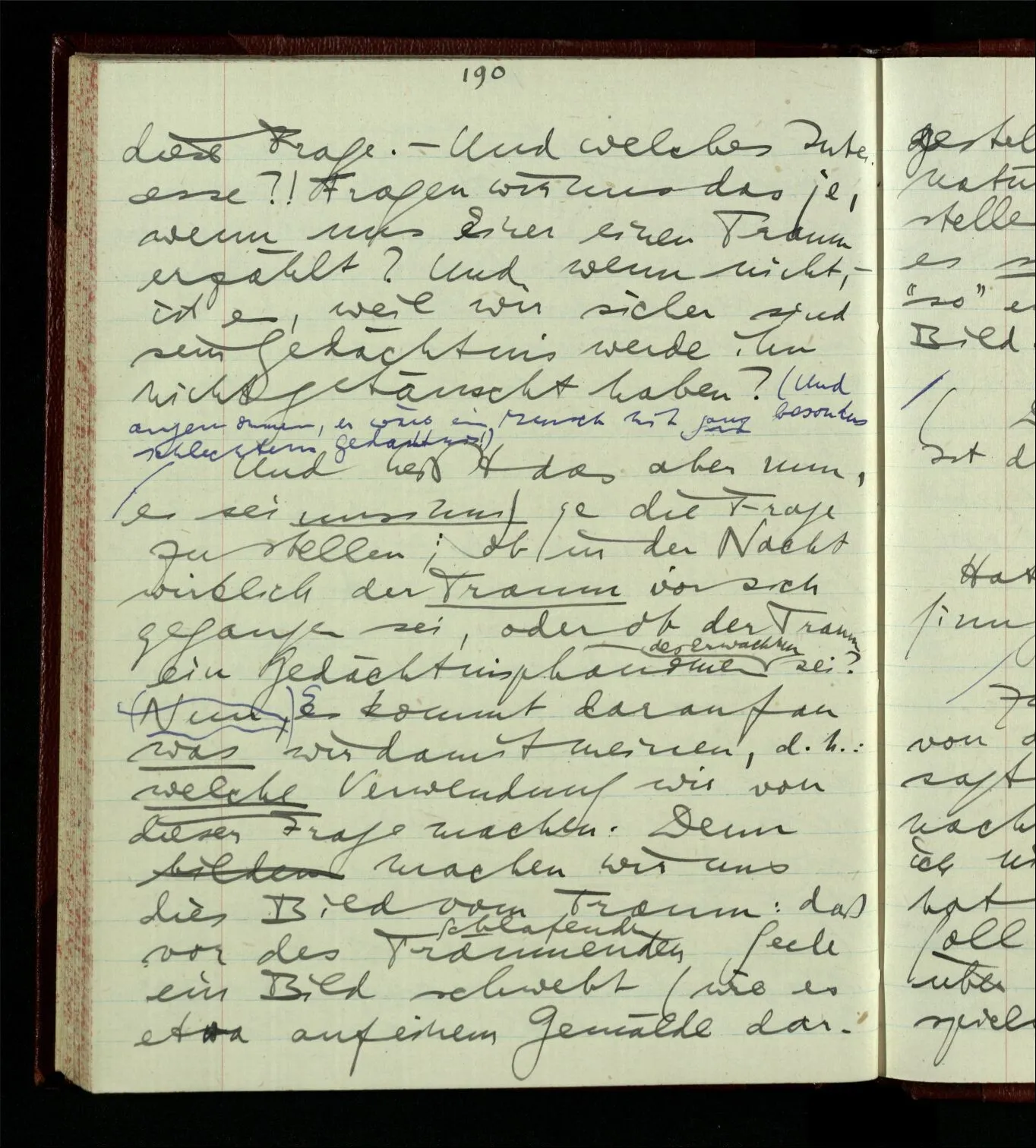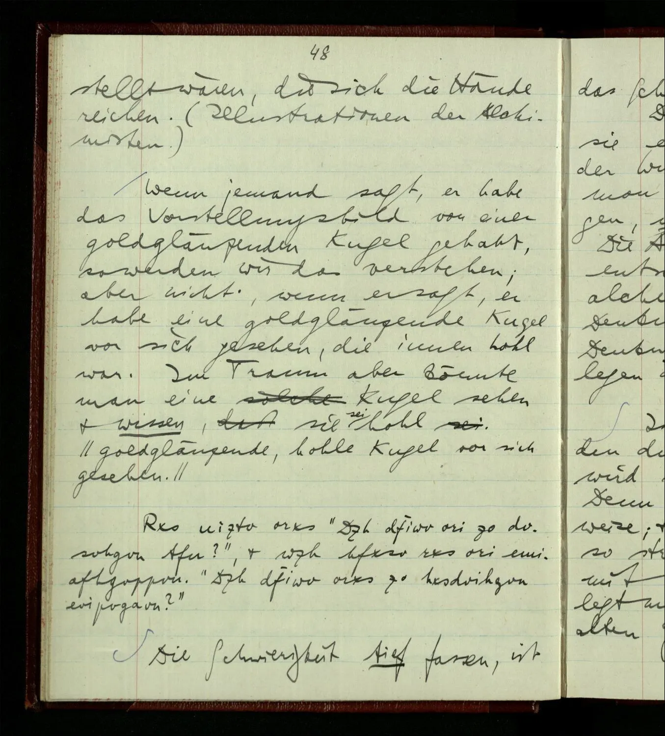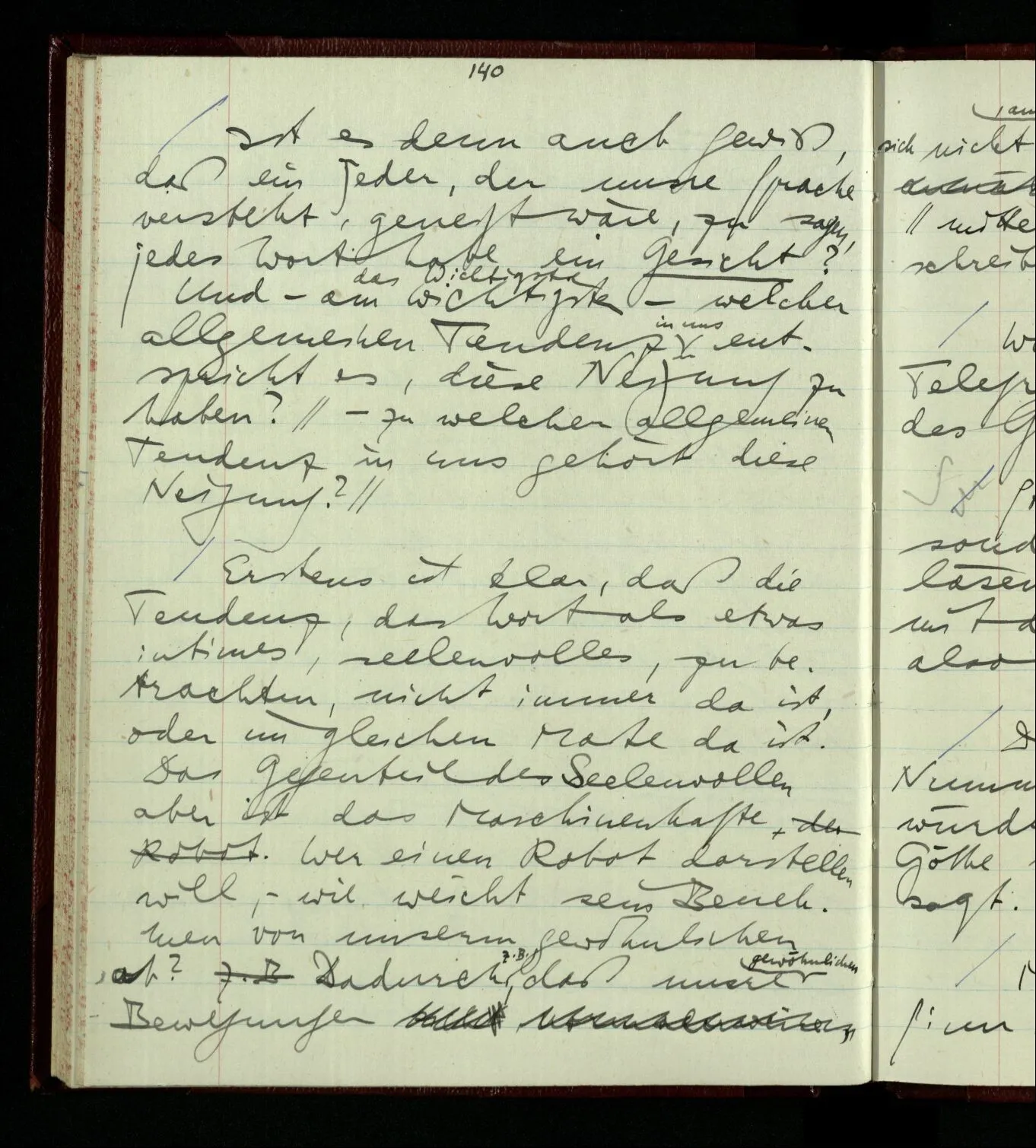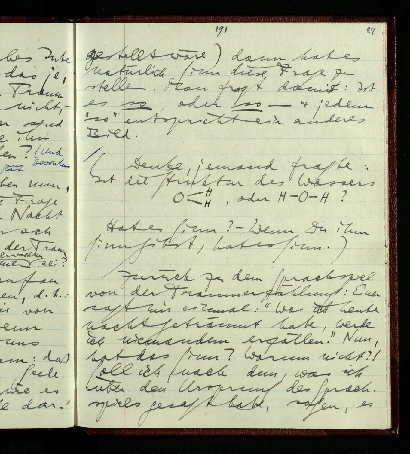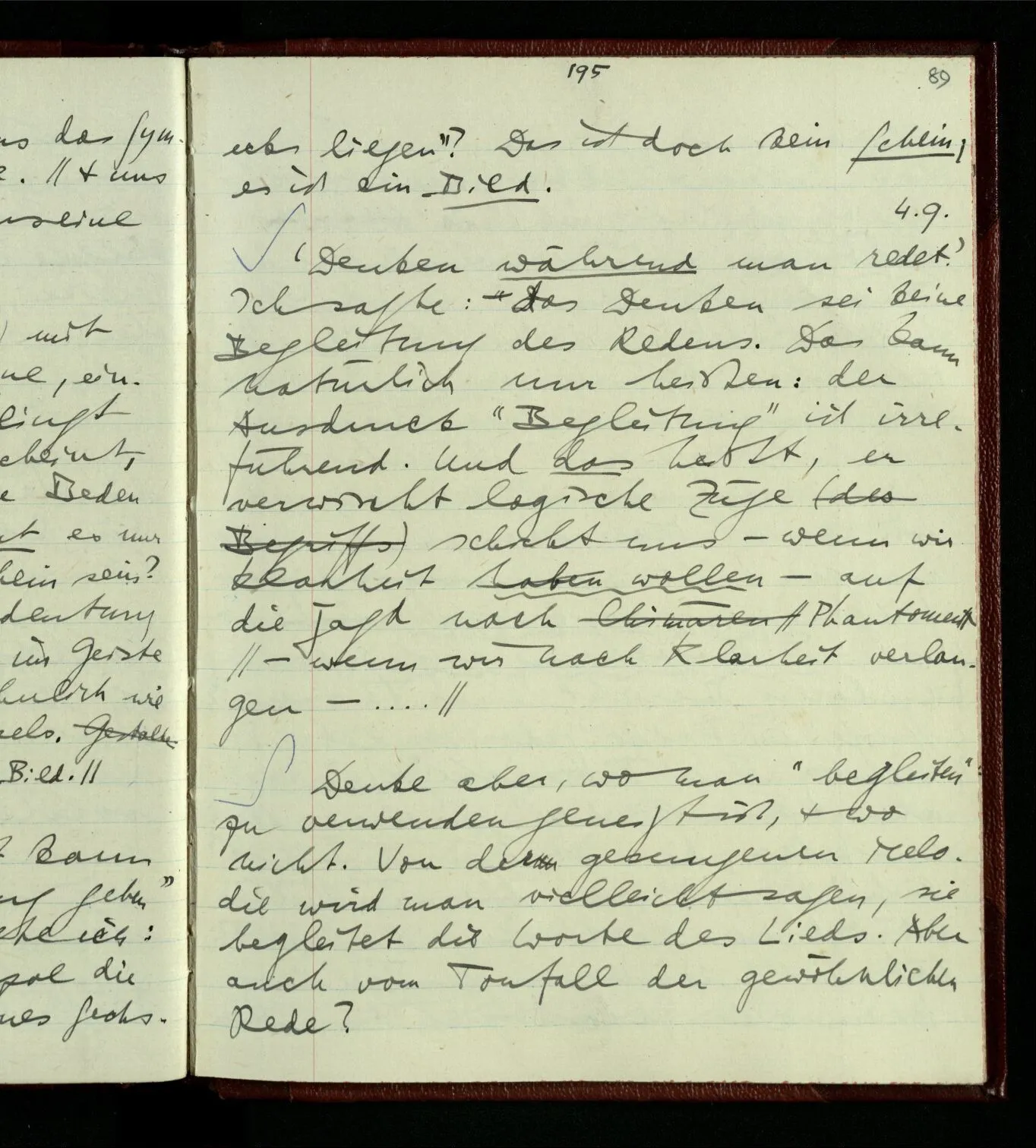 Und man kann wirklich sagen: Was gehen mich seine Träume an? Warum muß mich interessieren, was er träumt, & ob er träumt, während er zu mir spricht, oder mich hört? – Das heißt natürlich nicht, daß diese Träume mich nie interessieren können. Aber warum sollen sie das Wichtigste im sprachlichen Verkehr sein?