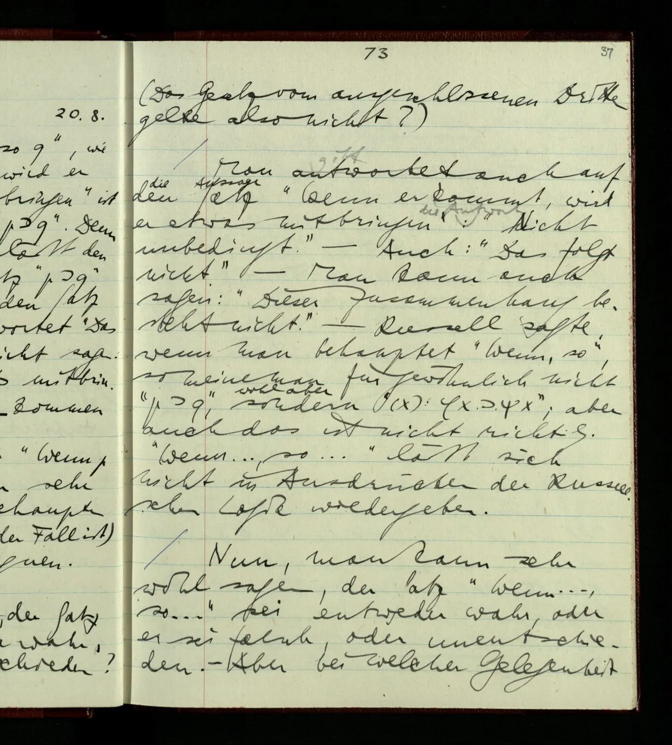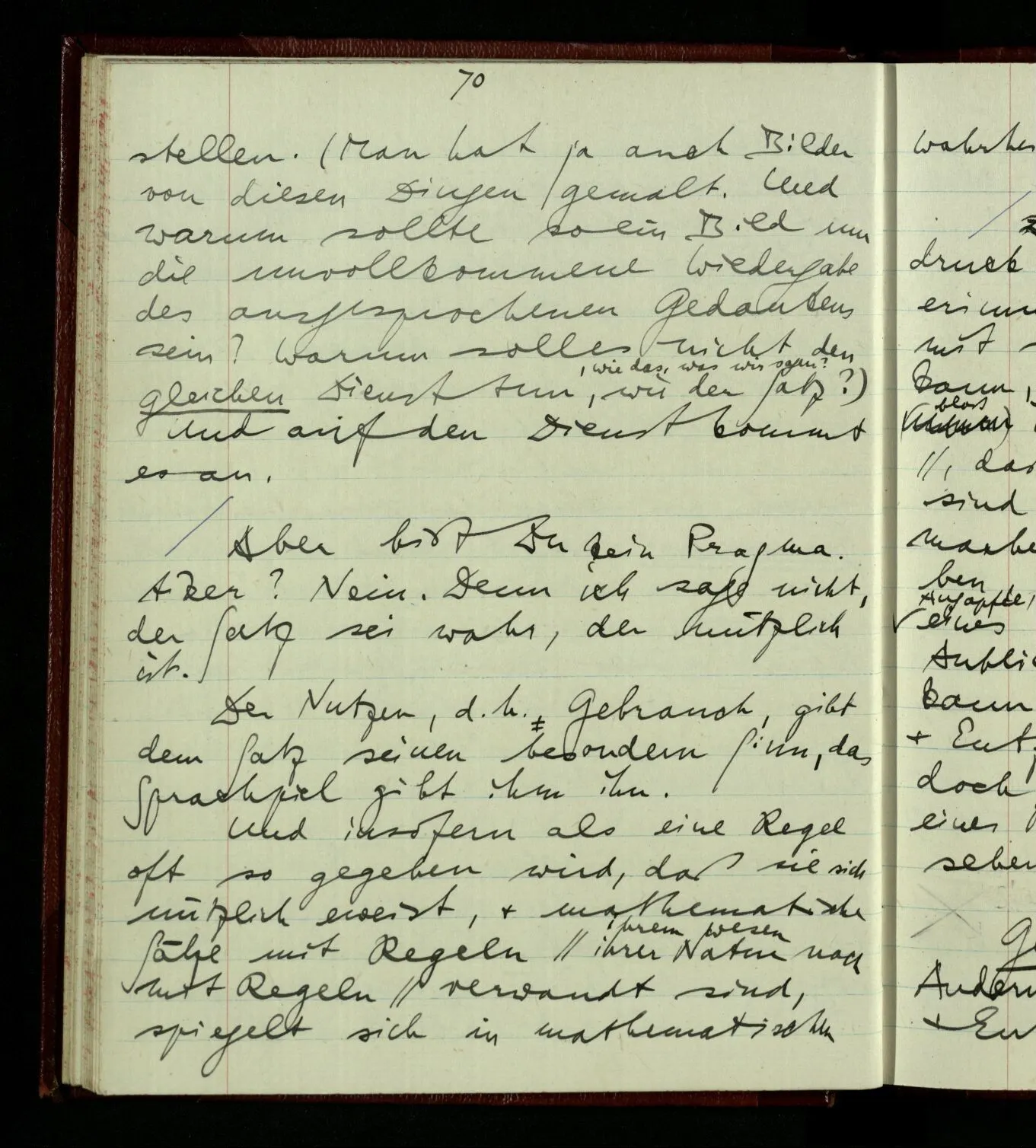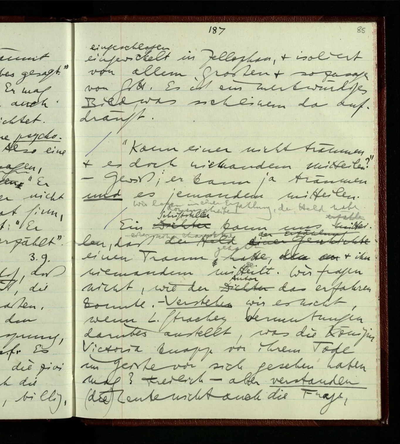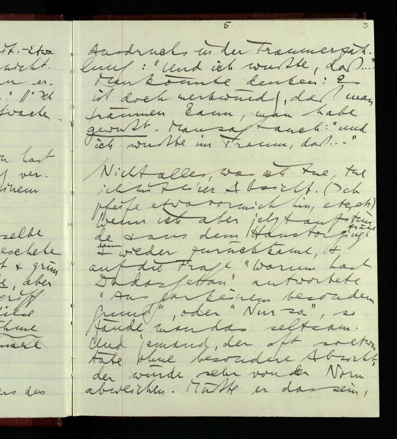 Und man kann wirklich sagen: Was gehen mich seine Träume an? Warum muß mich interessieren, was er träumt, & ob er träumt, während er zu mir spricht, oder mich hört? – Das heißt natürlich nicht, daß diese Träume mich nie interessieren können. Aber warum sollen sie das Wichtigste im sprachlichen Verkehr sein?