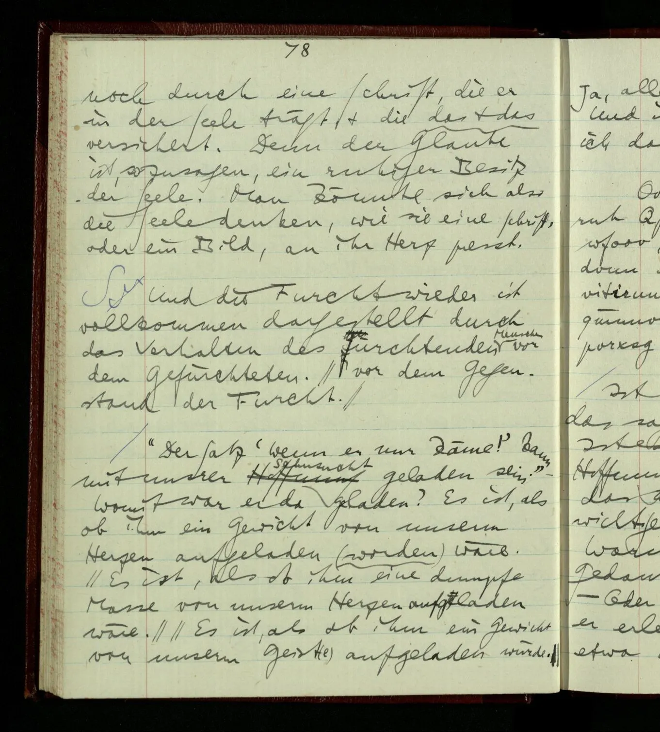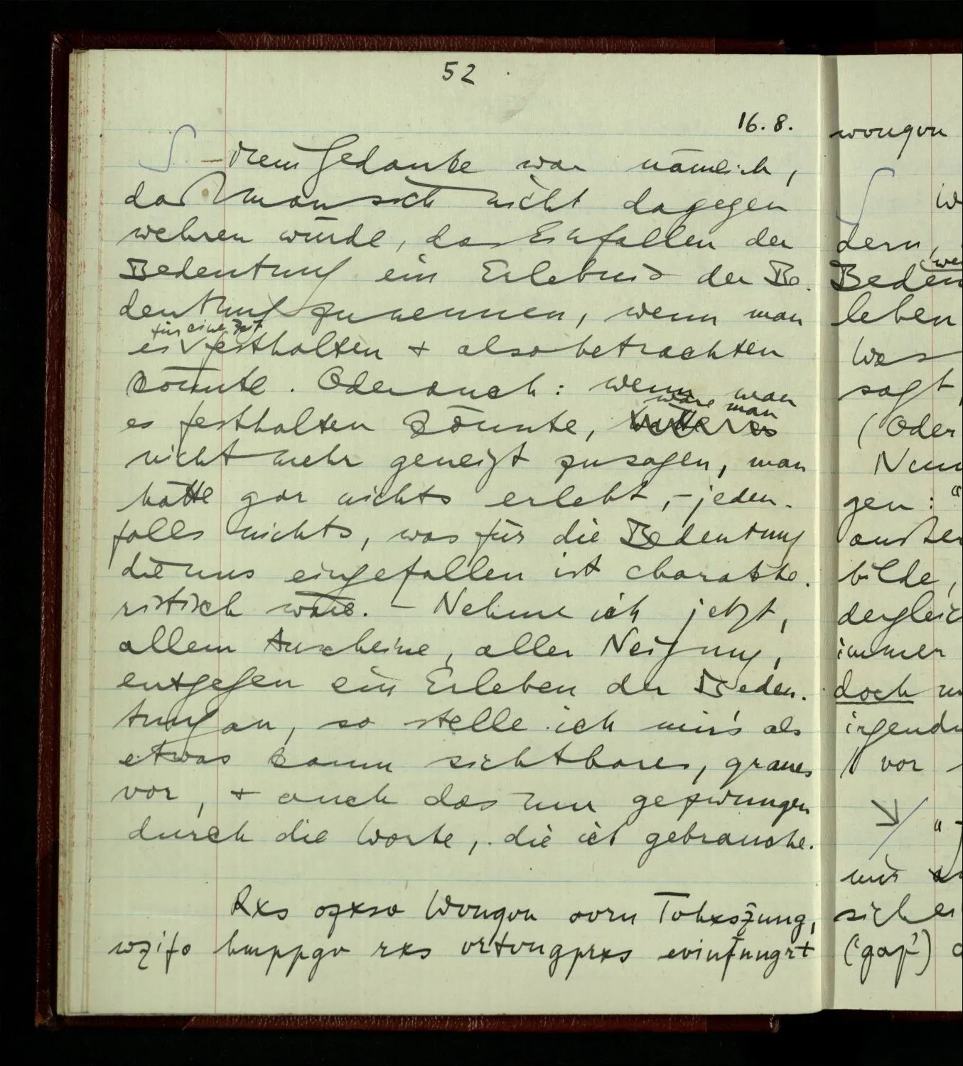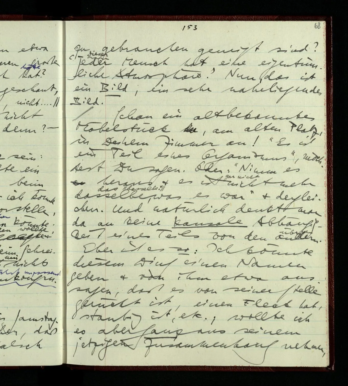 Ein Zimmer, das im Halbdunkel liegt, oder das dunkle Ecken hat, mag unheimlich sein; aber viel unheimlicher ist es, glaube ich, von außen durchs Fenster in ein ganz hell erleuchtetes, (aber) menschenleeres Zimmer zu sehen. Wenn das Unheimliche das Unbekannte ist, so ist das im ersten Fall etwas unbekannt – menschliches, im zweiten aber ist alles irdische bekannt.