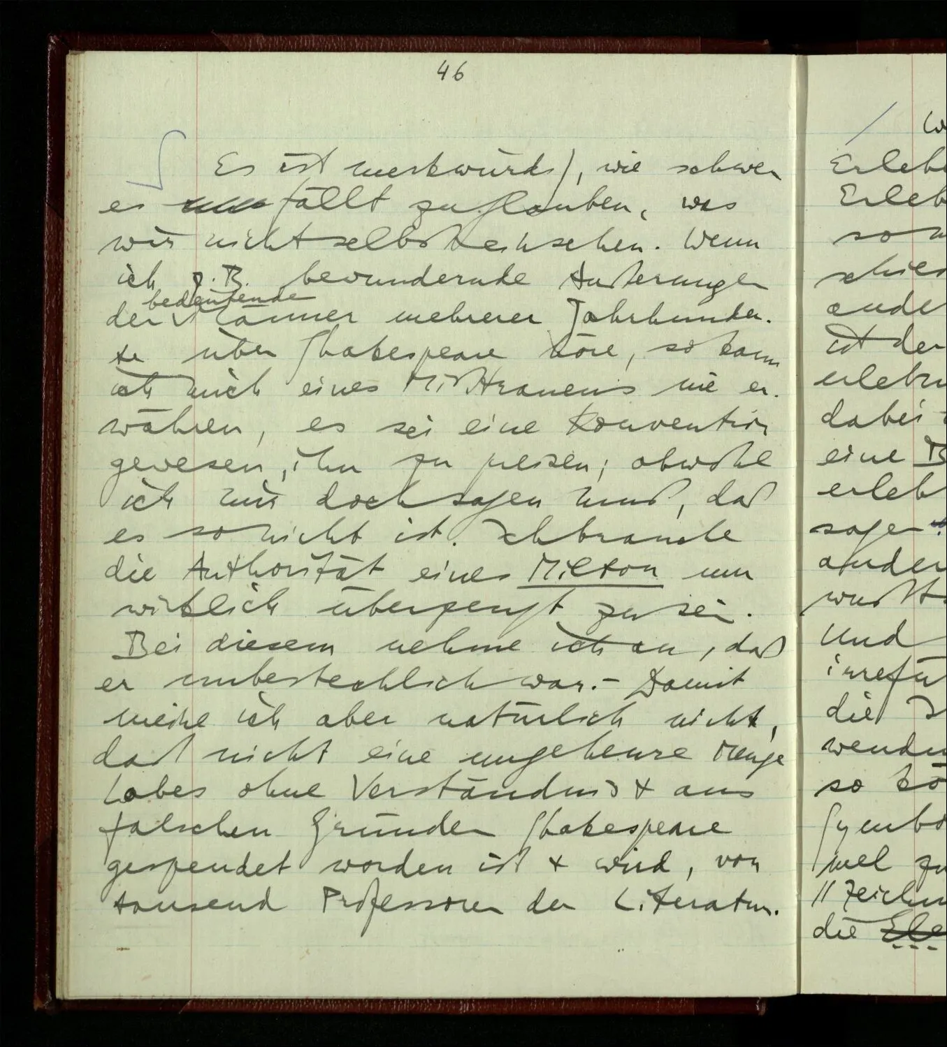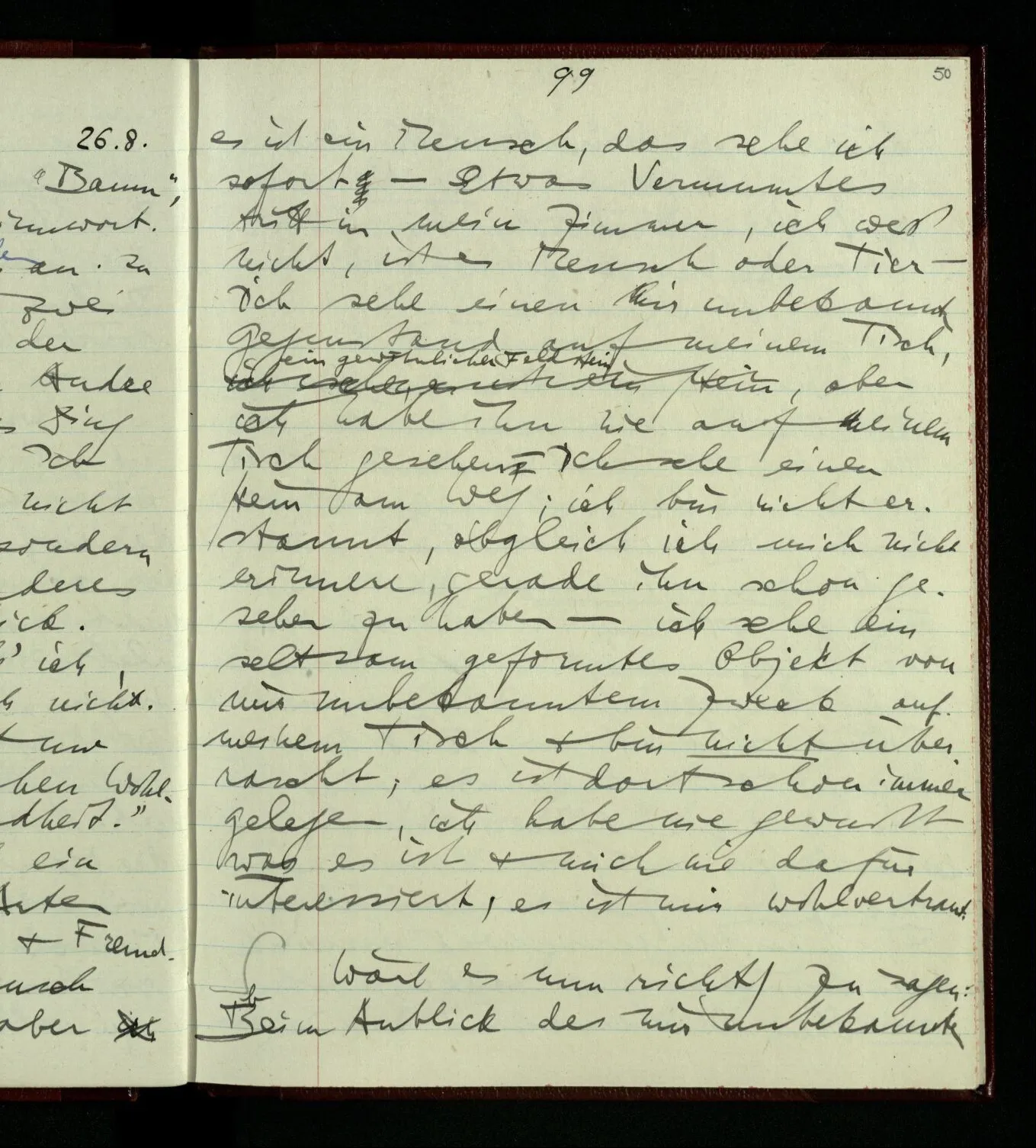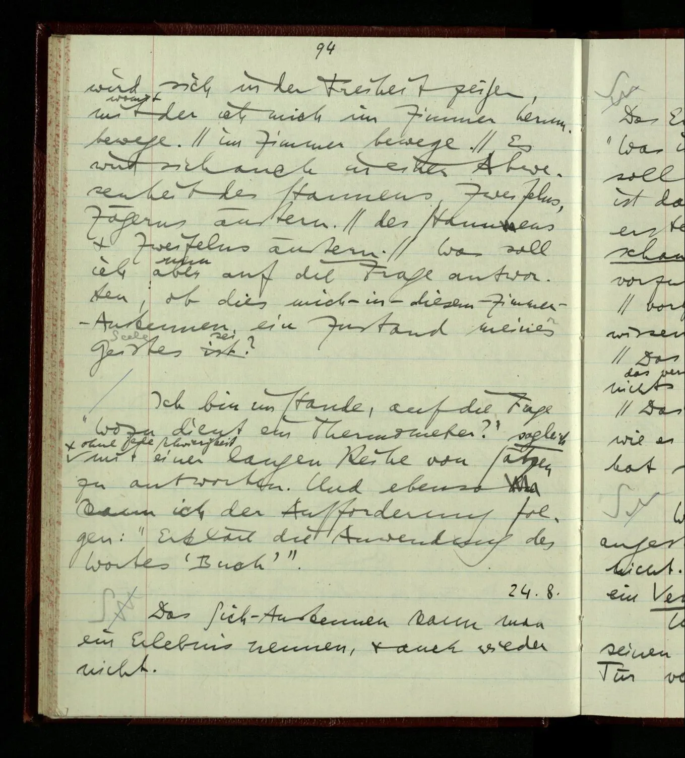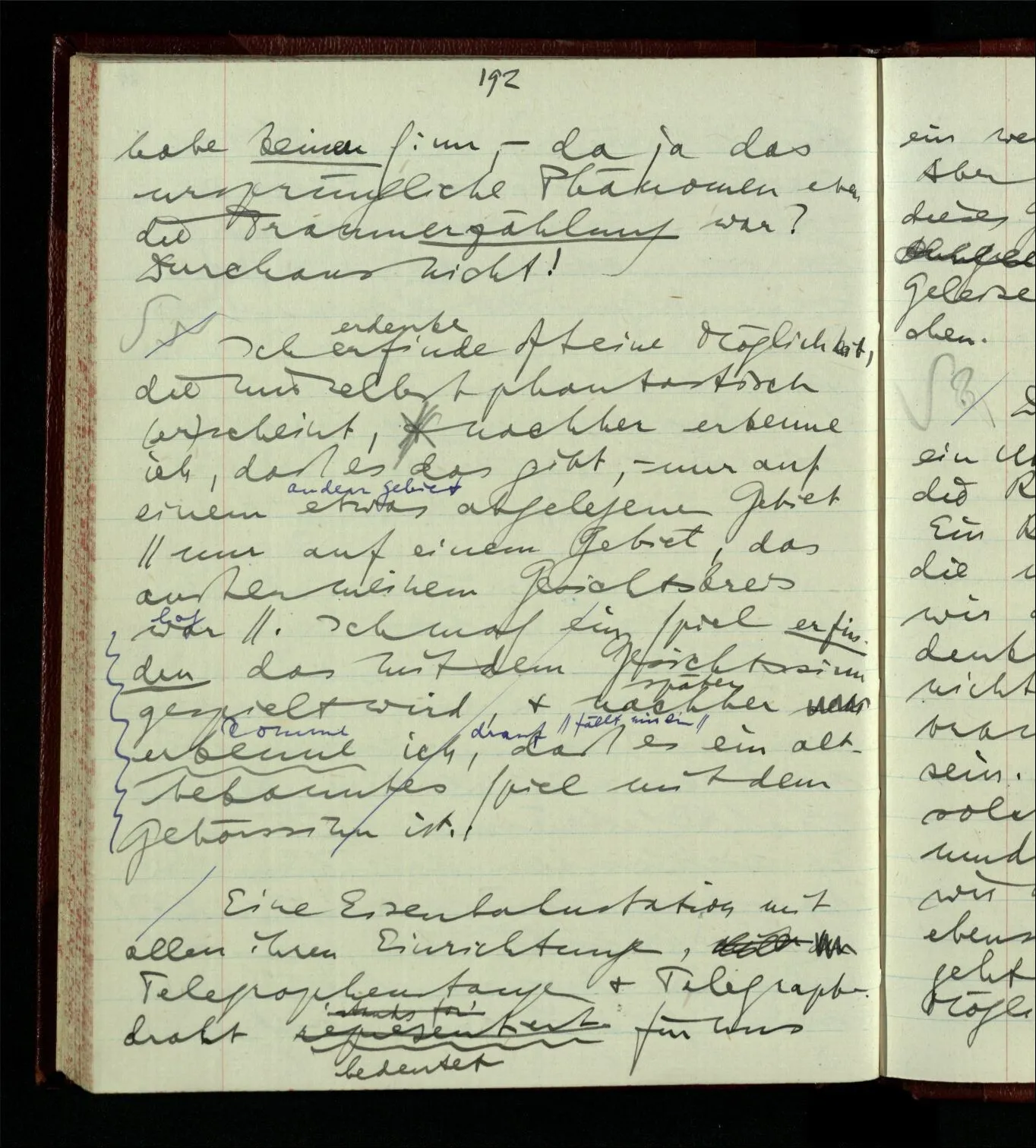 Ein Zimmer, das im Halbdunkel liegt, oder das dunkle Ecken hat, mag unheimlich sein; aber viel unheimlicher ist es, glaube ich, von außen durchs Fenster in ein ganz hell erleuchtetes, (aber) menschenleeres Zimmer zu sehen. Wenn das Unheimliche das Unbekannte ist, so ist das im ersten Fall etwas unbekannt – menschliches, im zweiten aber ist alles irdische bekannt.