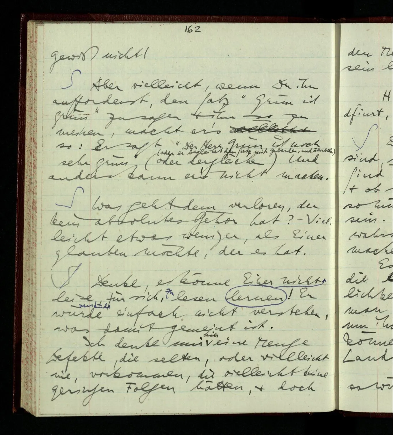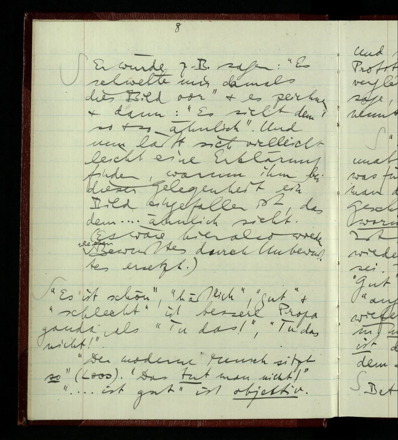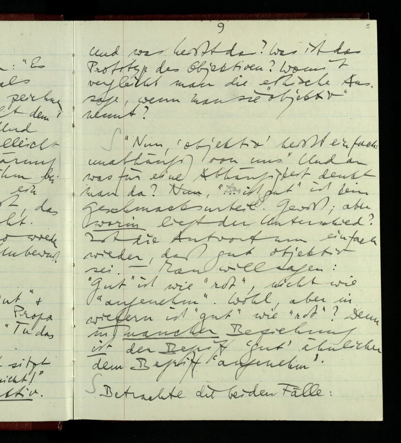 “Nun, ‘objektiv’ heißt einfach: unabhängig von uns”. Und an was für eine Abhängigkeit denkt man da? “Das ist gut” ist gut” ist kein Geschmacksurteil. Gewiß; aber worin liegt der Unterschied? Ist die Antwort nun einfach wieder, daß gut objektiv sei. – Man will sagen: “Gut” ist wie “rot”, nicht wie “angenehm”. Wohl, aber inwiefern ist “gut” wie “rot”? Denn in mancher Beziehung ist der Begriff ‘gut’ ähnlicher dem Begriff ‘angenehm’.