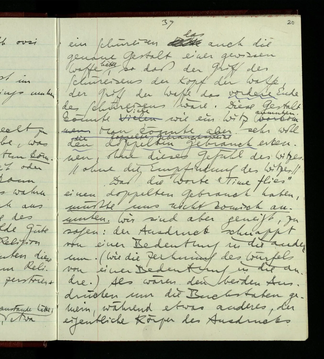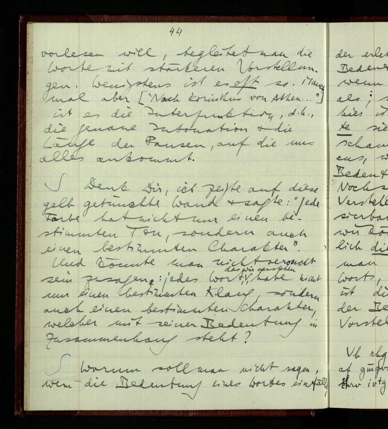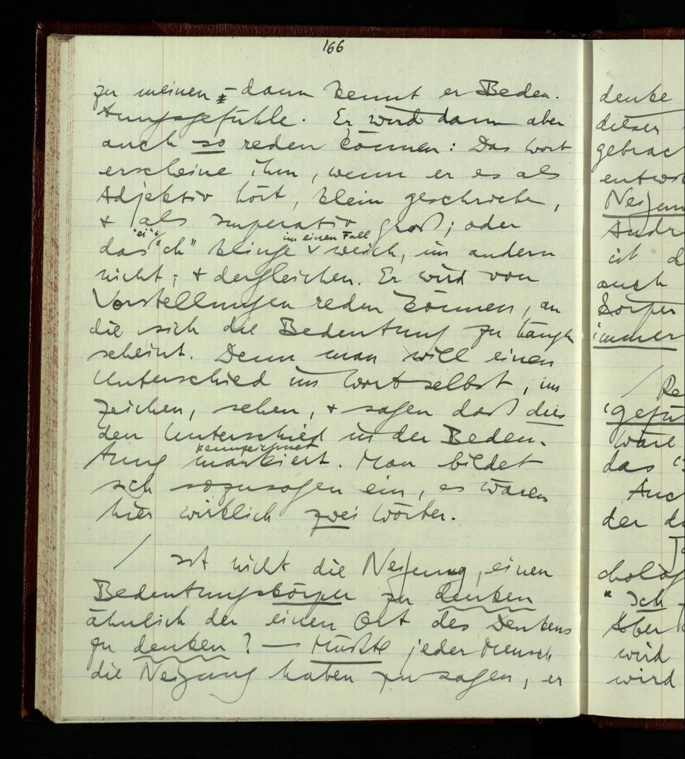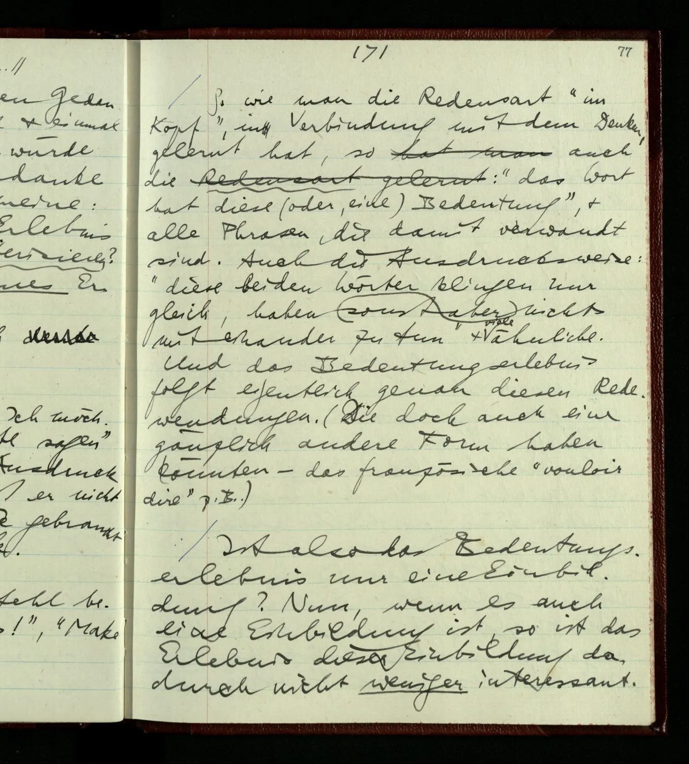 Die Fähigkeit, oder Neigung, zu sagen, man habe ein isoliert ausgesprochenes Wort in einem, oder in einem andern Sinn aufgefaßt, scheint nicht besonders nützlich zu sein. Es scheint man könne sich vorstellen, daß dieses Erlebnis Einem fehlt, ohne daß er dadurch mehr verliert, als einer der nicht Farben mit Vokalen assoziiert. Anderseits aber scheint nun diese Neigung nur ein Spezialfall eines viel wichtigern. Und ich bin nicht im Stande das Wichtige vom Unwichtigen zu trennen.