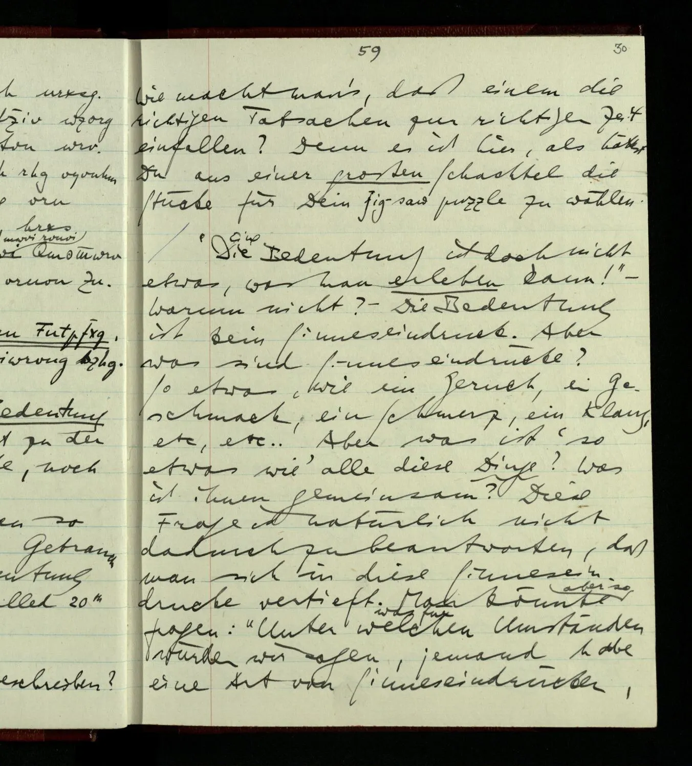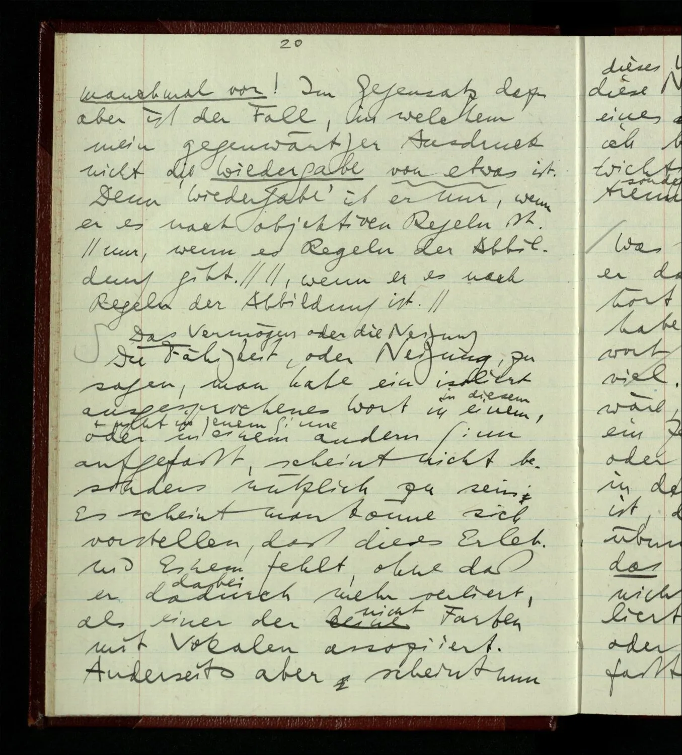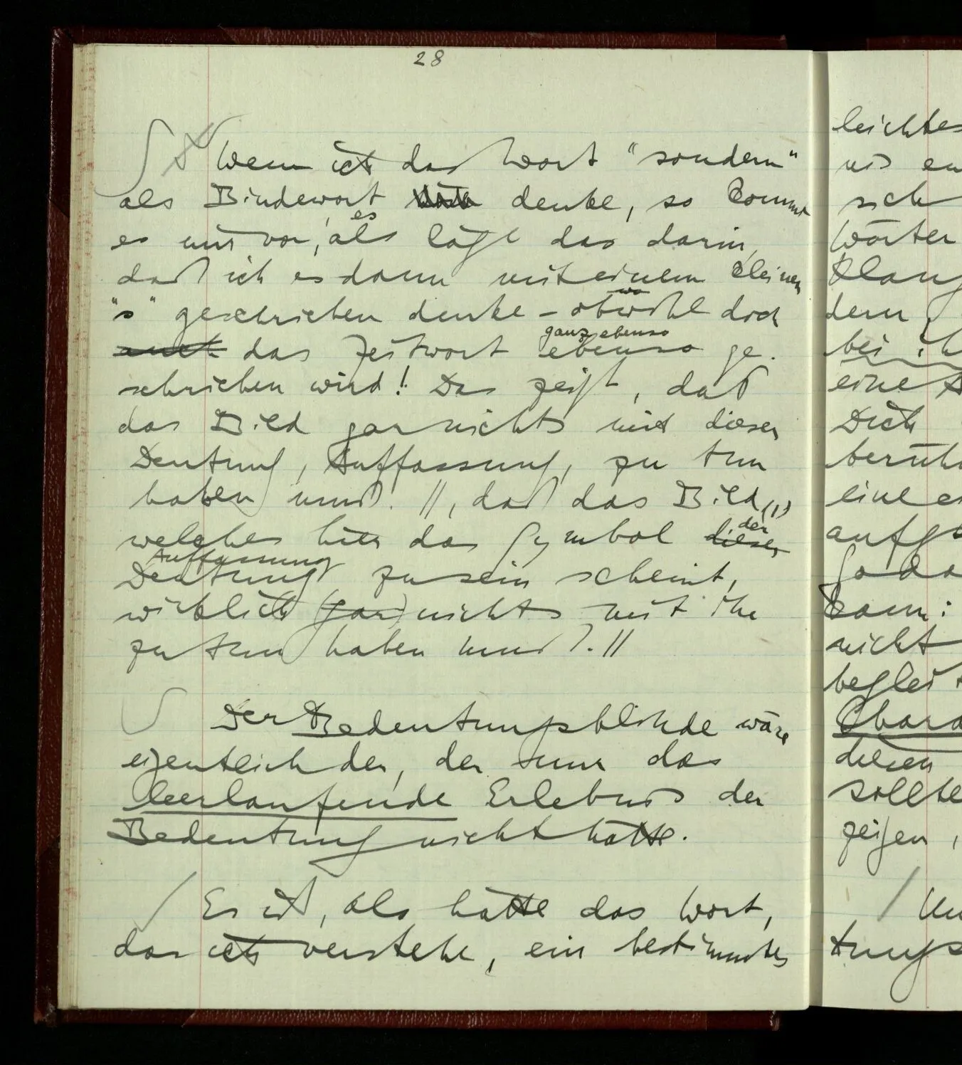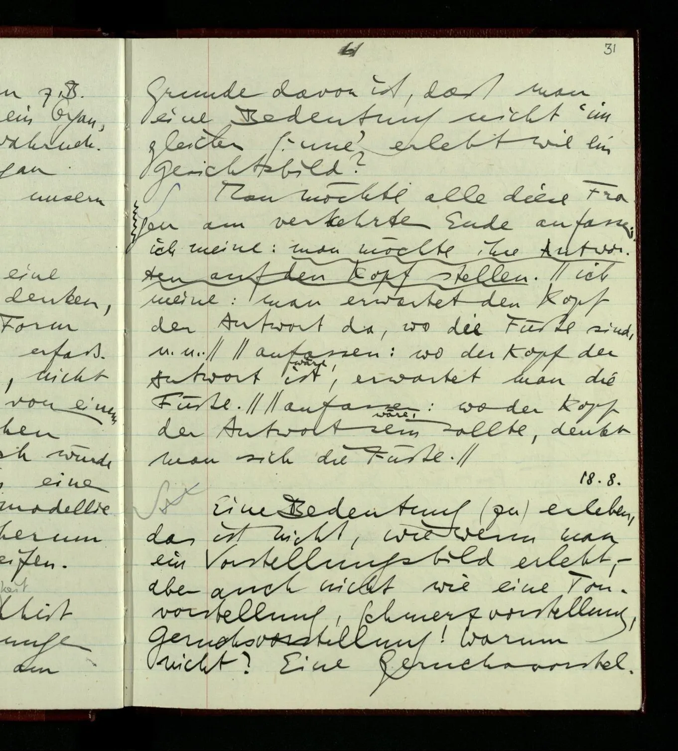 Die Fähigkeit, oder Neigung, zu sagen, man habe ein isoliert ausgesprochenes Wort in einem, oder in einem andern Sinn aufgefaßt, scheint nicht besonders nützlich zu sein. Es scheint man könne sich vorstellen, daß dieses Erlebnis Einem fehlt, ohne daß er dadurch mehr verliert, als einer der nicht Farben mit Vokalen assoziiert. Anderseits aber scheint nun diese Neigung nur ein Spezialfall eines viel wichtigern. Und ich bin nicht im Stande das Wichtige vom Unwichtigen zu trennen.