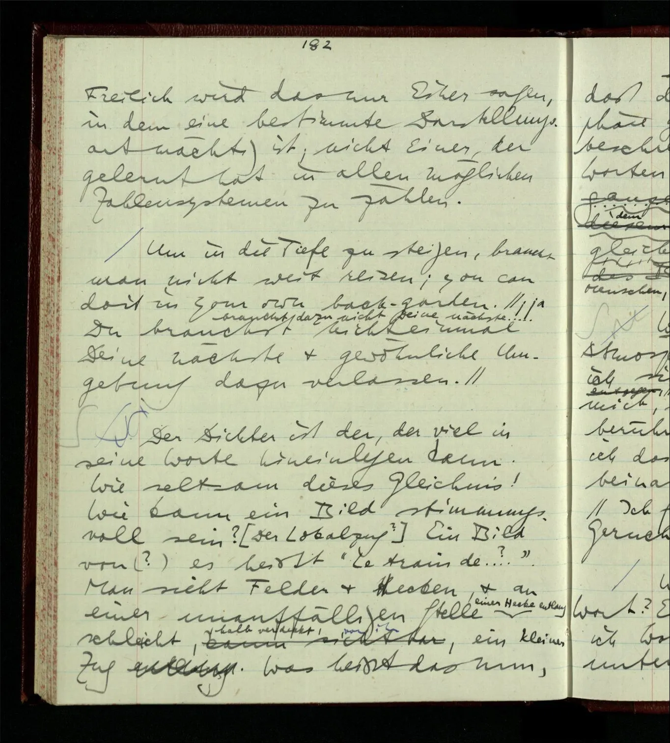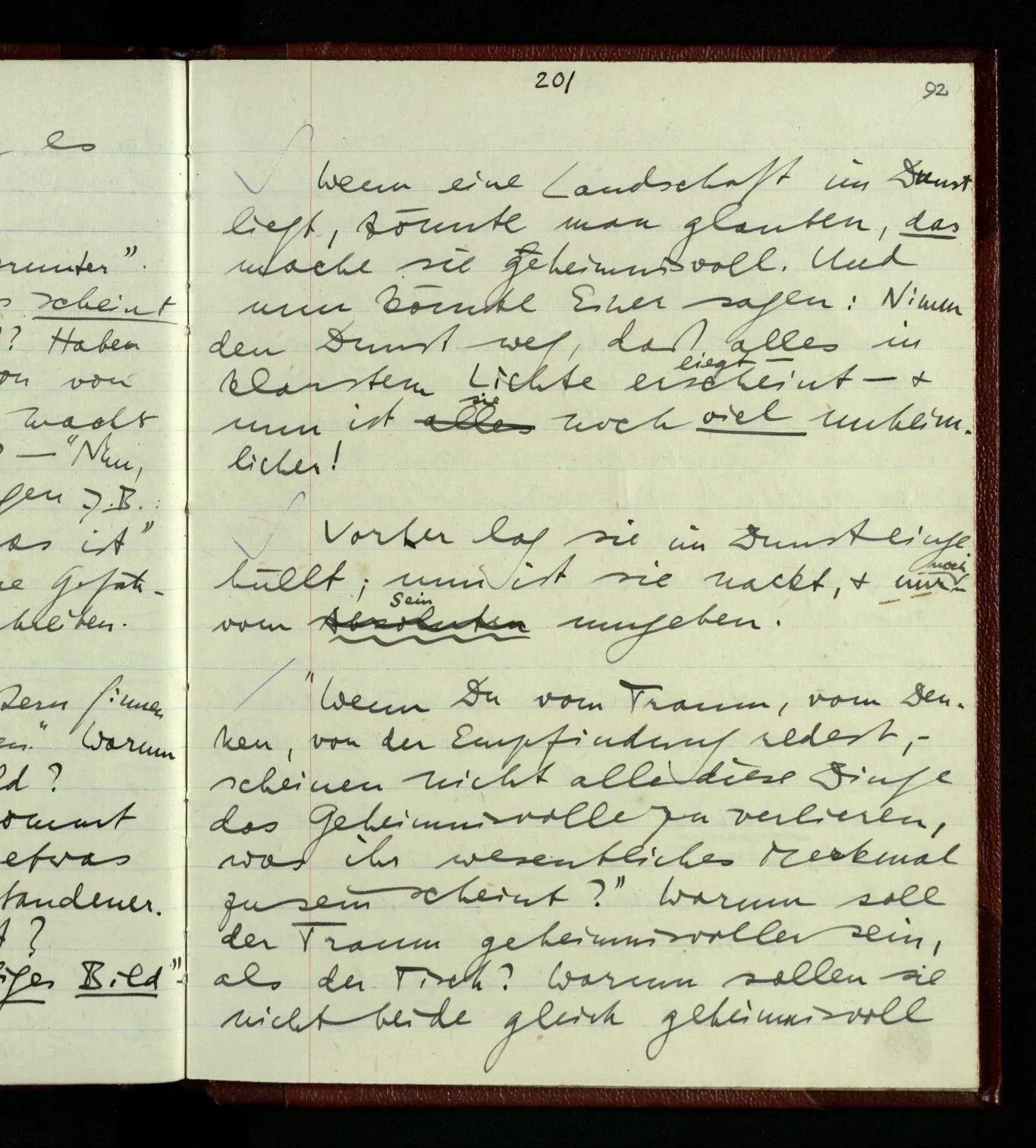 Wenn eine Landschaft im Dunst liegt, könnte man glauben, das mache sie geheimnisvoll. Und nun könnte Einer sagen: Nimm den Dunst weg, daß alles in klarstem Lichte erscheint – & nun ist sie noch viel unheimlicher!