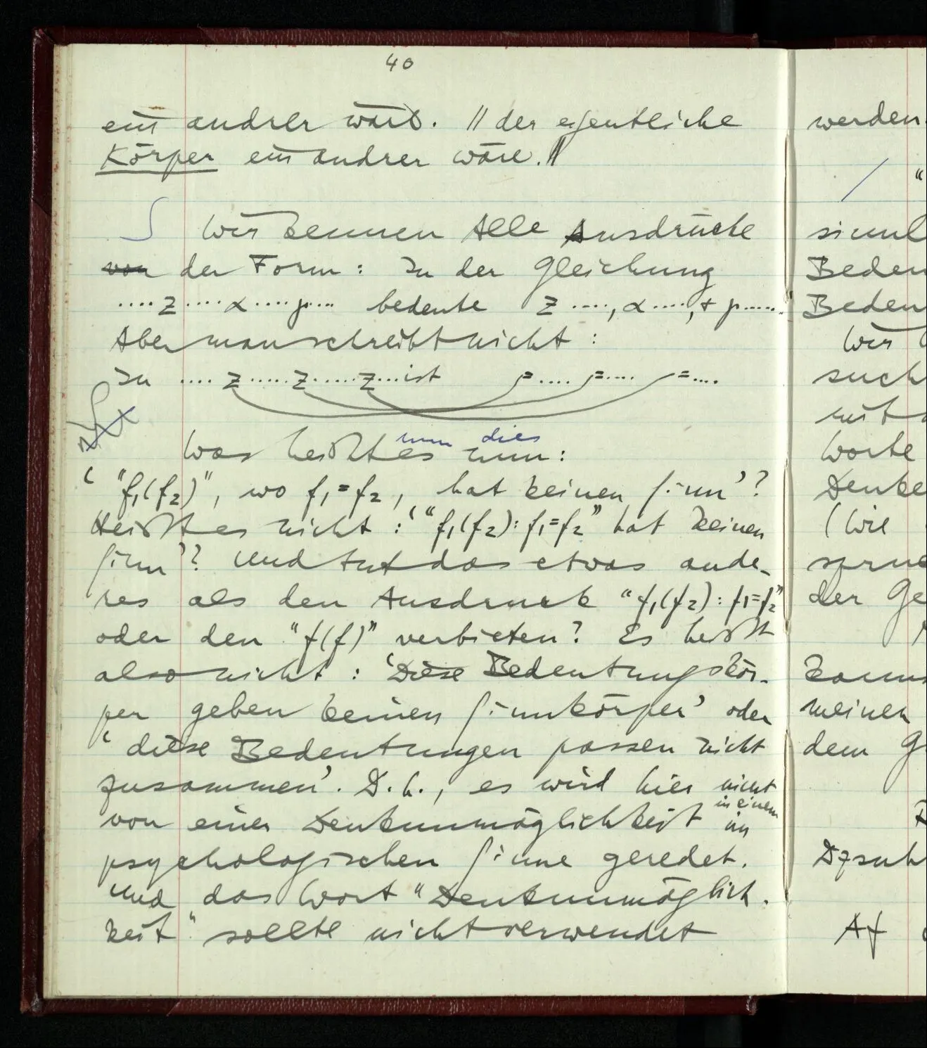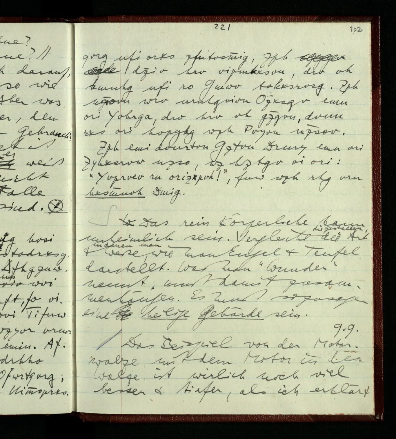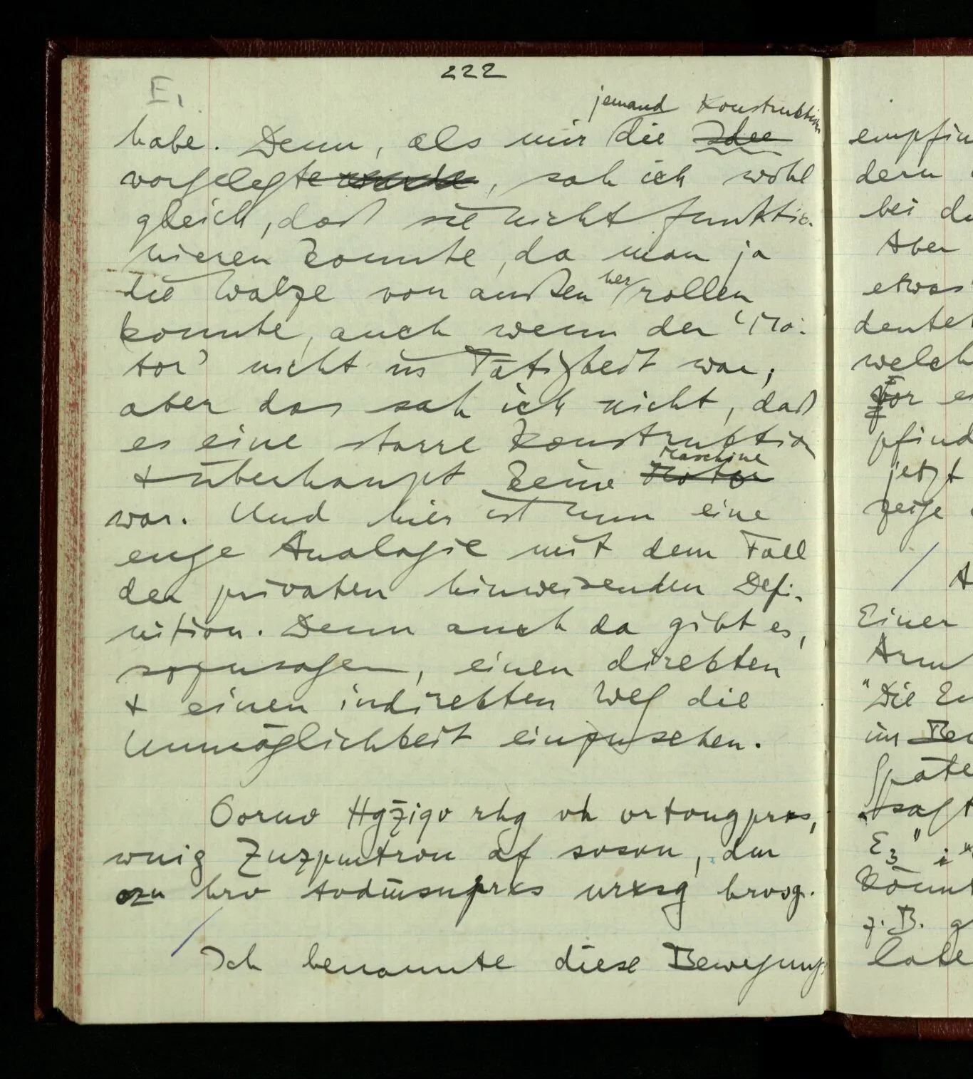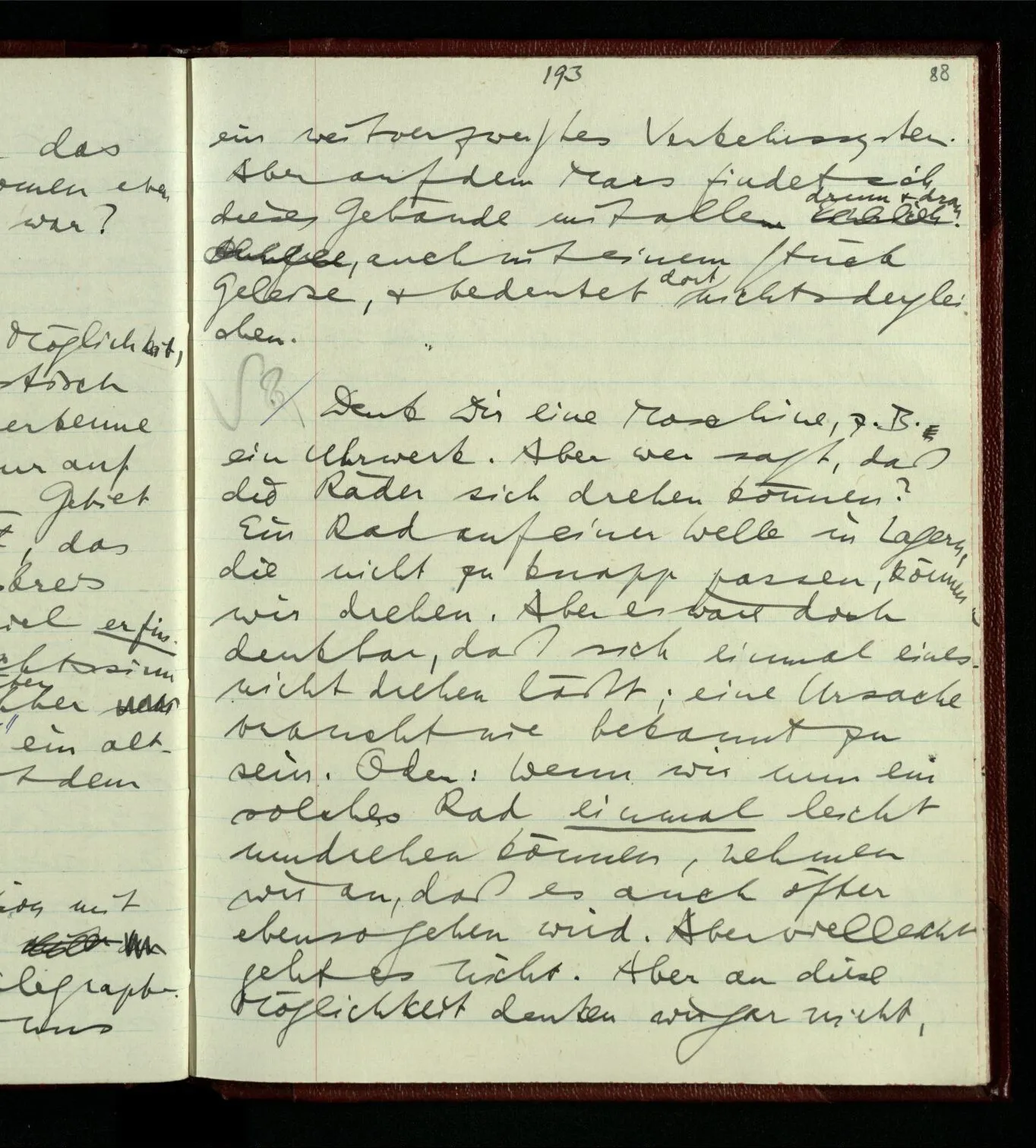 09.09.1946 Das Beispiel von der Motorwalze mit dem Motor in der Walze ist wirklich noch viel besser & tiefer, als ich erklärt habe. Denn, als mir jemand die Konstruktion vorlegte, sah ich wohl gleich, daß sie nicht funktionieren konnte, da man ja die Walze von außen her rollen konnte, auch wenn der ‘Motor’ nicht in Tätigkeit war; aber das sah ich nicht, daß es eine starre Konstruktion & überhaupt keine Maschine war. Und hier ist nun eine enge Analogie mit dem Fall der privaten hinweisenden Definition. Denn auch da gibt es, sozusagen, einen direkten & einen indirekten Weg die Unmöglichkeit einzusehen.