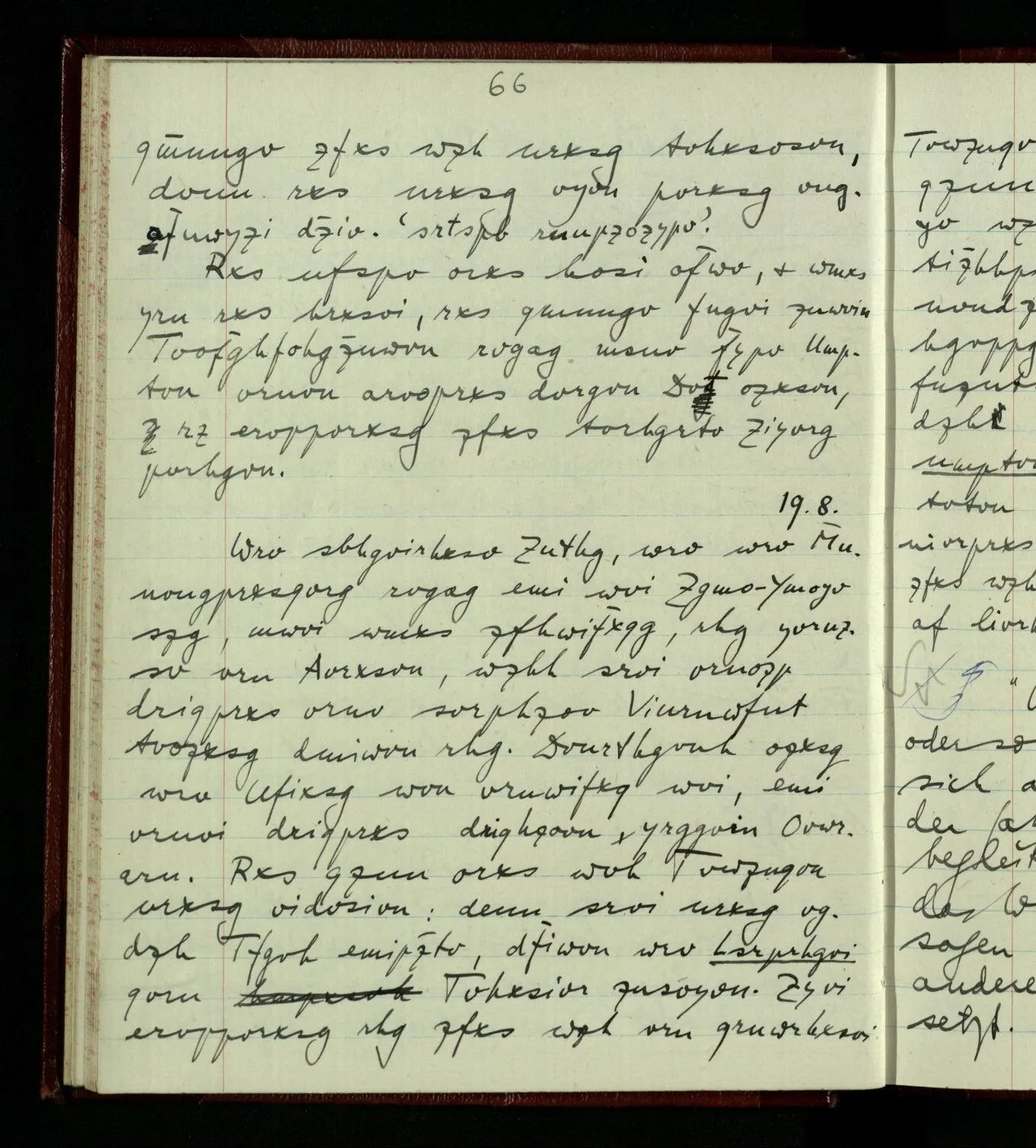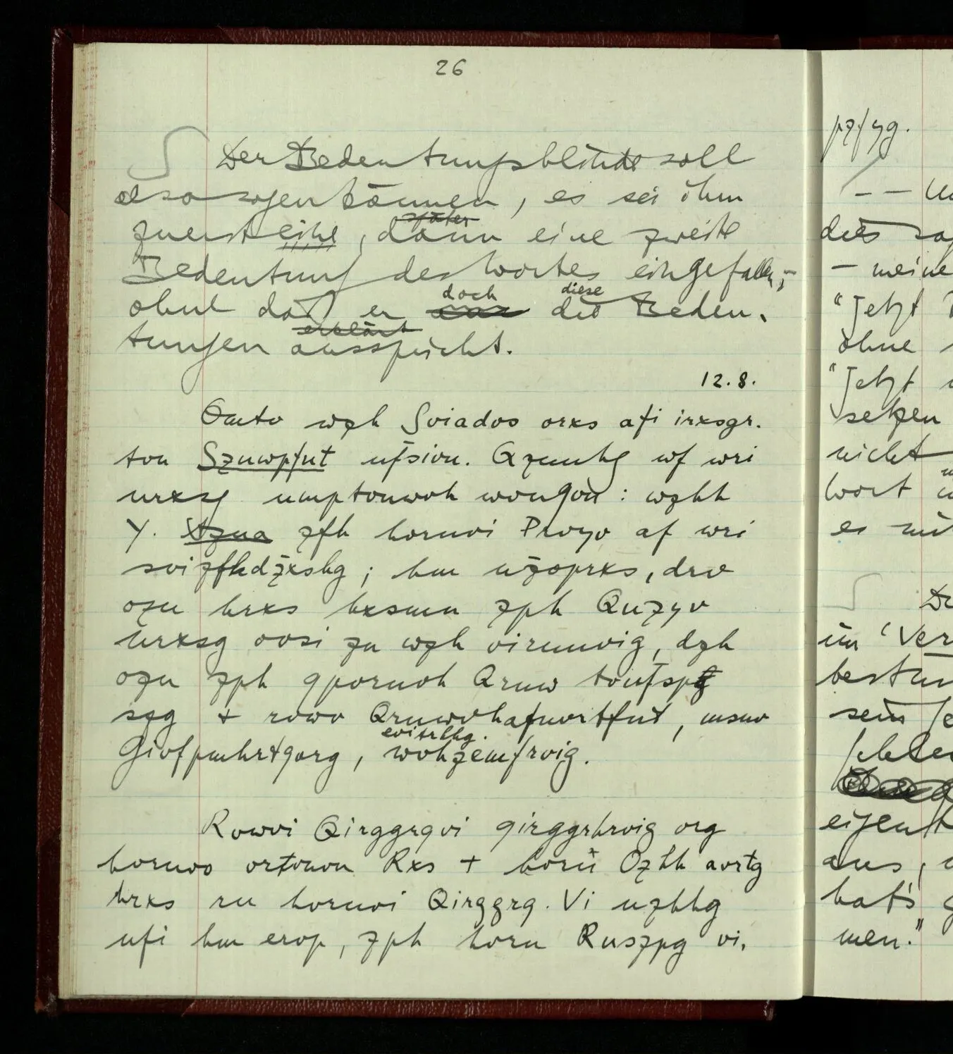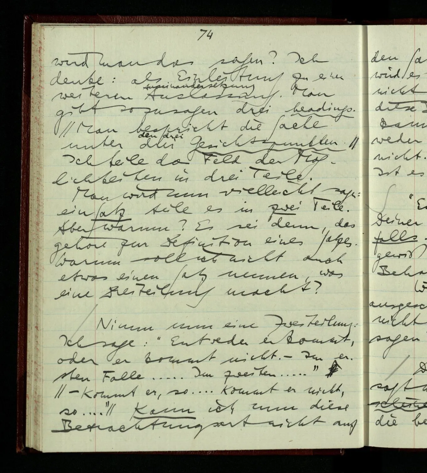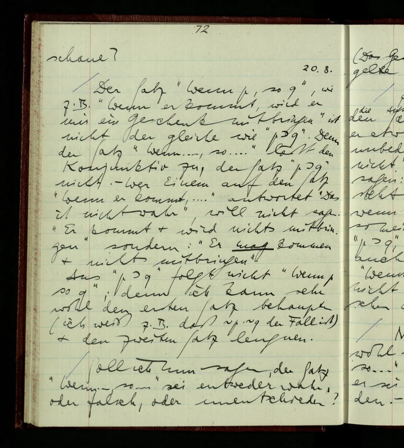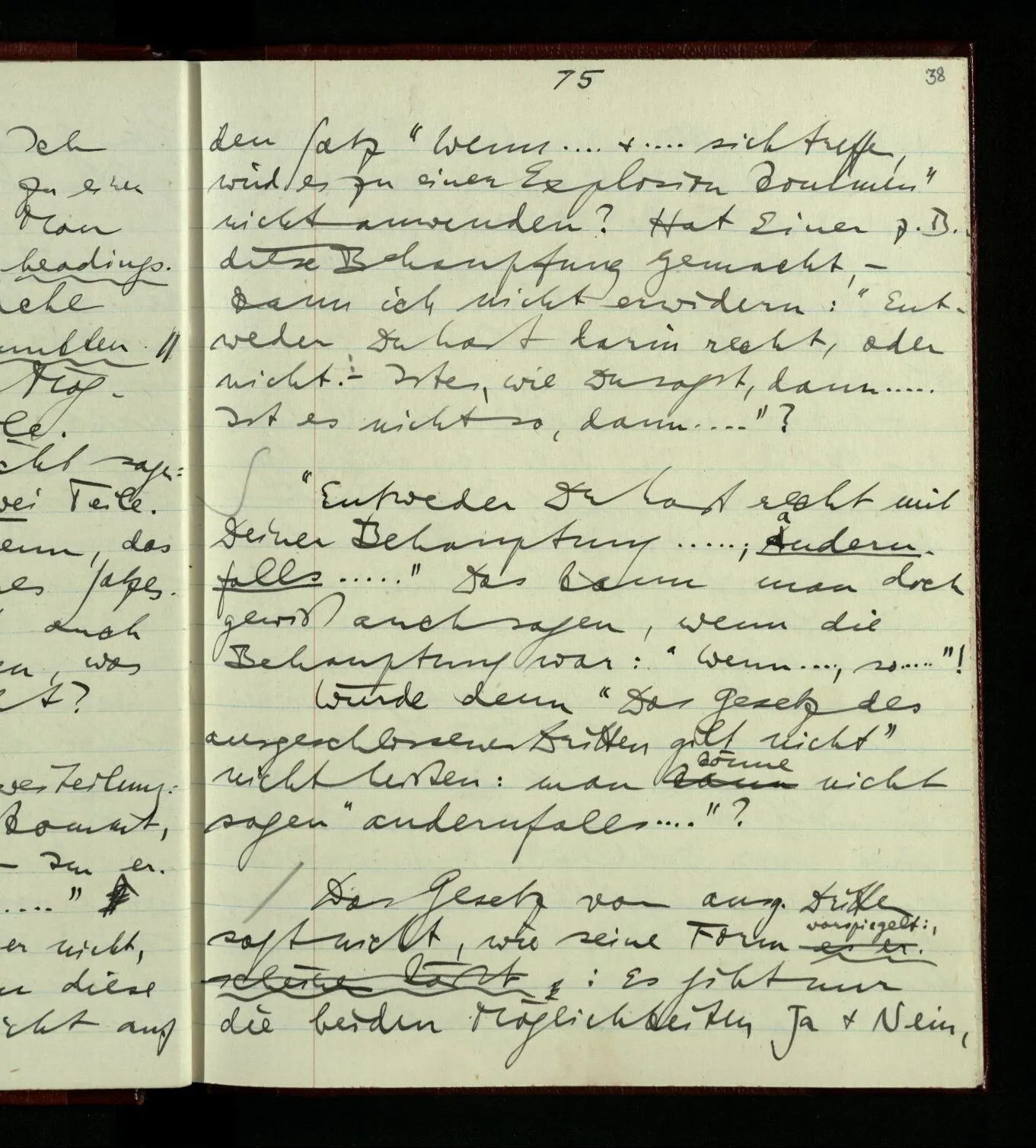 09.09.1946 Das Beispiel von der Motorwalze mit dem Motor in der Walze ist wirklich noch viel besser & tiefer, als ich erklärt habe. Denn, als mir jemand die Konstruktion vorlegte, sah ich wohl gleich, daß sie nicht funktionieren konnte, da man ja die Walze von außen her rollen konnte, auch wenn der ‘Motor’ nicht in Tätigkeit war; aber das sah ich nicht, daß es eine starre Konstruktion & überhaupt keine Maschine war. Und hier ist nun eine enge Analogie mit dem Fall der privaten hinweisenden Definition. Denn auch da gibt es, sozusagen, einen direkten & einen indirekten Weg die Unmöglichkeit einzusehen.