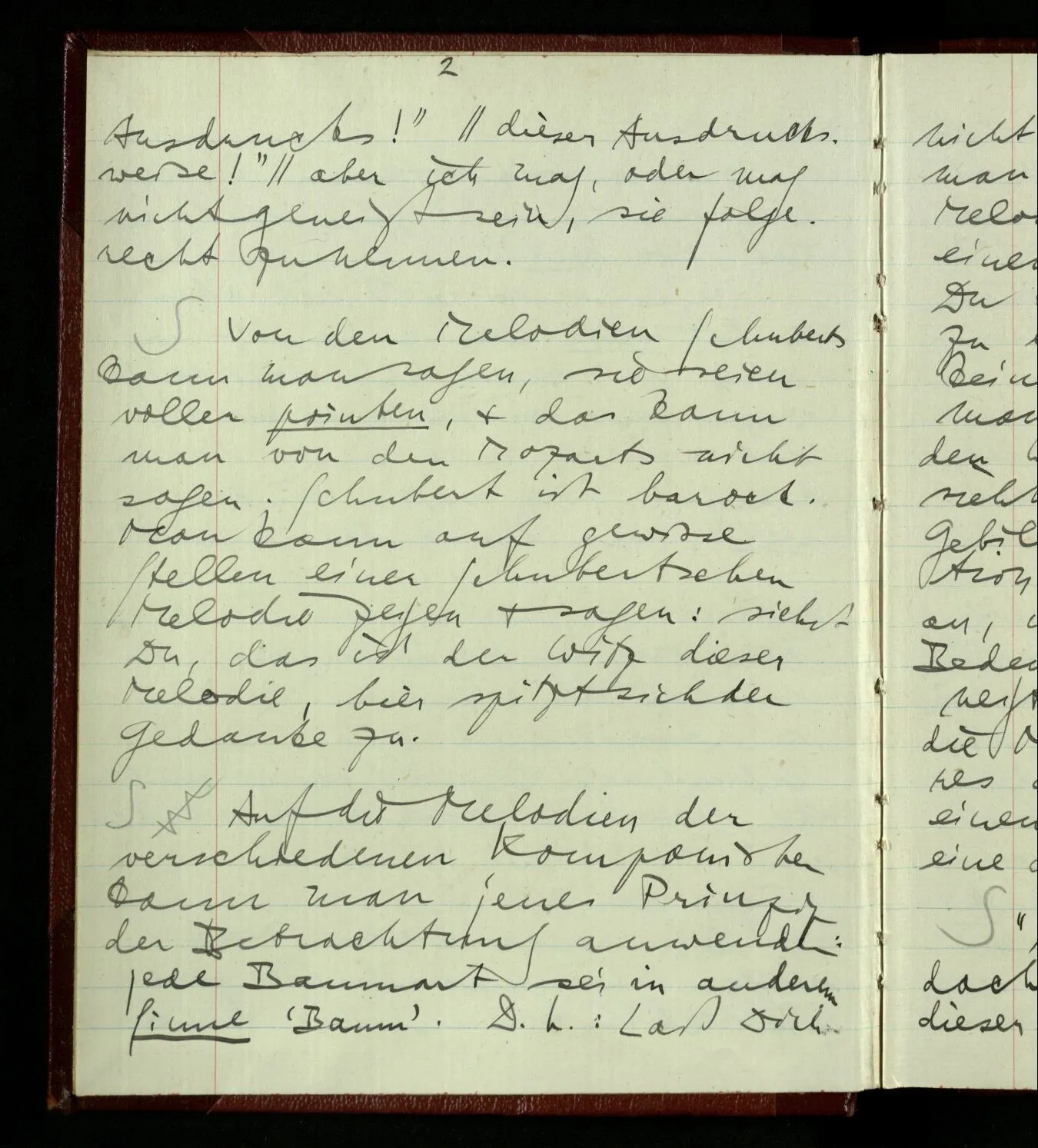 Von den Melodien Schuberts kann man sagen, sie seien voller Pointen, & das kann man von denen Mozarts nicht sagen; Schubert ist barock. Man kann auf gewisse Stellen einer Schubertschen Melodie zeigen & sagen: siehst Du, das ist der Witz dieser Melodie, hier spitzt sich der Gedanke zu.