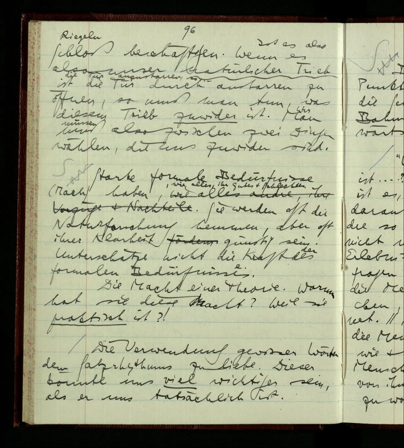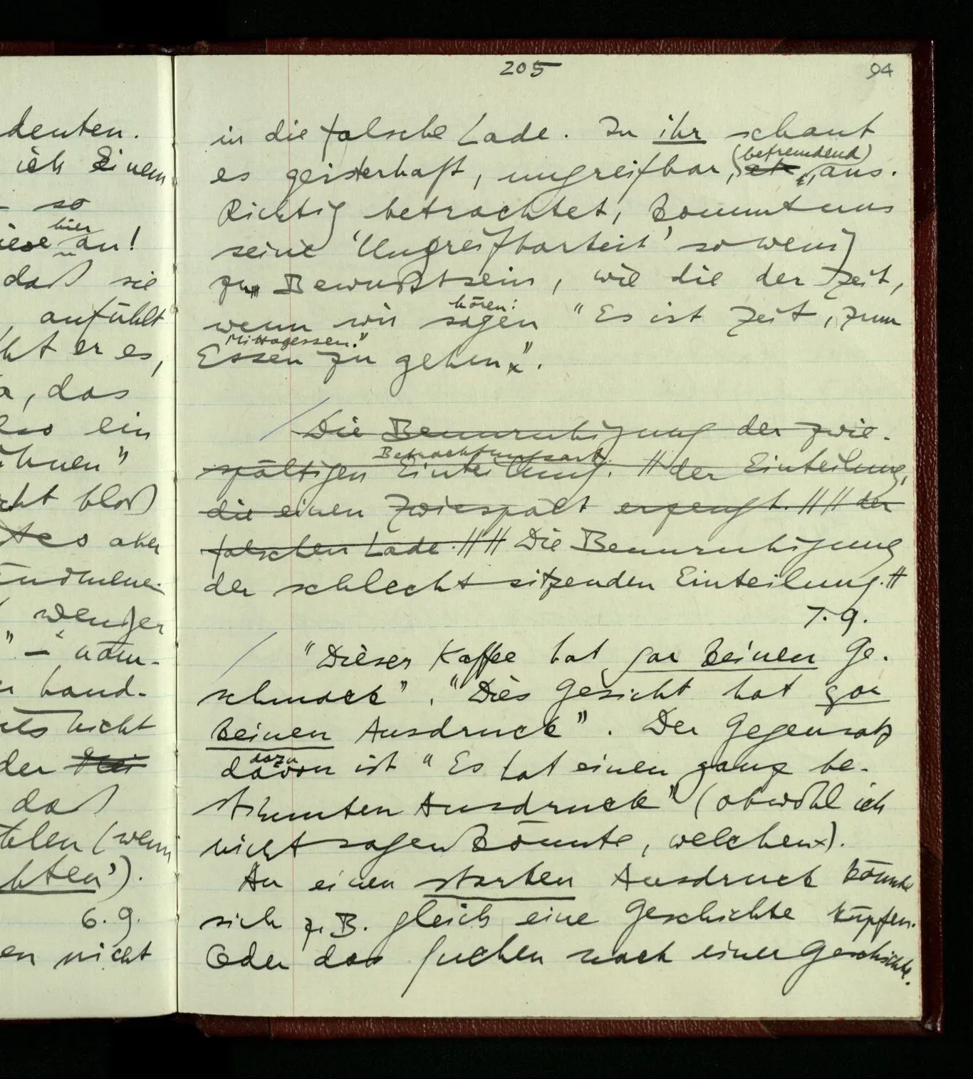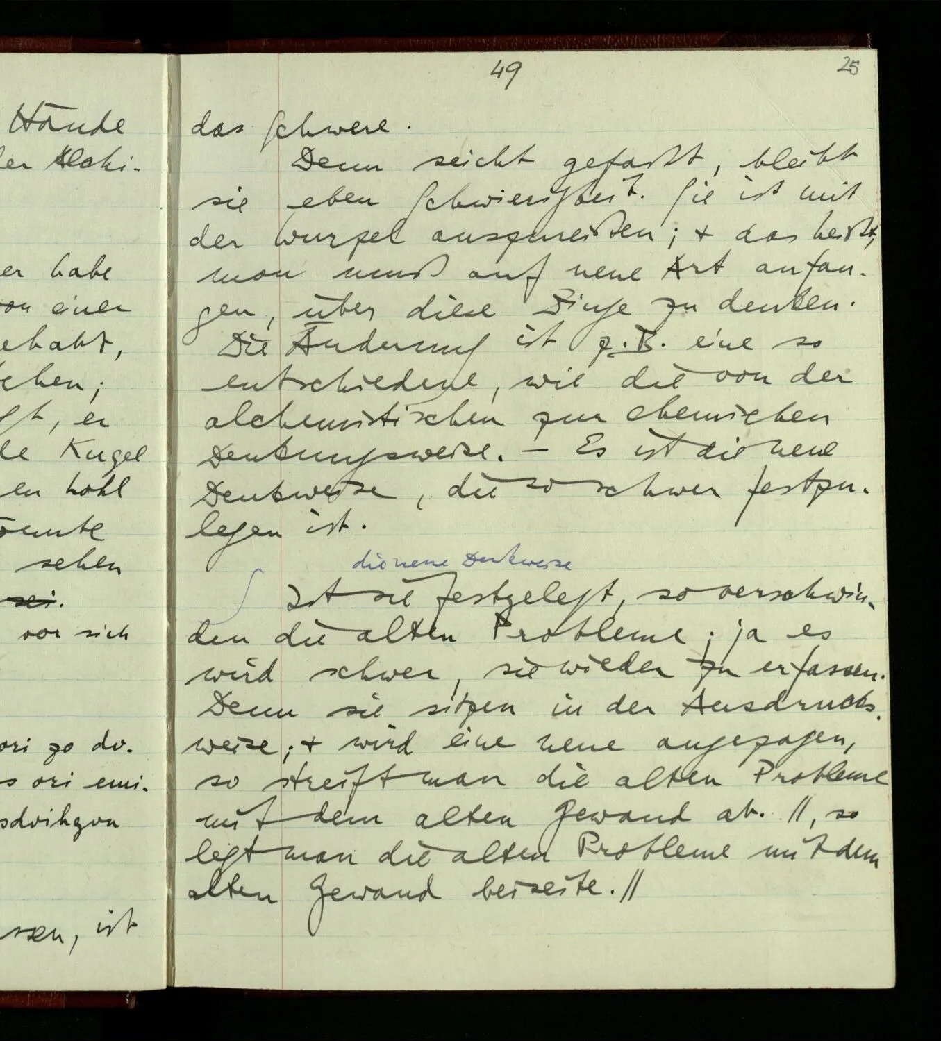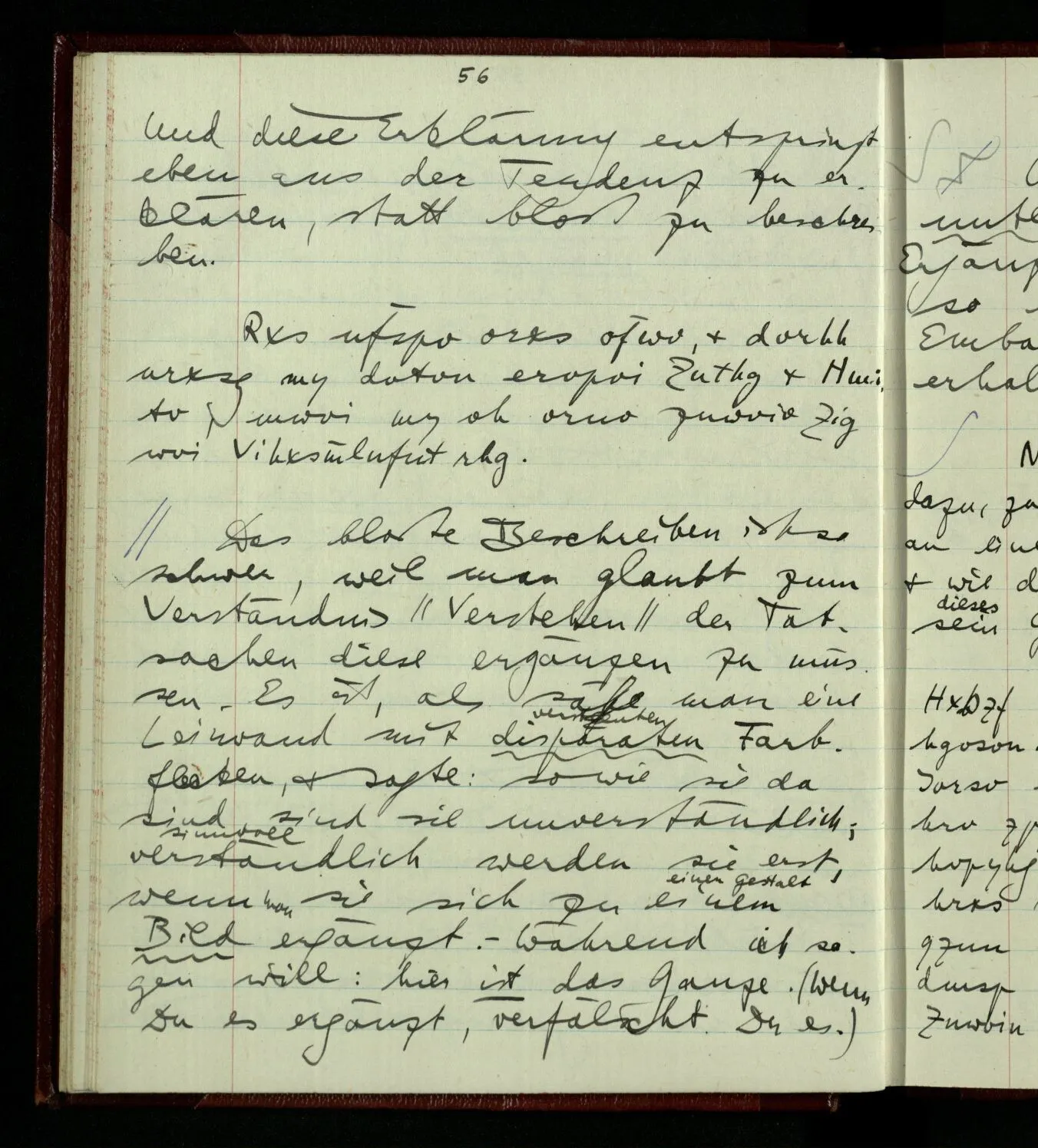 06.09.1946 Steck das Phänomen nicht in die falsche Lade. In ihr schaut es geisterhaft, ungreifbar, befremdend, aus. Richtig betrachtet, kommt uns seine ‘Ungreifbarkeit’ so wenig zu Bewußtsein, wie die der Zeit, wenn wir sagen “Es ist Zeit, zum Essen zu gehen”.
