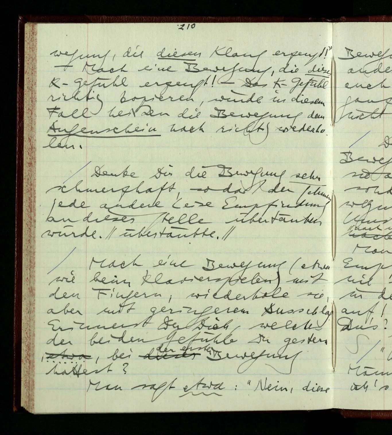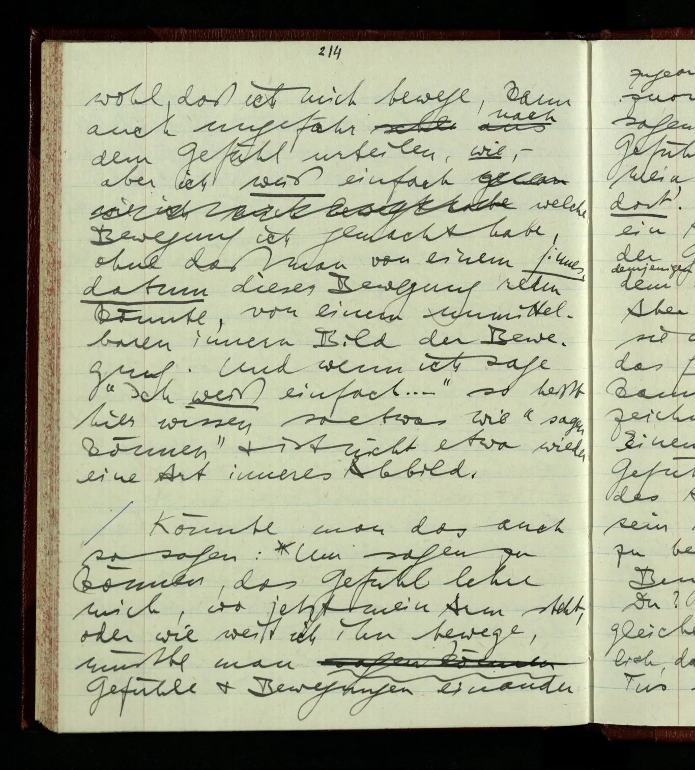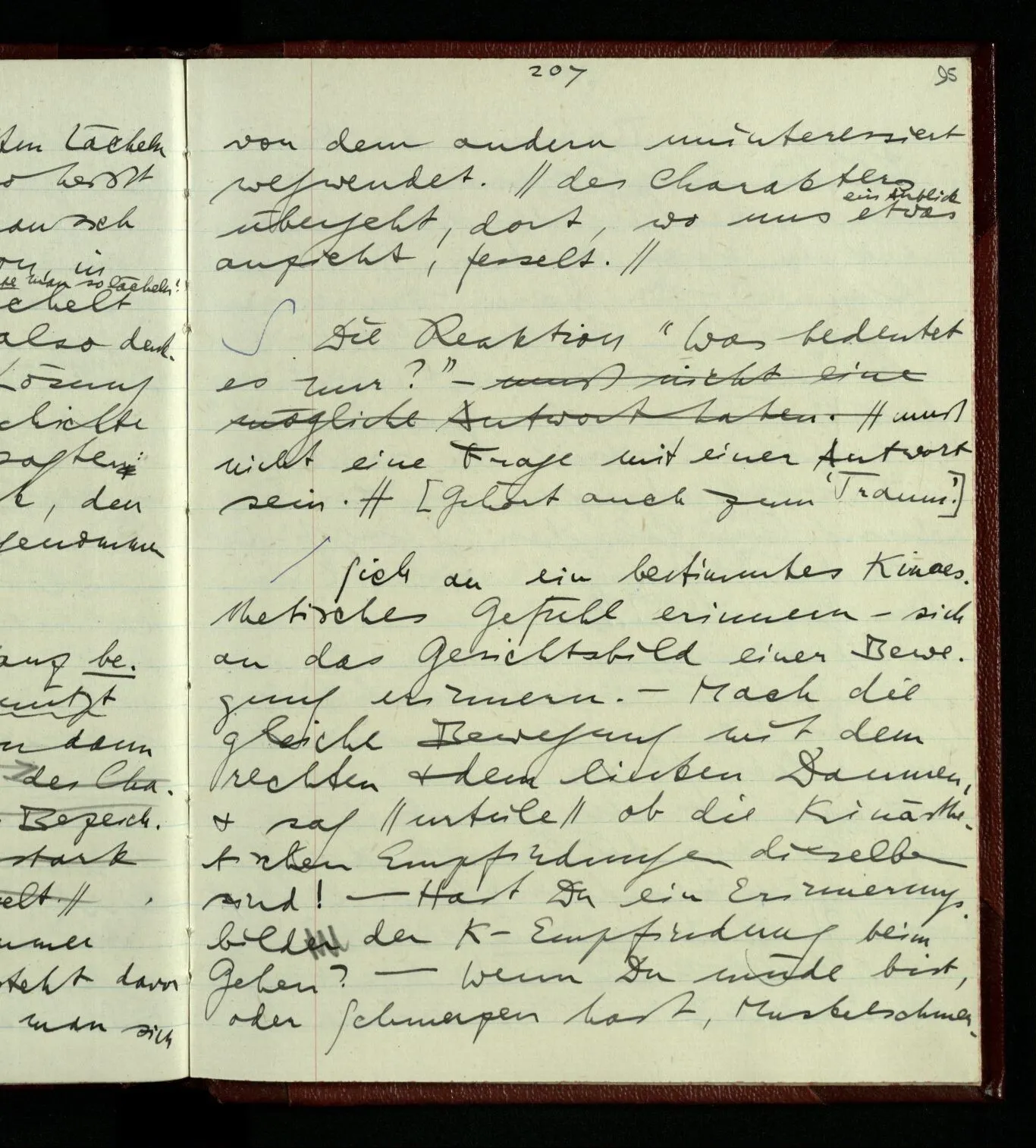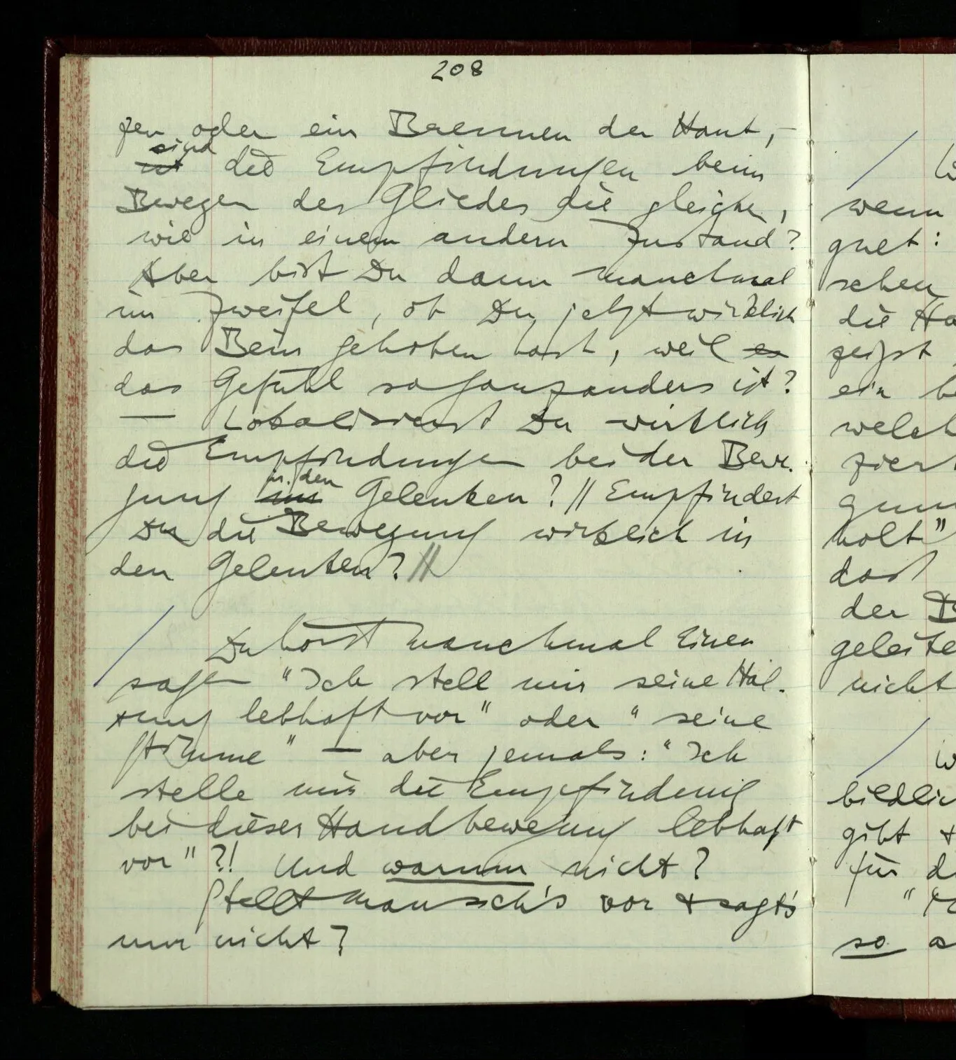 Sich an ein bestimmtes kinästhetisches Gefühl erinnern – sich an das Gesichtsbild einer Bewegung erinnern. – Mach die gleiche Bewegung mit dem rechten & dem linken Daumen, & sag ob die kinästhetischen Empfindungen dieselben sind! – Hast Du ein Erinnerungsbild der kinästhetischen Empfindung beim Gehen? – Wenn Du müde bist, oder Schmerzen hast, Muskelschmerzen oder ein Brennen der Haut, – sind die Empfindungen beim Bewegen des Gliedes die gleichen, wie in einem andern Zustand? Aber bist Du dann manchmal im Zweifel, ob Du jetzt wirklich das Bein gehoben hast, weil das Gefühl so ganz anders ist? – Lokalisierst Du wirklich die Empfindungen bei der Bewegung in den Gelenken?