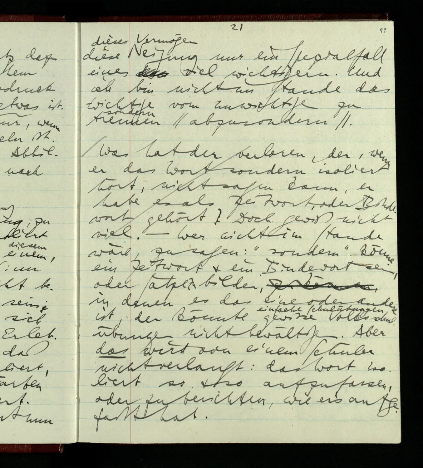Was hat der verloren, der, wenn er das Wort sondern isoliert hört, nicht sagen kann, er habe es als Zeitwort, oder Bindewort gehört? Doch gewiß nicht viel. – Wer nicht im Stande wäre, zu sagen: “sondern” könne ein Zeitwort & ein Bindewort sein, oder Sätze zu bilden, in denen es das eine oder andere ist, der könnte gewisse Volksschulübungen nicht bewältigen. Aber das wird von einem Schüler nicht verlangt: das Wort isoliert so & so aufzufassen, oder zu berichten, wie er’s aufgefaßt hat.