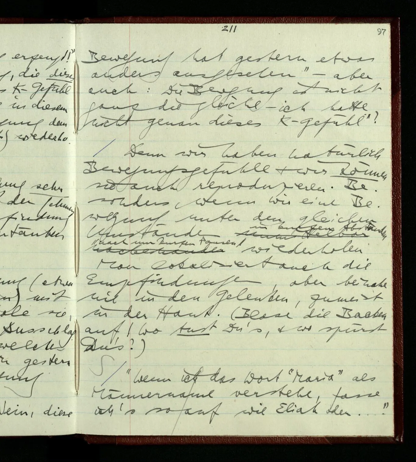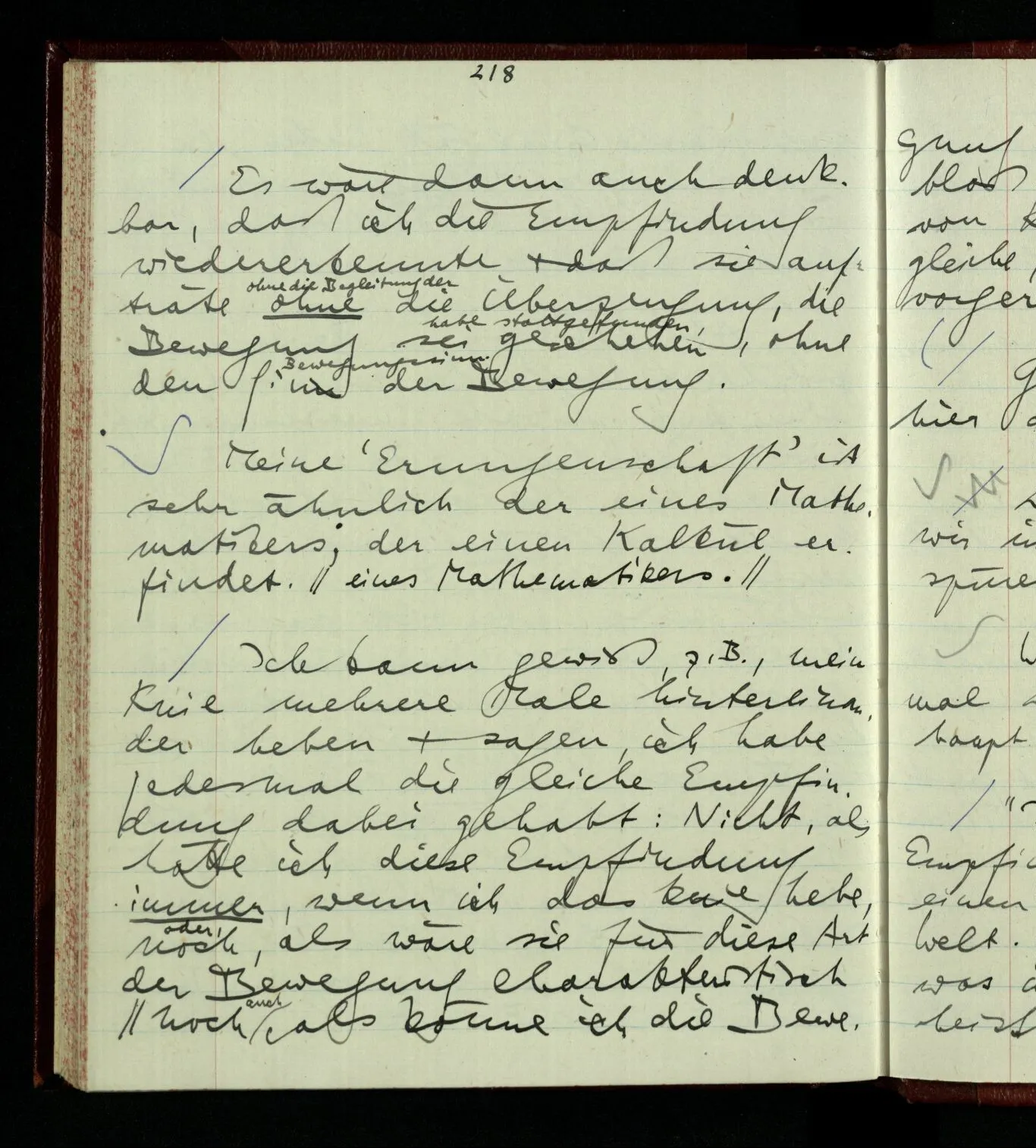 Es wäre dann auch denkbar, daß ich die Empfindung wiedererkennte & daß sie aufträte ohne die Überzeugung, die Bewegung sei geschehen, ohne den Sinn der Bewegung.