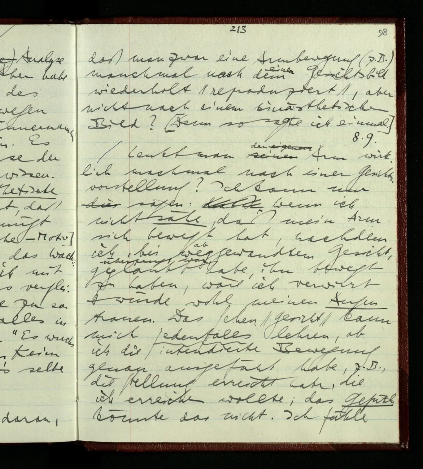 Lenkt man den Arm wirklich manchmal nach einer Gesichtsvorstellung? Ich kann nur sagen: Wenn ich nicht sähe, daß mein Arm sich bewegt hat, nachdem ich, bei weggewandtem Gesicht, geglaubt habe, ihn bewegt zu haben, wäre ich verwirrt & würde wohl meinen Augen trauen. Das Sehen kann mich jedenfalls lehren, ob ich die intendierte Bewegung genau ausgeführt habe, z.B., die Stellung erreicht habe, die ich erreichen wollte; das Gefühl könnte das nicht. Ich fühle wohl, daß ich mich bewege, kann auch ungefähr nach dem Gefühl urteilen, wie, – aber ich weiß einfach welche Bewegung ich gemacht habe, ohne daß man von einem Sinnesdatum dieser Bewegung reden könnte, von einem unmittelbaren innern Bild der Bewegung. Und wenn ich sage “Ich weiß einfach ‥‥” so heißt hier wissen so etwas wie “sagen können” & ist nicht etwa wieder eine Art inneres Abbild.