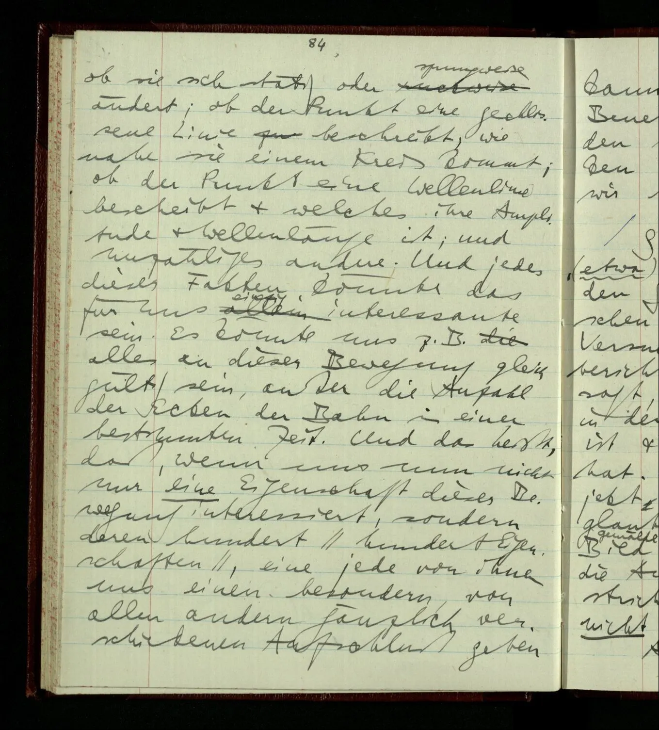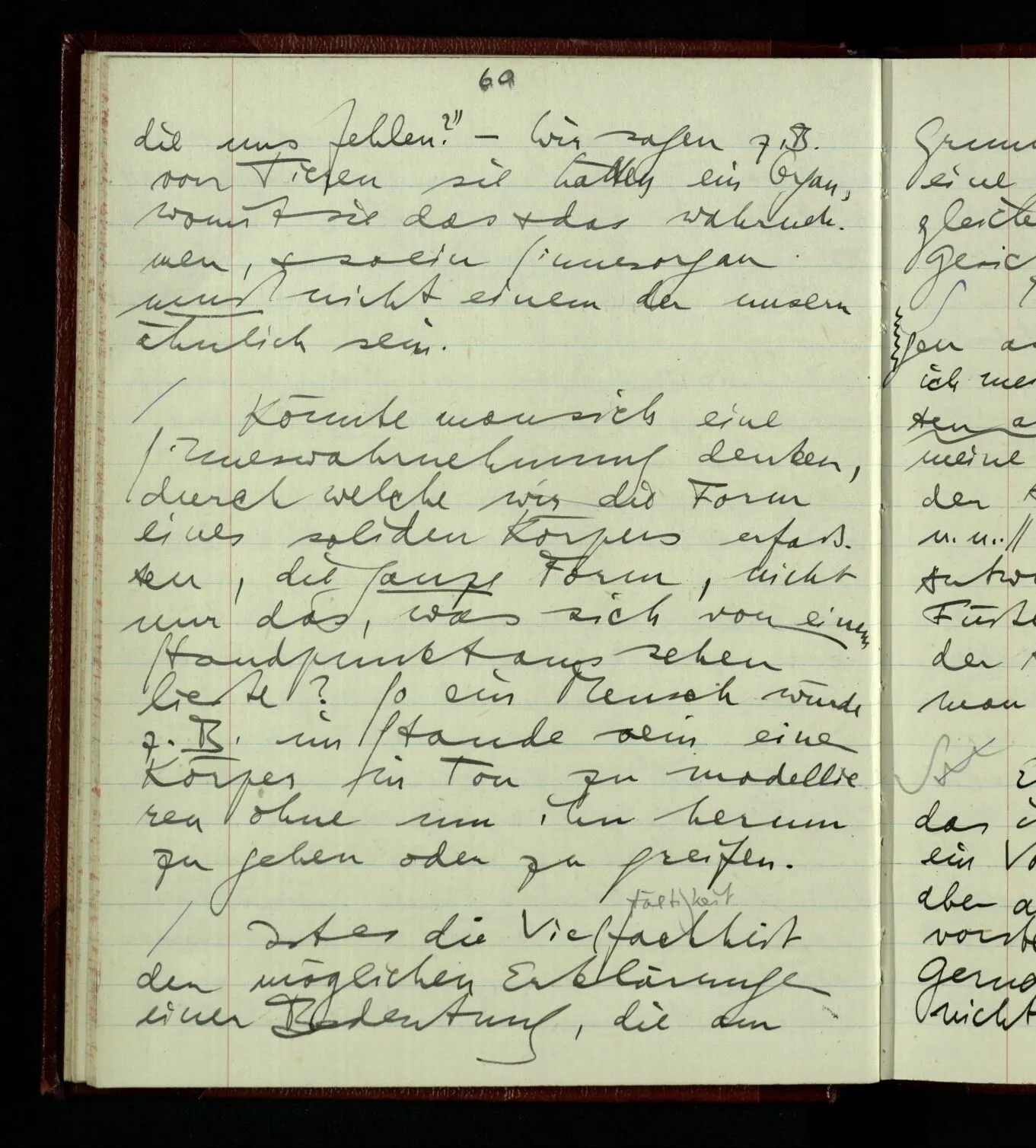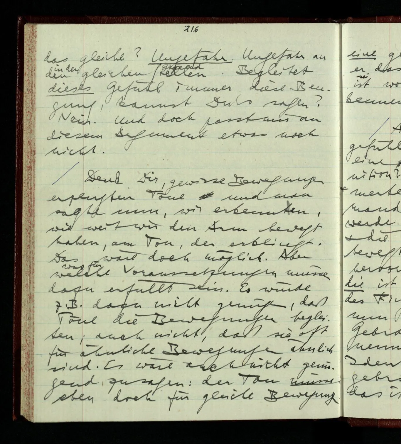 Denk Dir, gewisse Bewegungen erzeugten Töne und man sagte nun, wir erkennen, wie weit wir den Arm bewegt haben, am Ton, der erklingt. Das wäre doch möglich. Aber welche Voraussetzungen müssen dazu erfüllt sein. Es würde z.B. dazu nicht genügen, daß Töne die Bewegungen begleiten; auch nicht, daß sie oft für ähnliche Bewegungen ähnlich sind. Es wäre auch nicht genügend, zu sagen: der Ton müsse eben doch für gleiche Bewegungen eine gleiche Qualität haben, da er das einzige Sinnesdatum ist woran wir die Größe der Bewegung erkennen können.