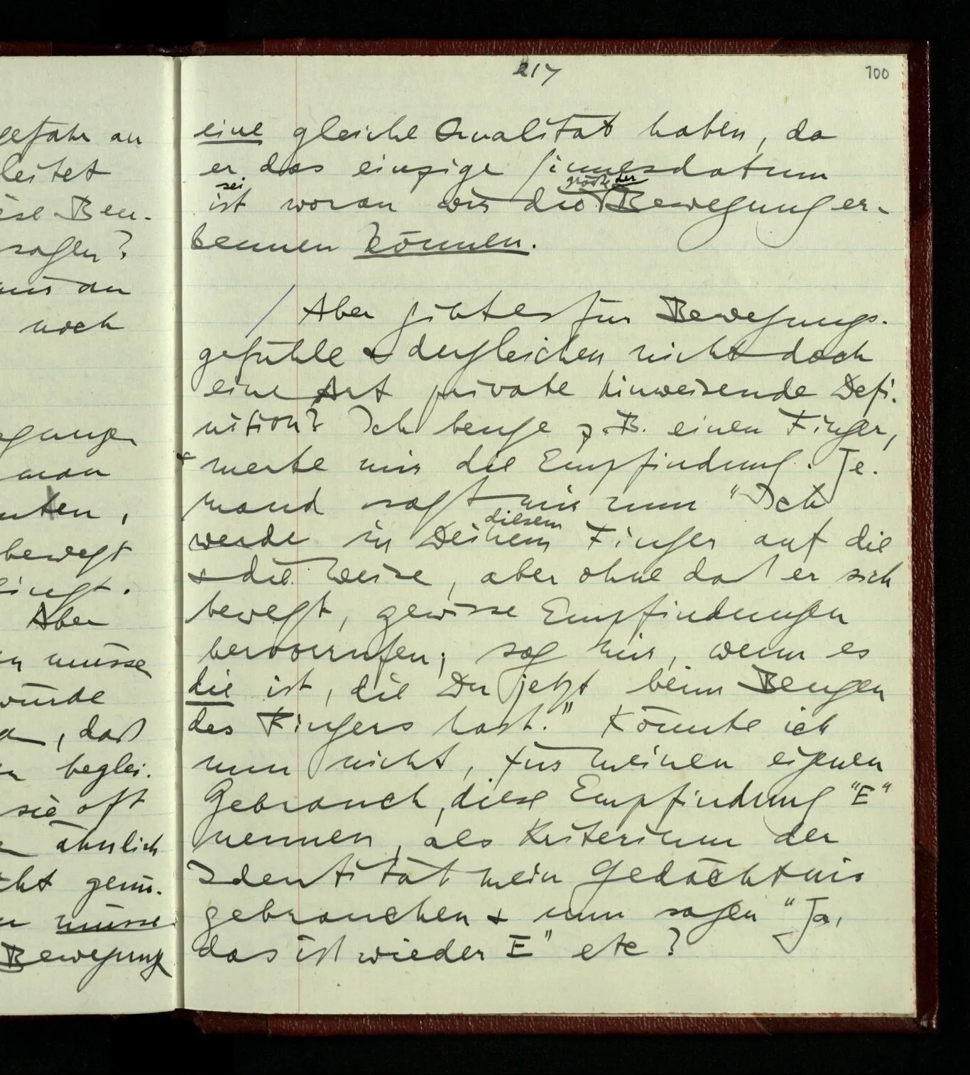 Aber gibt es für Bewegungsgefühle & dergleichen nicht doch eine Art private hinweisende Definition? Ich beuge z.B. einen Finger, & merke mir die Empfindung. Jemand sagt mir nun “Ich werde in Deinem Finger auf die & die Weise, aber ohne daß er sich bewegt, gewisse Empfindungen hervorrufen; sag mir, wenn es die ist, die Du jetzt beim Beugen des Fingers hast.” Könnte ich nun nicht, für meinen eigenen Gebrauch, diese Empfindung “E” nennen, als Kriterium der Identität mein Gedächtnis gebrauchen & nun sagen “Ja, das ist wieder E” etc.?