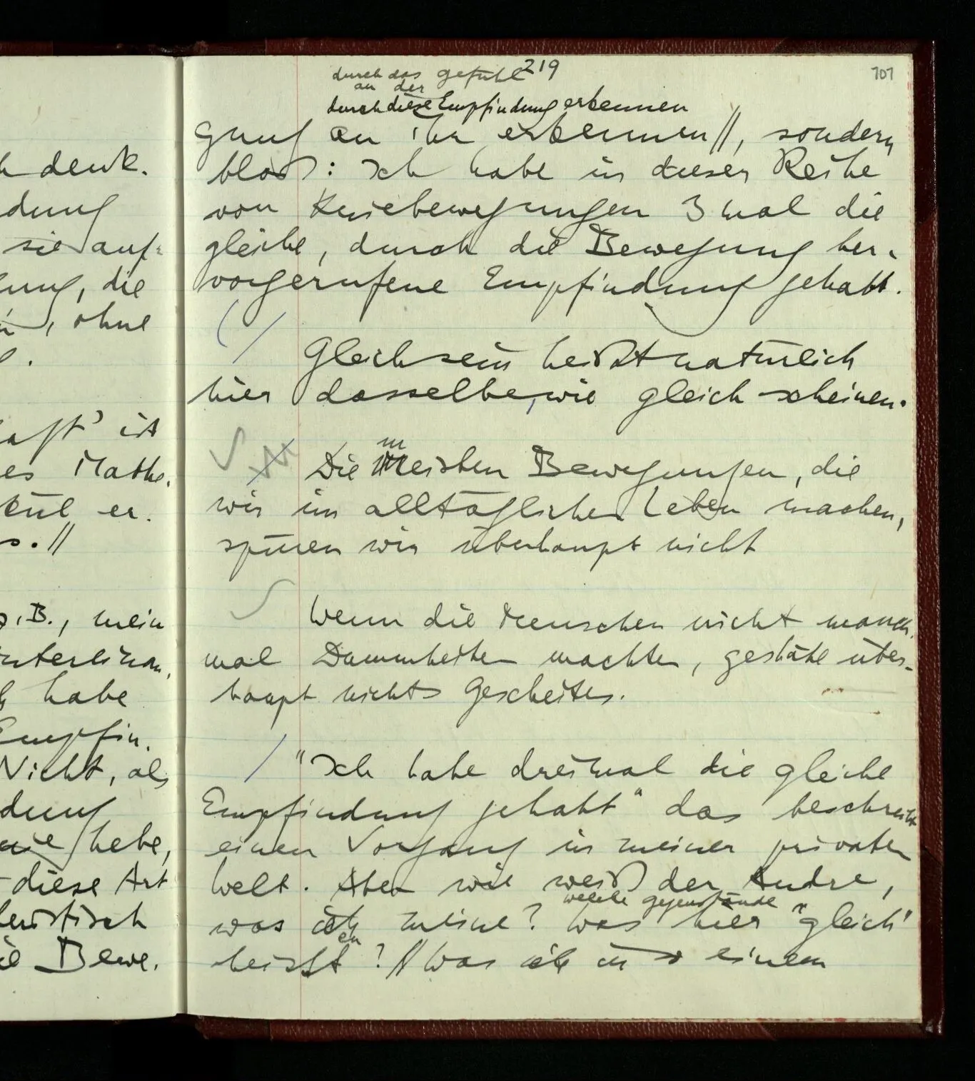Ich kann gewiß, z.B., mein Knie mehrere Male hintereinander heben & sagen, ich habe jedesmal die gleiche Empfindung dabei gehabt: Nicht, als hätte ich diese Empfindung immer, wenn ich das Knie hebe, noch, als wäre sie für diese Art der Bewegung charakteristisch, sondern bloß: Ich habe in dieser Reihe von Kniebewegungen dreimal die gleiche, durch die Bewegung hervorgerufene Empfindung gehabt.