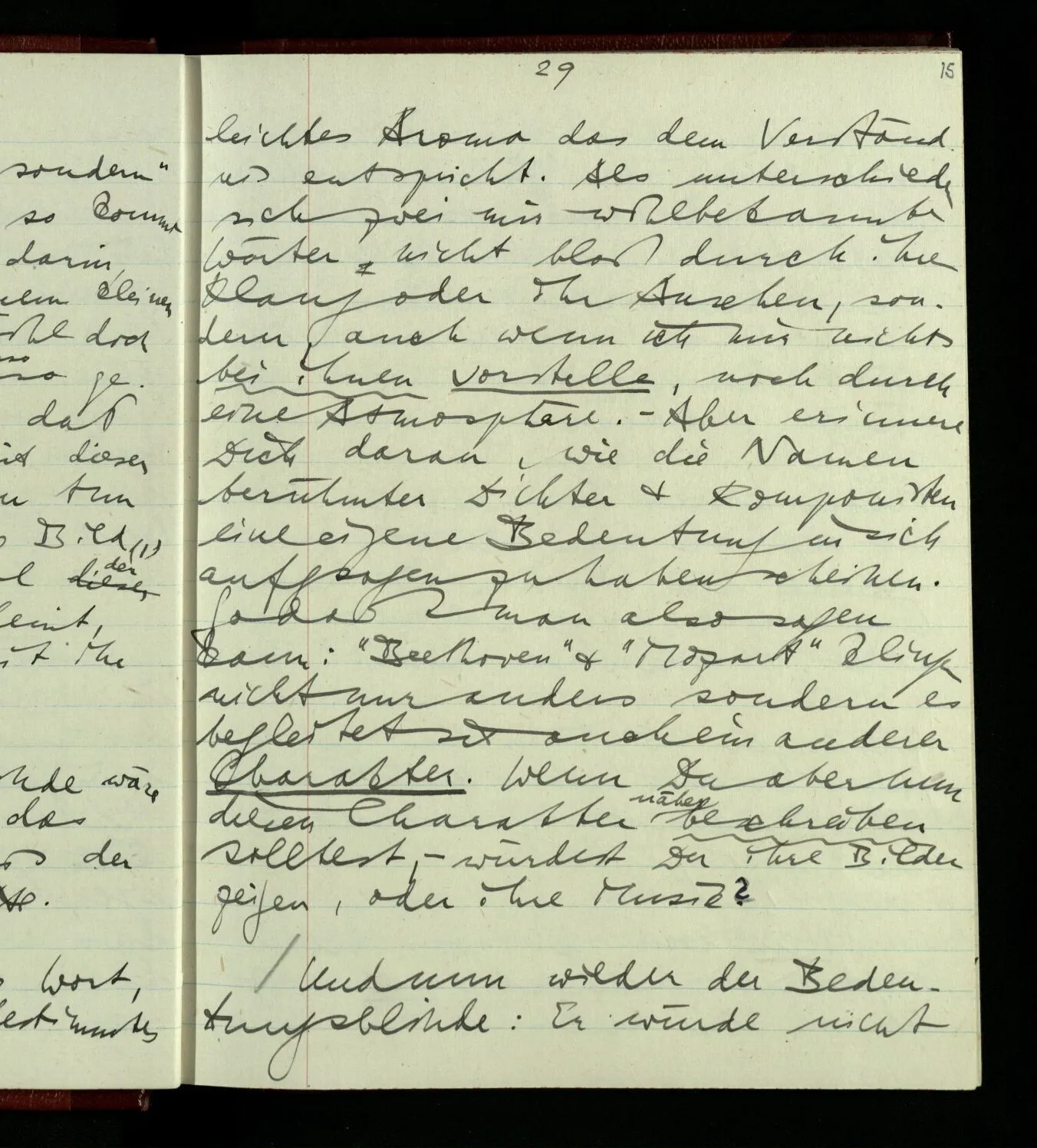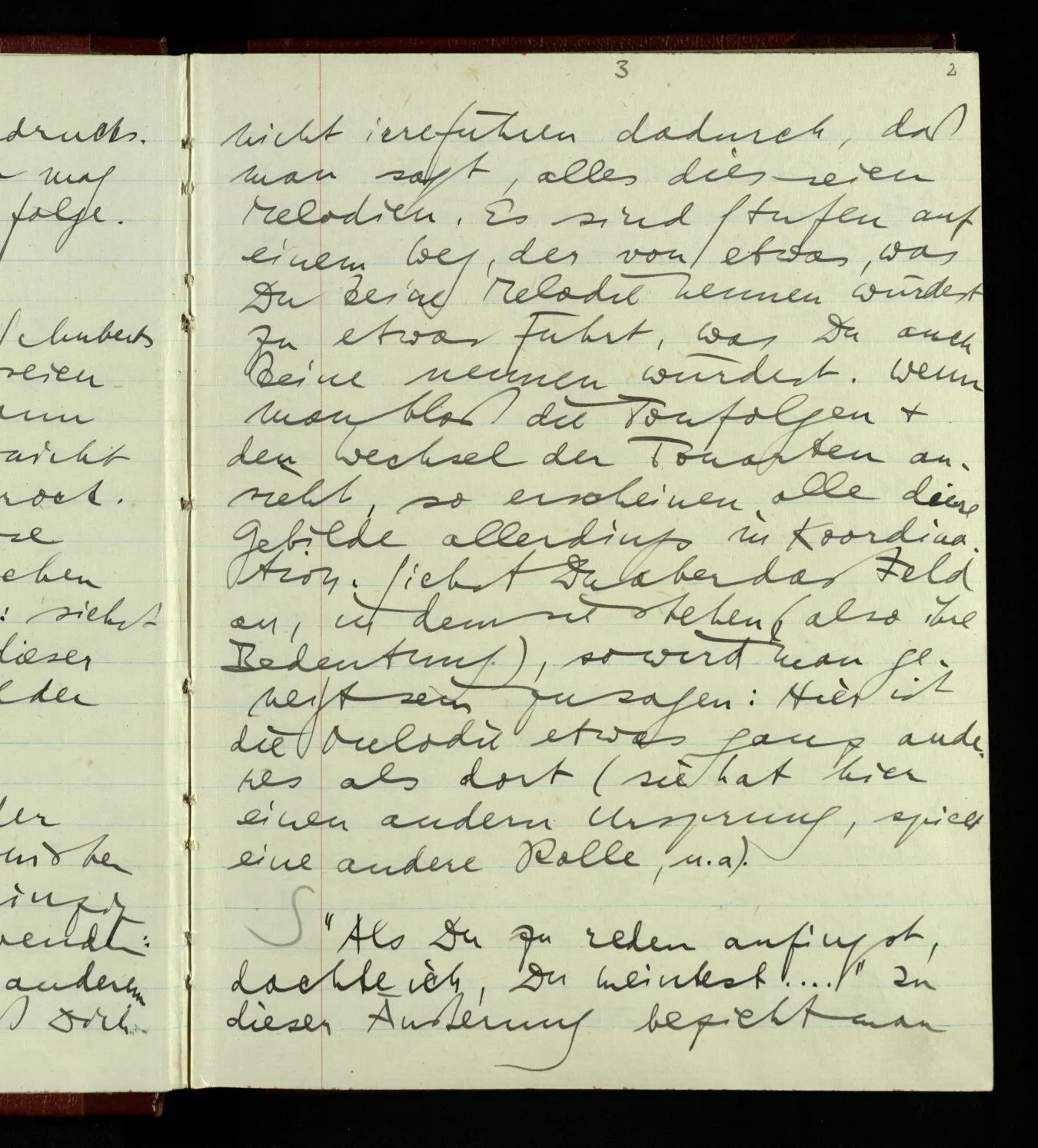 Auf die Melodien der verschiedenen Komponisten kann man jenes Prinzip der Betrachtung anwenden: jede Baumart sei in anderem Sinne ‘Baum’. D.h.: Laß Dich nicht irreführen dadurch, daß man sagt, alles dies seien Melodien. Es sind Stufen auf einem Weg, der von etwas, was Du keine Melodie nennen würdest zu etwas führt, was Du auch keine nennen würdest. Wenn man bloß die Tonfolgen & den Wechsel der Tonarten ansieht, so erscheinen alle diese Gebilde allerdings in Koordination. Siehst Du aber das Feld an, in dem sie stehen (also ihre Bedeutung), so wird man geneigt sein zu sagen: Hier ist die Melodie etwas ganz anderes als dort (sie hat hier einen andern Ursprung, spielt eine andere Rolle, u.a.).