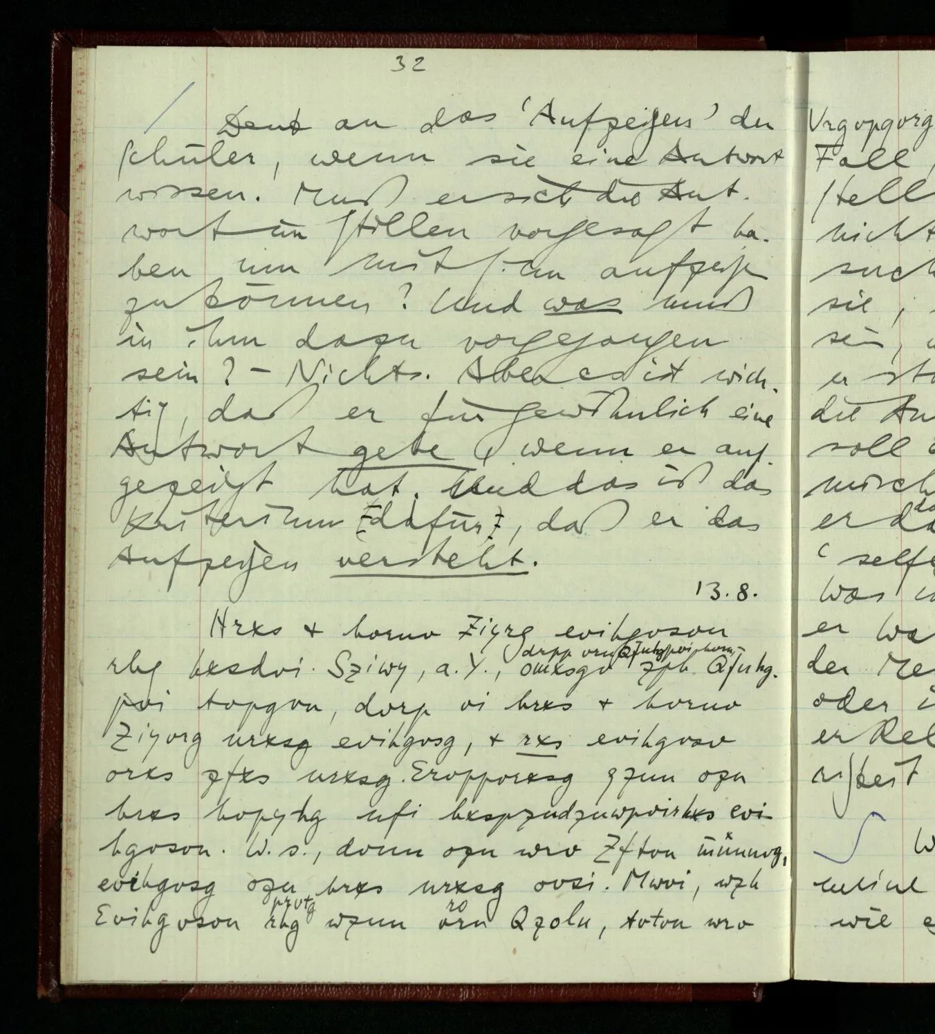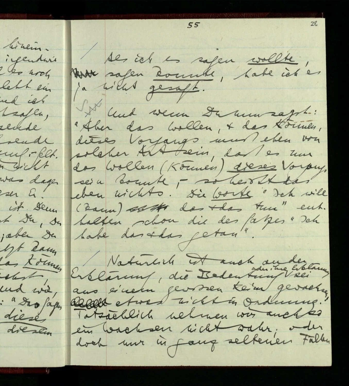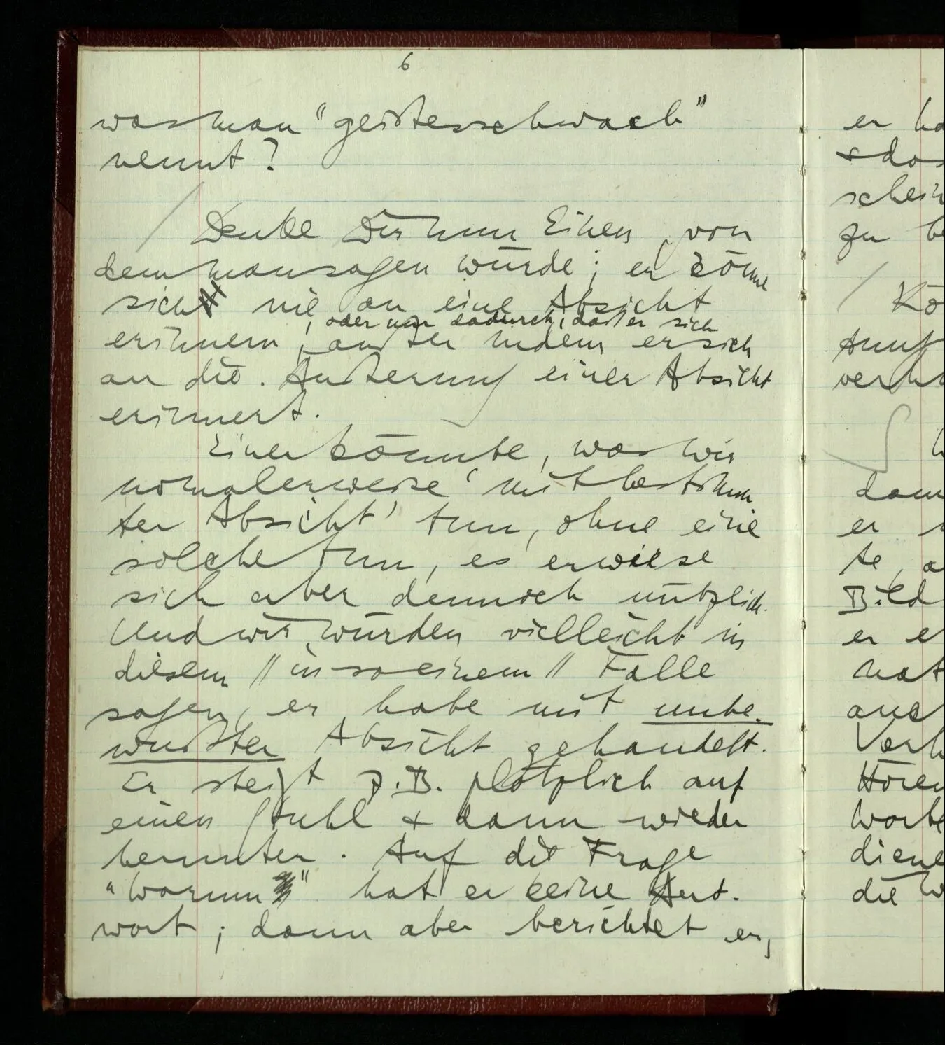 Denke Dir nun Einen, von dem man sagen würde, er könne sich nie an eine Absicht erinnern, außer indem er sich an die Äußerung einer Absicht erinnert. Einer könnte, was wir normalerweise ‘mit bestimmter Absicht’ tun, ohne eine solche tun, es erwiese sich aber dennoch nützlich. Und wir würden vielleicht in diesem Falle sagen, er habe mit unbewußter Absicht gehandelt. Er steigt z.B. plötzlich auf einen Stuhl & dann wieder herunter. Auf die Frage “Warum” hat er keine Antwort; dann aber berichtet er, er habe von dem Stuhl aus das & das bemerkt, so daß es scheint, als wäre er, um dies zu beobachten, hinaufgestiegen.