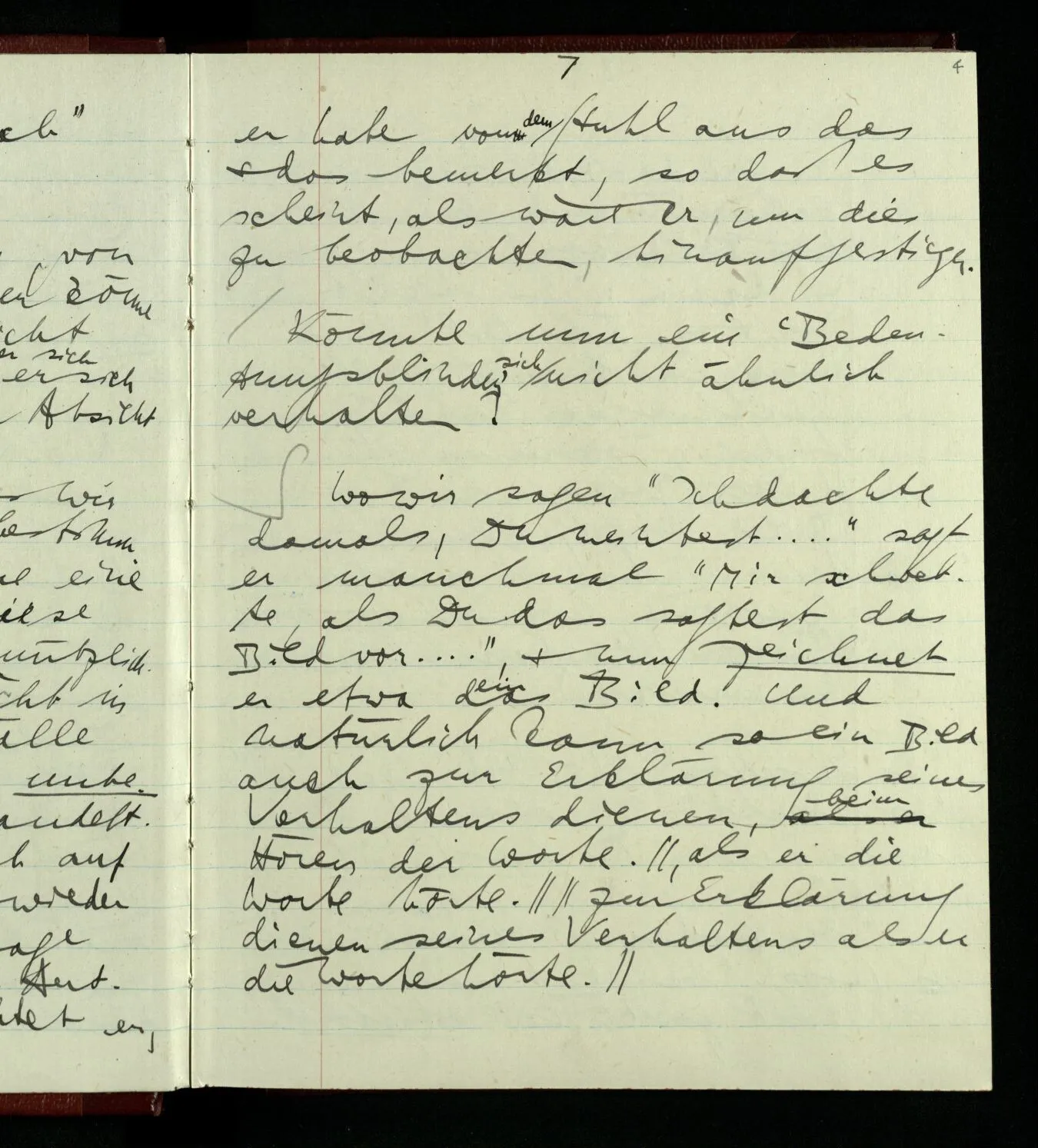 Er würde z.B. sagen: “Es schwebte mir damals dies Bild vor” & es zeichnen & dann: “Es sieht dem so & so ähnlich”. Und nun läßt sich vielleicht leicht eine Erklärung finden, warum ihm bei dieser Gelegenheit ein Bild eingefallen ist, das dem … ähnlich sieht. (Es wäre hier also wieder wie oben Bewußtes durch Unbewußtes ersetzt.)