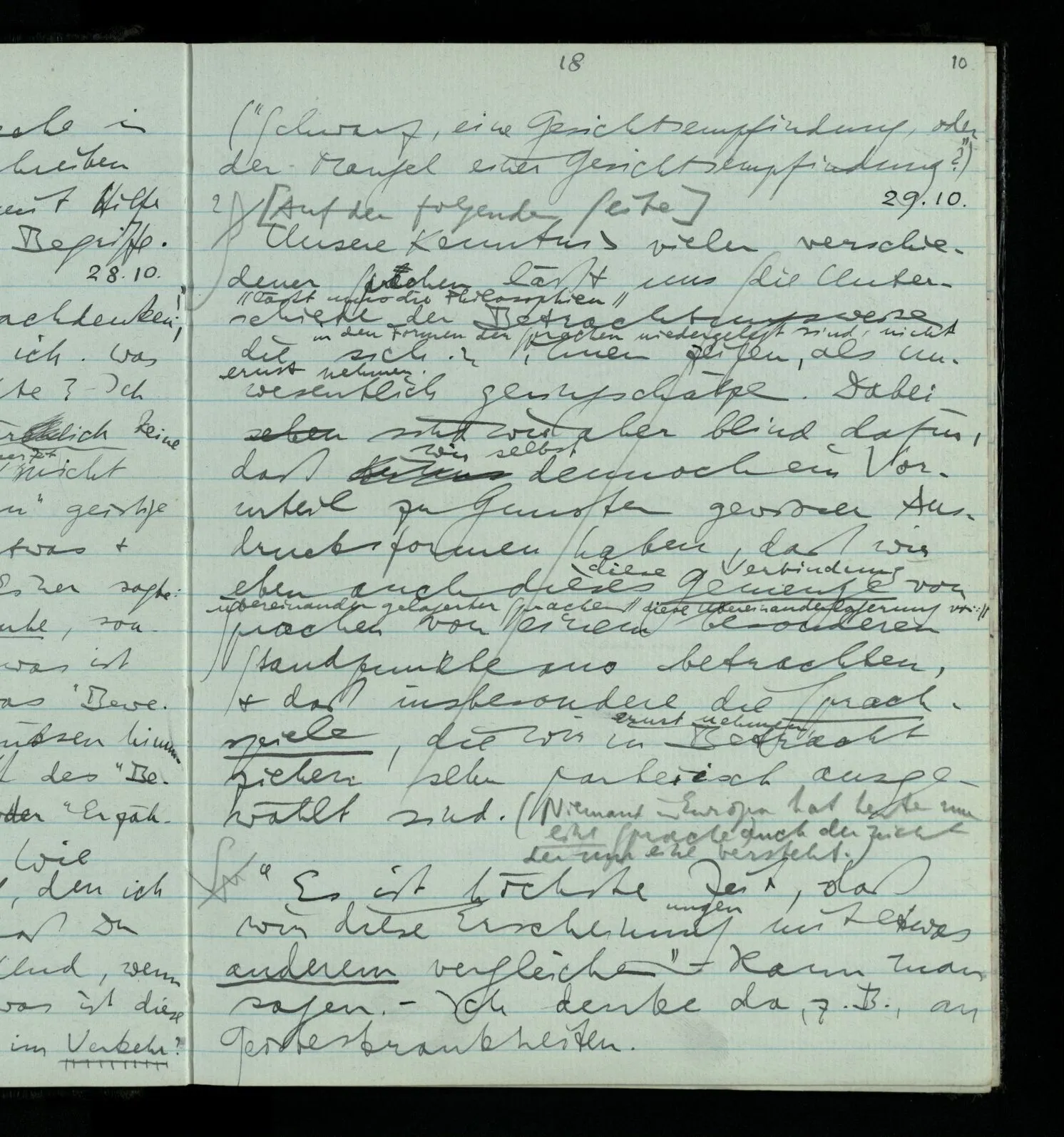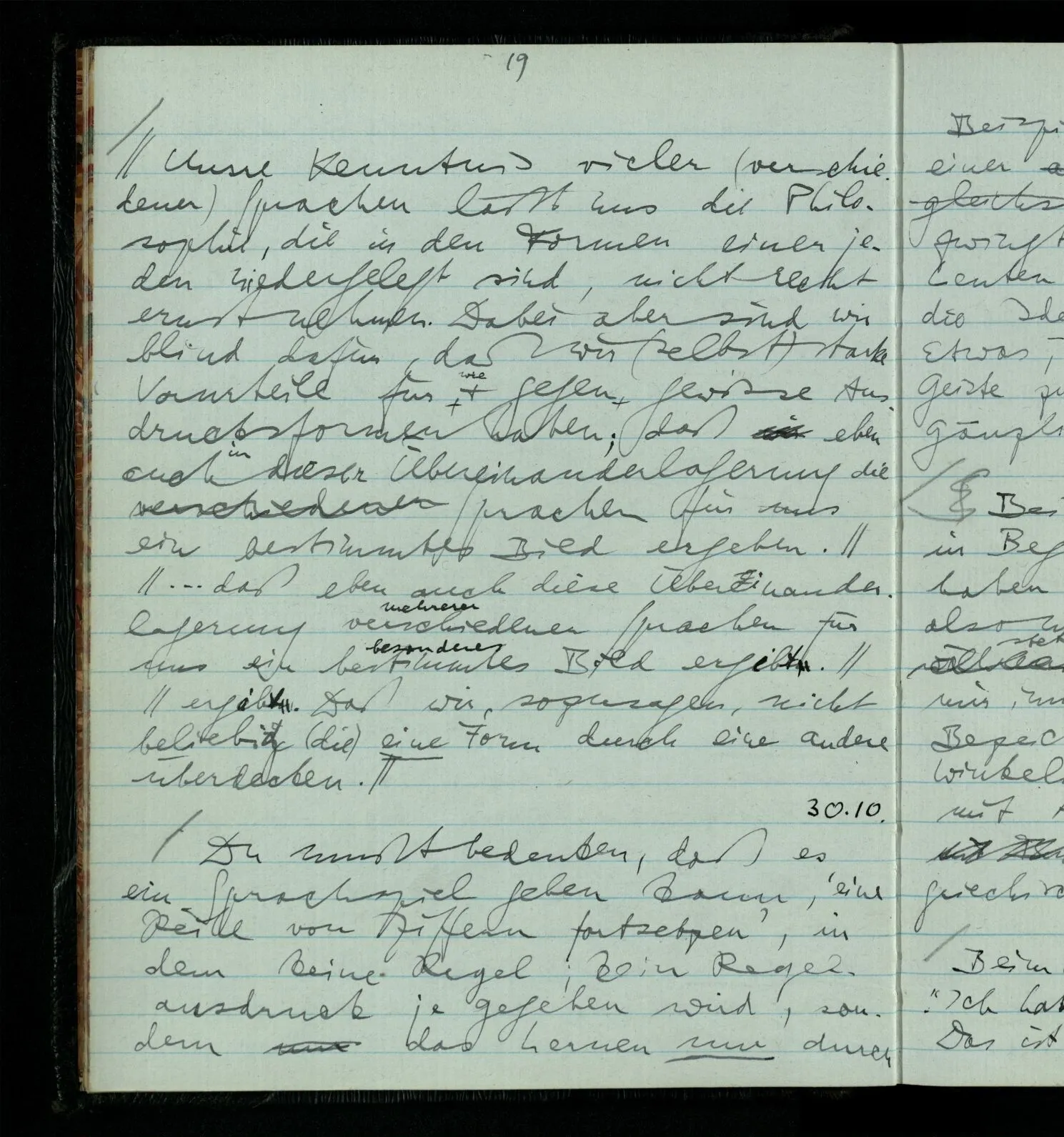 29.10.1946 Unsere Kenntnis vieler verschiedener Sprachen läßt uns die Unterschiede der Betrachtungsweisen die sich in ihnen zeigen, als unwesentlich geringschätzen. Dabei sind wir aber blind dafür, daß wir selbst dennoch ein Vorurteil zu Gunsten gewisser Ausdrucksformen haben, daß wir eben auch dieses Gemenge von Sprachen von von einem besonderen Standpunkte aus betrachten, & daß insbesondere die Sprachspiele, die wir in Betracht ziehen sehr parteiisch ausgewählt sind. (Niemand in Europa hat heute nur eine Sprache) auch der zuckt der nur eine versteht.)