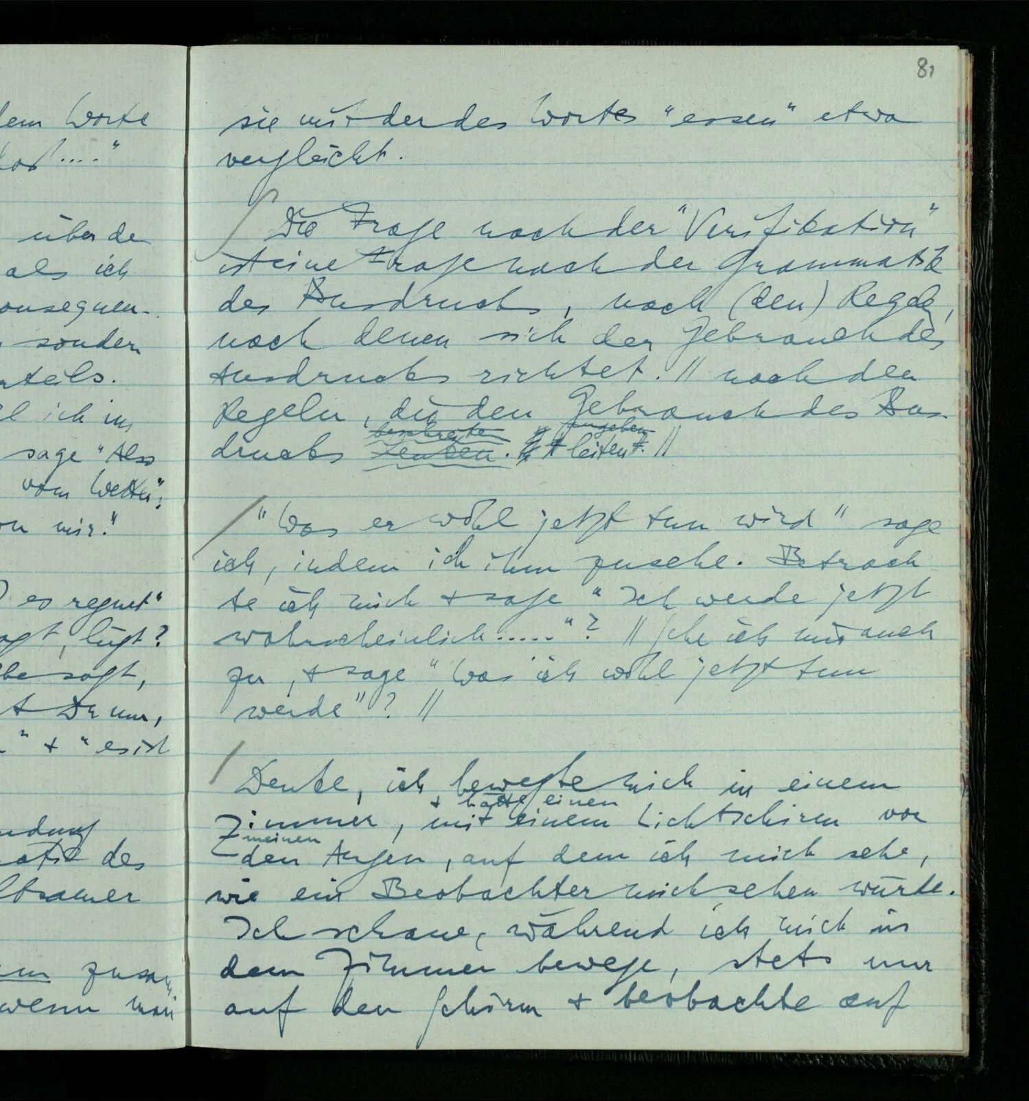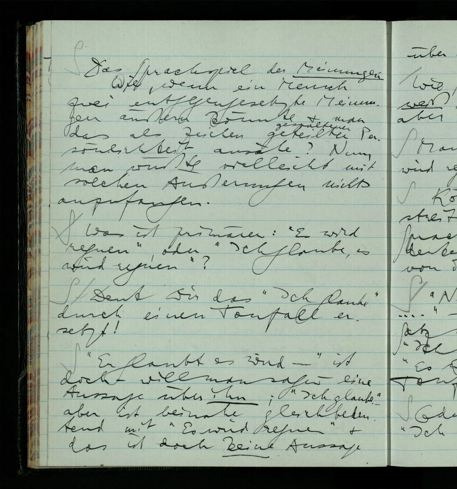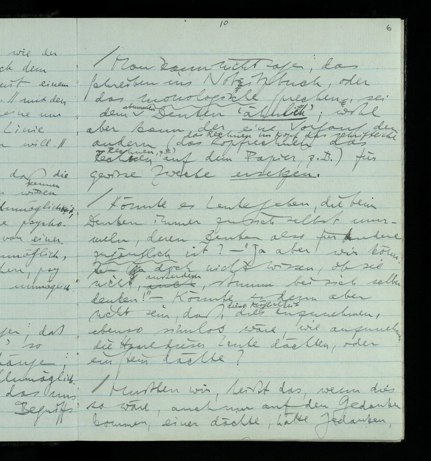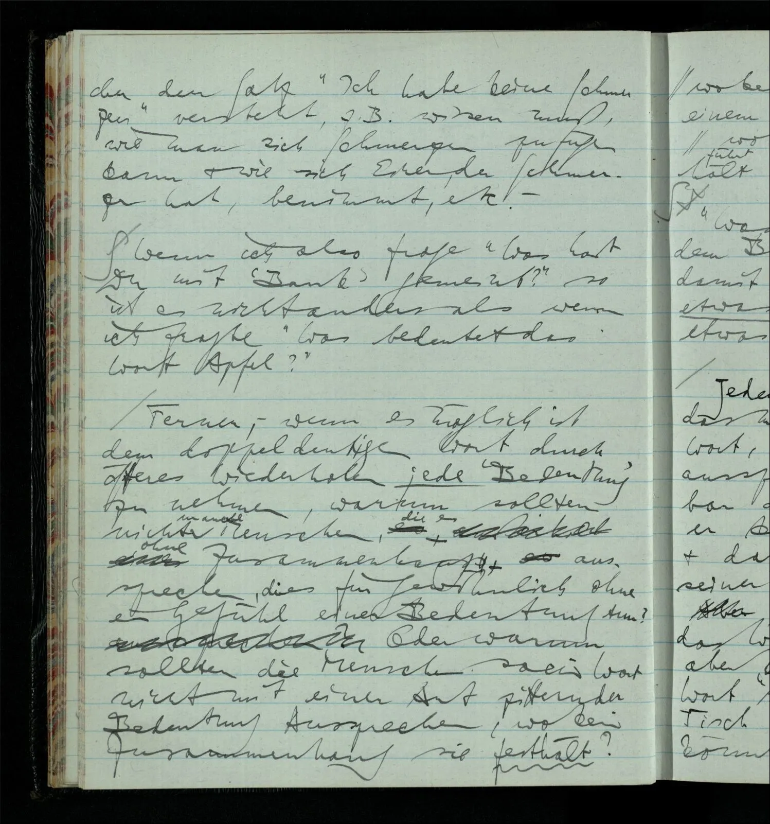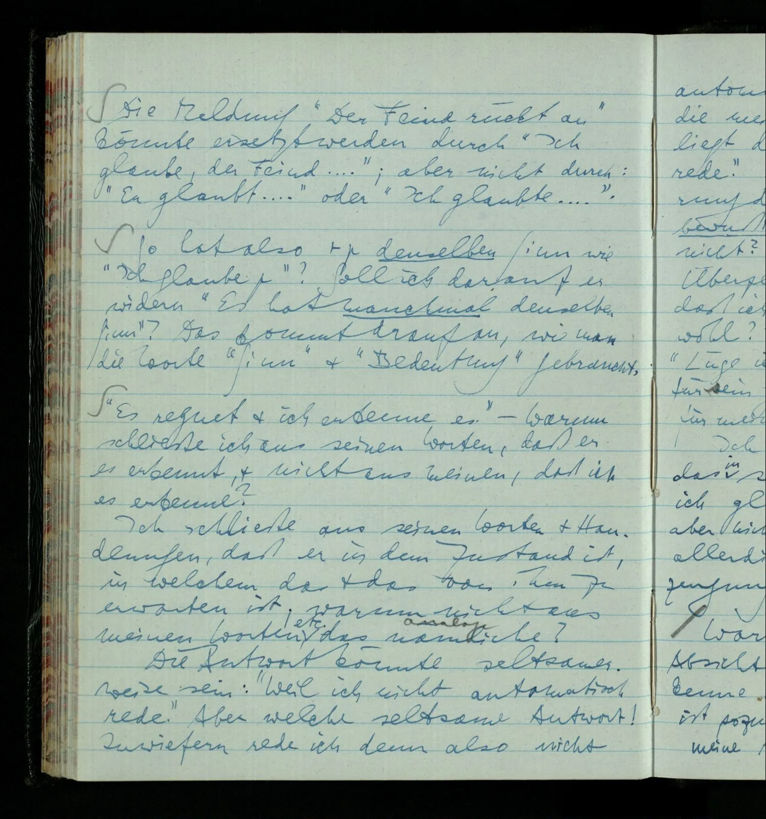 “Der Mensch ist im Stande, in voller Abgeschlossenheit mit sich selbst zu reden; in einer Isolierung, die weit vollkommener ist, als jede körperliche Isolierung.” Wie weiß ich, daß dem N. dies gegeben ist? – Weil er’s sagt & zuverlässig ist? – Und doch sagen wir: “Ich wüßte gerne, was er jetzt bei sich denkt”; ganz so, wie wir sagen könnten: “Ich wüßte gerne, was er jetzt in sein Notizbuch schreibt”. Ja, man könnte eben das sagen & es, sozusagen, als selbstverständlich ansehen, daß er bei sich das denkt, was er in’s