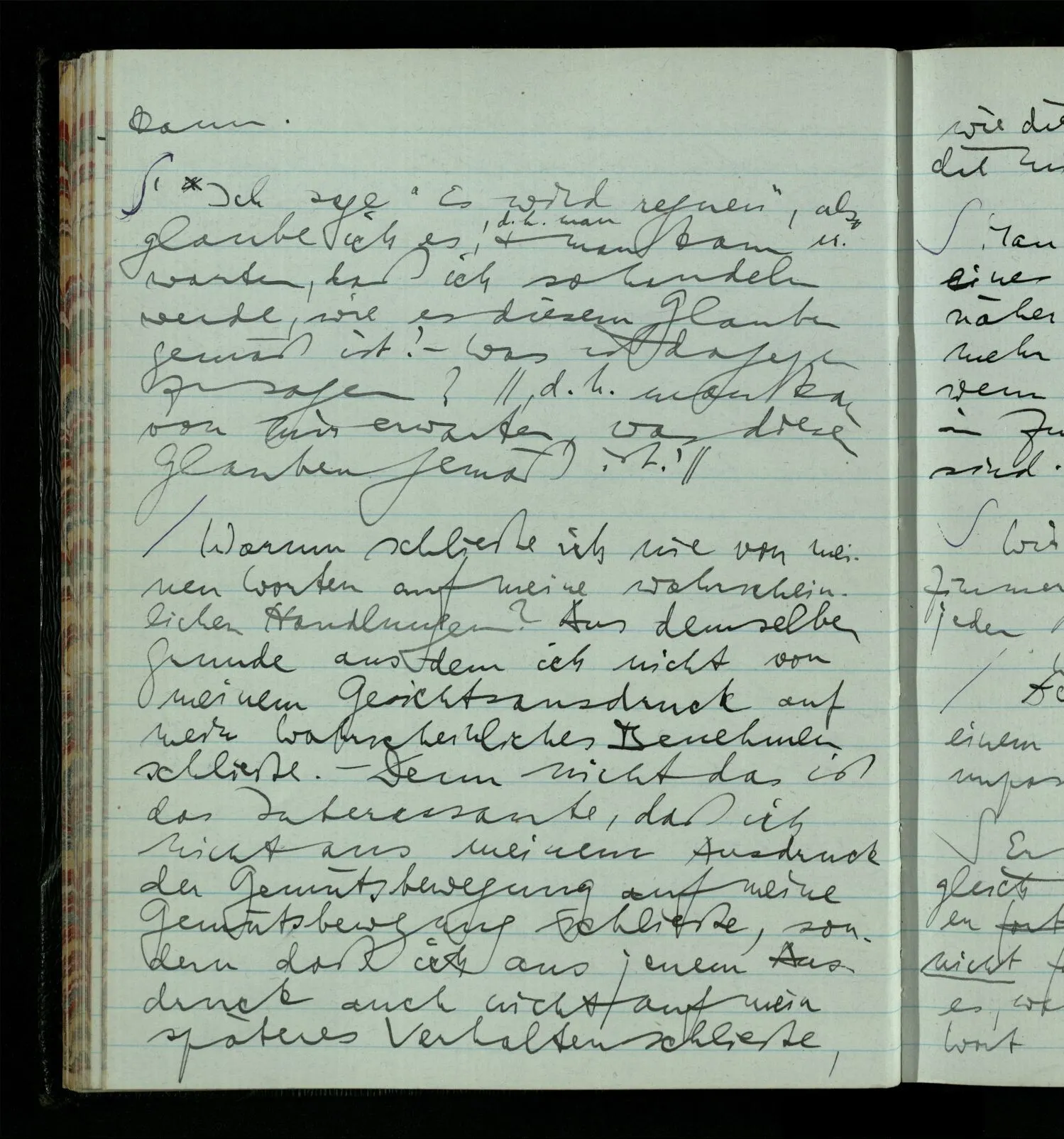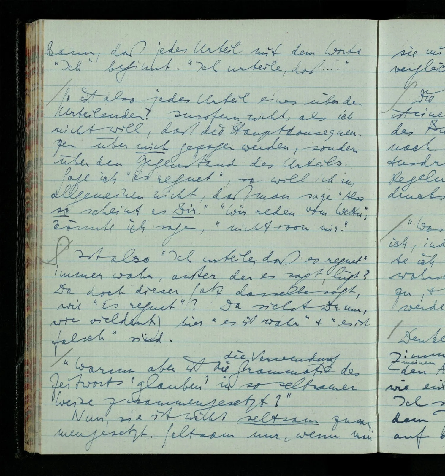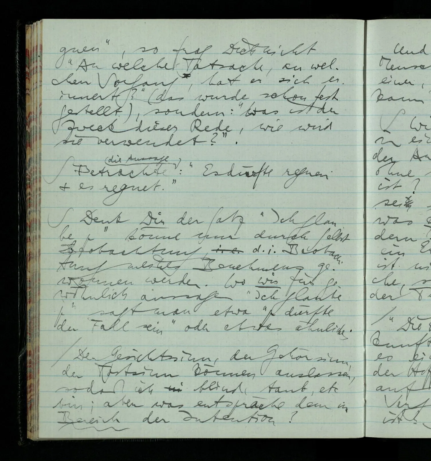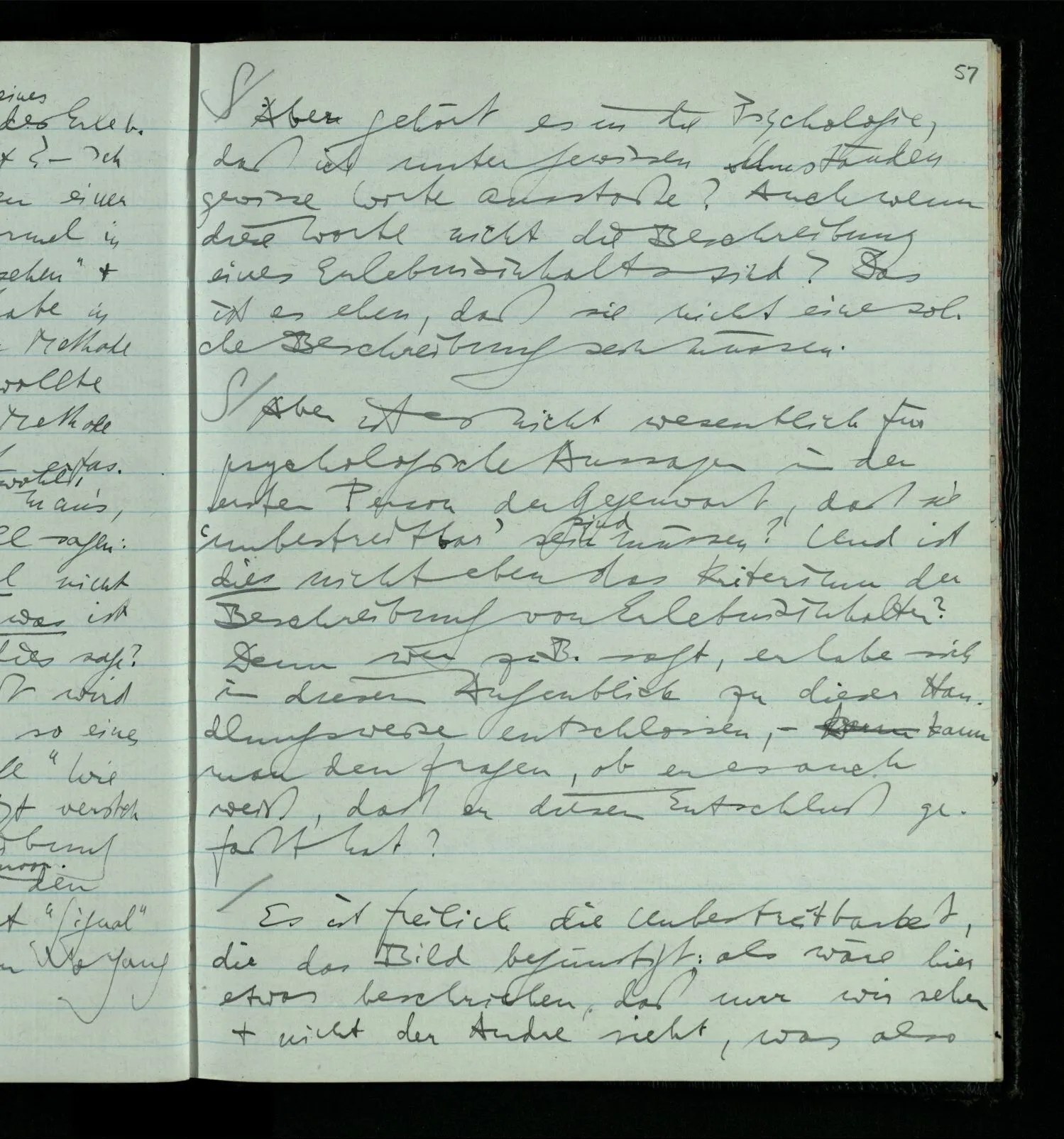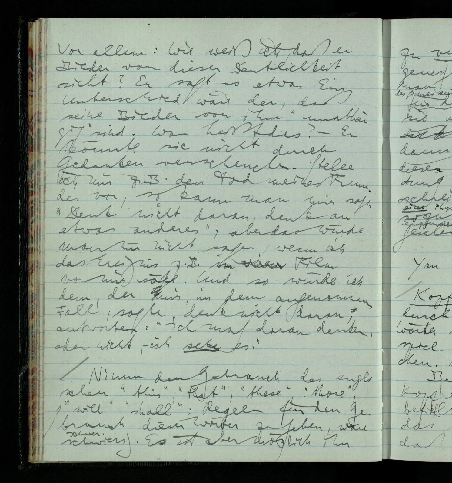 “Der Mensch ist im Stande, in voller Abgeschlossenheit mit sich selbst zu reden; in einer Isolierung, die weit vollkommener ist, als jede körperliche Isolierung.” Wie weiß ich, daß dem N. dies gegeben ist? – Weil er’s sagt & zuverlässig ist? – Und doch sagen wir: “Ich wüßte gerne, was er jetzt bei sich denkt”; ganz so, wie wir sagen könnten: “Ich wüßte gerne, was er jetzt in sein Notizbuch schreibt”. Ja, man könnte eben das sagen & es, sozusagen, als selbstverständlich ansehen, daß er bei sich das denkt, was er in’s