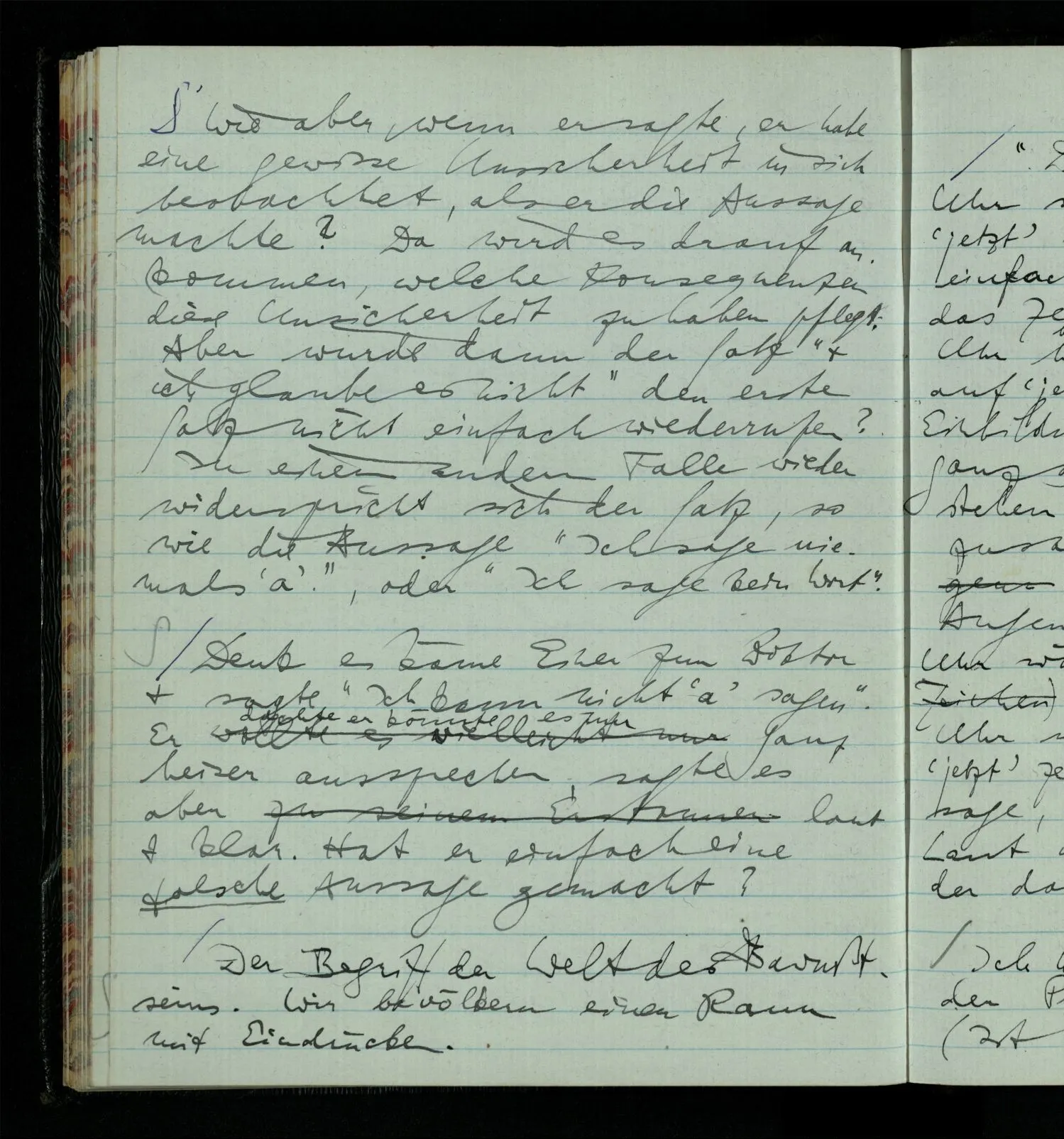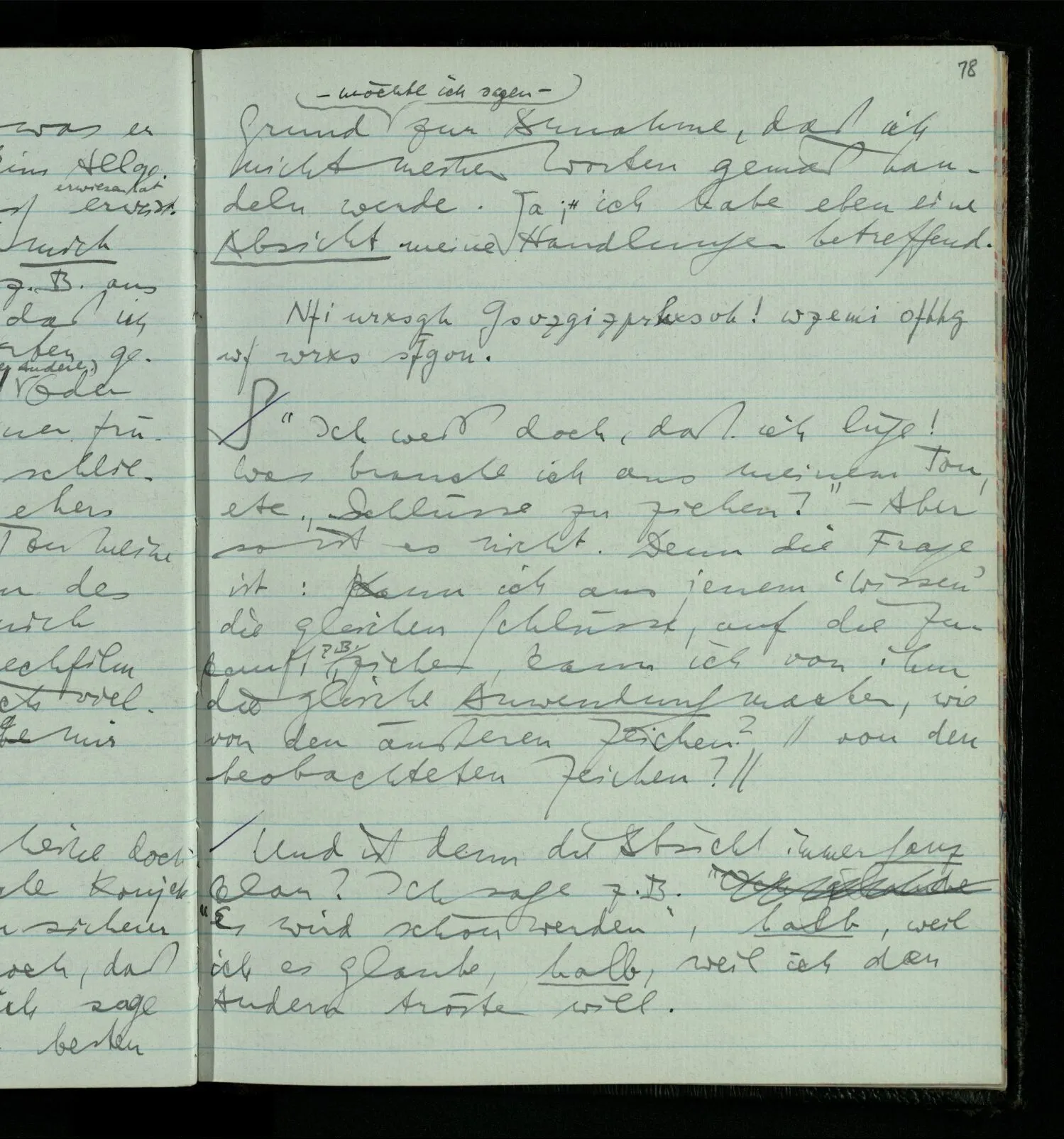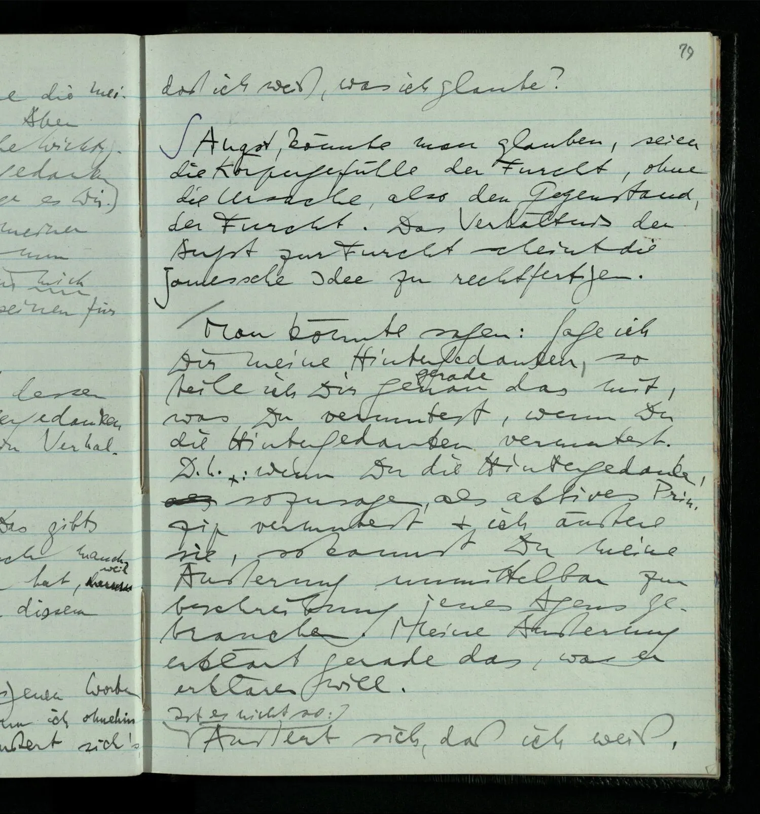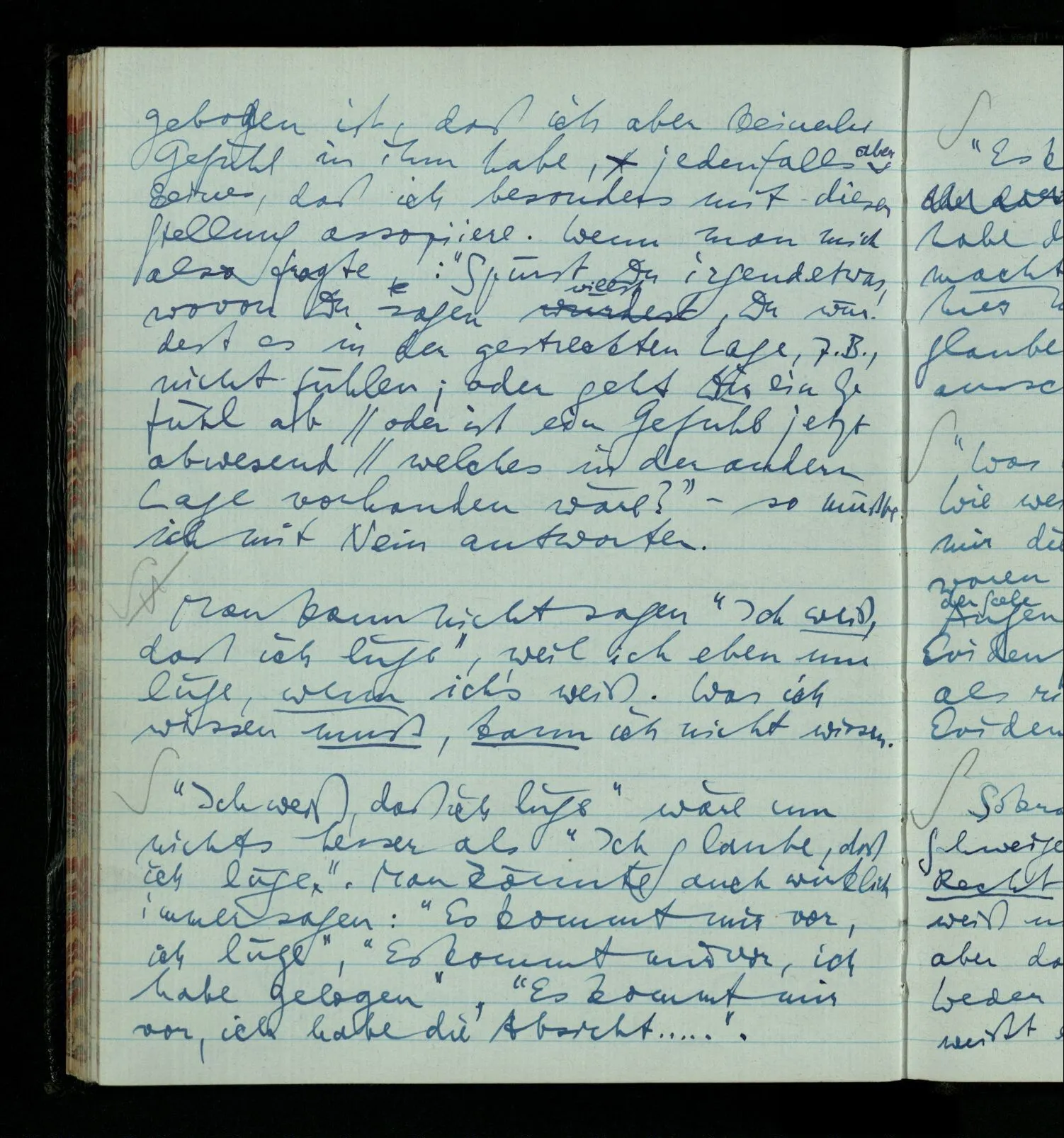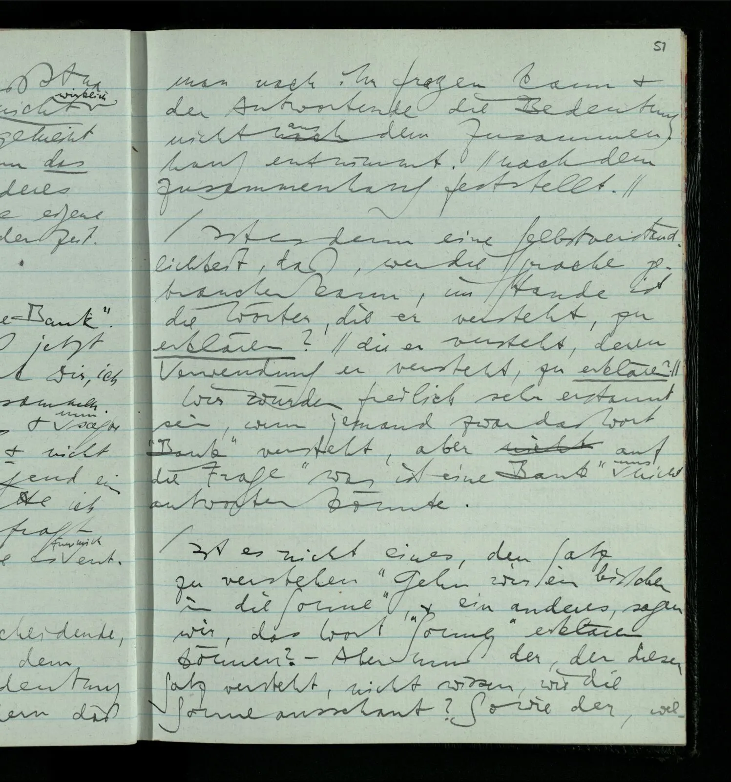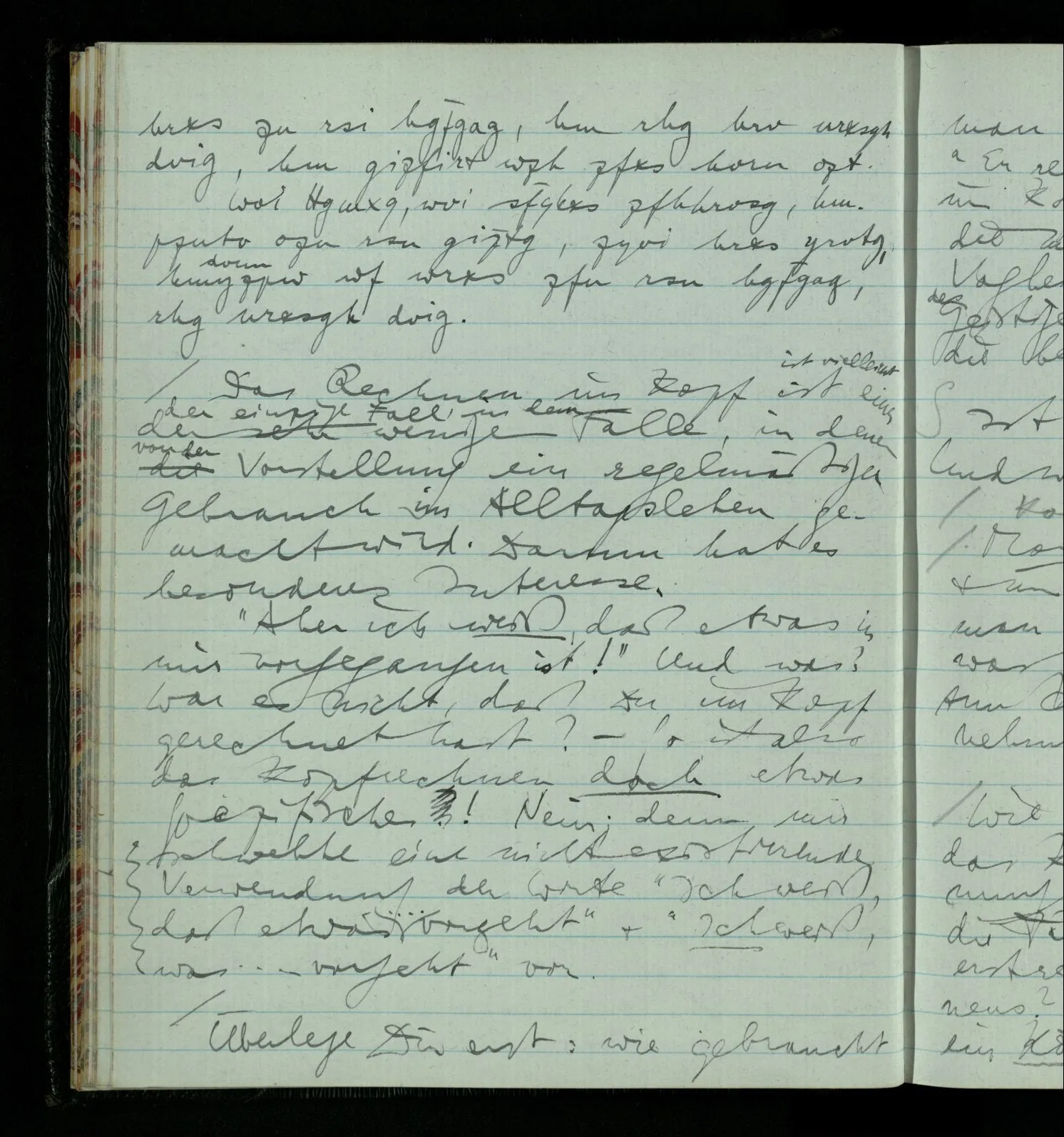 “Der Mensch ist im Stande, in voller Abgeschlossenheit mit sich selbst zu reden; in einer Isolierung, die weit vollkommener ist, als jede körperliche Isolierung.” Wie weiß ich, daß dem N. dies gegeben ist? – Weil er’s sagt & zuverlässig ist? – Und doch sagen wir: “Ich wüßte gerne, was er jetzt bei sich denkt”; ganz so, wie wir sagen könnten: “Ich wüßte gerne, was er jetzt in sein Notizbuch schreibt”. Ja, man könnte eben das sagen & es, sozusagen, als selbstverständlich ansehen, daß er bei sich das denkt, was er in’s