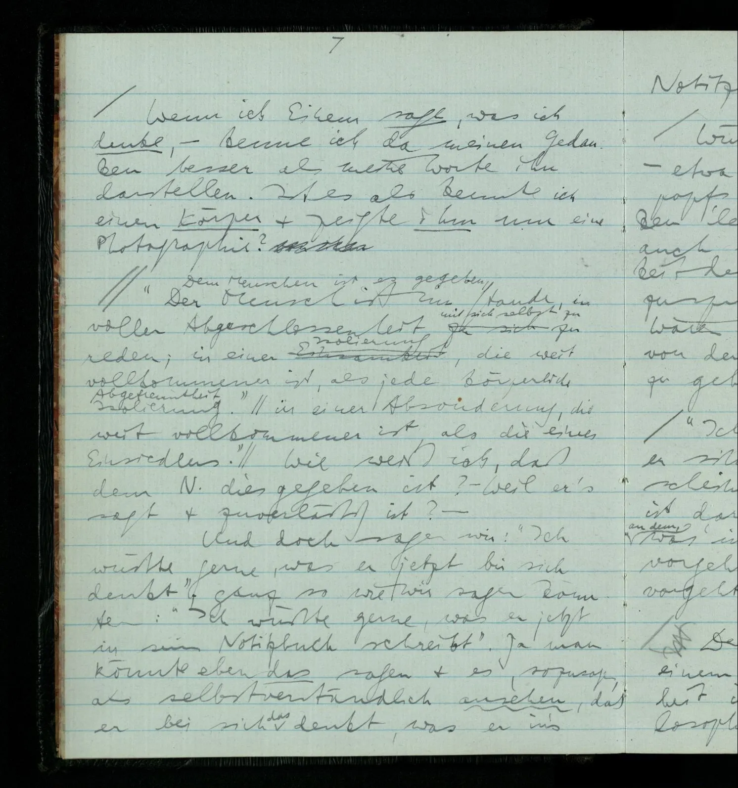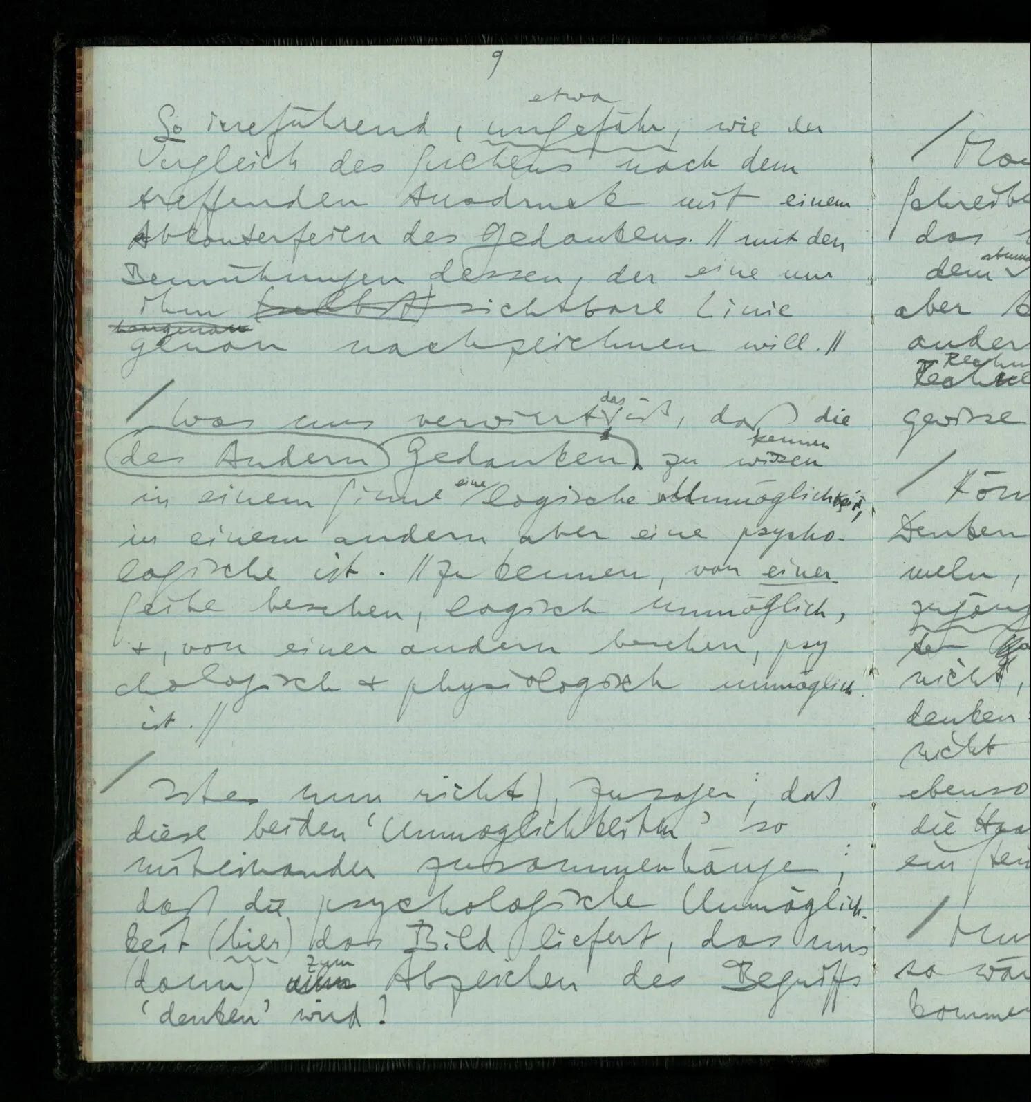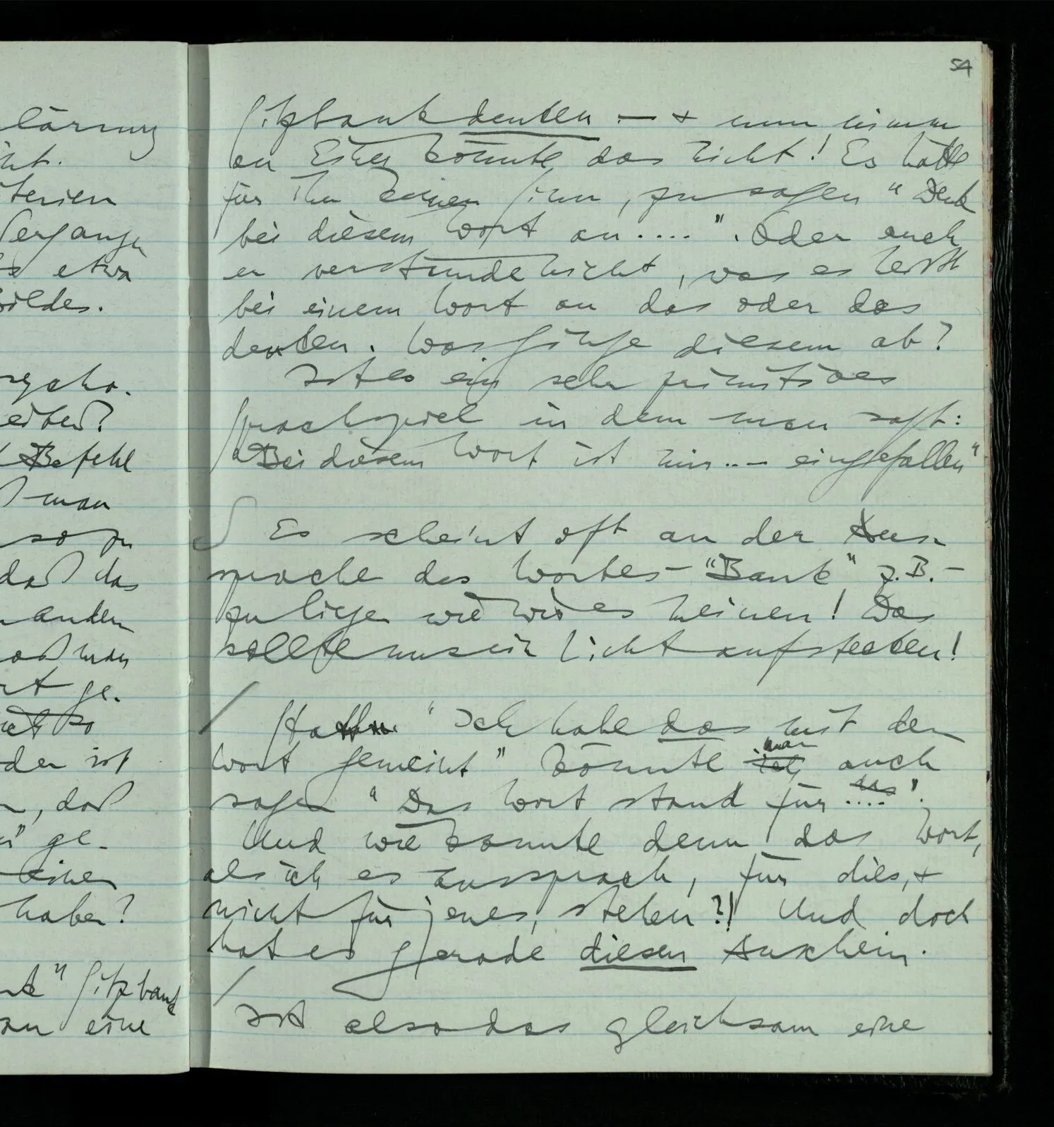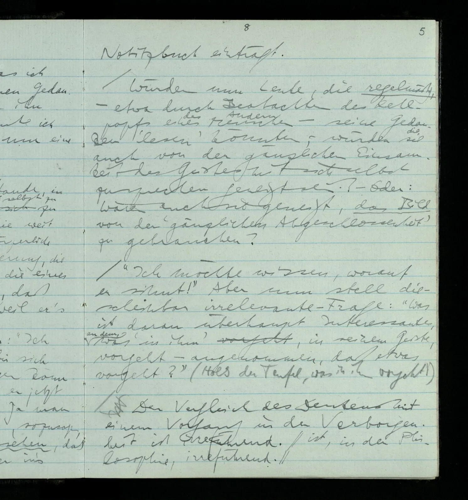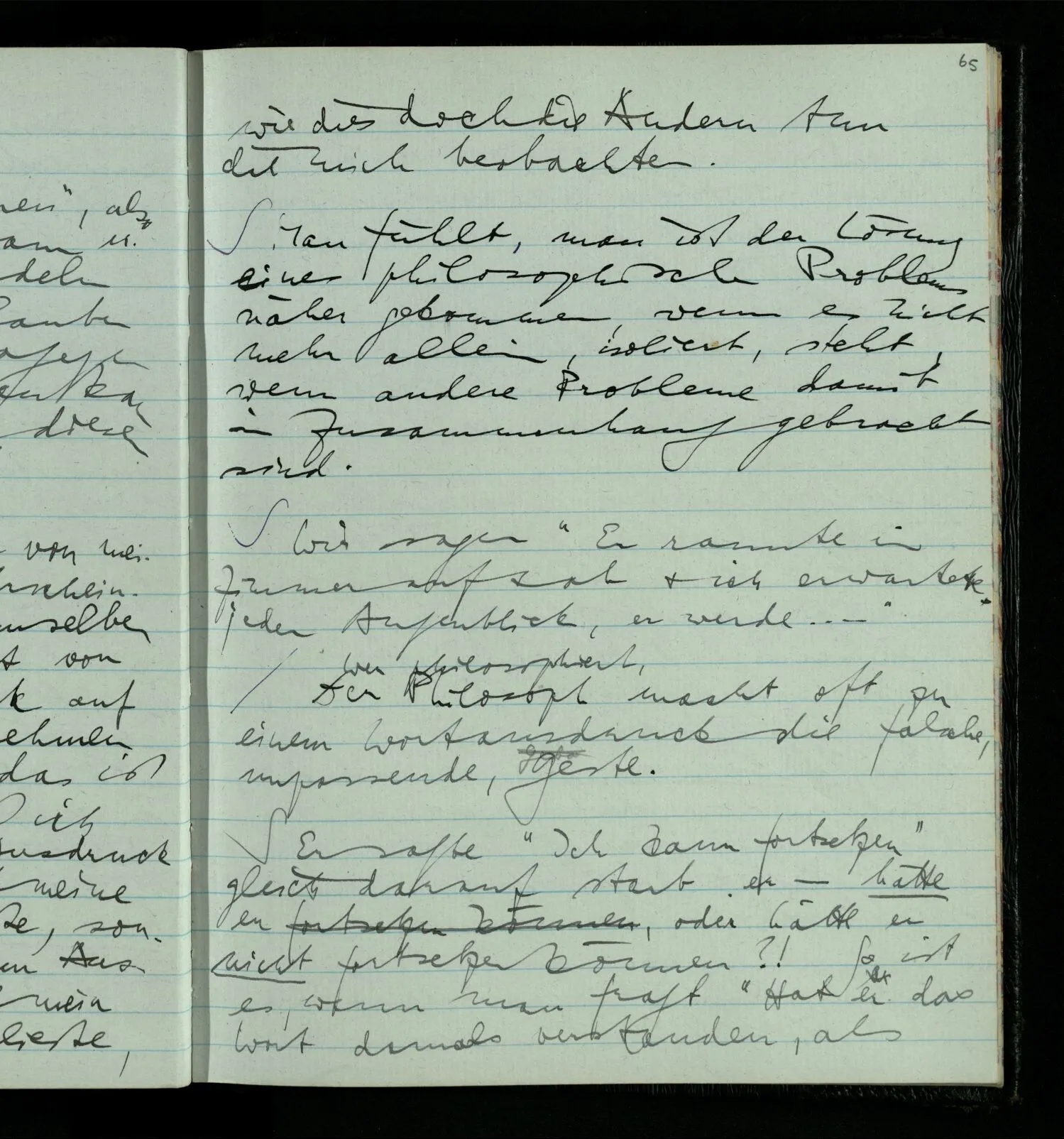 “Der Mensch ist im Stande, in voller Abgeschlossenheit mit sich selbst zu reden; in einer Isolierung, die weit vollkommener ist, als jede körperliche Isolierung.” Wie weiß ich, daß dem N. dies gegeben ist? – Weil er’s sagt & zuverlässig ist? – Und doch sagen wir: “Ich wüßte gerne, was er jetzt bei sich denkt”; ganz so, wie wir sagen könnten: “Ich wüßte gerne, was er jetzt in sein Notizbuch schreibt”. Ja, man könnte eben das sagen & es, sozusagen, als selbstverständlich ansehen, daß er bei sich das denkt, was er in’s