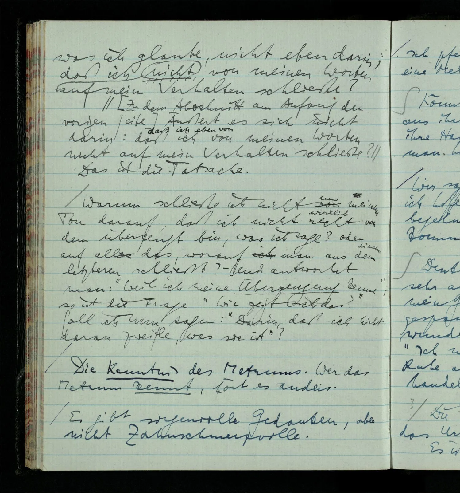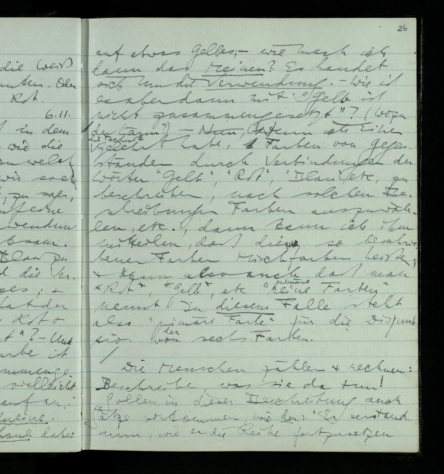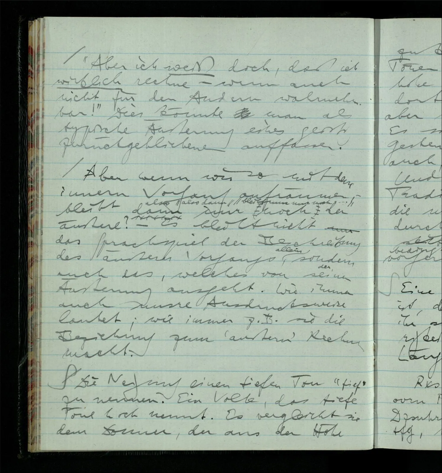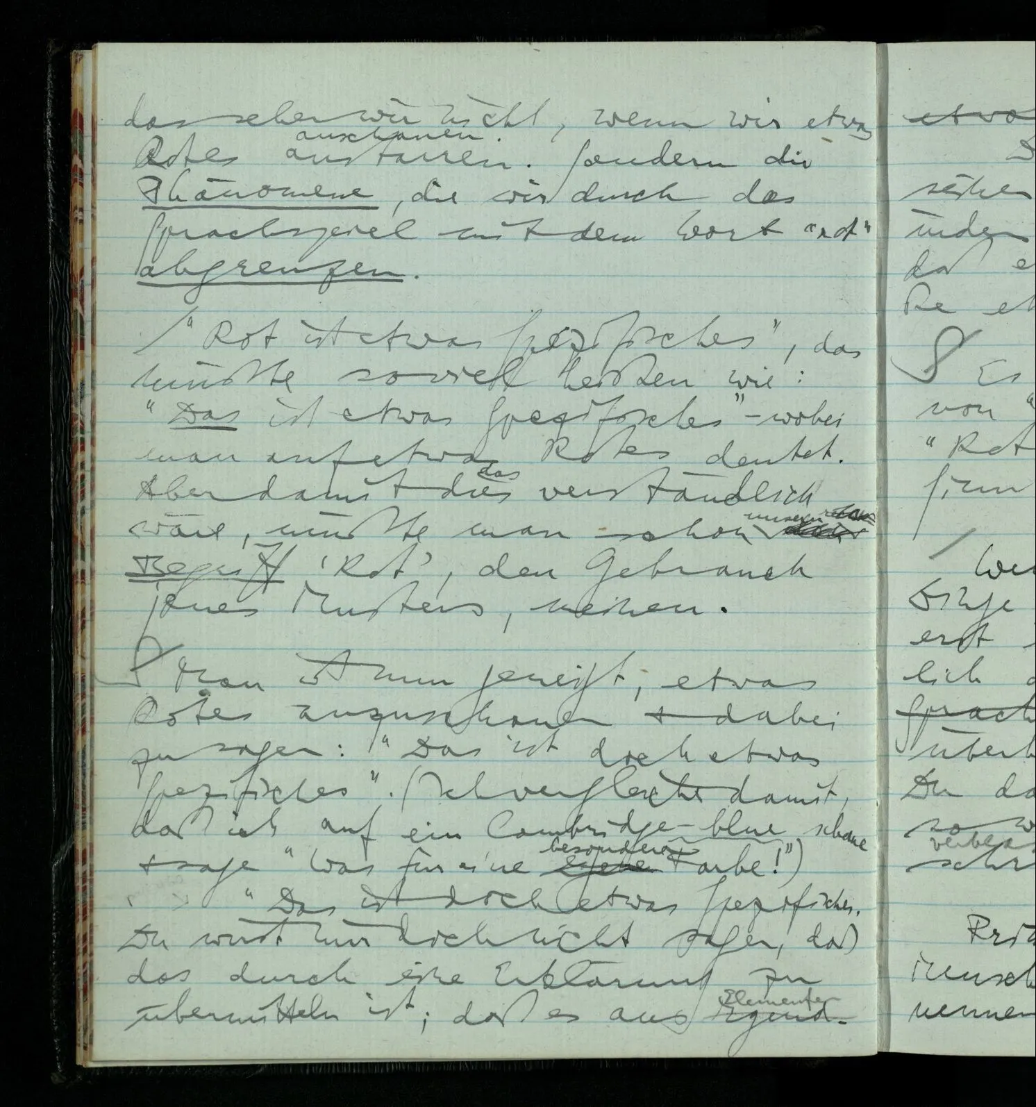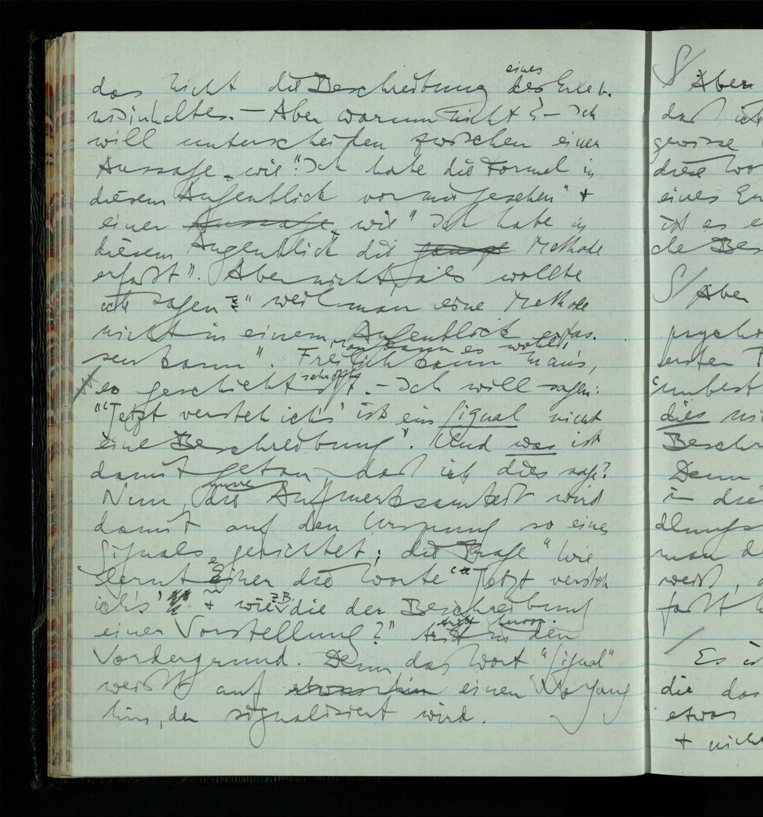 “Der Mensch ist im Stande, in voller Abgeschlossenheit mit sich selbst zu reden; in einer Isolierung, die weit vollkommener ist, als jede körperliche Isolierung.” Wie weiß ich, daß dem N. dies gegeben ist? – Weil er’s sagt & zuverlässig ist? – Und doch sagen wir: “Ich wüßte gerne, was er jetzt bei sich denkt”; ganz so, wie wir sagen könnten: “Ich wüßte gerne, was er jetzt in sein Notizbuch schreibt”. Ja, man könnte eben das sagen & es, sozusagen, als selbstverständlich ansehen, daß er bei sich das denkt, was er in’s
