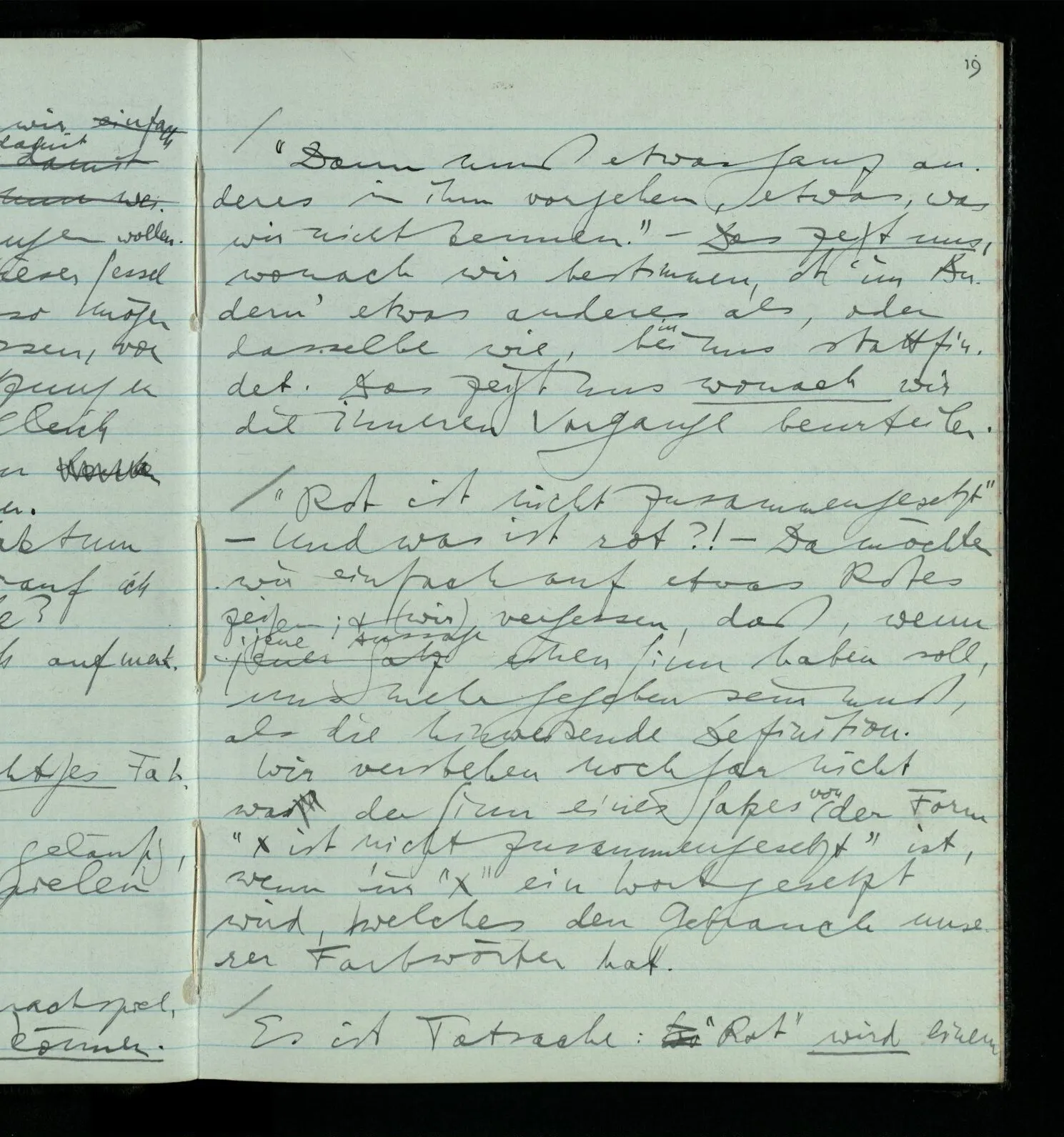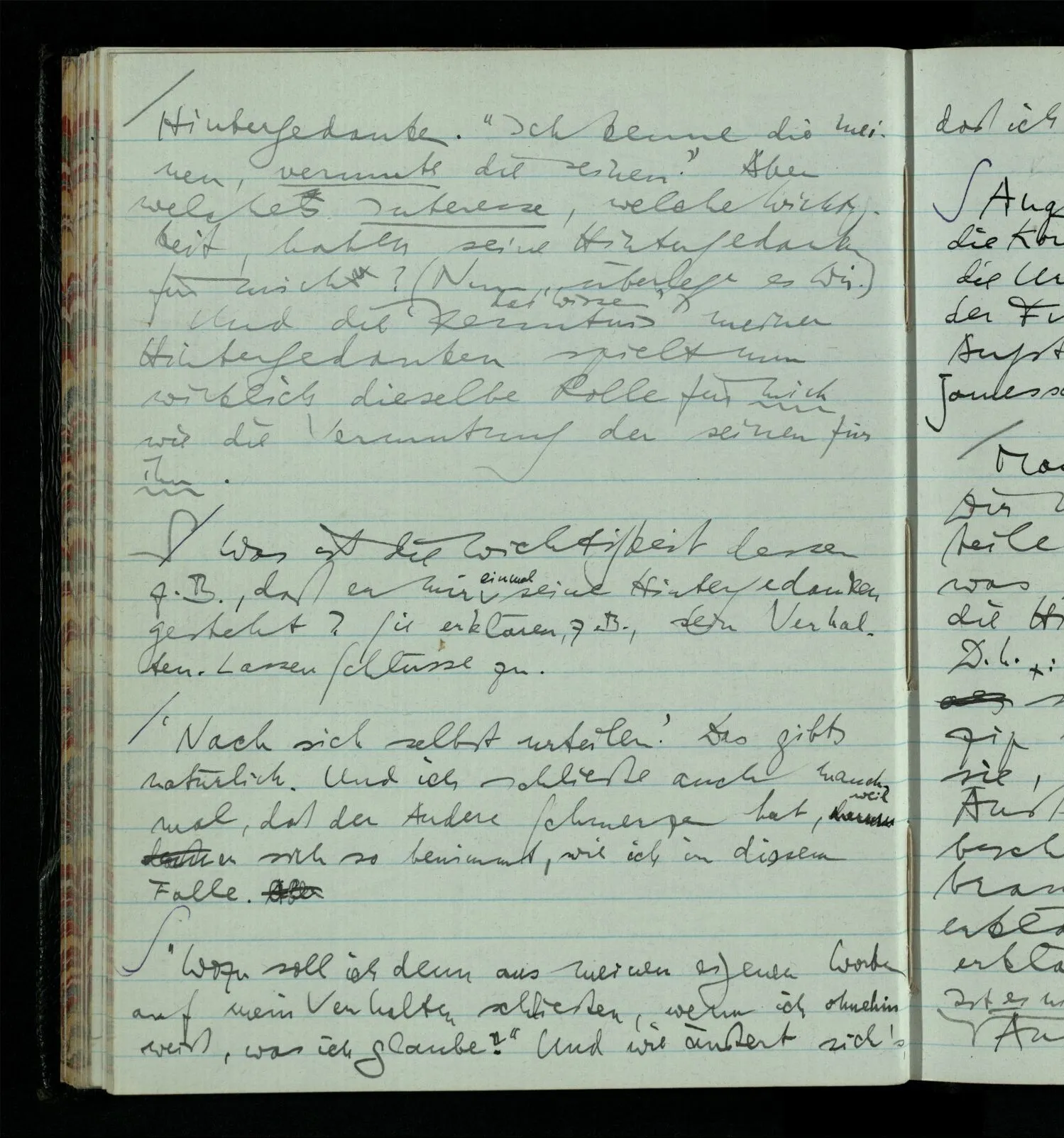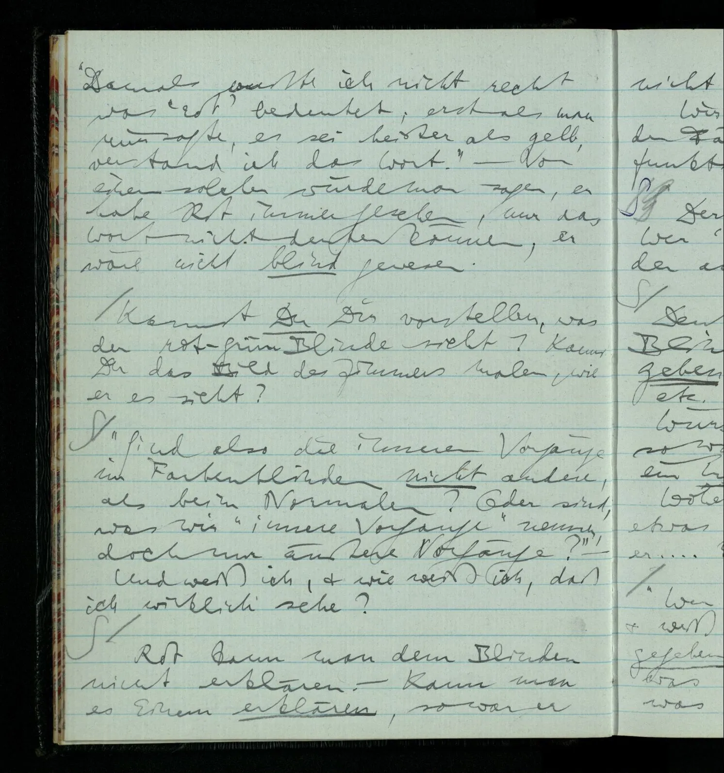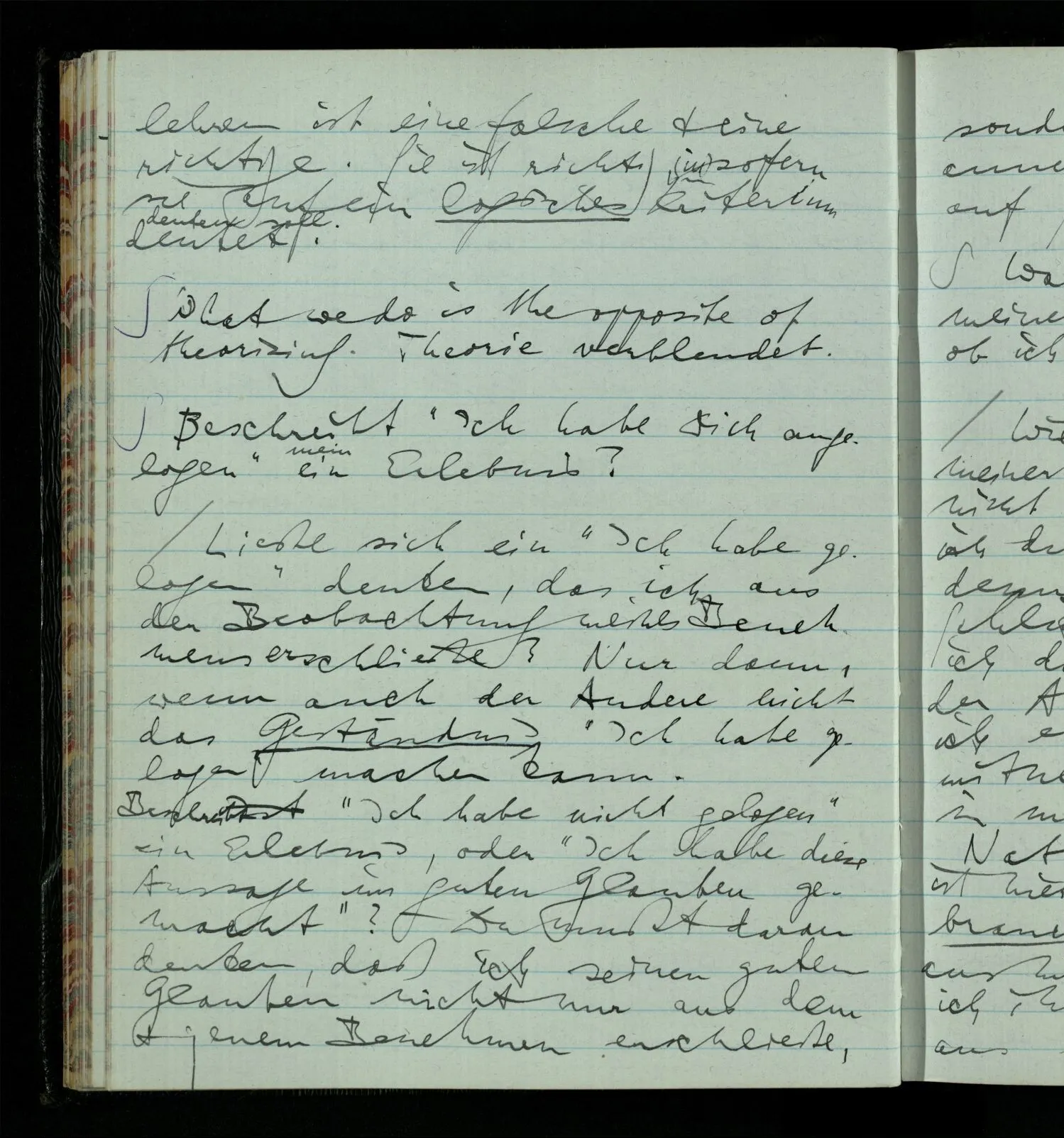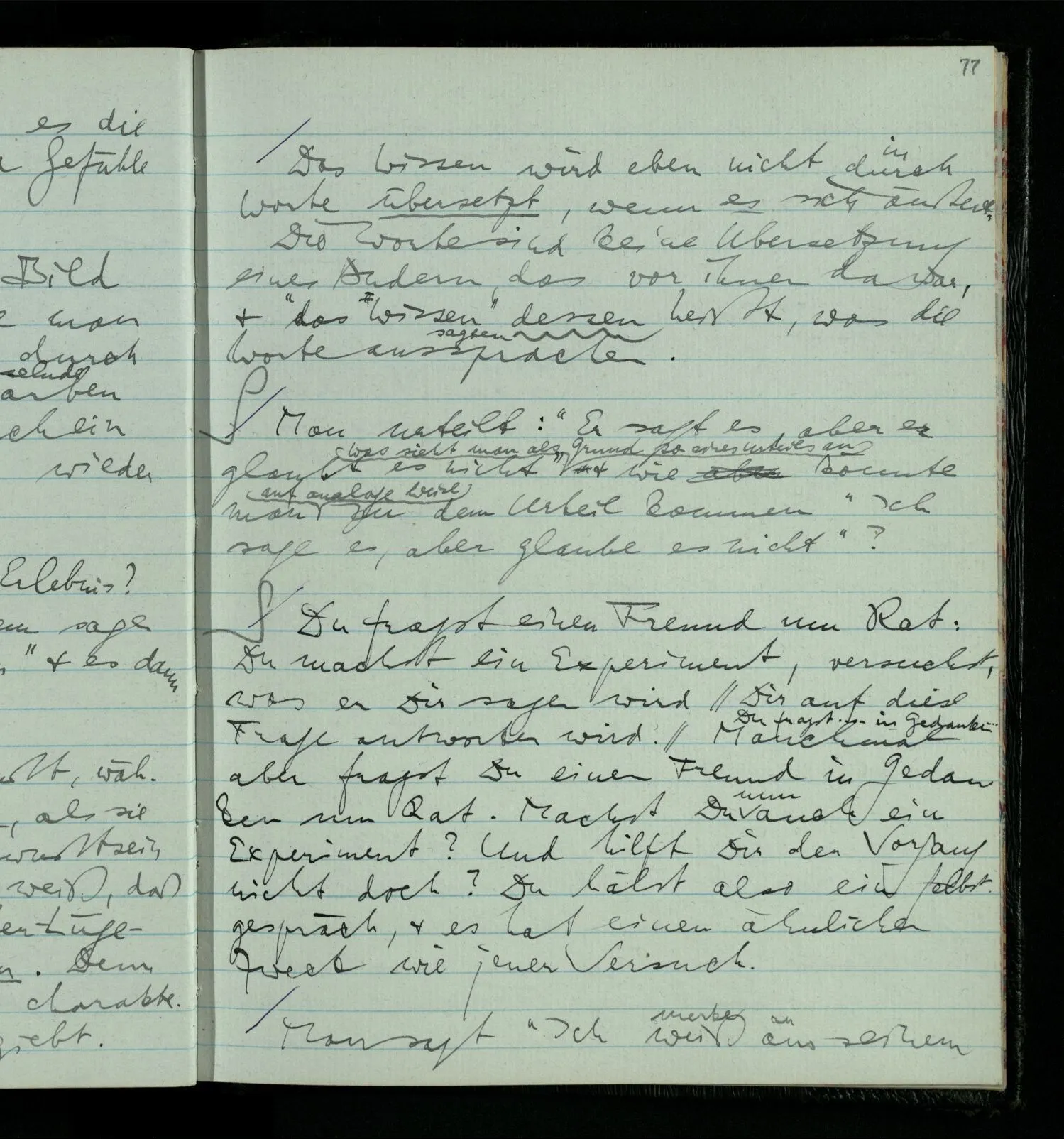 “Der Mensch ist im Stande, in voller Abgeschlossenheit mit sich selbst zu reden; in einer Isolierung, die weit vollkommener ist, als jede körperliche Isolierung.” Wie weiß ich, daß dem N. dies gegeben ist? – Weil er’s sagt & zuverlässig ist? – Und doch sagen wir: “Ich wüßte gerne, was er jetzt bei sich denkt”; ganz so, wie wir sagen könnten: “Ich wüßte gerne, was er jetzt in sein Notizbuch schreibt”. Ja, man könnte eben das sagen & es, sozusagen, als selbstverständlich ansehen, daß er bei sich das denkt, was er in’s