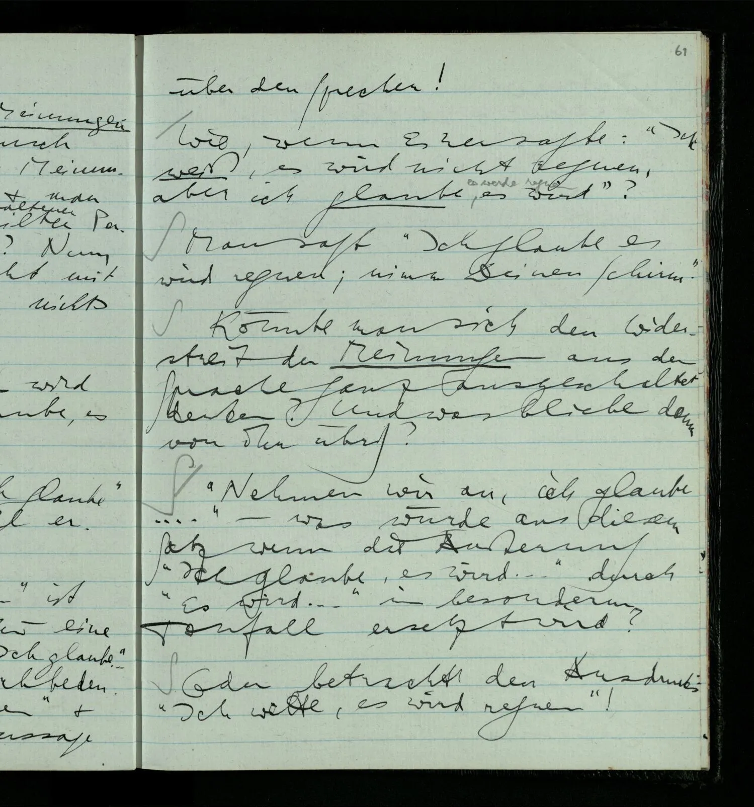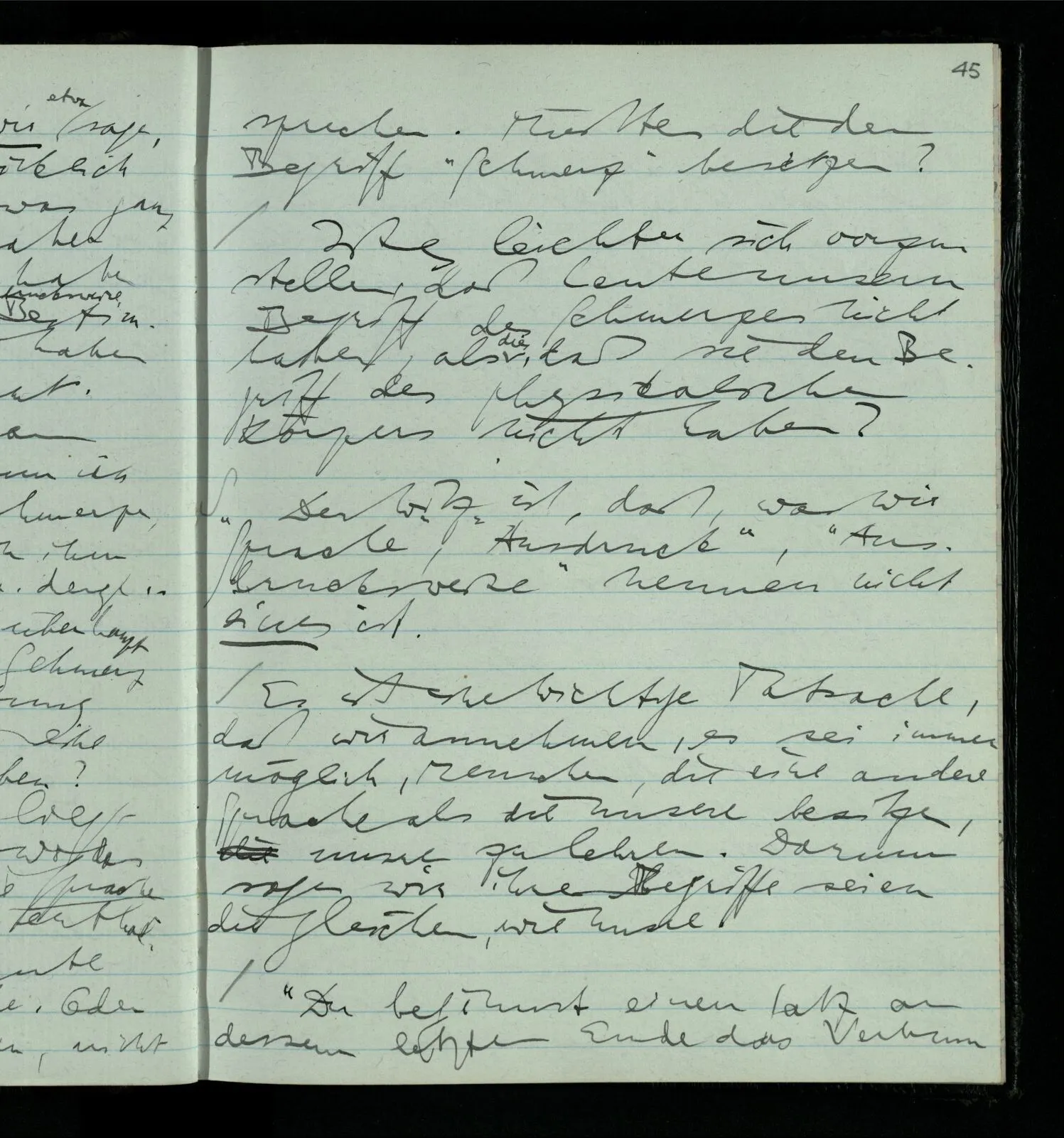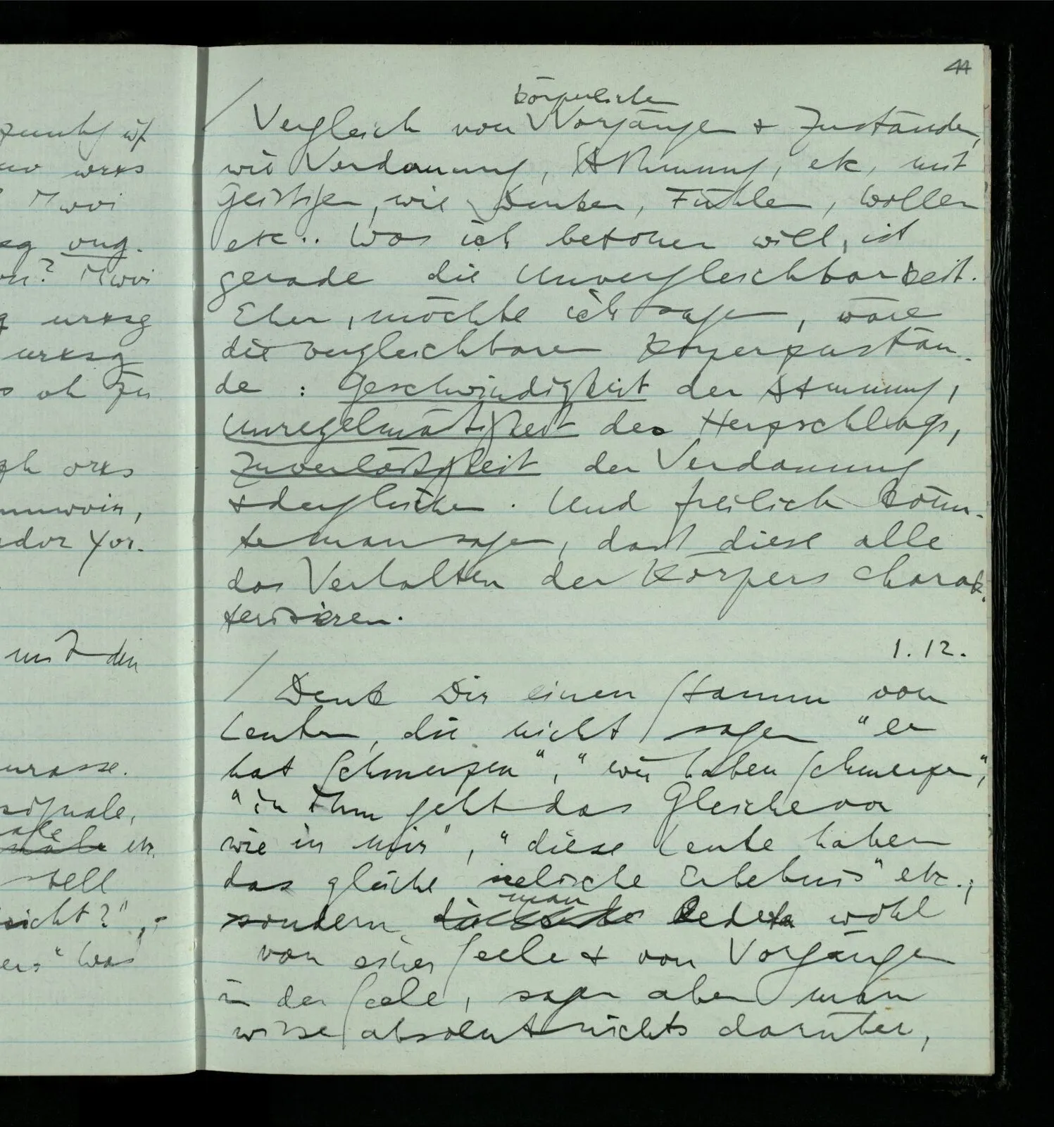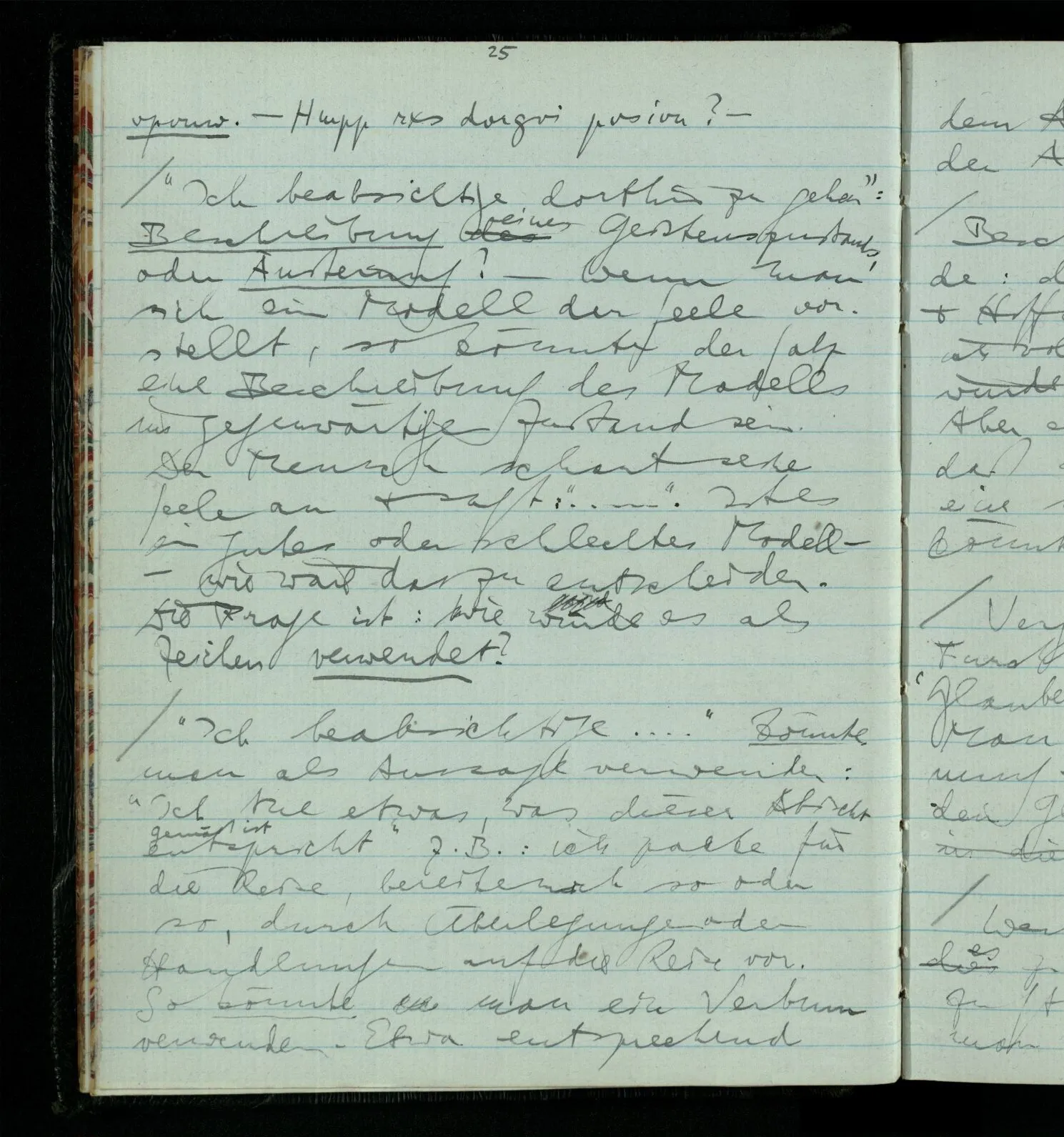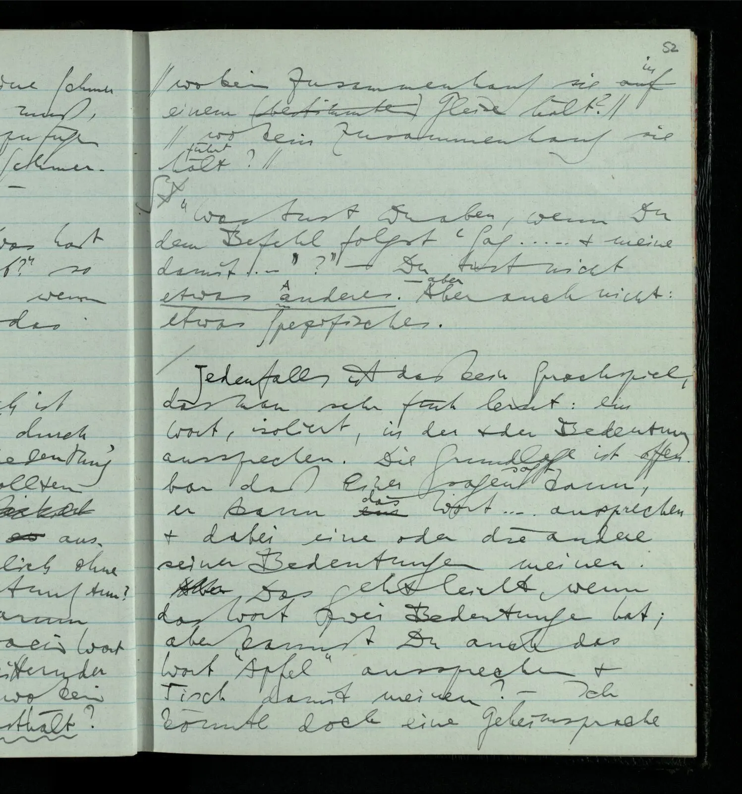 “Der Mensch ist im Stande, in voller Abgeschlossenheit mit sich selbst zu reden; in einer Isolierung, die weit vollkommener ist, als jede körperliche Isolierung.” Wie weiß ich, daß dem N. dies gegeben ist? – Weil er’s sagt & zuverlässig ist? – Und doch sagen wir: “Ich wüßte gerne, was er jetzt bei sich denkt”; ganz so, wie wir sagen könnten: “Ich wüßte gerne, was er jetzt in sein Notizbuch schreibt”. Ja, man könnte eben das sagen & es, sozusagen, als selbstverständlich ansehen, daß er bei sich das denkt, was er in’s