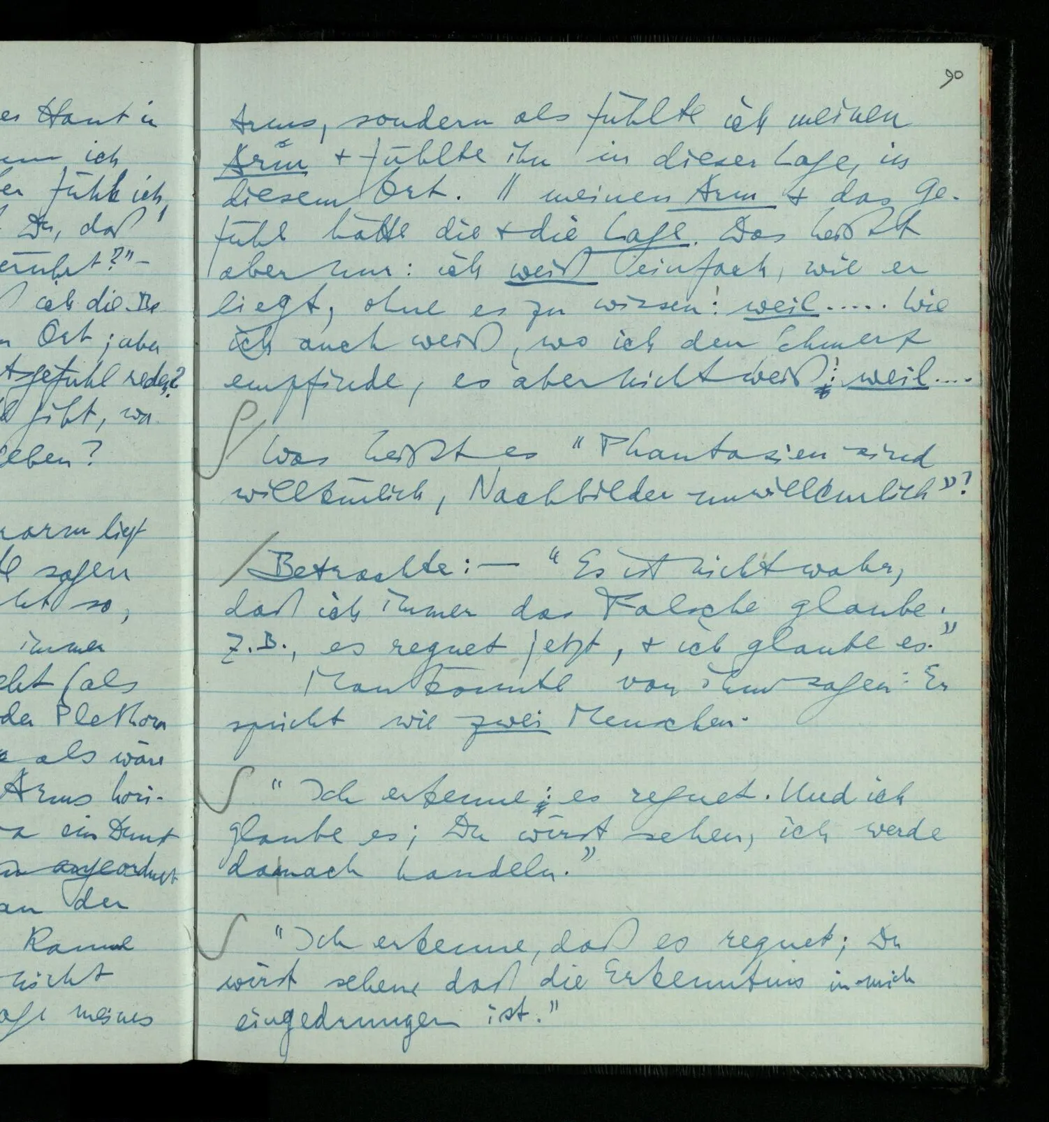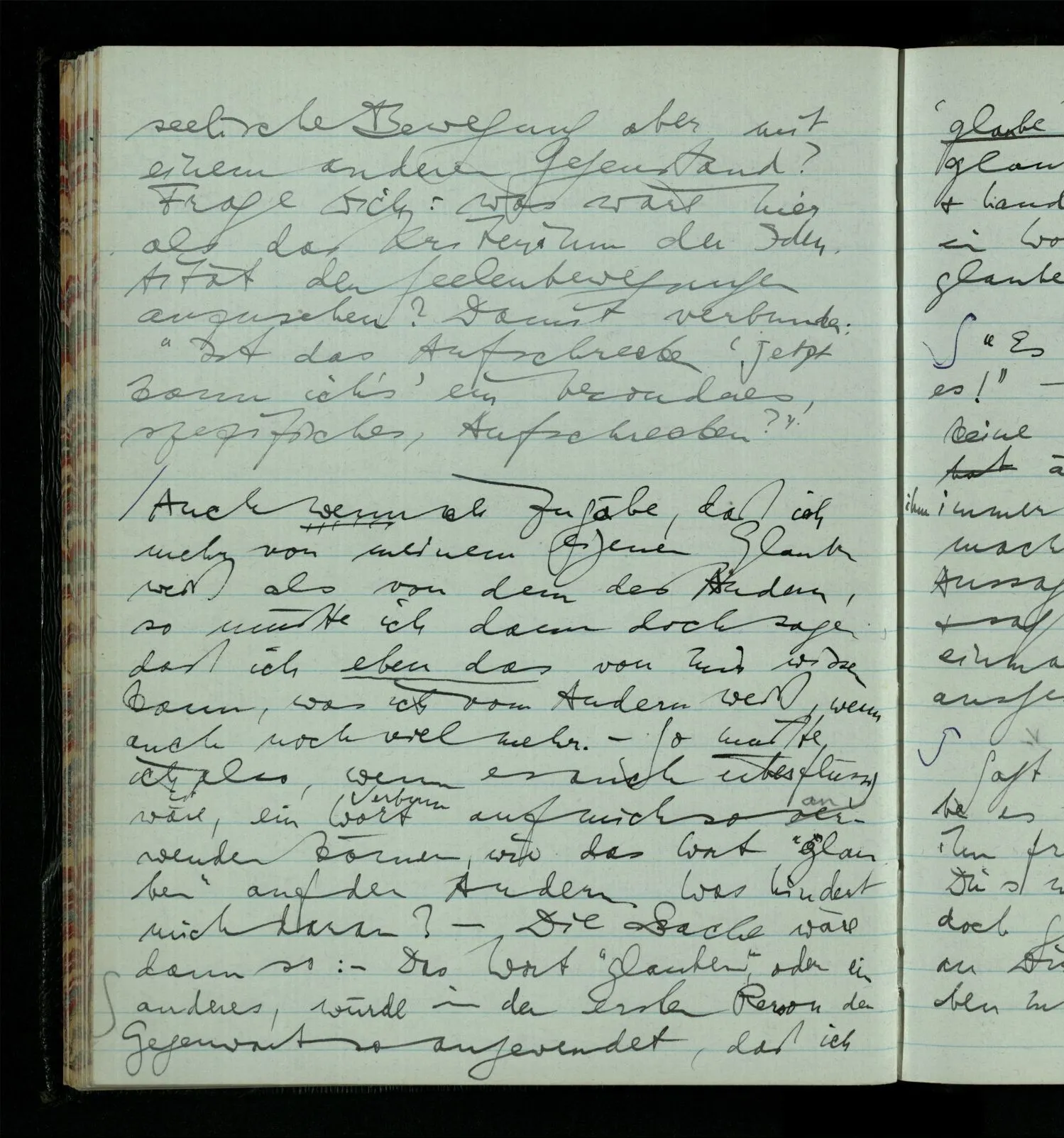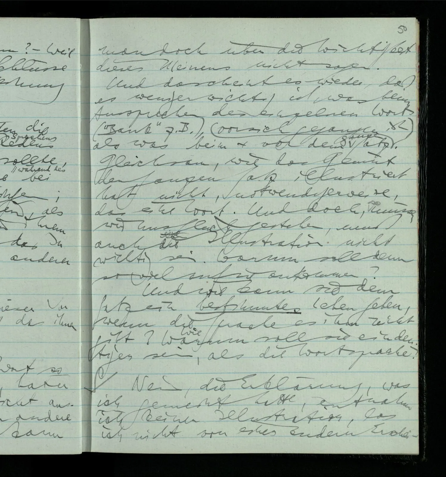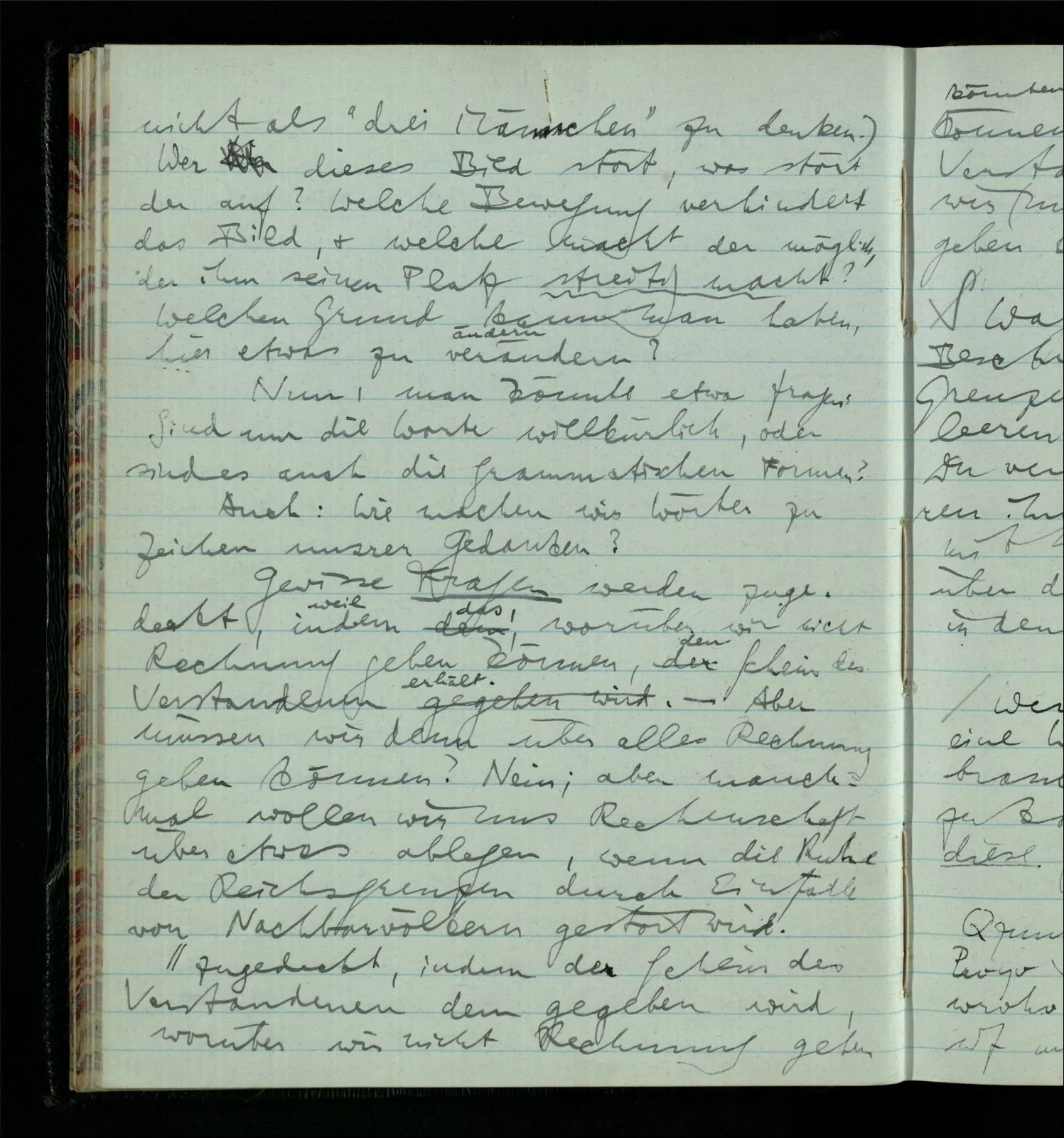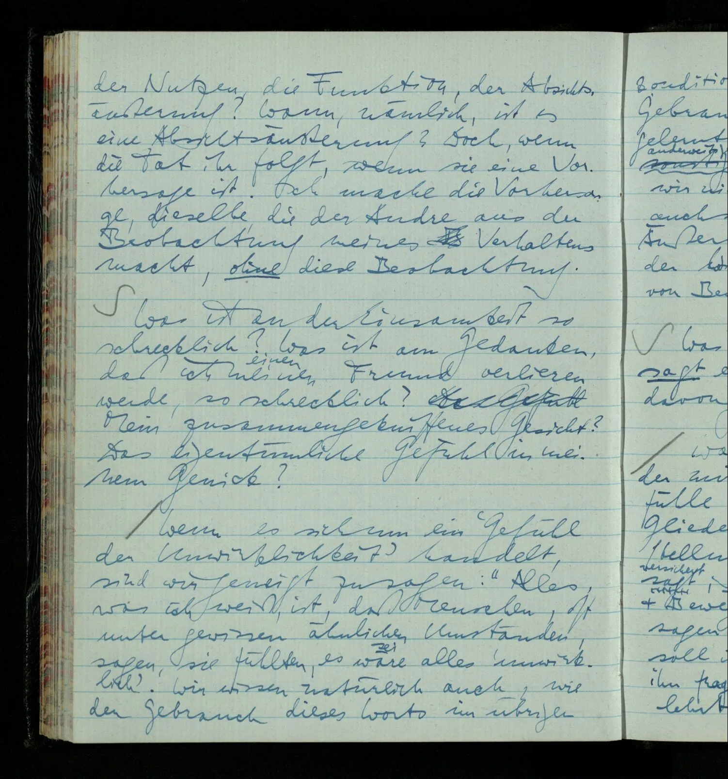 “Der Mensch ist im Stande, in voller Abgeschlossenheit mit sich selbst zu reden; in einer Isolierung, die weit vollkommener ist, als jede körperliche Isolierung.” Wie weiß ich, daß dem N. dies gegeben ist? – Weil er’s sagt & zuverlässig ist? – Und doch sagen wir: “Ich wüßte gerne, was er jetzt bei sich denkt”; ganz so, wie wir sagen könnten: “Ich wüßte gerne, was er jetzt in sein Notizbuch schreibt”. Ja, man könnte eben das sagen & es, sozusagen, als selbstverständlich ansehen, daß er bei sich das denkt, was er in’s