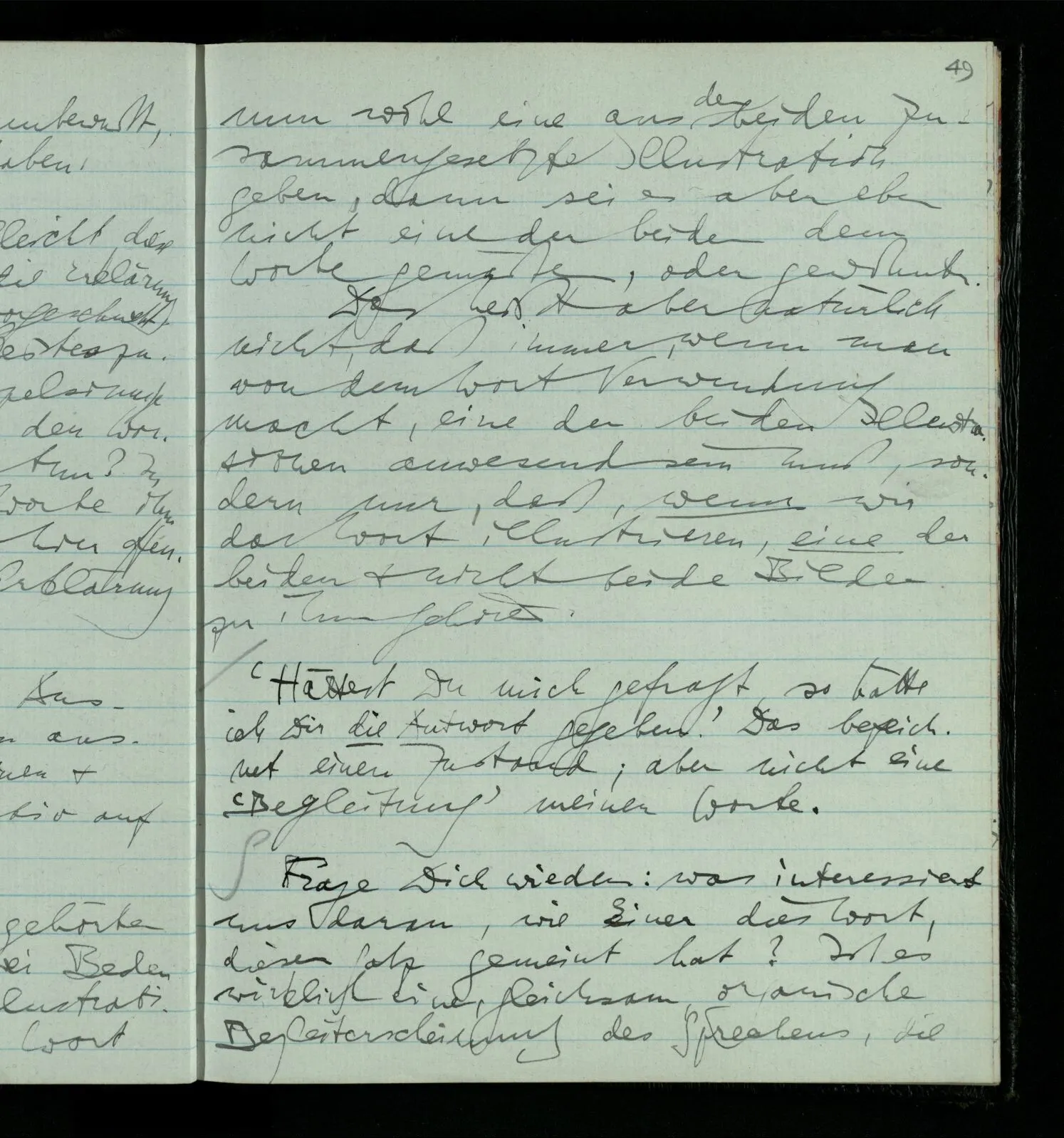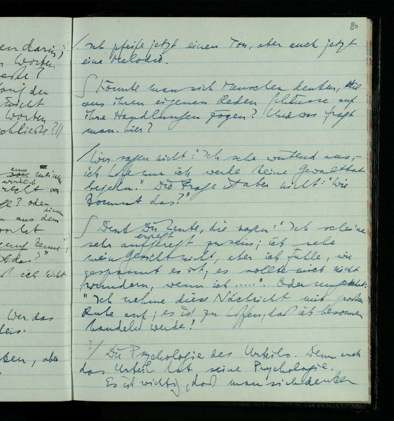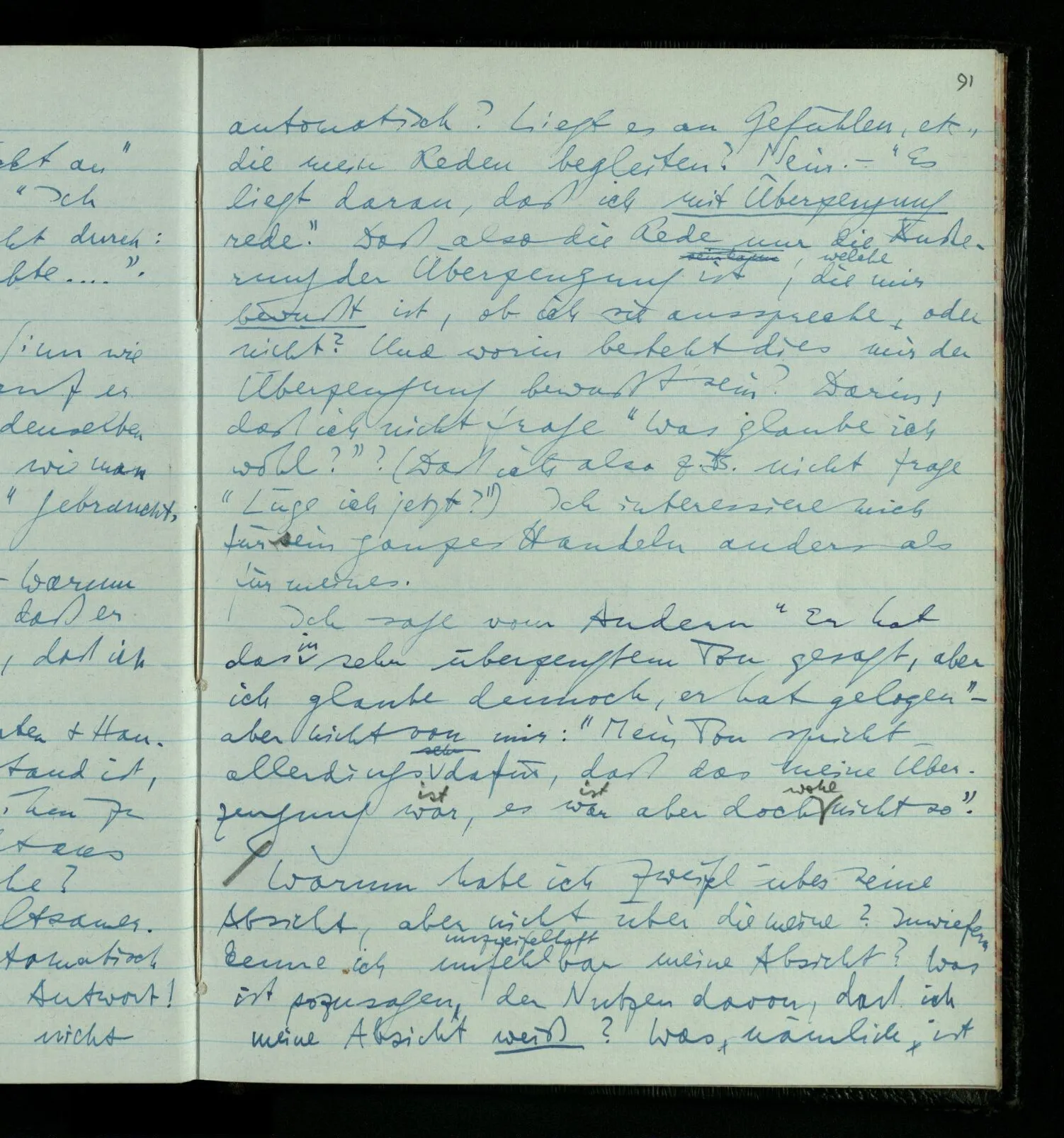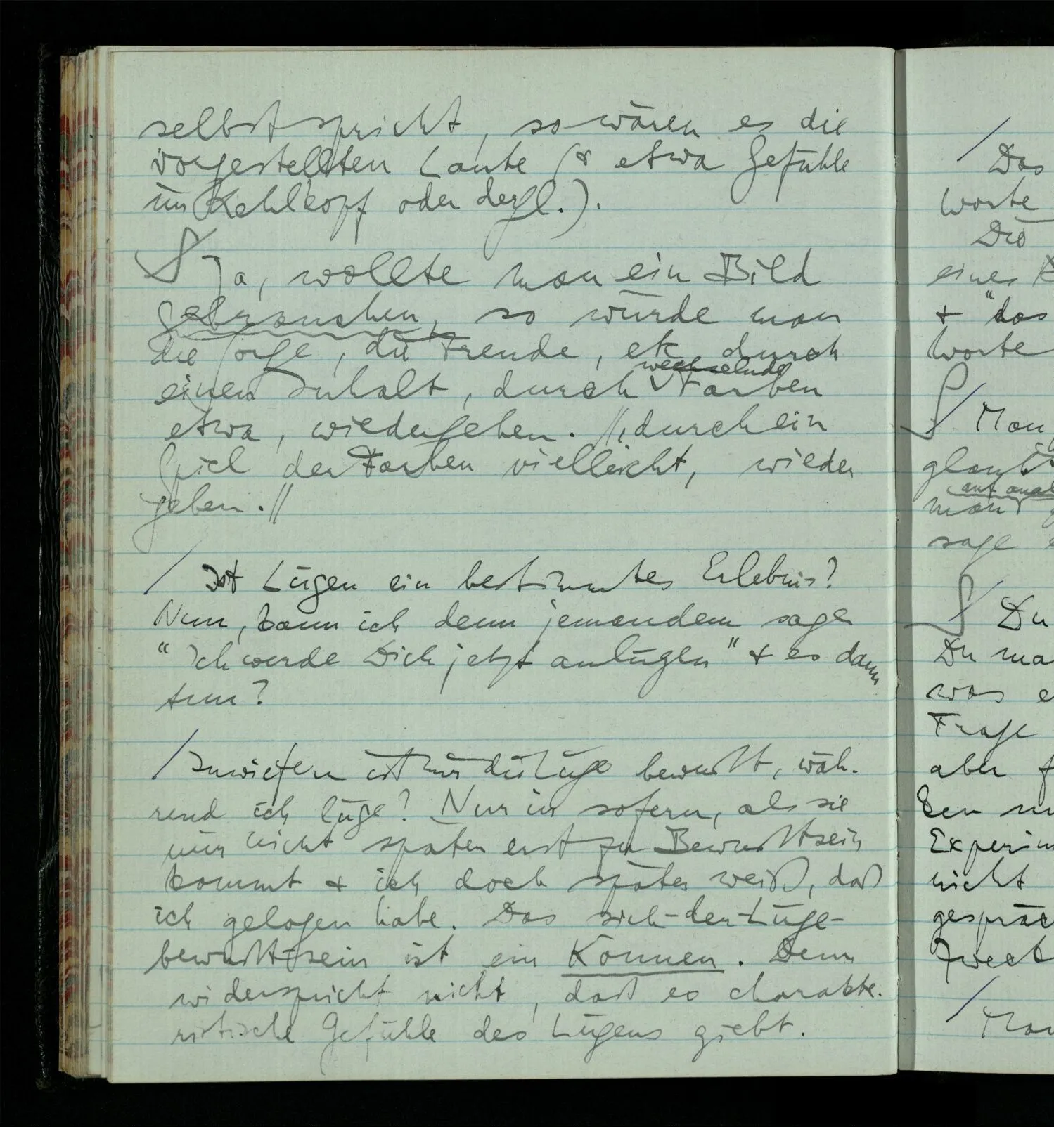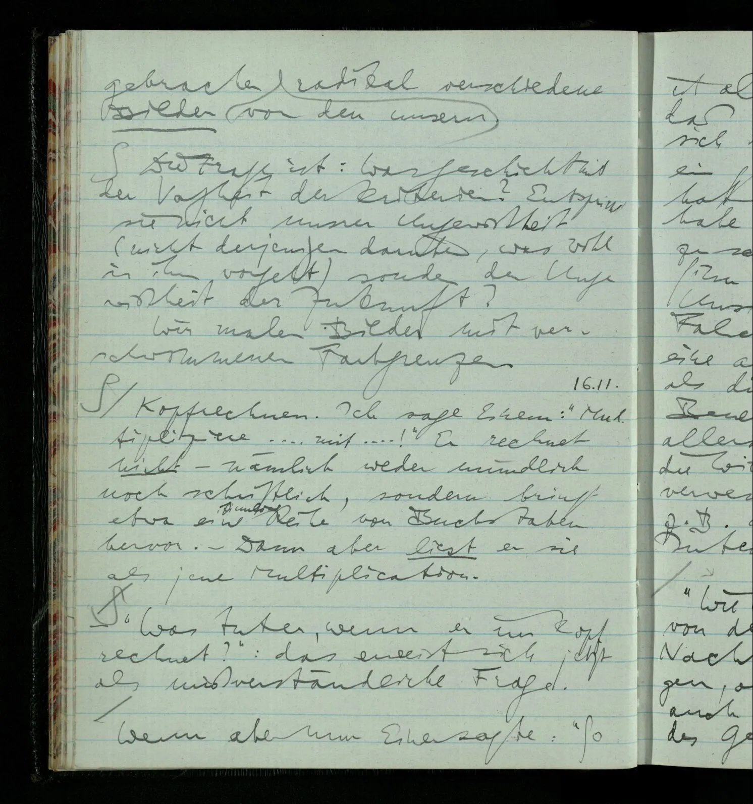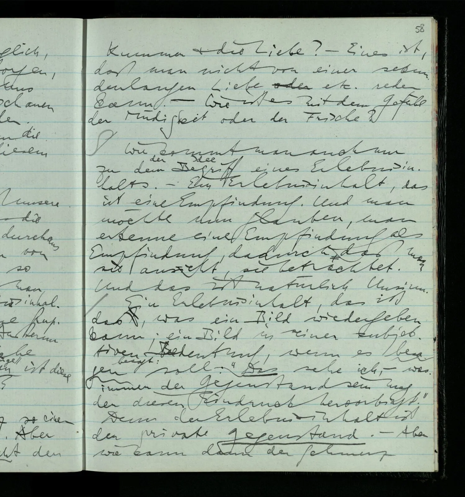 “Der Mensch ist im Stande, in voller Abgeschlossenheit mit sich selbst zu reden; in einer Isolierung, die weit vollkommener ist, als jede körperliche Isolierung.” Wie weiß ich, daß dem N. dies gegeben ist? – Weil er’s sagt & zuverlässig ist? – Und doch sagen wir: “Ich wüßte gerne, was er jetzt bei sich denkt”; ganz so, wie wir sagen könnten: “Ich wüßte gerne, was er jetzt in sein Notizbuch schreibt”. Ja, man könnte eben das sagen & es, sozusagen, als selbstverständlich ansehen, daß er bei sich das denkt, was er in’s