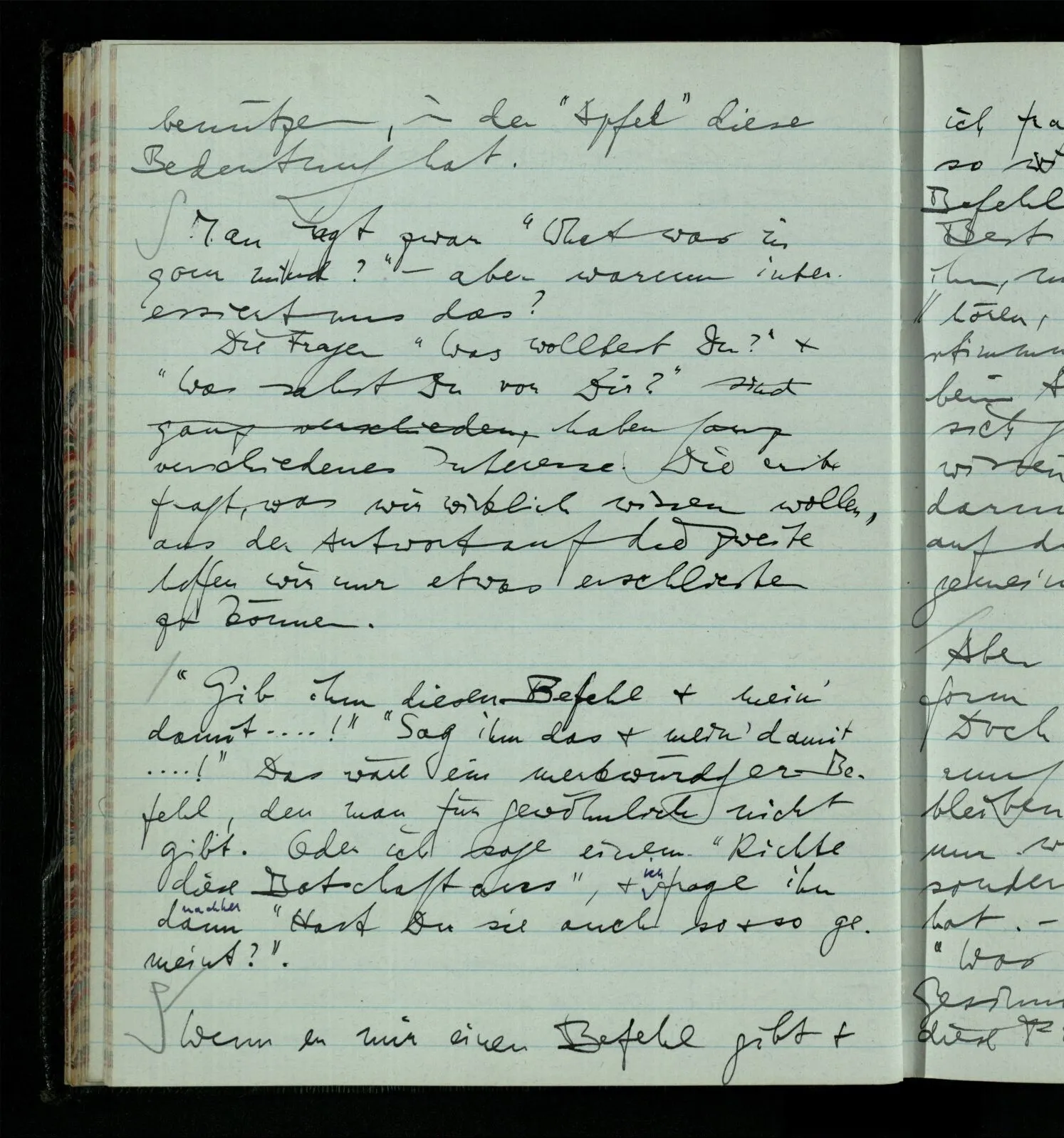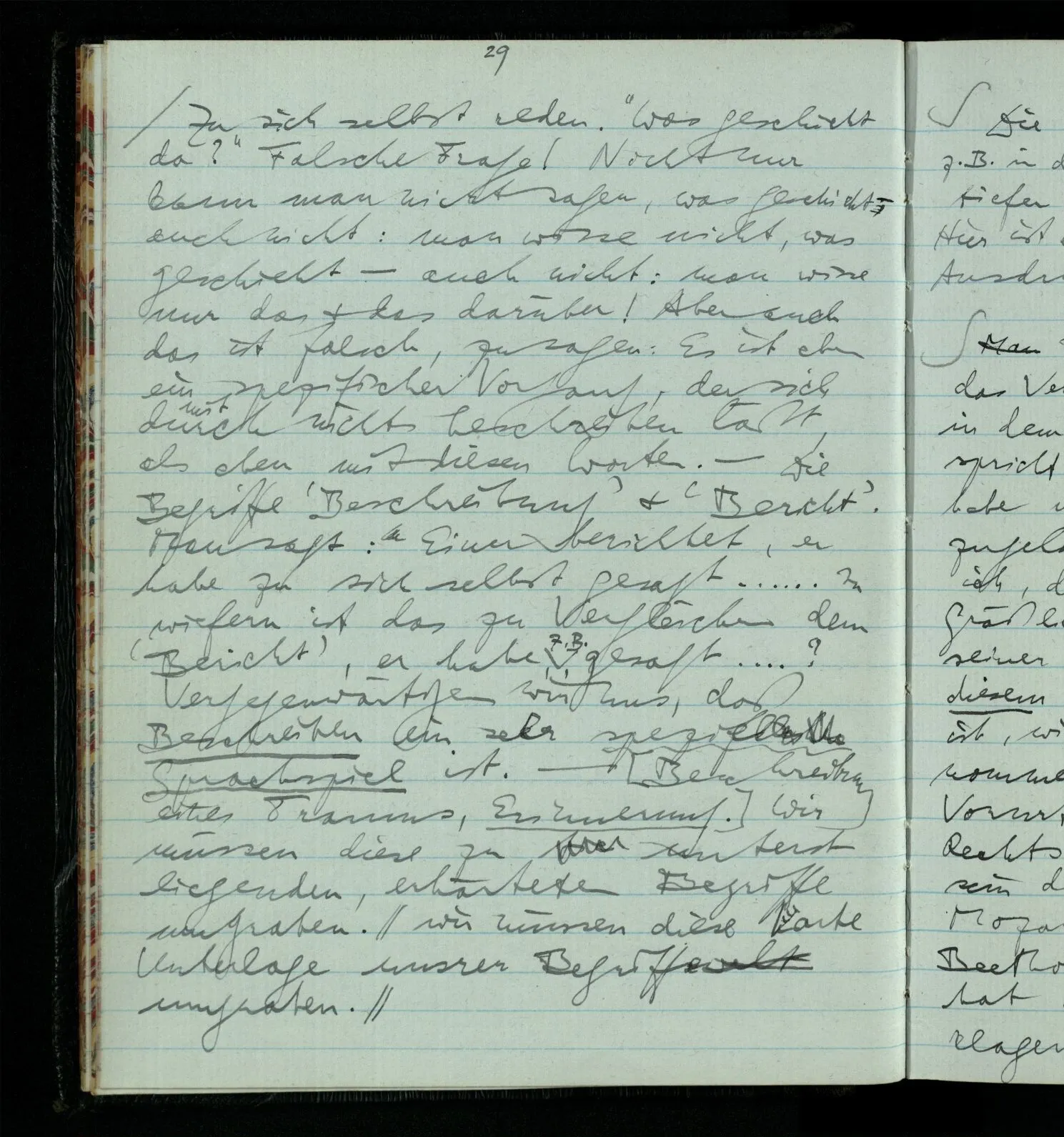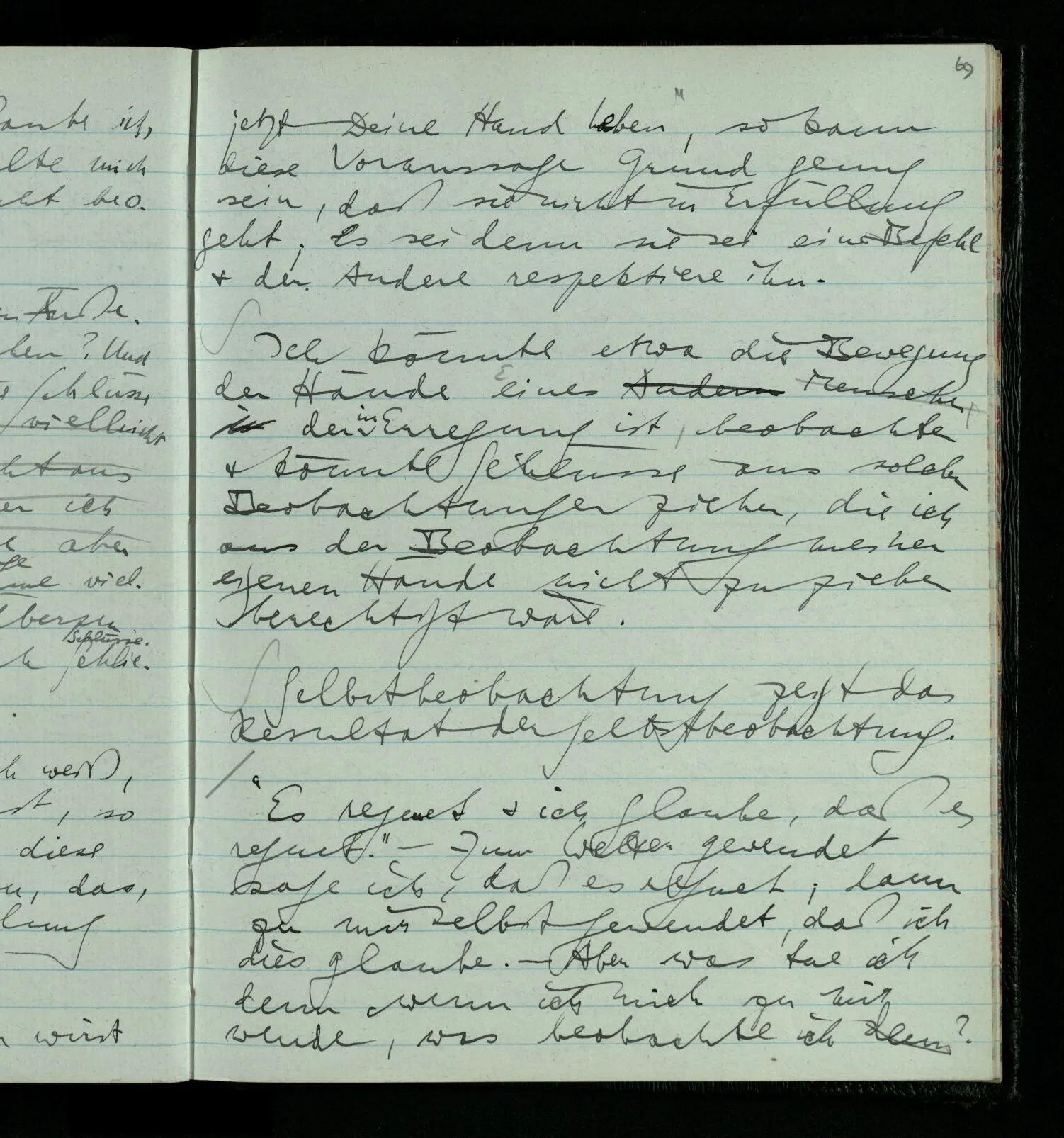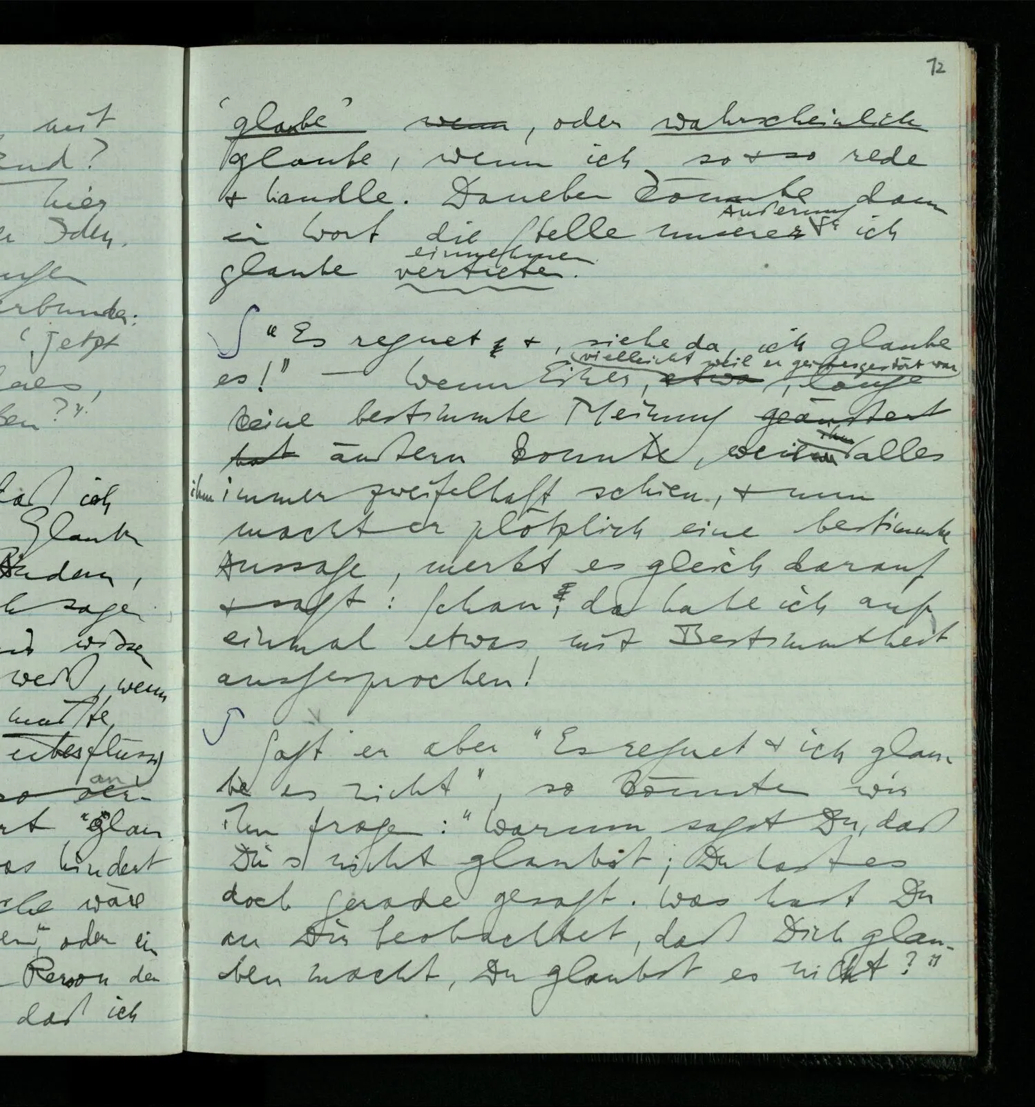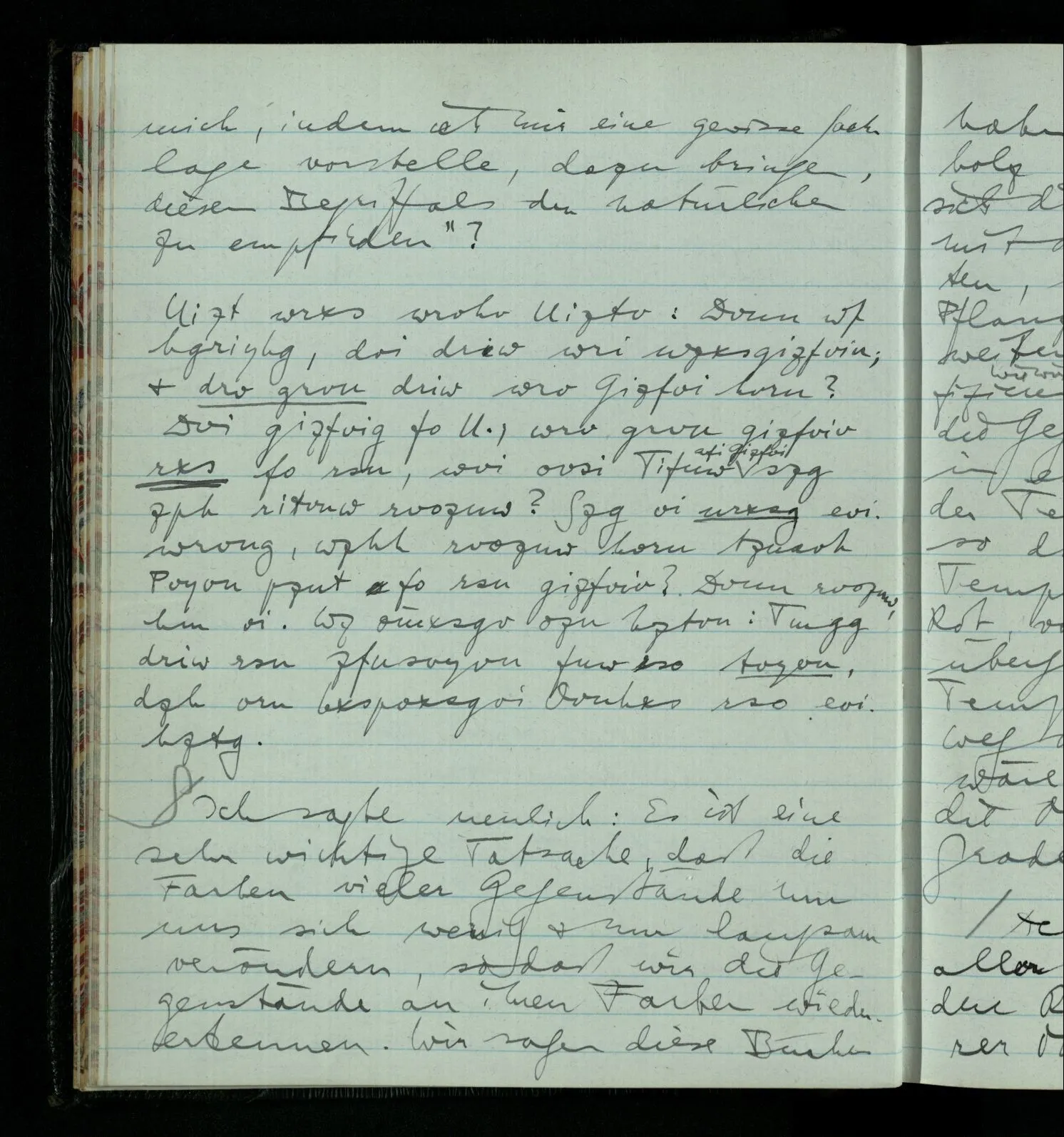 “Der Mensch ist im Stande, in voller Abgeschlossenheit mit sich selbst zu reden; in einer Isolierung, die weit vollkommener ist, als jede körperliche Isolierung.” Wie weiß ich, daß dem N. dies gegeben ist? – Weil er’s sagt & zuverlässig ist? – Und doch sagen wir: “Ich wüßte gerne, was er jetzt bei sich denkt”; ganz so, wie wir sagen könnten: “Ich wüßte gerne, was er jetzt in sein Notizbuch schreibt”. Ja, man könnte eben das sagen & es, sozusagen, als selbstverständlich ansehen, daß er bei sich das denkt, was er in’s