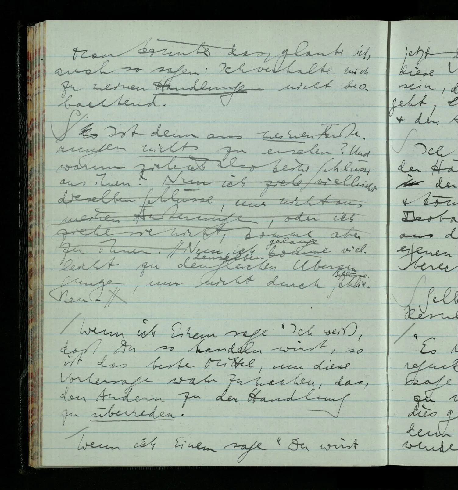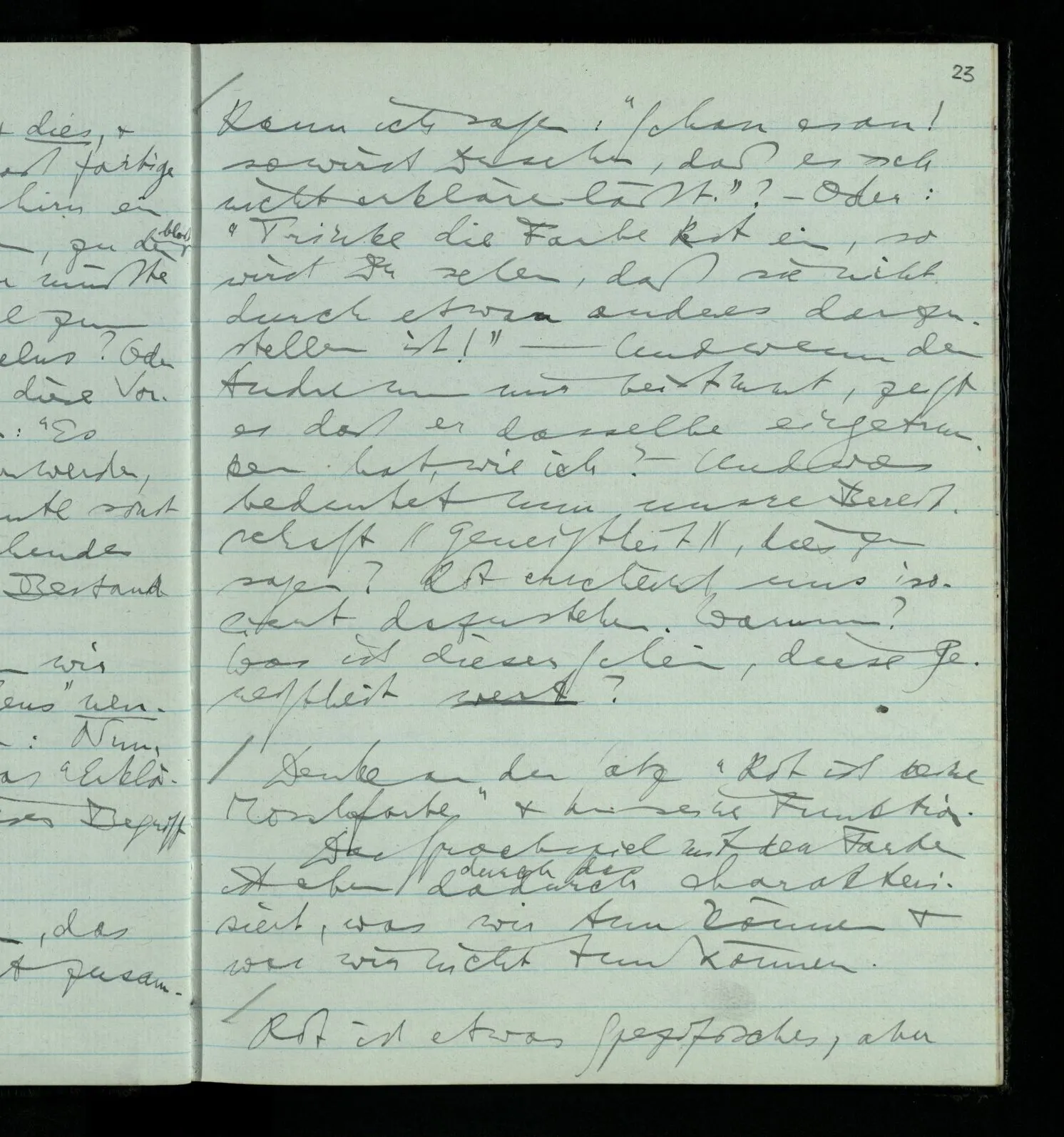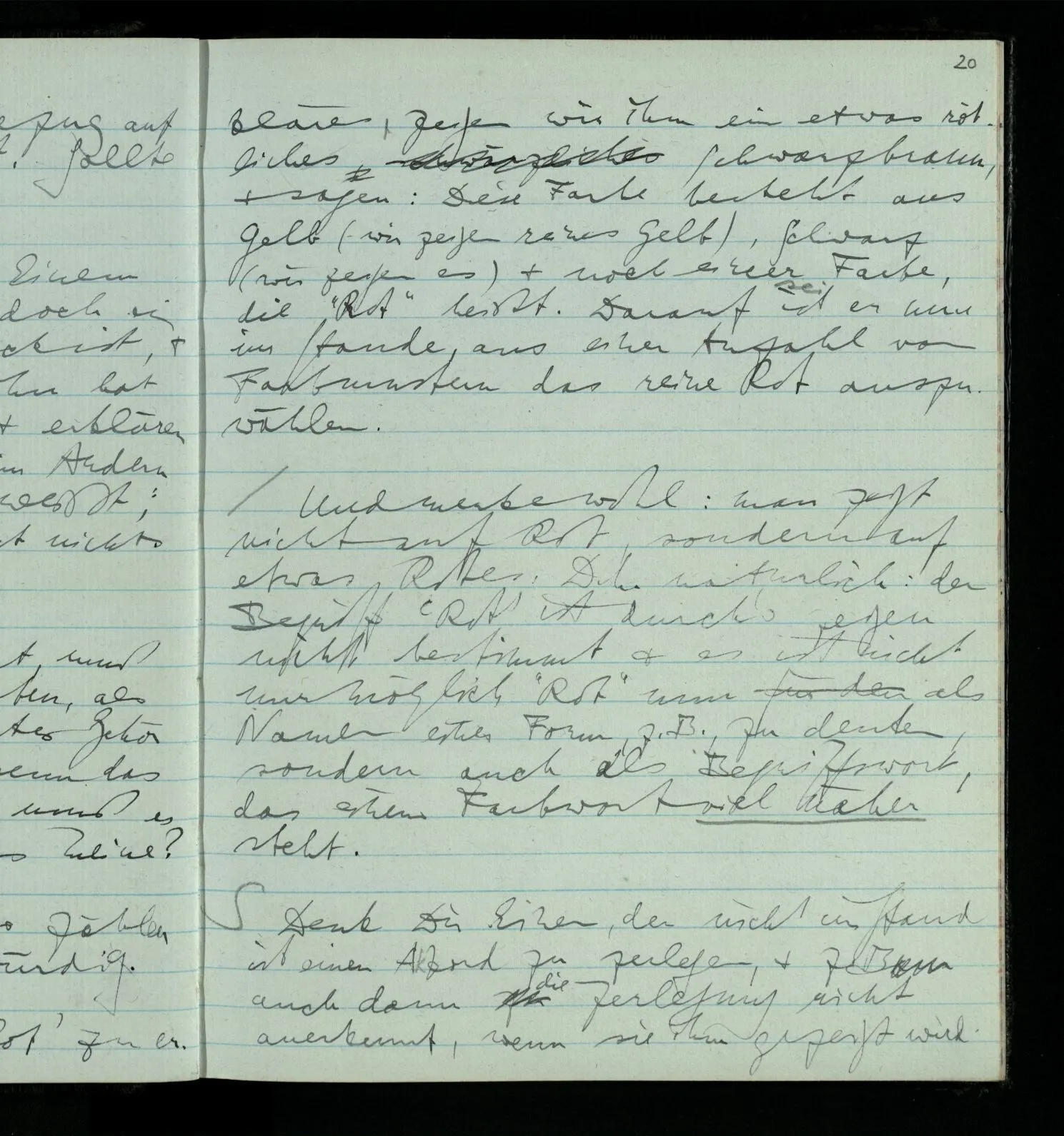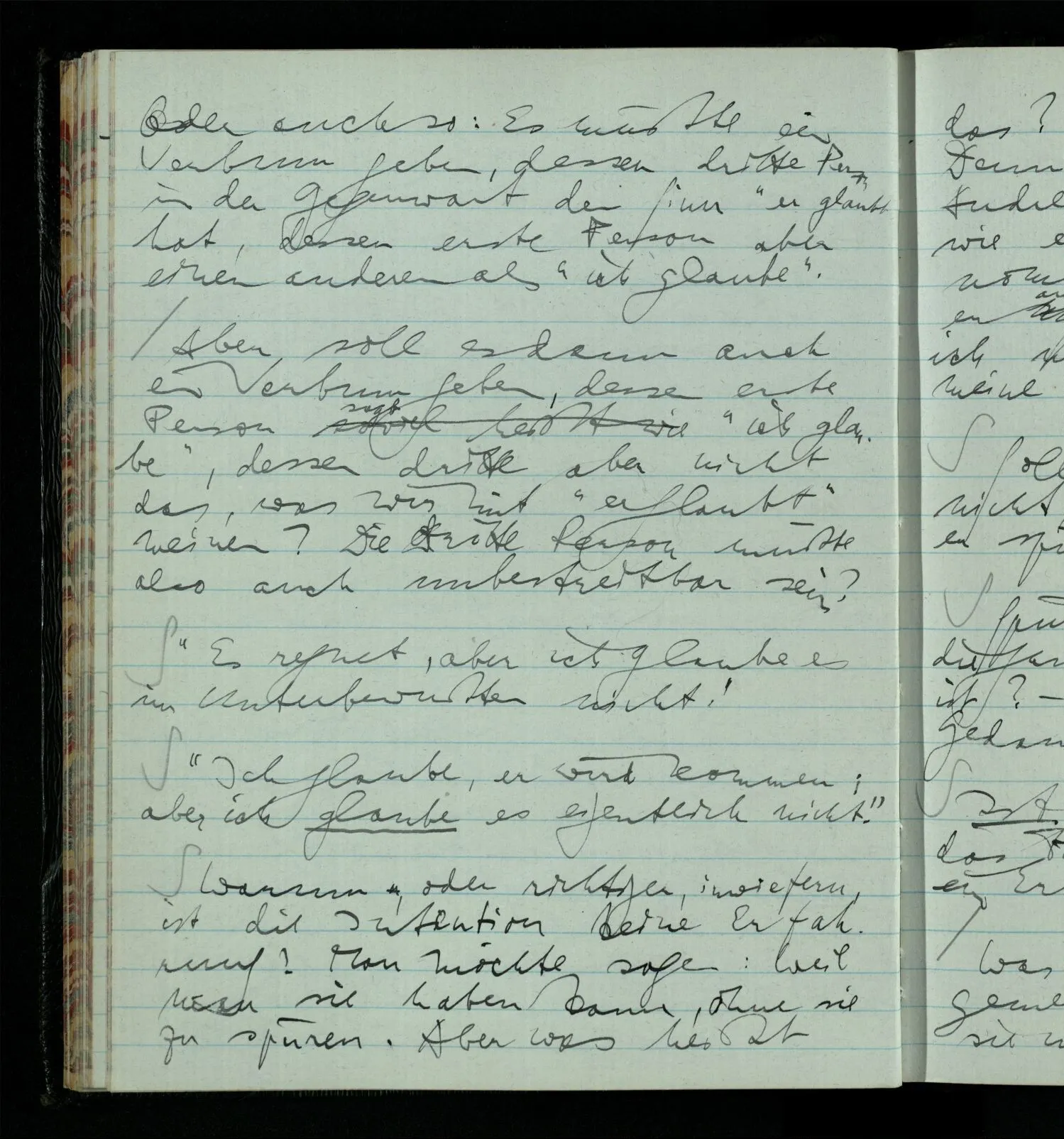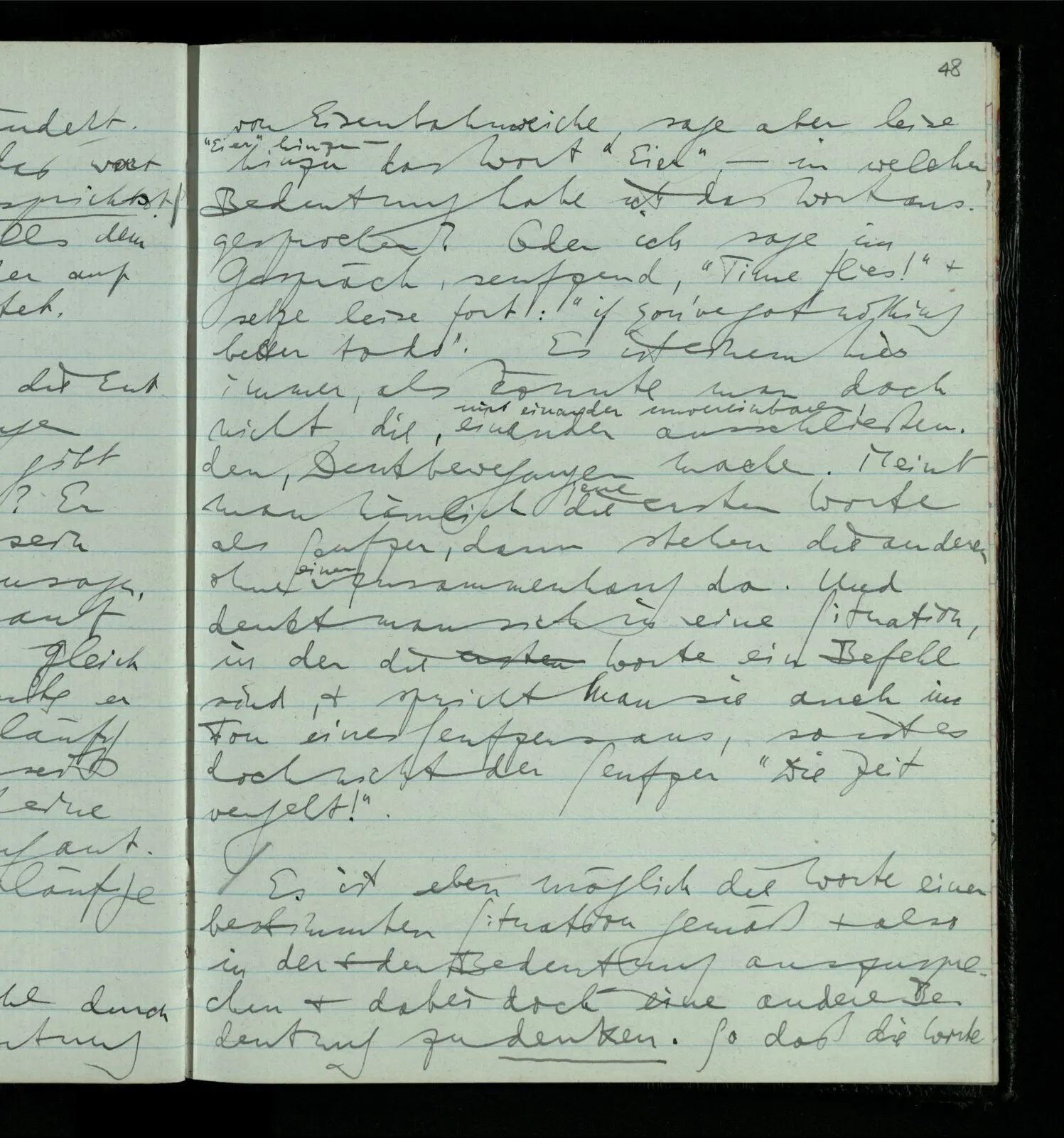 “Der Mensch ist im Stande, in voller Abgeschlossenheit mit sich selbst zu reden; in einer Isolierung, die weit vollkommener ist, als jede körperliche Isolierung.” Wie weiß ich, daß dem N. dies gegeben ist? – Weil er’s sagt & zuverlässig ist? – Und doch sagen wir: “Ich wüßte gerne, was er jetzt bei sich denkt”; ganz so, wie wir sagen könnten: “Ich wüßte gerne, was er jetzt in sein Notizbuch schreibt”. Ja, man könnte eben das sagen & es, sozusagen, als selbstverständlich ansehen, daß er bei sich das denkt, was er in’s