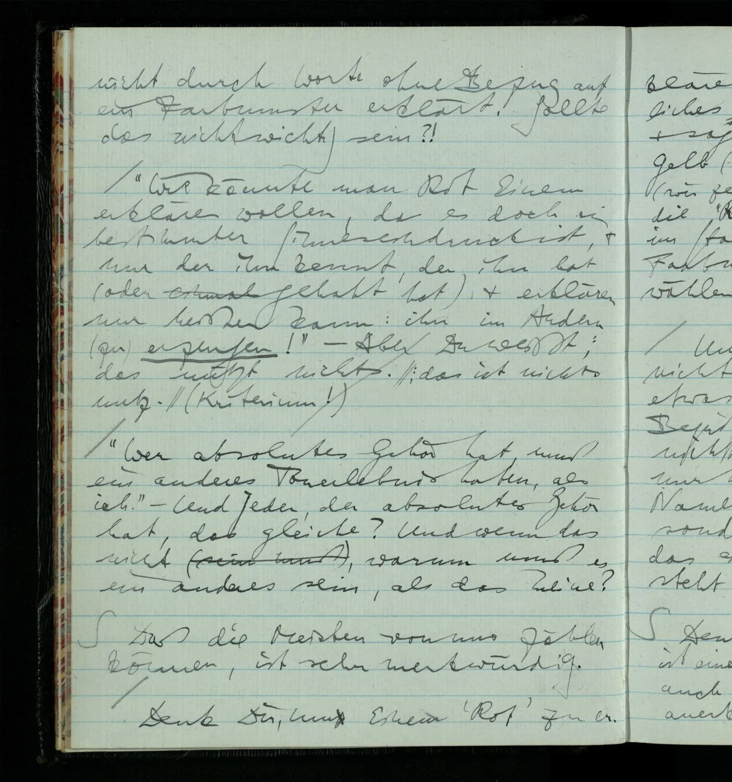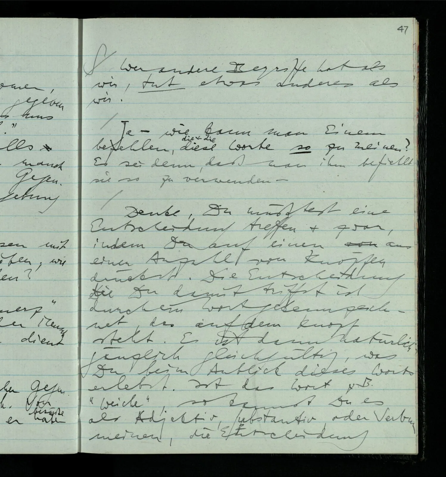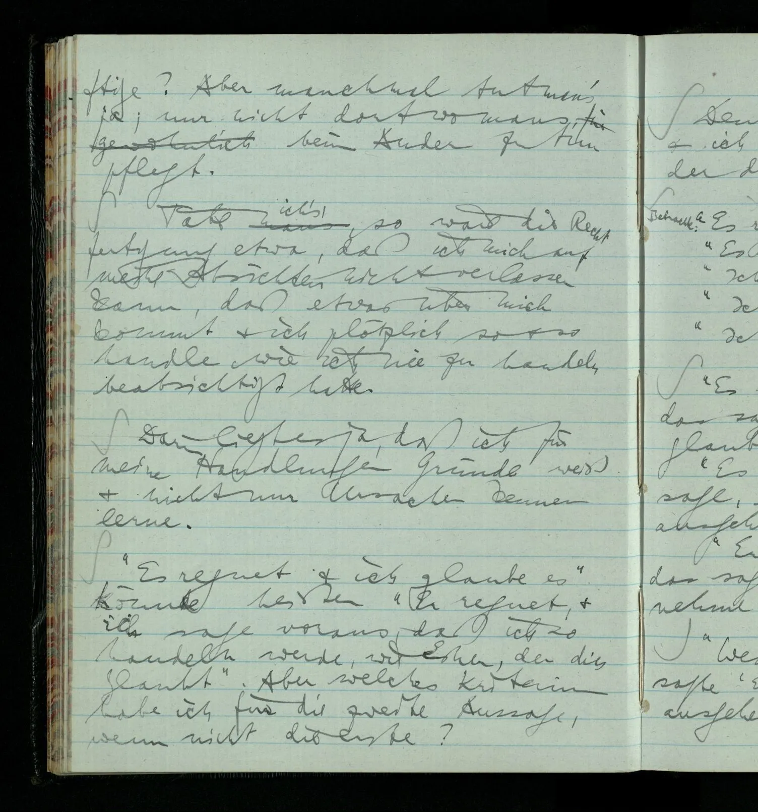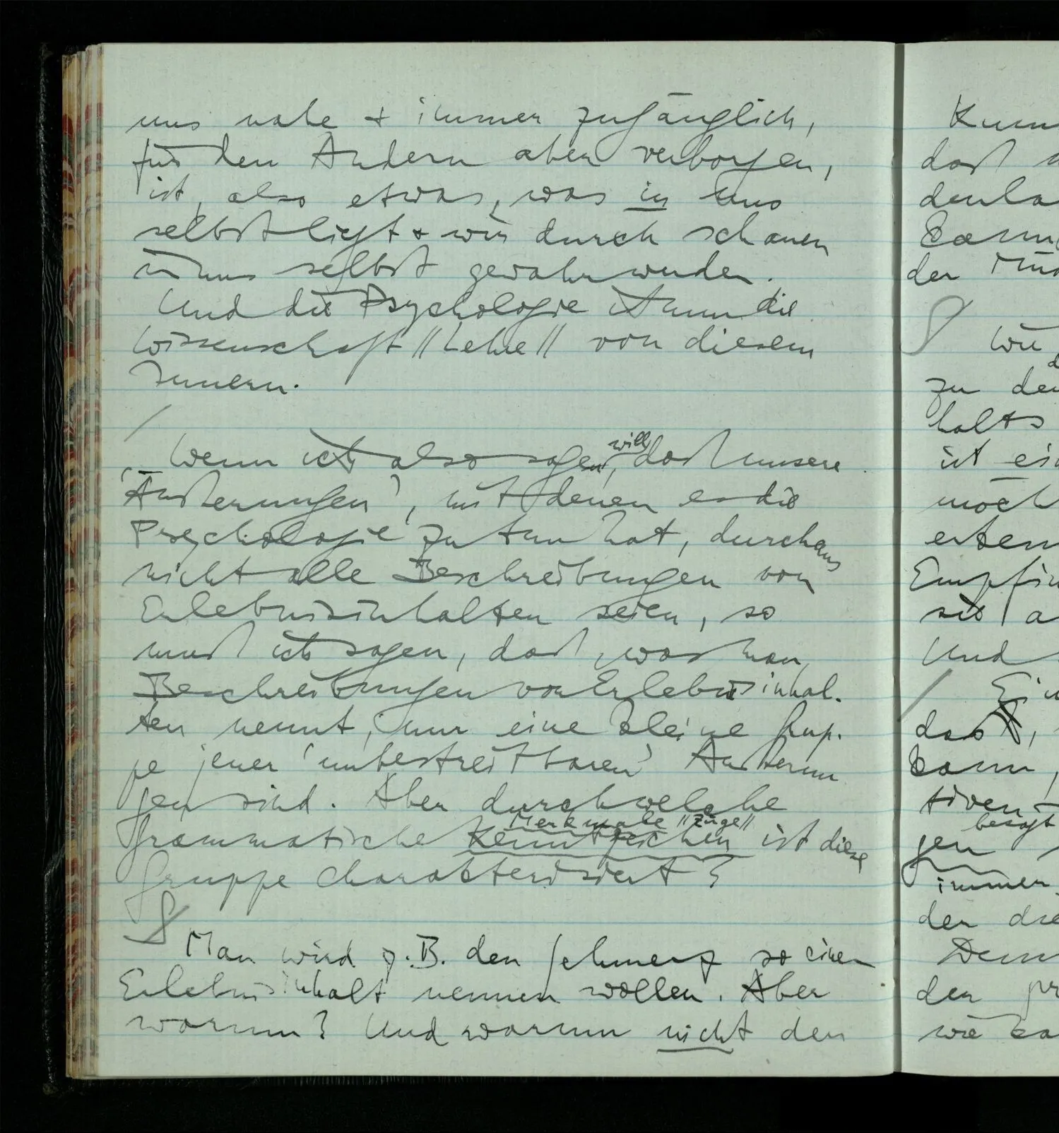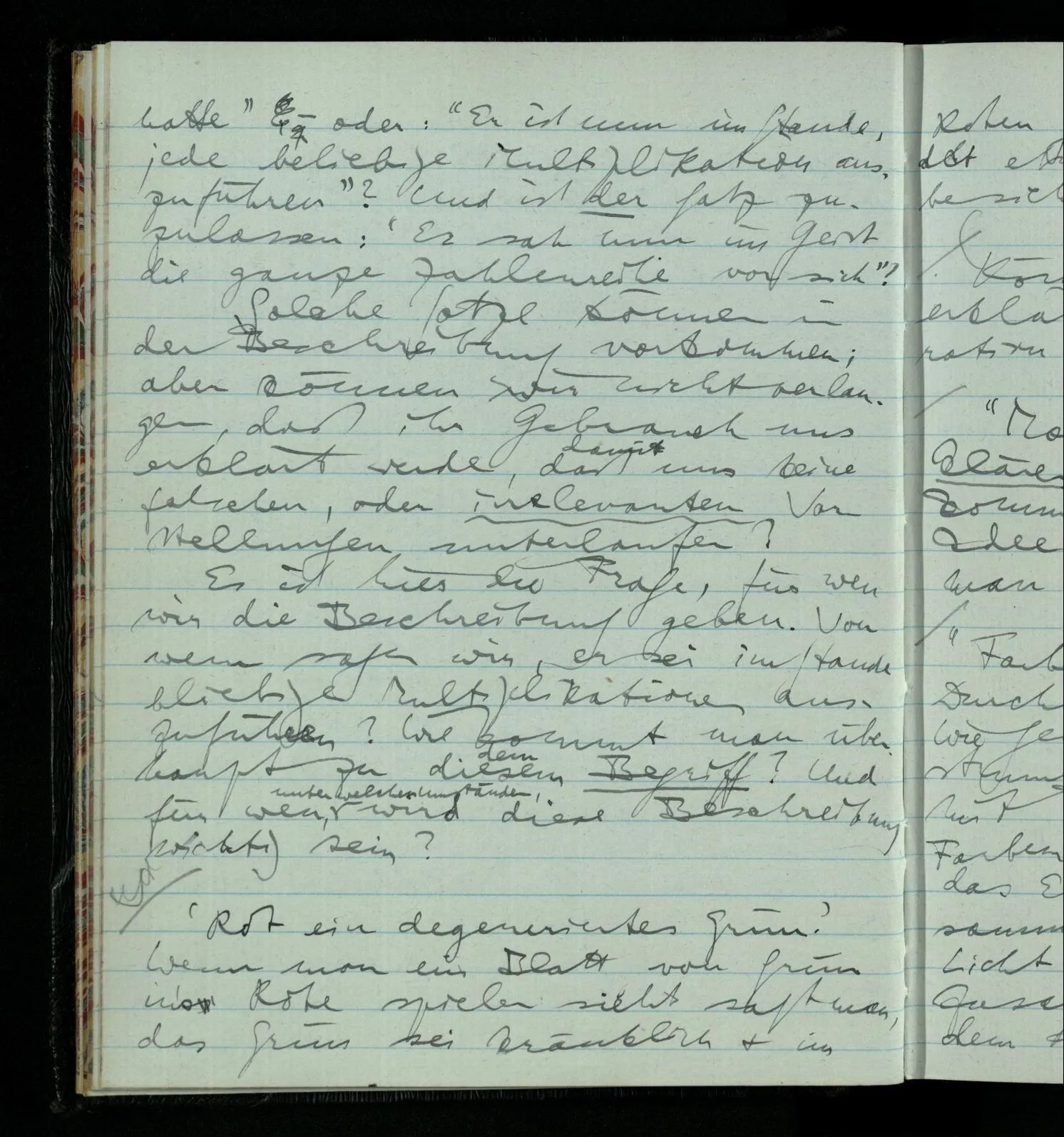 “Der Mensch ist im Stande, in voller Abgeschlossenheit mit sich selbst zu reden; in einer Isolierung, die weit vollkommener ist, als jede körperliche Isolierung.” Wie weiß ich, daß dem N. dies gegeben ist? – Weil er’s sagt & zuverlässig ist? – Und doch sagen wir: “Ich wüßte gerne, was er jetzt bei sich denkt”; ganz so, wie wir sagen könnten: “Ich wüßte gerne, was er jetzt in sein Notizbuch schreibt”. Ja, man könnte eben das sagen & es, sozusagen, als selbstverständlich ansehen, daß er bei sich das denkt, was er in’s