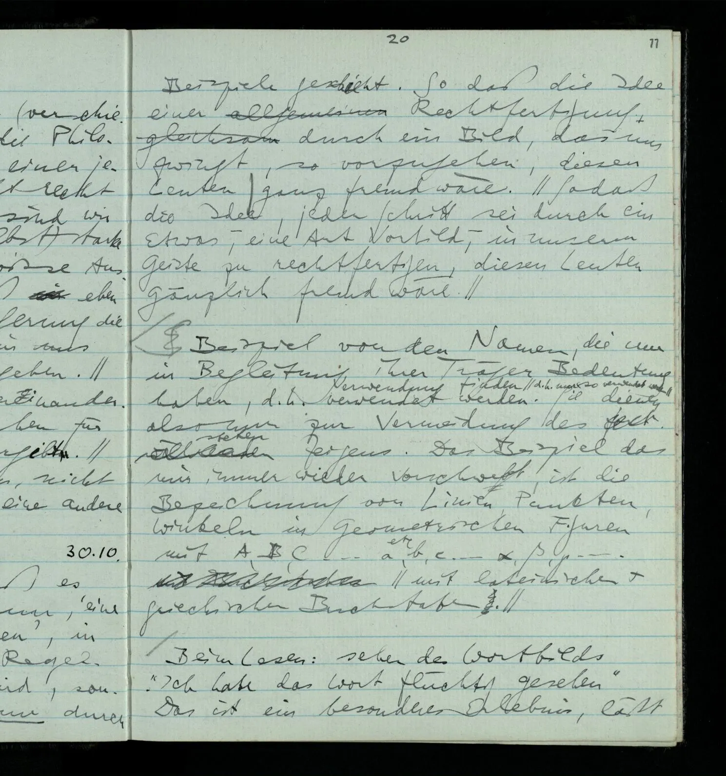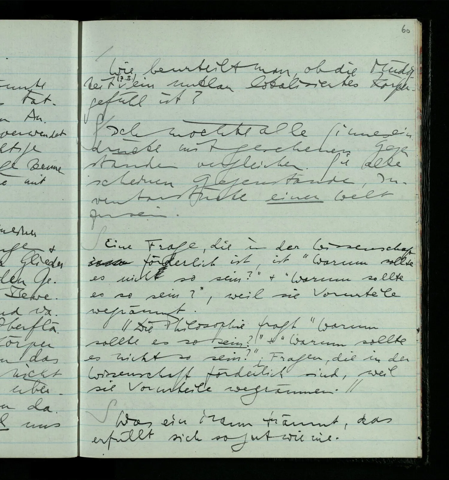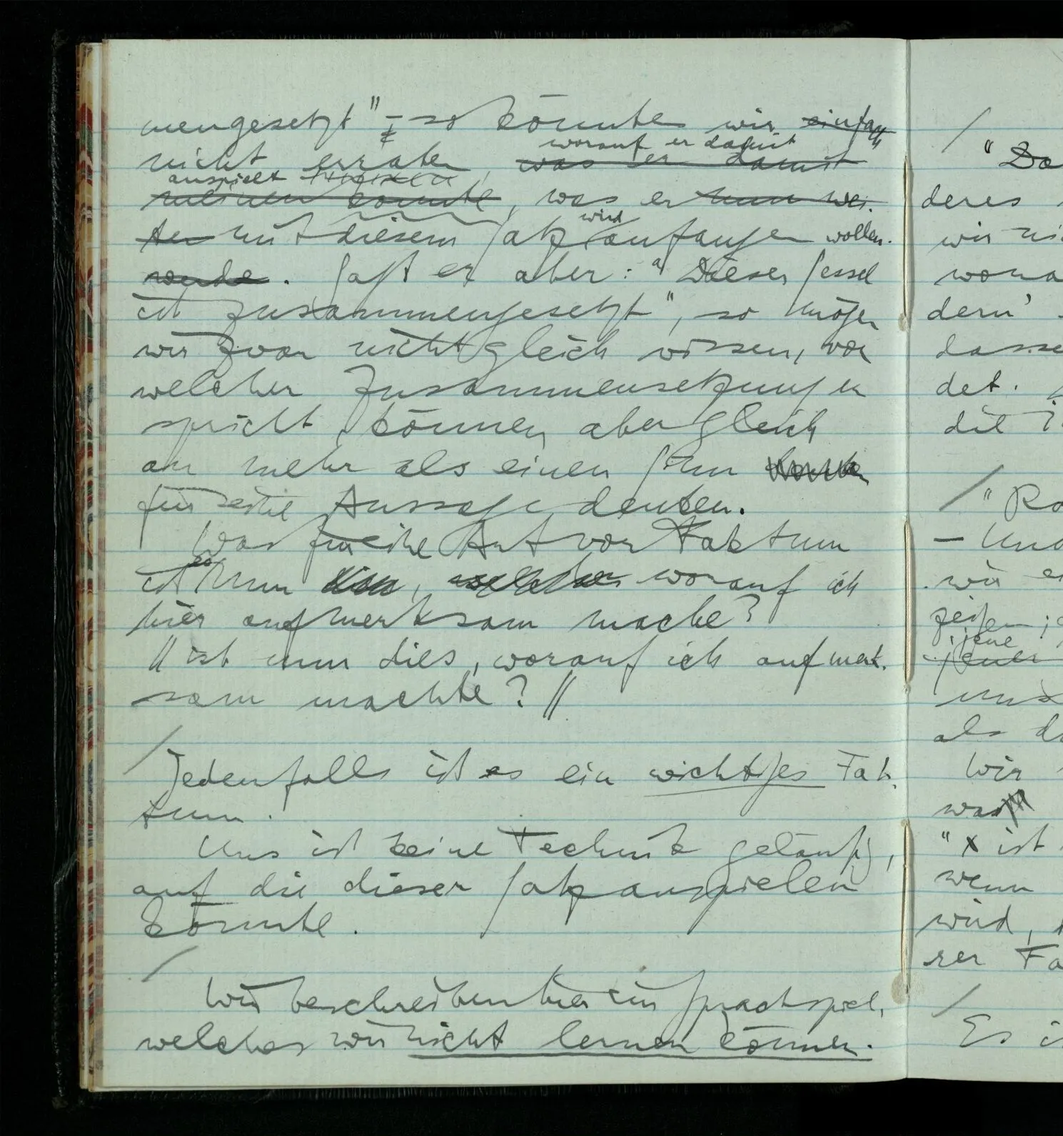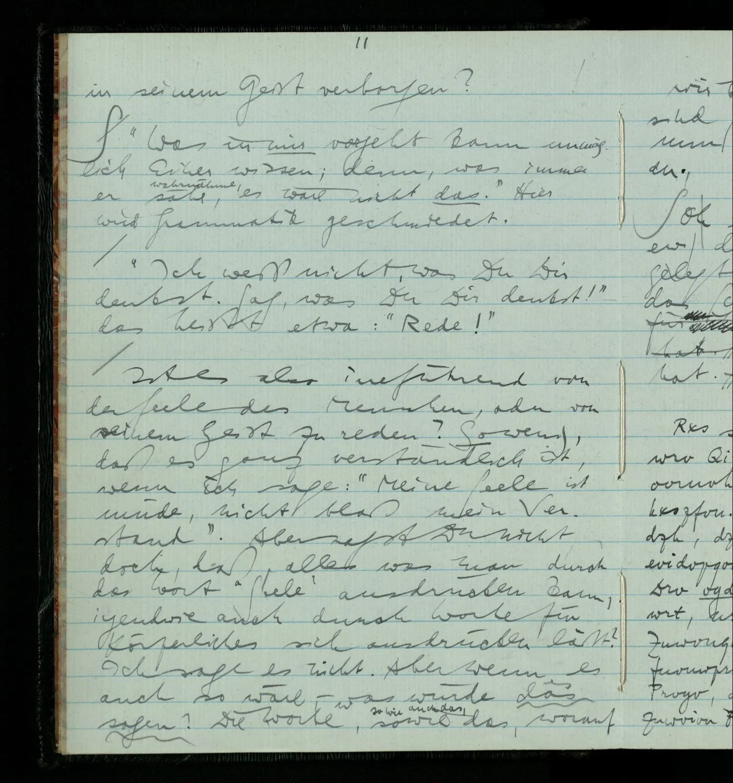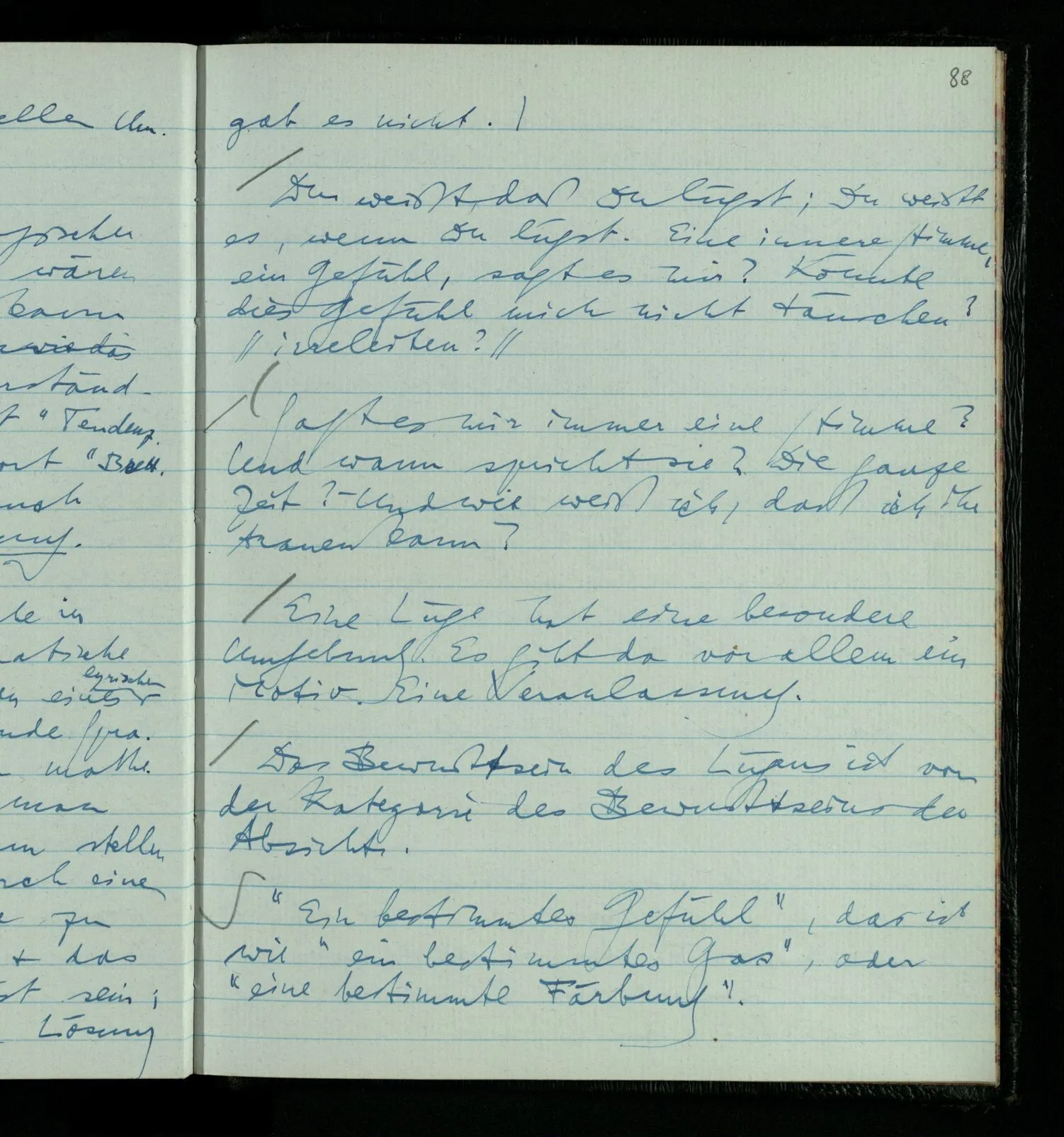 “Der Mensch ist im Stande, in voller Abgeschlossenheit mit sich selbst zu reden; in einer Isolierung, die weit vollkommener ist, als jede körperliche Isolierung.” Wie weiß ich, daß dem N. dies gegeben ist? – Weil er’s sagt & zuverlässig ist? – Und doch sagen wir: “Ich wüßte gerne, was er jetzt bei sich denkt”; ganz so, wie wir sagen könnten: “Ich wüßte gerne, was er jetzt in sein Notizbuch schreibt”. Ja, man könnte eben das sagen & es, sozusagen, als selbstverständlich ansehen, daß er bei sich das denkt, was er in’s