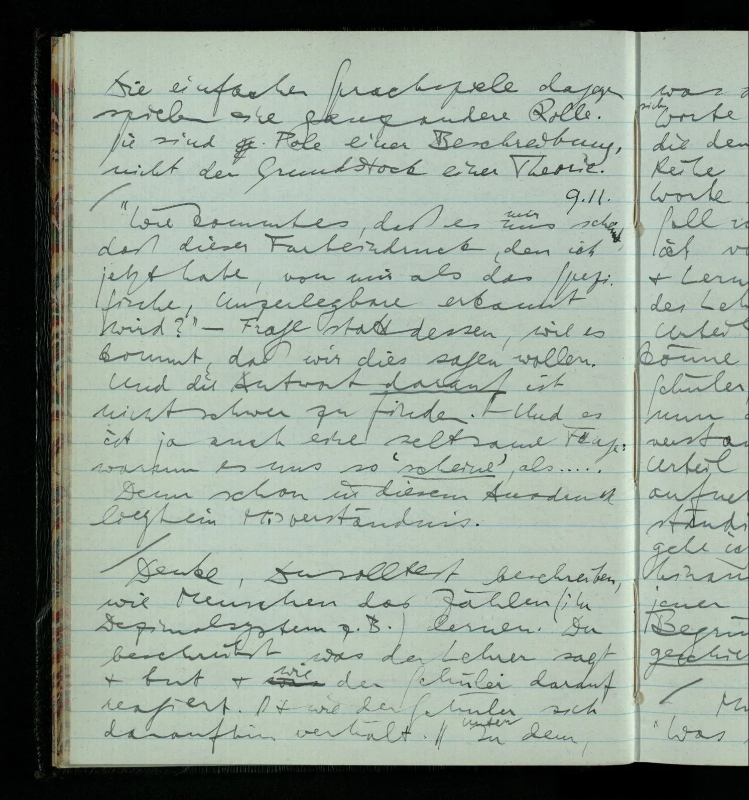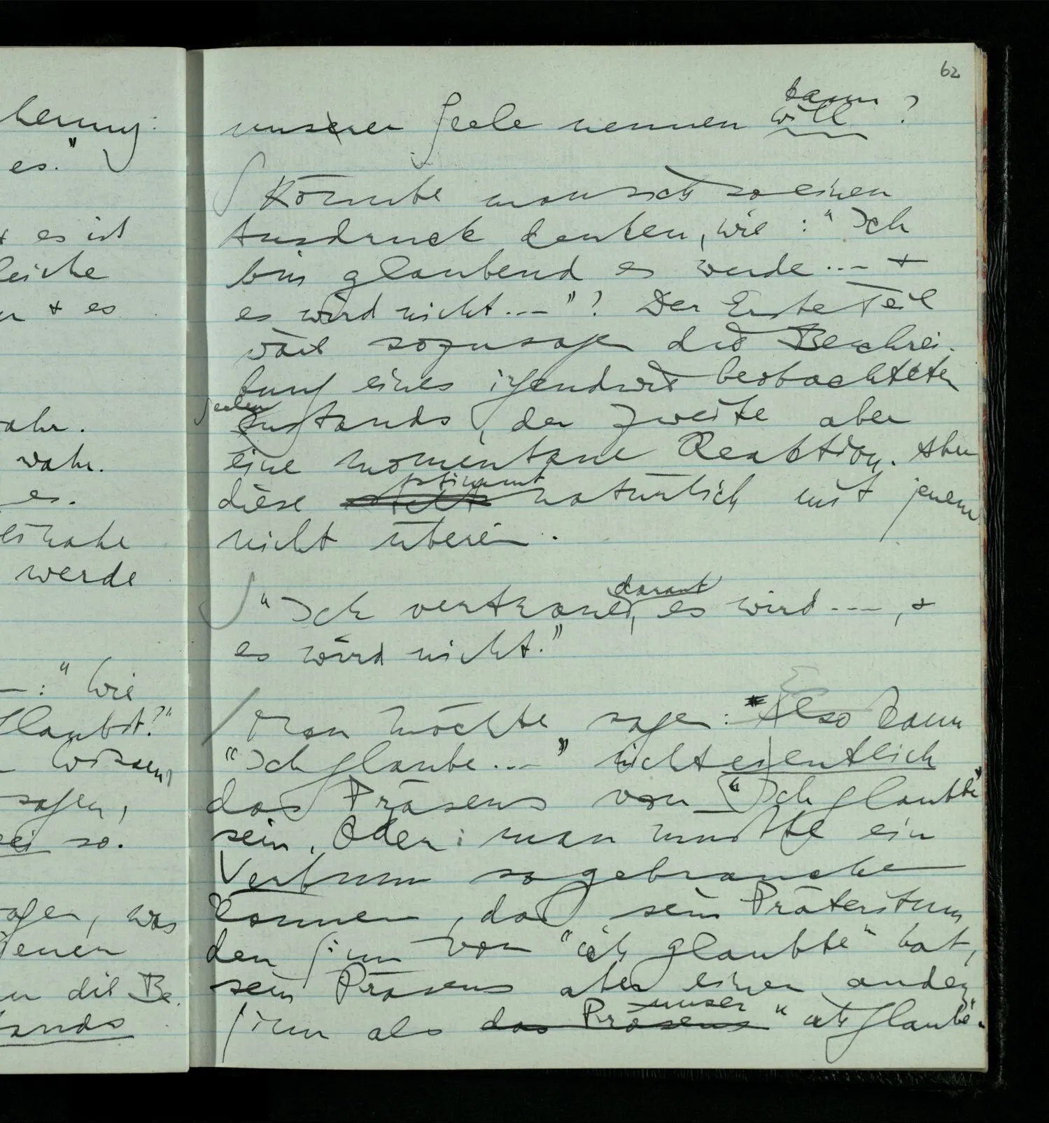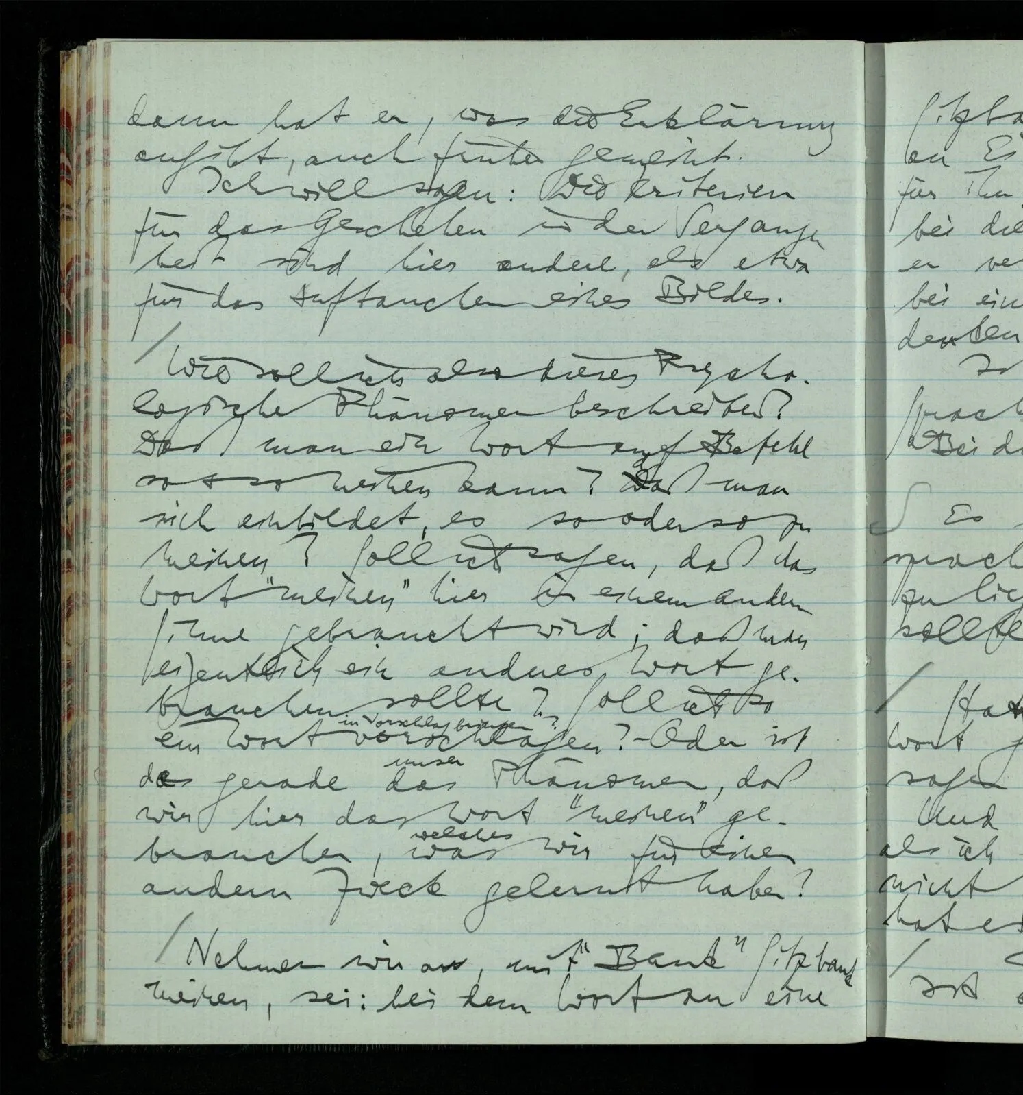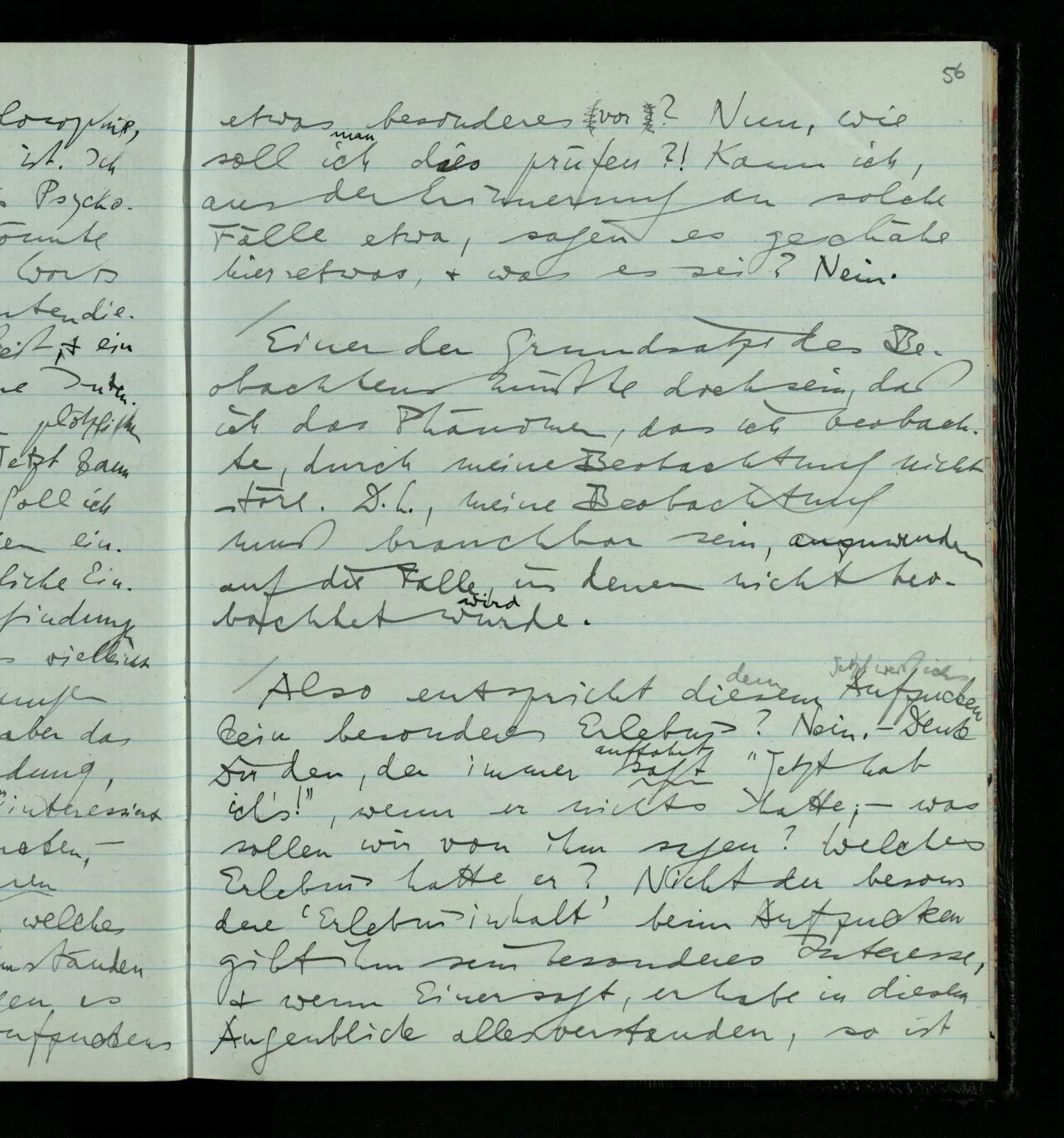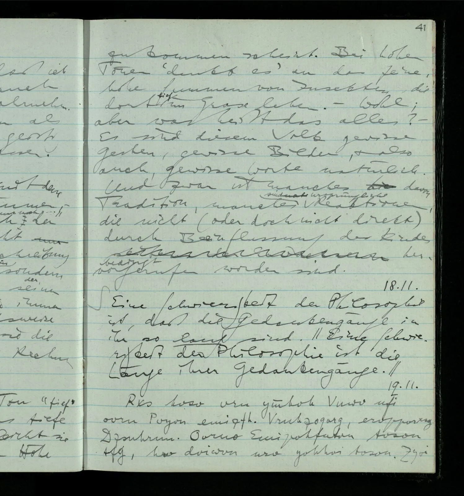 “Der Mensch ist im Stande, in voller Abgeschlossenheit mit sich selbst zu reden; in einer Isolierung, die weit vollkommener ist, als jede körperliche Isolierung.” Wie weiß ich, daß dem N. dies gegeben ist? – Weil er’s sagt & zuverlässig ist? – Und doch sagen wir: “Ich wüßte gerne, was er jetzt bei sich denkt”; ganz so, wie wir sagen könnten: “Ich wüßte gerne, was er jetzt in sein Notizbuch schreibt”. Ja, man könnte eben das sagen & es, sozusagen, als selbstverständlich ansehen, daß er bei sich das denkt, was er in’s