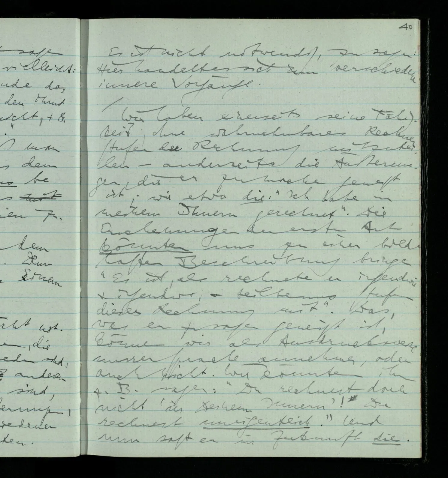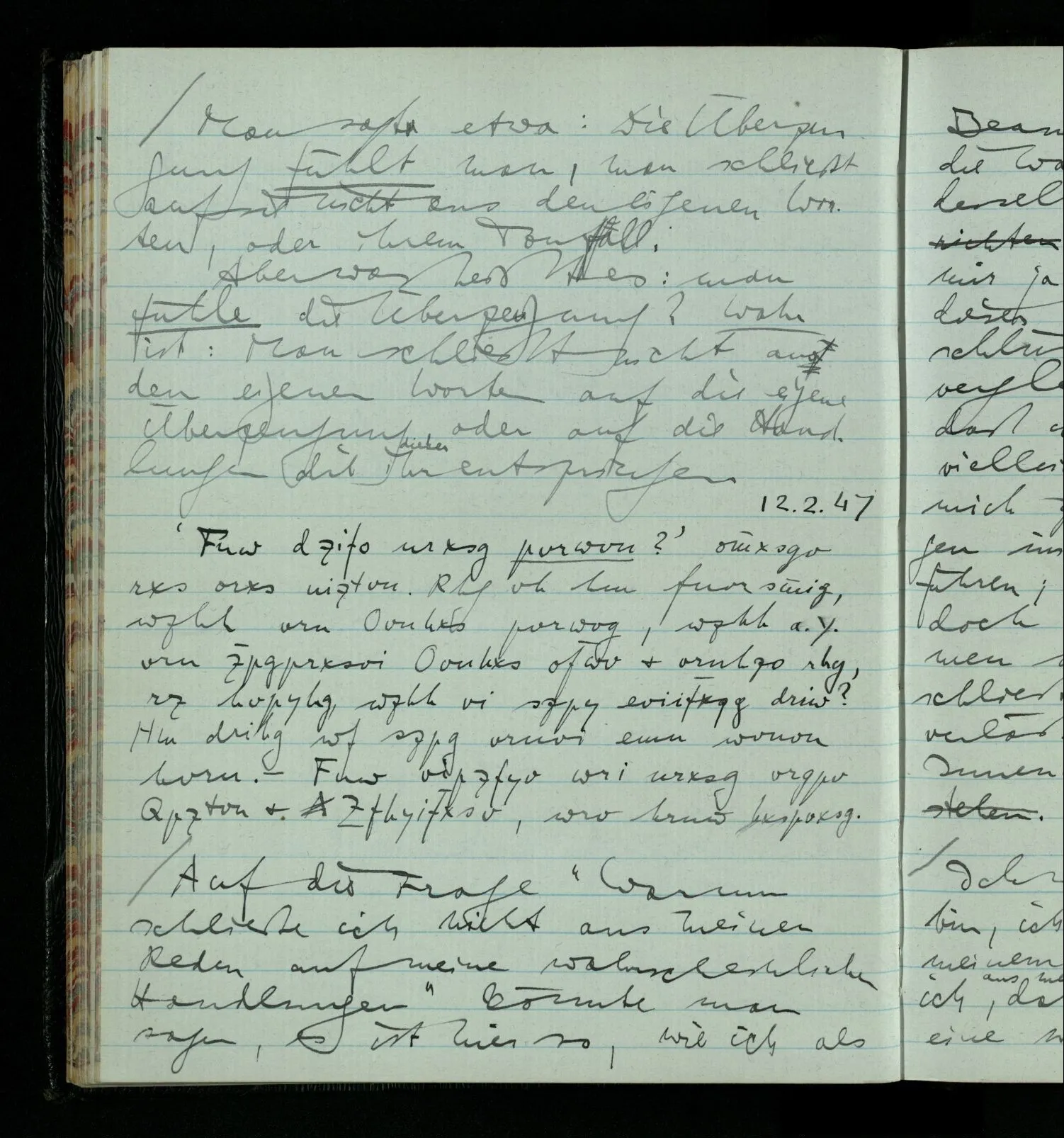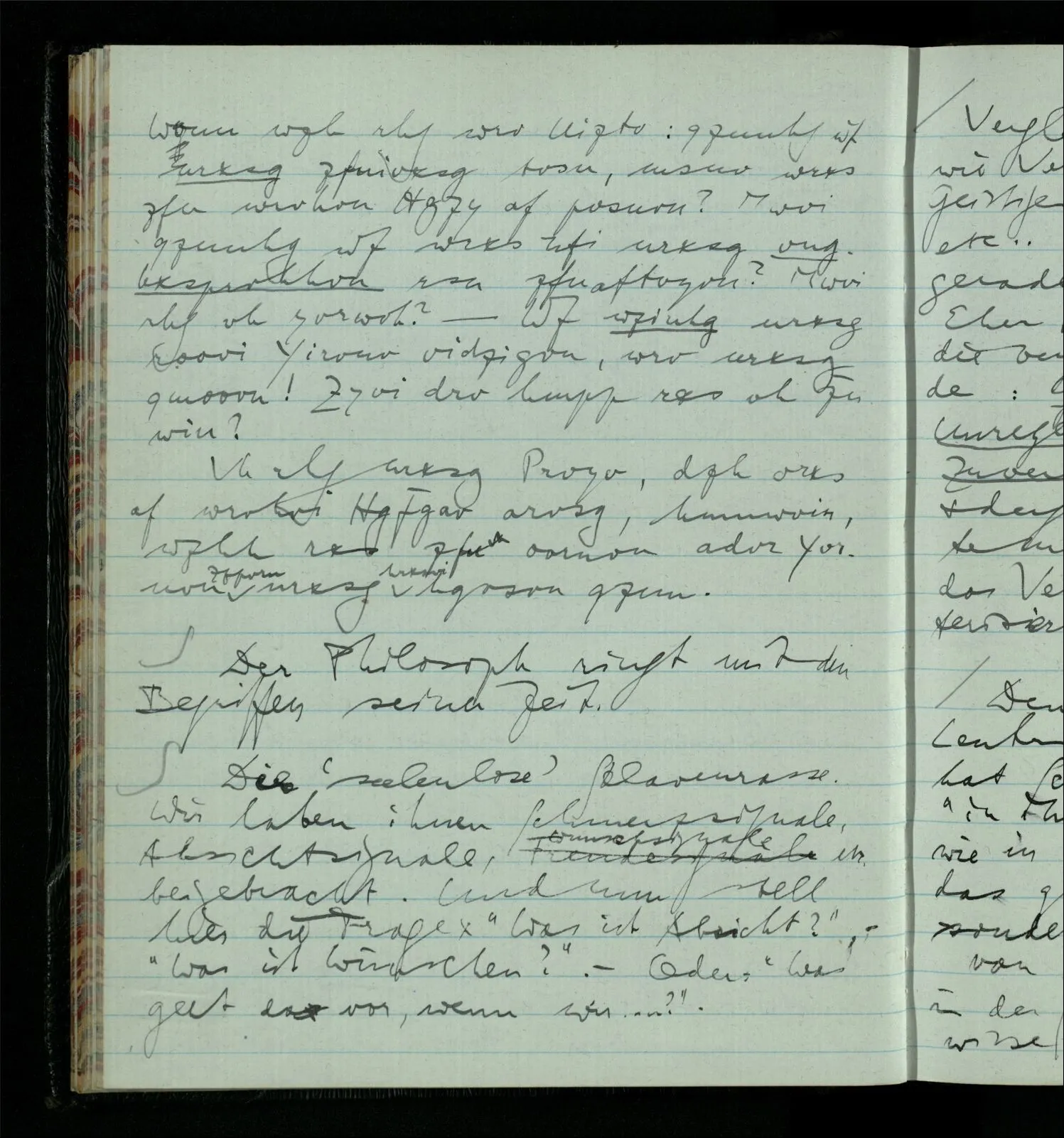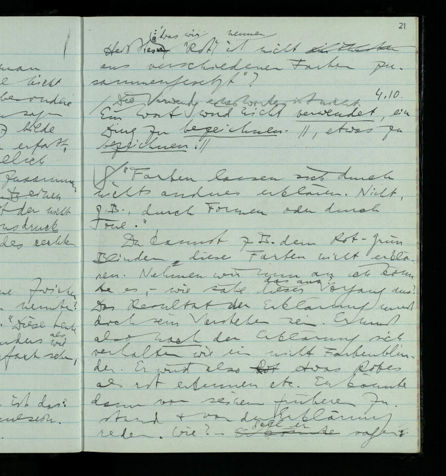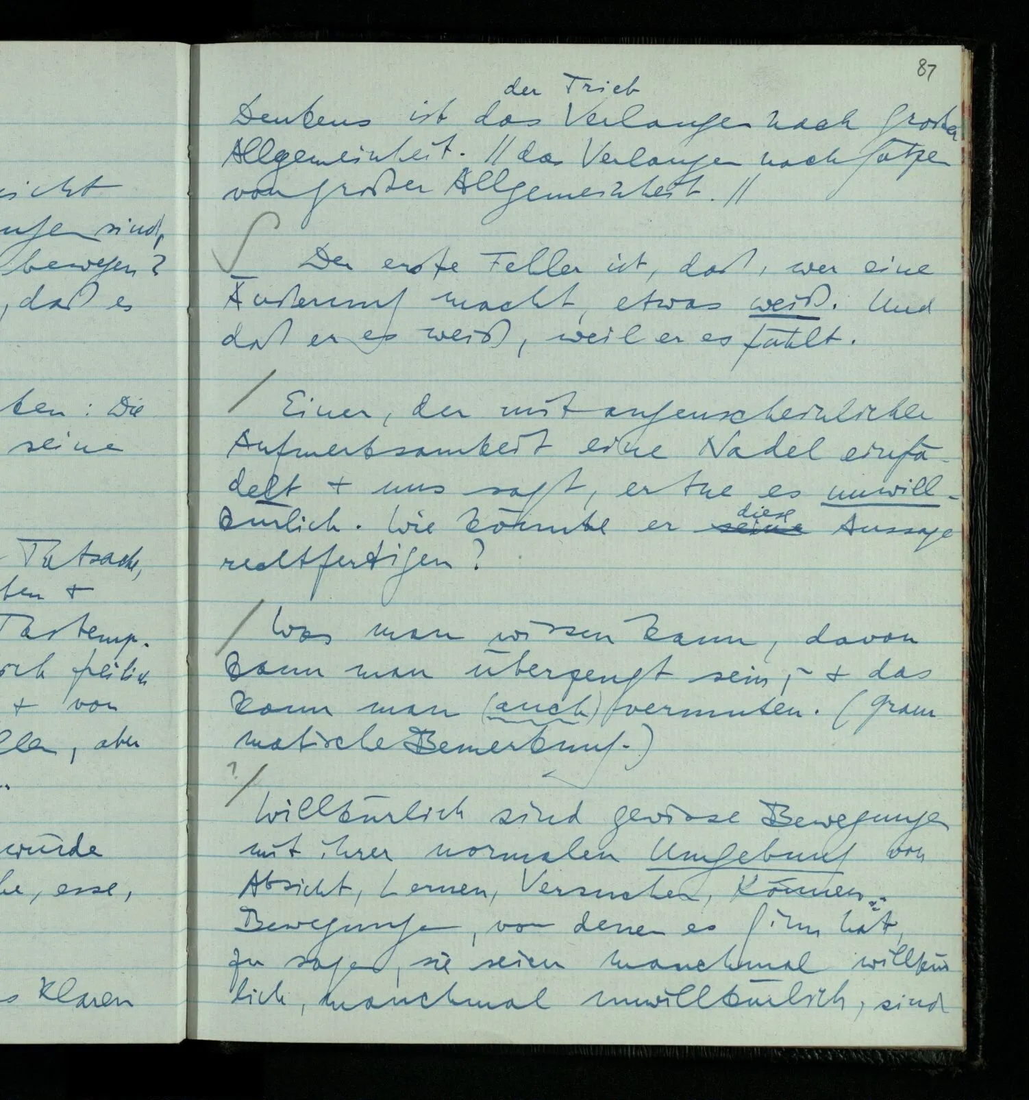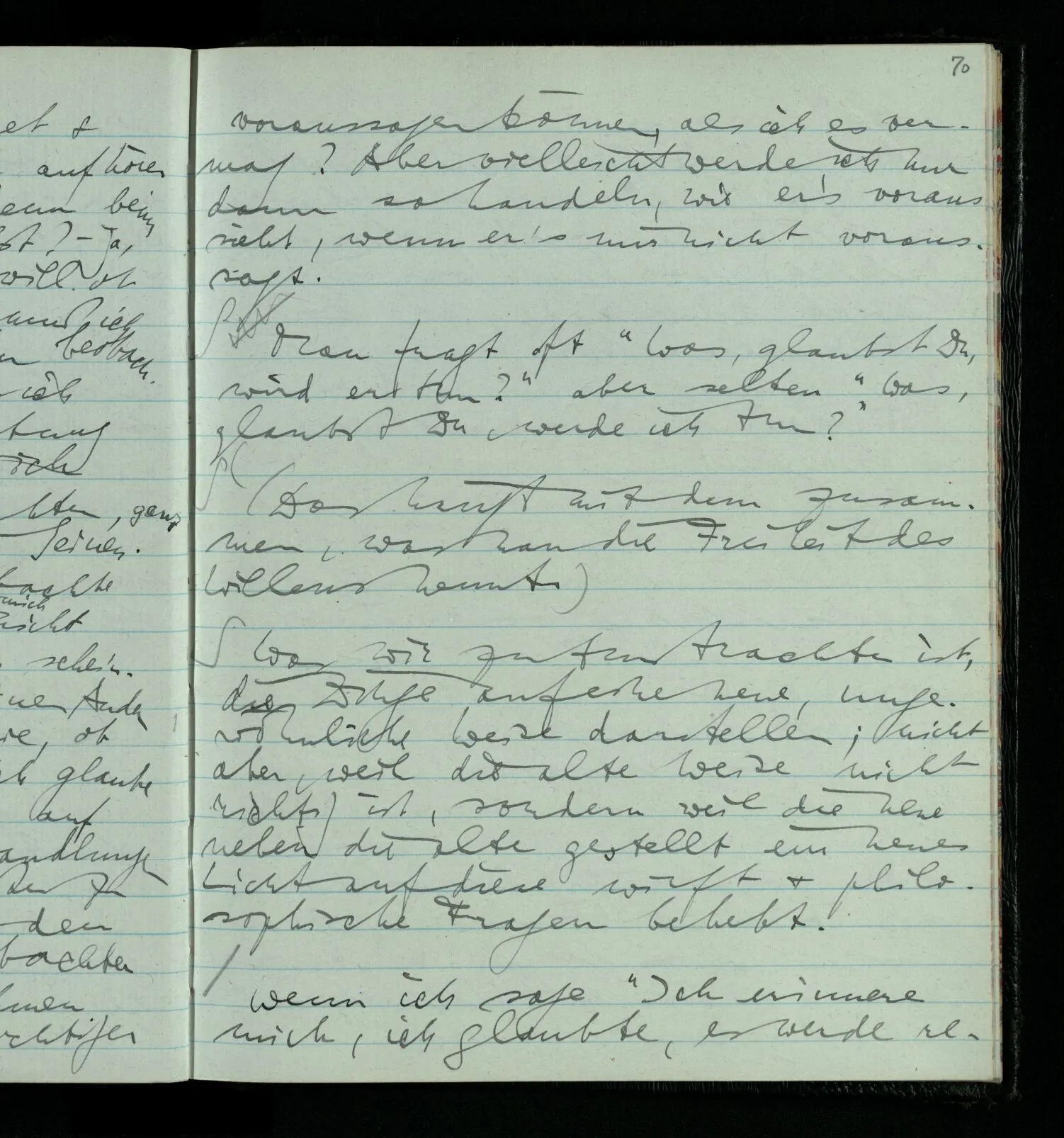 “Der Mensch ist im Stande, in voller Abgeschlossenheit mit sich selbst zu reden; in einer Isolierung, die weit vollkommener ist, als jede körperliche Isolierung.” Wie weiß ich, daß dem N. dies gegeben ist? – Weil er’s sagt & zuverlässig ist? – Und doch sagen wir: “Ich wüßte gerne, was er jetzt bei sich denkt”; ganz so, wie wir sagen könnten: “Ich wüßte gerne, was er jetzt in sein Notizbuch schreibt”. Ja, man könnte eben das sagen & es, sozusagen, als selbstverständlich ansehen, daß er bei sich das denkt, was er in’s