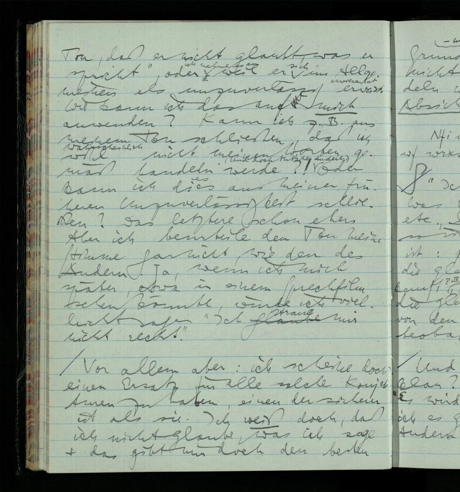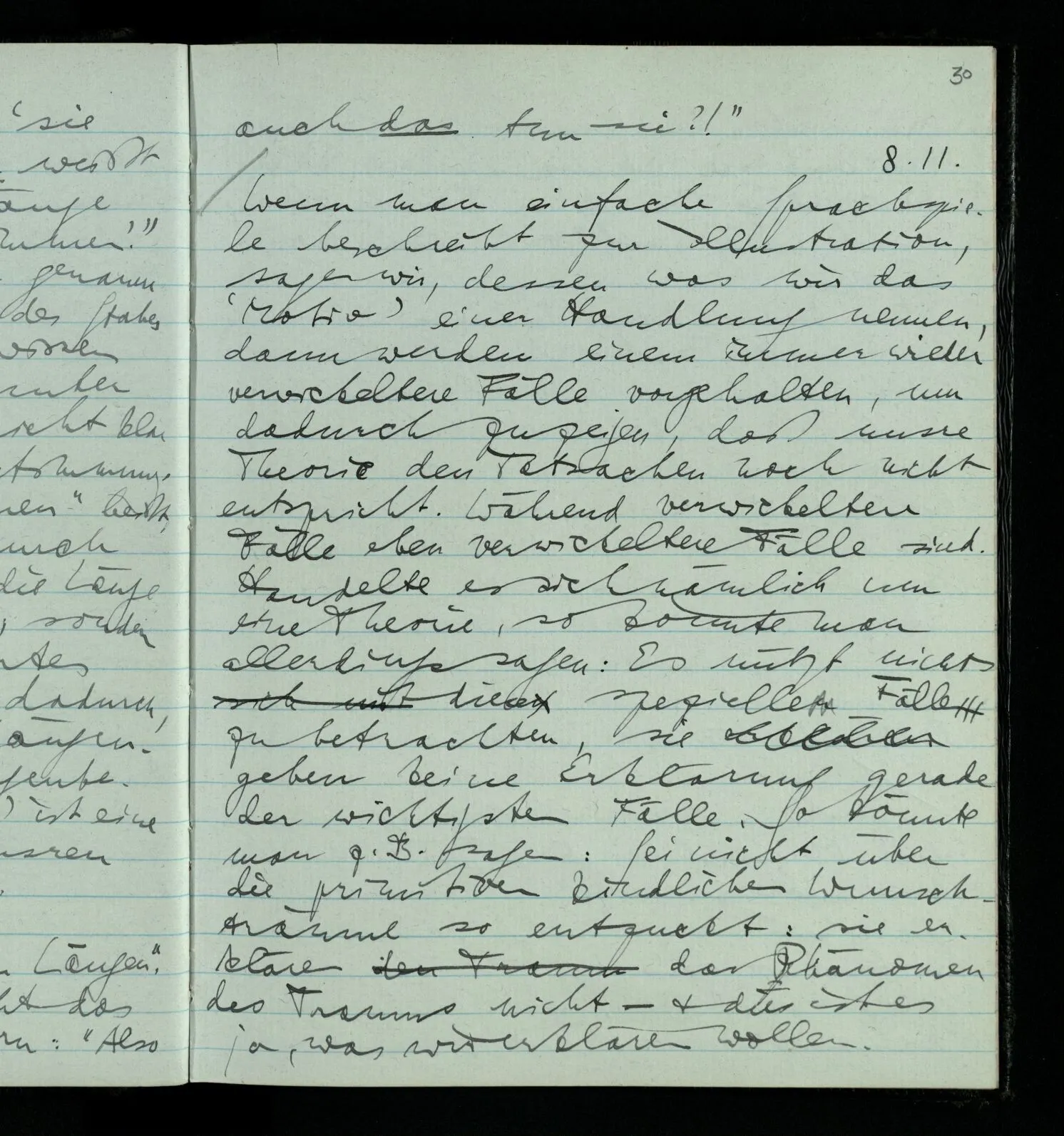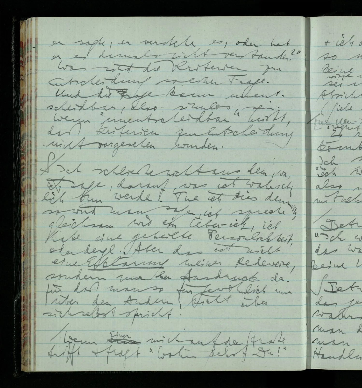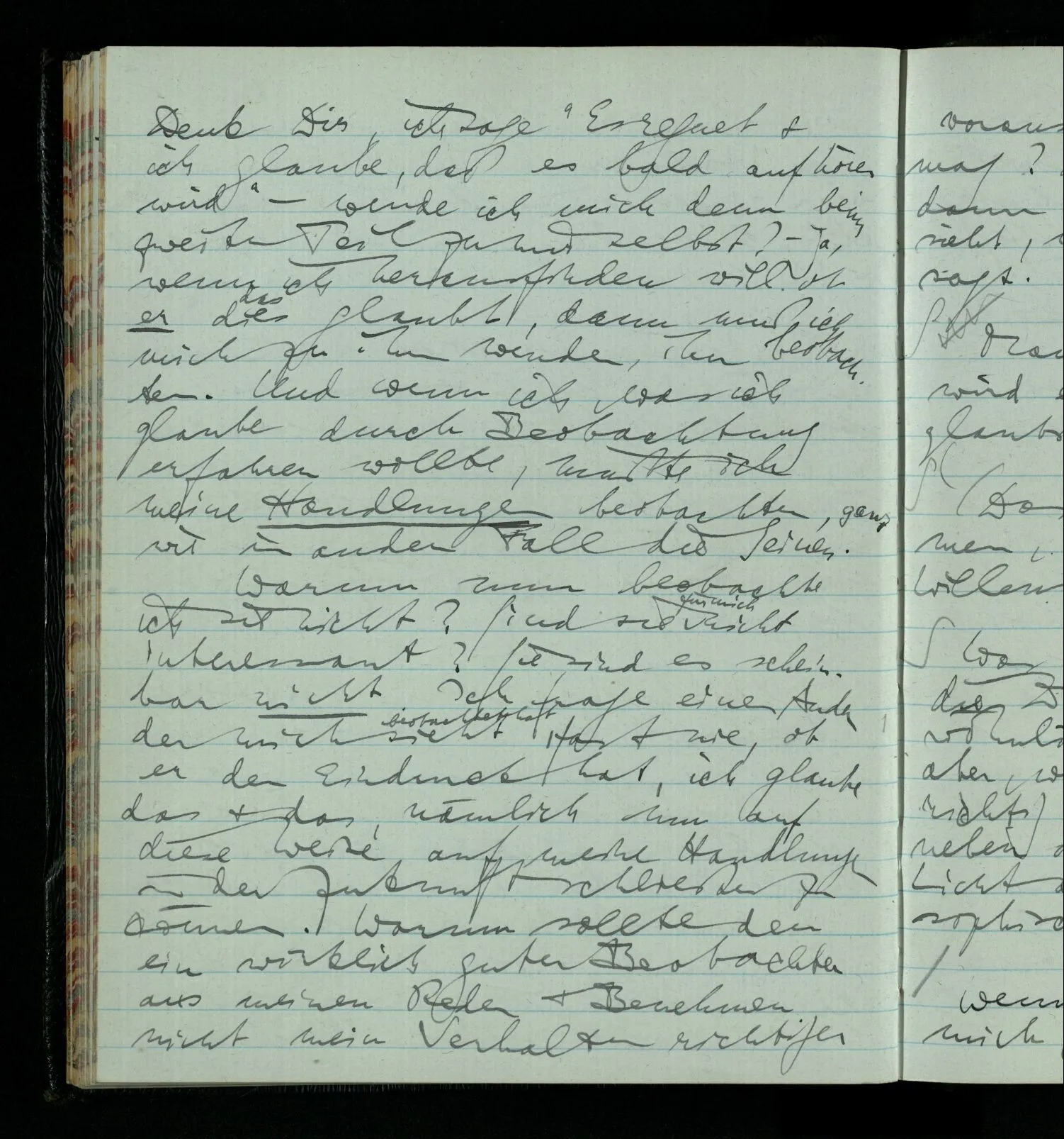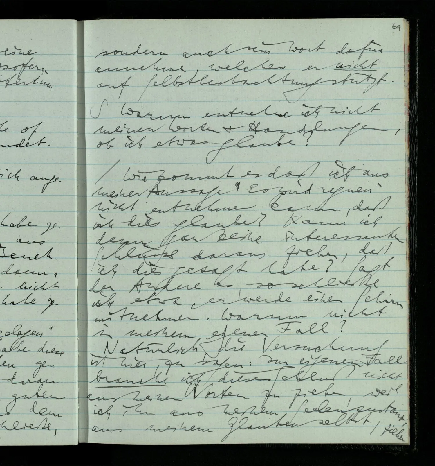 “Der Mensch ist im Stande, in voller Abgeschlossenheit mit sich selbst zu reden; in einer Isolierung, die weit vollkommener ist, als jede körperliche Isolierung.” Wie weiß ich, daß dem N. dies gegeben ist? – Weil er’s sagt & zuverlässig ist? – Und doch sagen wir: “Ich wüßte gerne, was er jetzt bei sich denkt”; ganz so, wie wir sagen könnten: “Ich wüßte gerne, was er jetzt in sein Notizbuch schreibt”. Ja, man könnte eben das sagen & es, sozusagen, als selbstverständlich ansehen, daß er bei sich das denkt, was er in’s